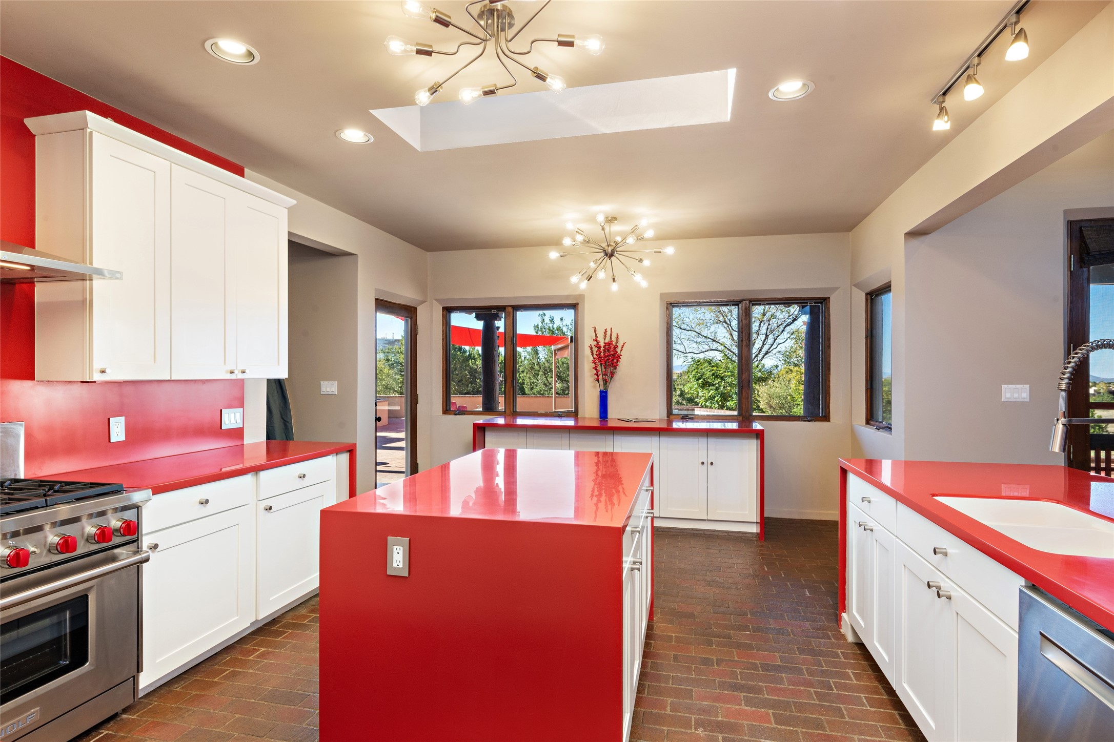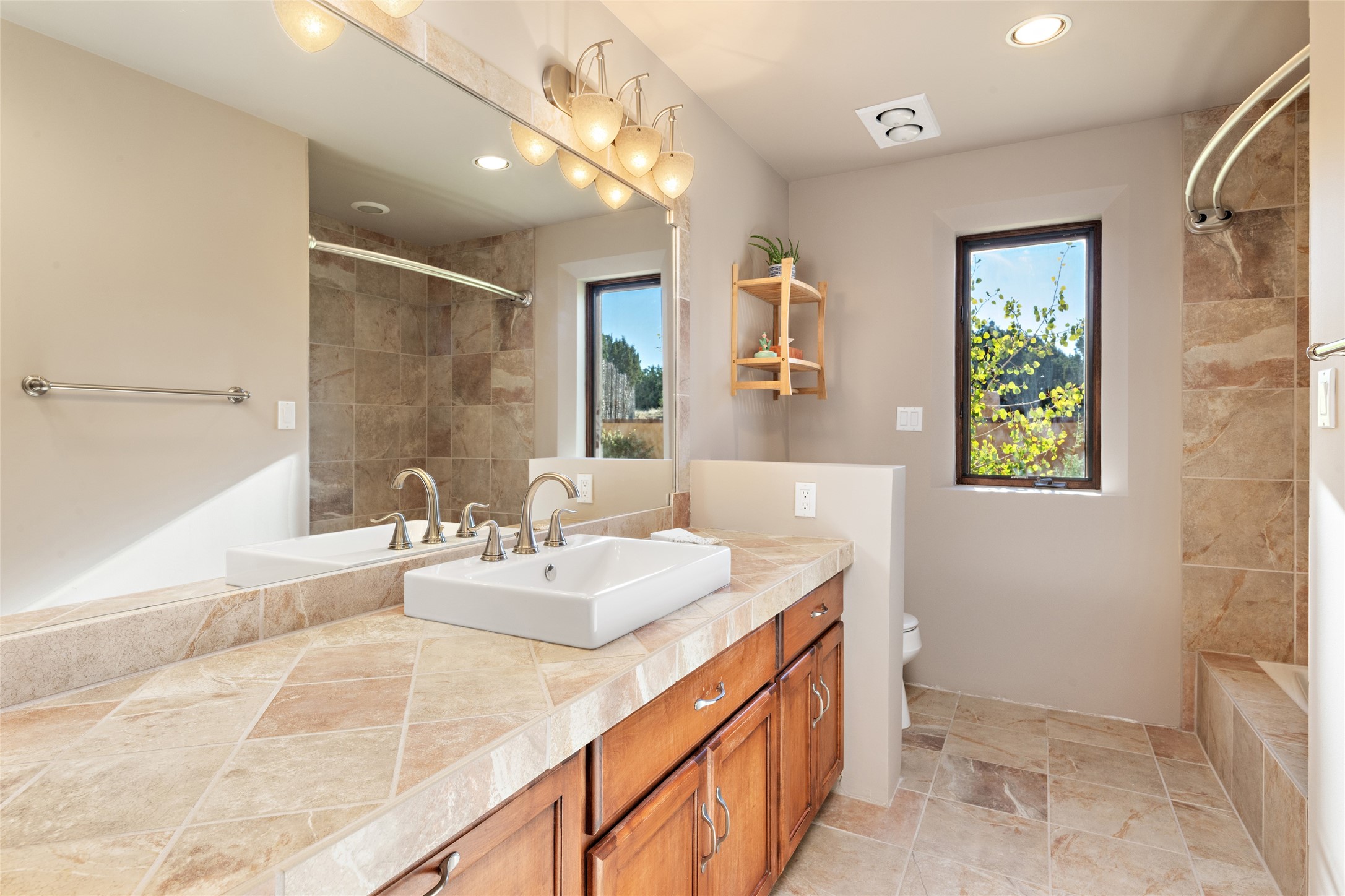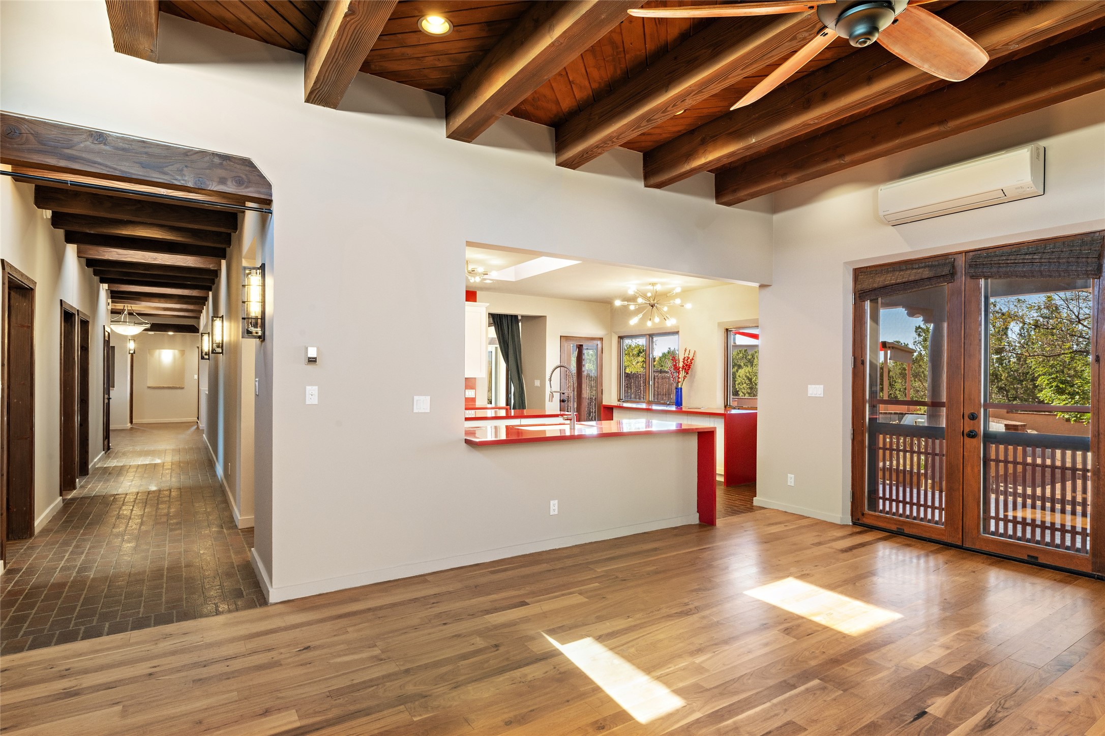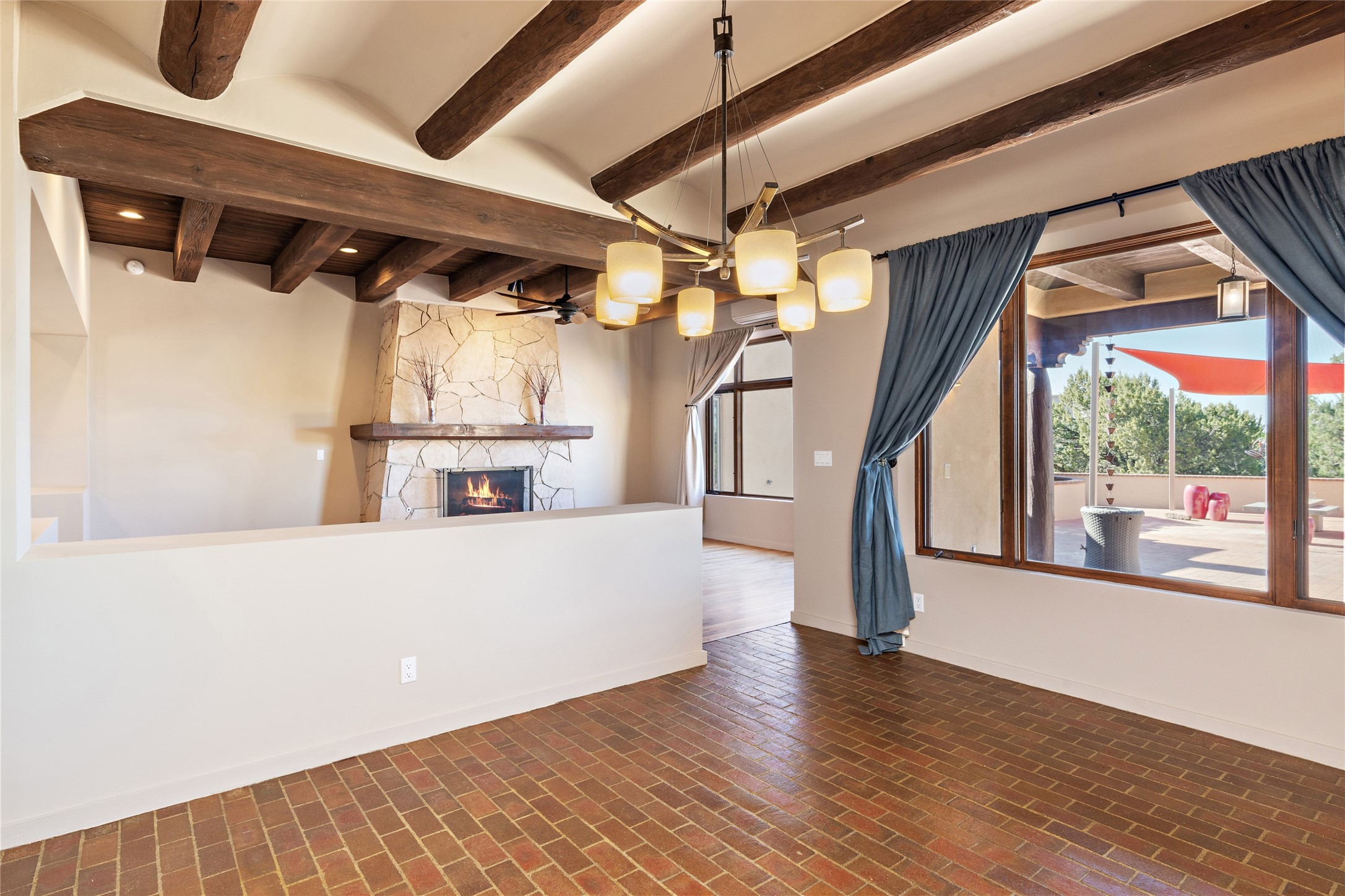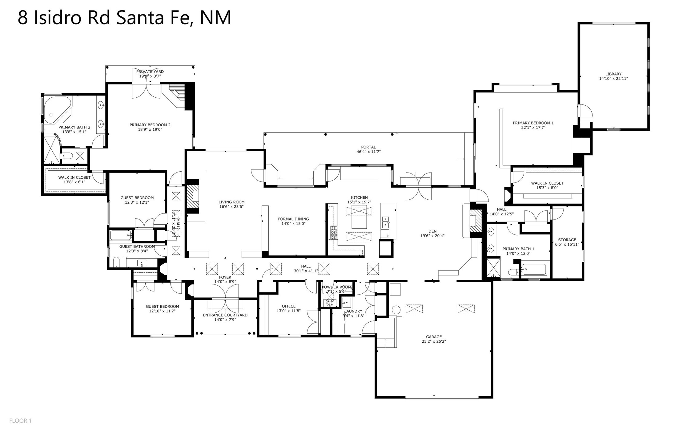 ENTERTAINER'S PARADISE! Not to mention the spectacular postcard-worthy sunset views of the Sandia and Ortiz, mountains from the back patio, and Sangres from the front patio. Sited on a large greenbelt at the end of a cul-de-sac. Four mini-splits provide real air conditioning. New stucco, interior paint and brick floors refinished in September 2023. Kitchen updated in 2022 with new appliances - a 6-burner Wolf gas range, Bosch dishwasher and LG refrigerator and more counter seating and storage. Two primary suites on opposite ends of the house, both with large walk-in closets, provide numerous options, from an in-law suite, to a large artist's studio. The larger of the suites has a sitting room with fantastic mountain views, a smaller room that is plumbed to be a kitchenette, and a separate back entrance. Huge closest with an entire wall of built-in shelves and drawers in first primary bedroom with beautiful spa-like bath with jetted tub, and double sinks. Banco with storage under picture window. Primary bedroom two has a generous 2-person jetted tub, double sinks and beautiful shower. Both primary suites have a fireplace, and there are two more in living areas, for a total of four. Fifth bedroom is set up as a beautiful office with built-ins. The new brick back patio has a sunken seating area with a built-in gas grill, a fire table and a long covered portal which is a great place to entertain or relax. The two added front flagstone patios provide additional space for seating and gorgeous views of snow-covered mountains in the winter - both patios have solar lighting. There is also a secure coyote-fenced backyard space that provides a safe area for dogs to play. Generous laundry room with sink and pantry. Oversized, extra deep 2-car garage with storage. A few steps up from the garage, otherwise single-level. Radiant is PEX. Domestic is copper. Water softener 2019. Each room has a ceiling fan. Custom screen doors, insulated blinds.