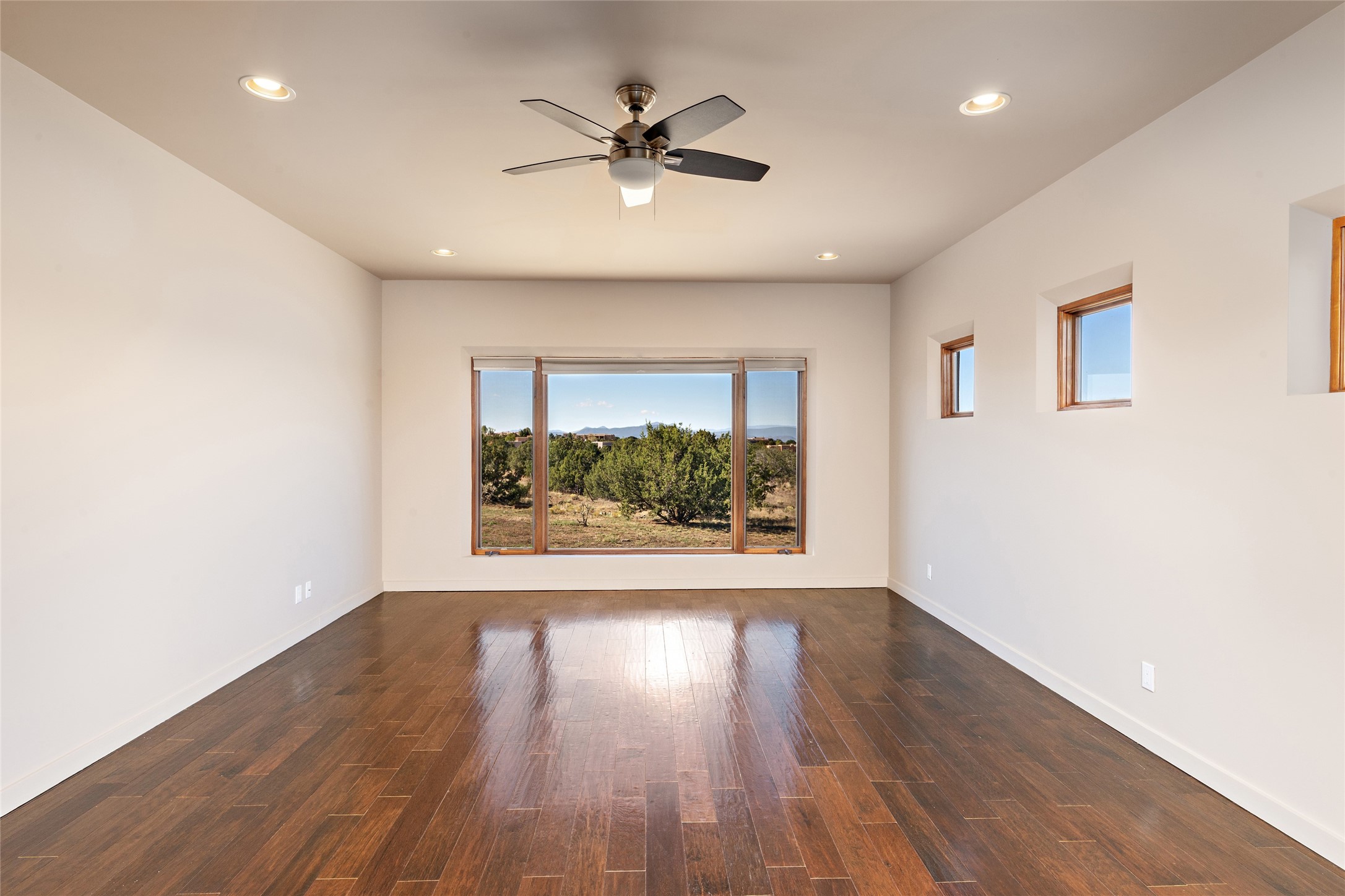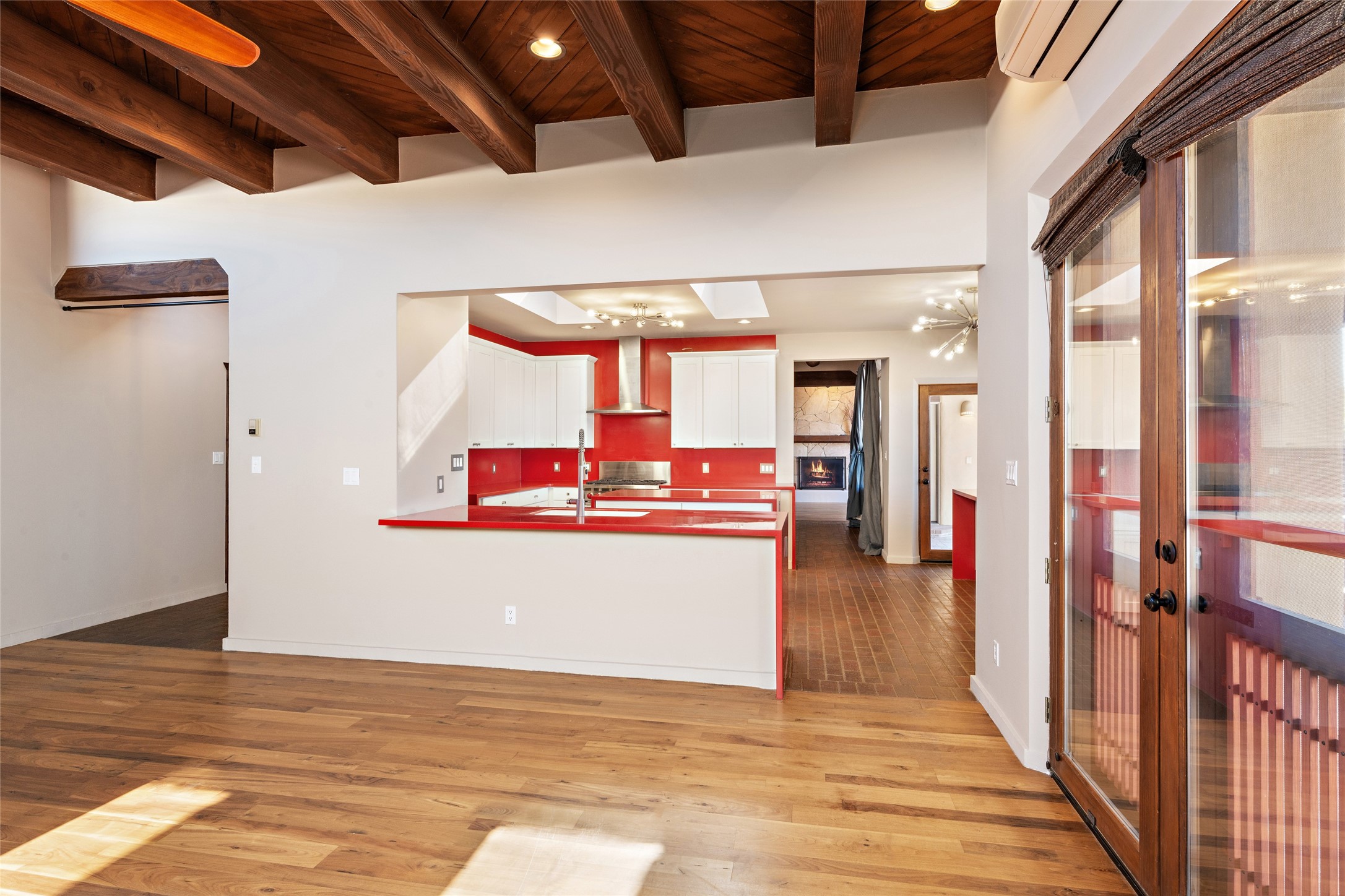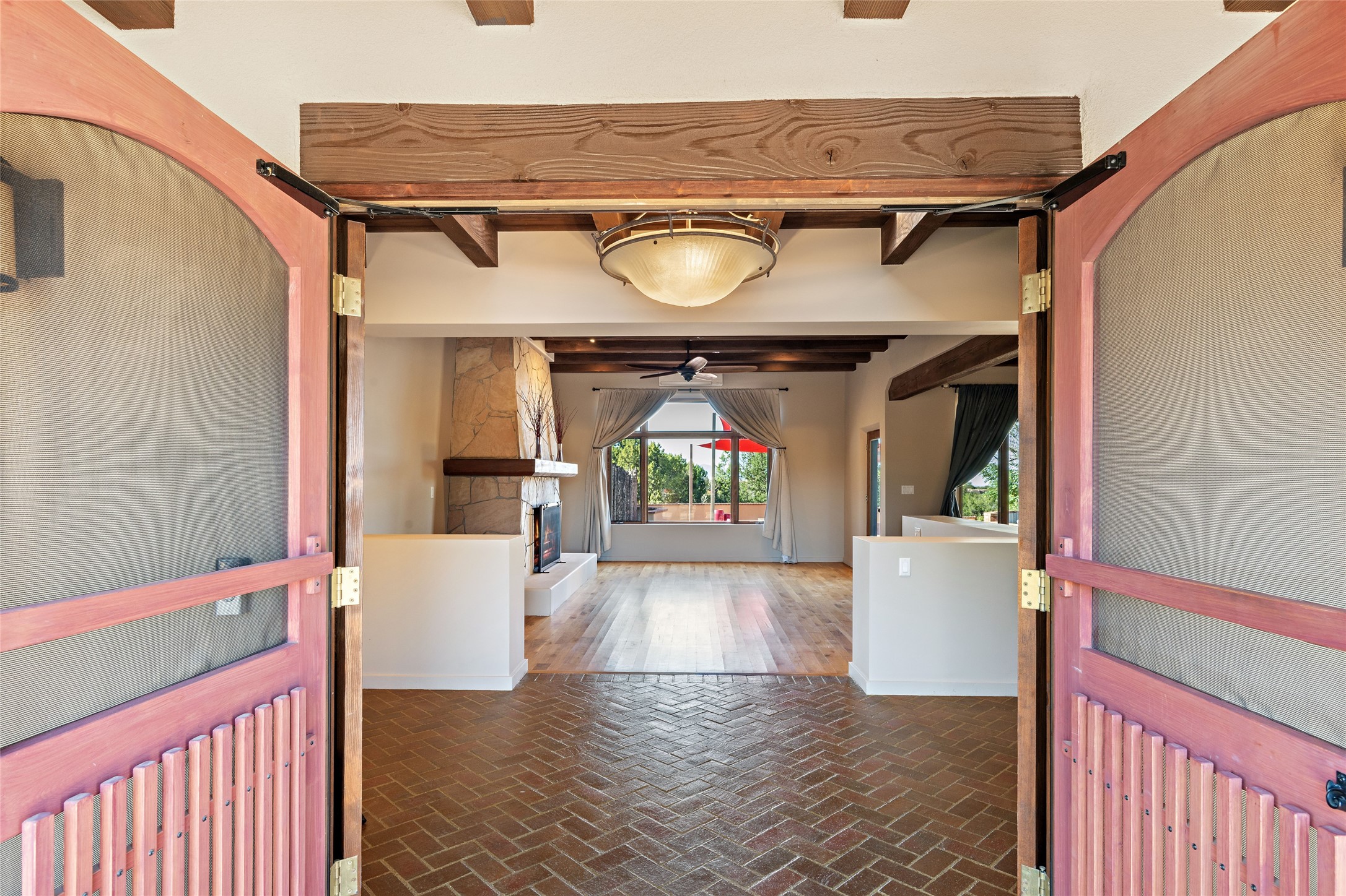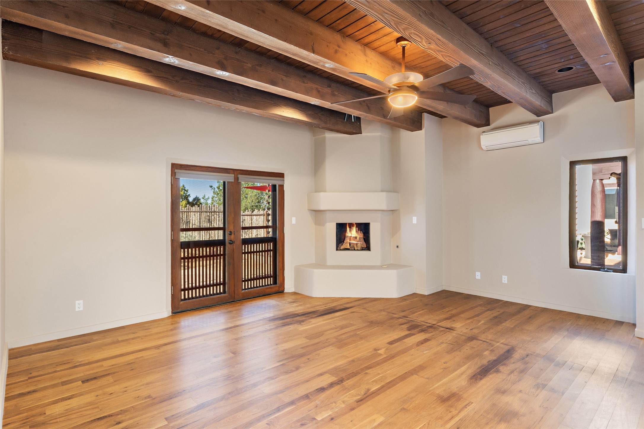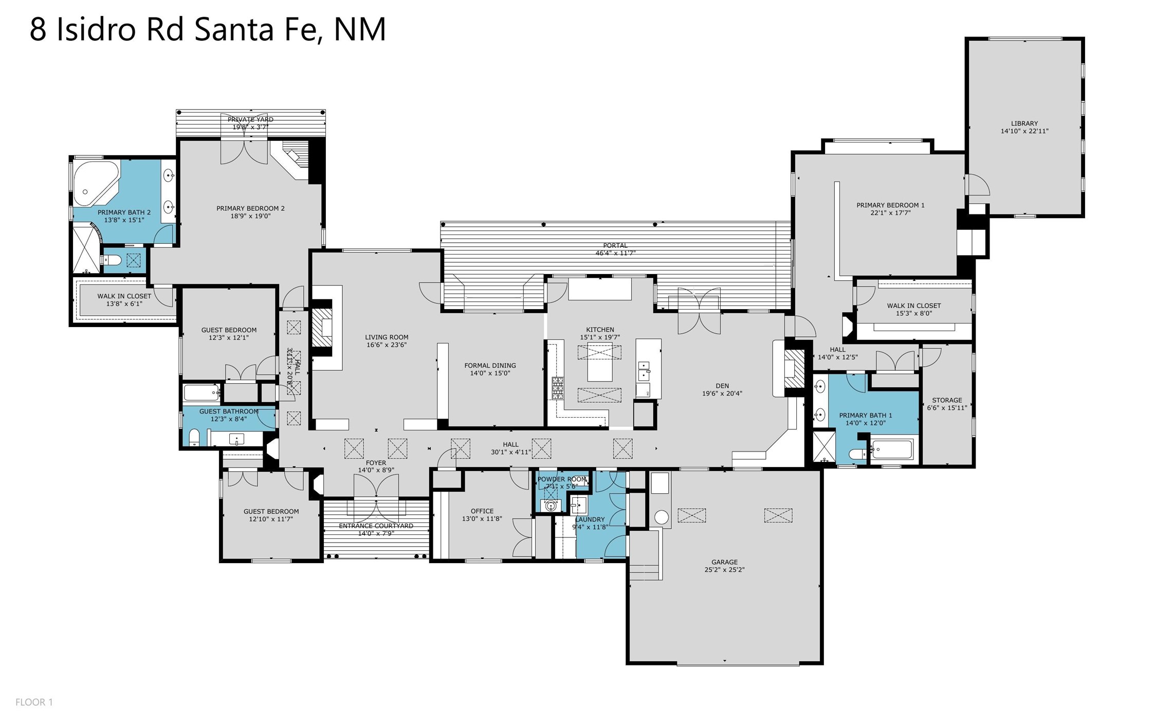 ENTERTAINER'S PARADISE! Not to mention the spectacular postcard-worthy sunset views of the Sandia and Ortiz, mountains from the back patio, and Sangres from the front patio. Sited on a large greenbelt at the end of a cul-de-sac. Four mini-splits provide real air conditioning. New stucco, interior paint and brick floors refinished in September 2023. Kitchen updated in 2022 with new appliances - a 6-burner Wolf gas range, Bosch dishwasher and LG refrigerator and more counter seating and storage. Two primary suites on opposite ends of the house, both with large walk-in closets, provide numerous options, from an in-law suite, to a large artist's studio. The larger of the suites has a sitting room with fantastic mountain views, a smaller room that is plumbed to be a kitchenette, and a separate back entrance. Huge closest with an entire wall of built-in shelves and drawers in first primary bedroom with beautiful spa-like bath with jetted tub, and double sinks. Banco with storage under picture window. Primary bedroom two has a generous 2-person jetted tub, double sinks and beautiful shower. Both primary suites have a fireplace, and there are two more in living areas, for a total of four. Fifth bedroom is set up as a beautiful office with built-ins. The new brick back patio has a sunken seating area with a built-in gas grill, a fire table and a long covered portal which is a great place to entertain or relax. The two added front flagstone patios provide additional space for seating and gorgeous views of snow-covered mountains in the winter - both patios have solar lighting. There is also a secure coyote-fenced backyard space that provides a safe area for dogs to play. Generous laundry room with sink and pantry. Oversized, extra deep 2-car garage with storage. A few steps up from the garage, otherwise single-level. Radiant is PEX. Domestic is copper. Water softener 2019. Each room has a ceiling fan. Custom screen doors, insulated blinds.