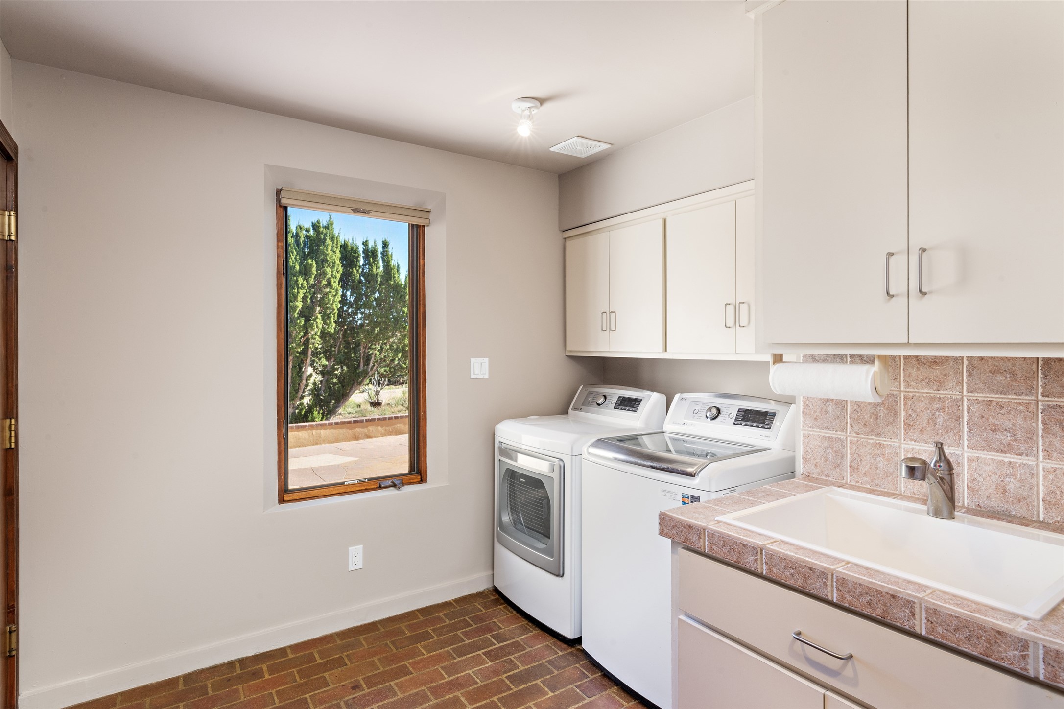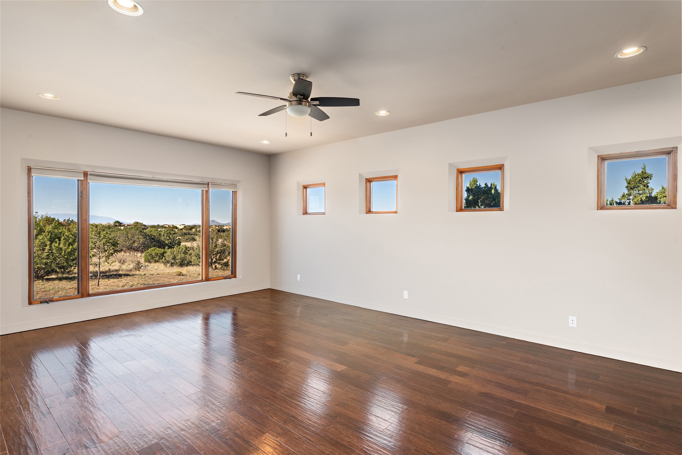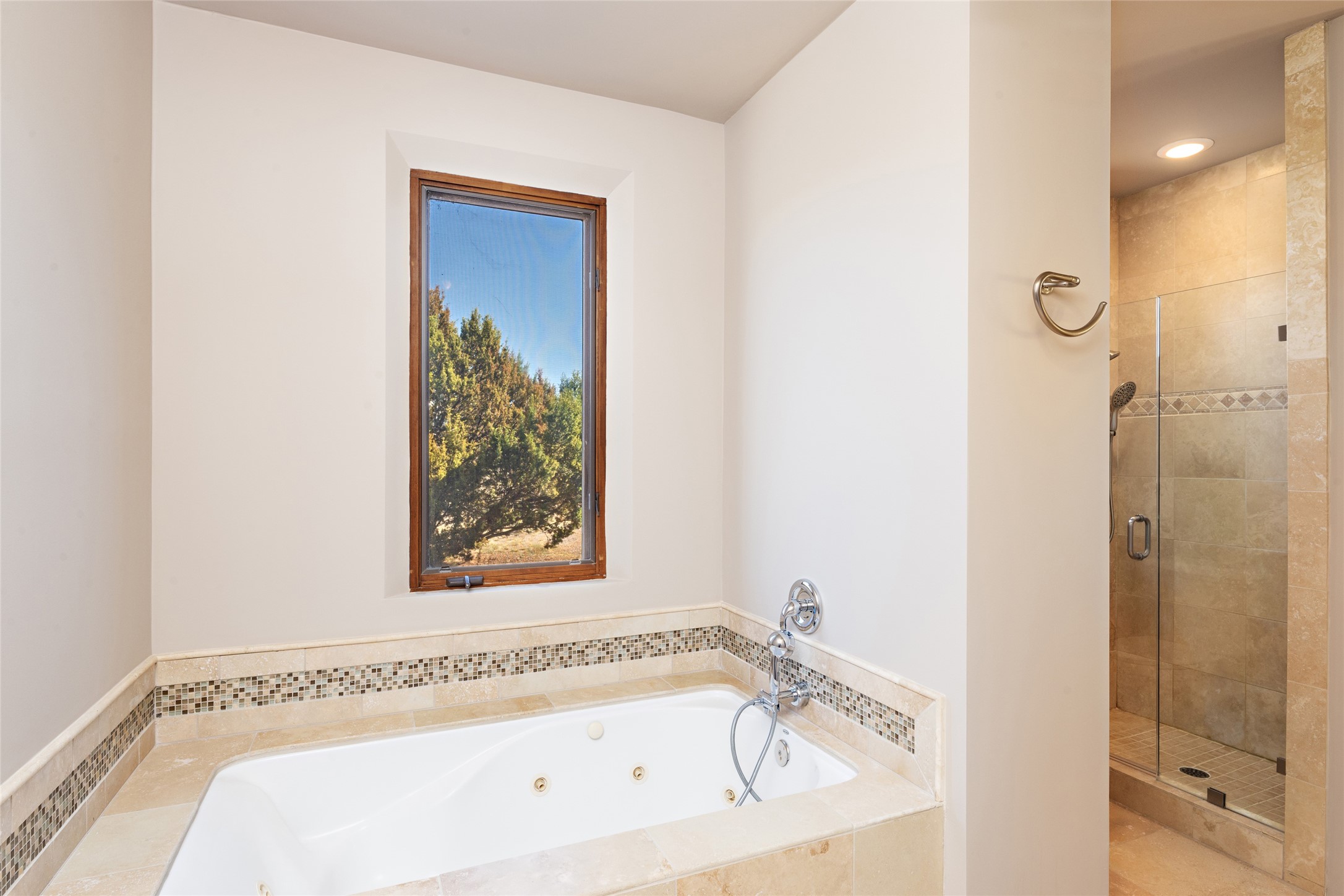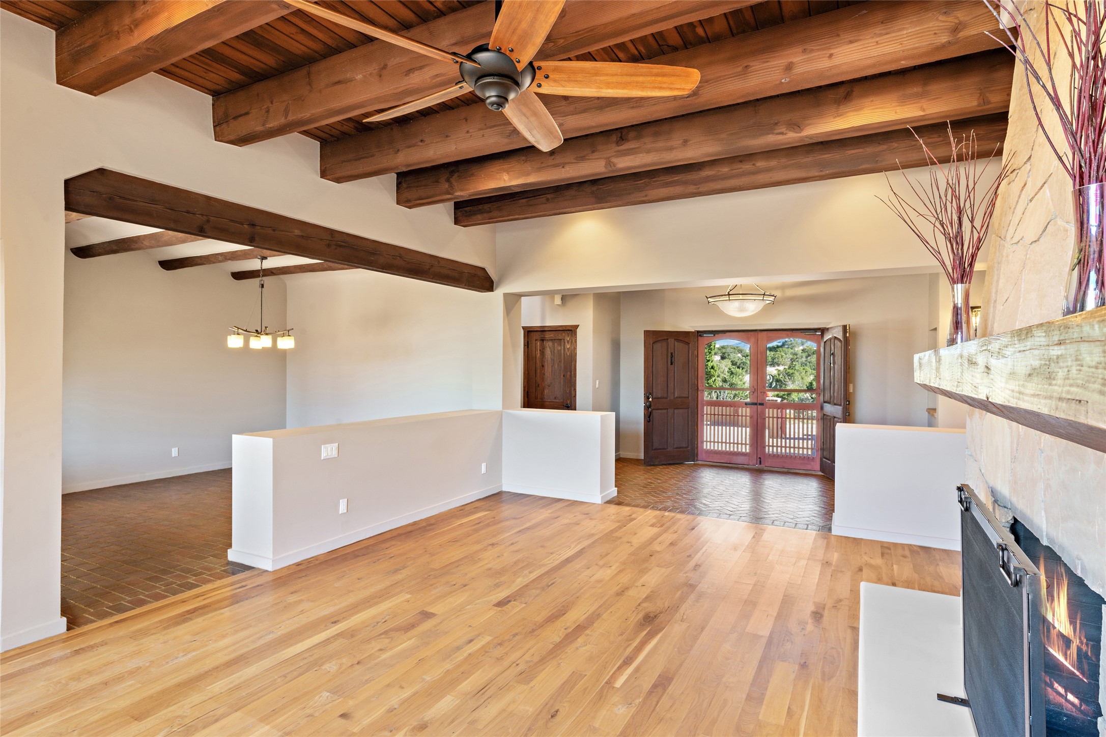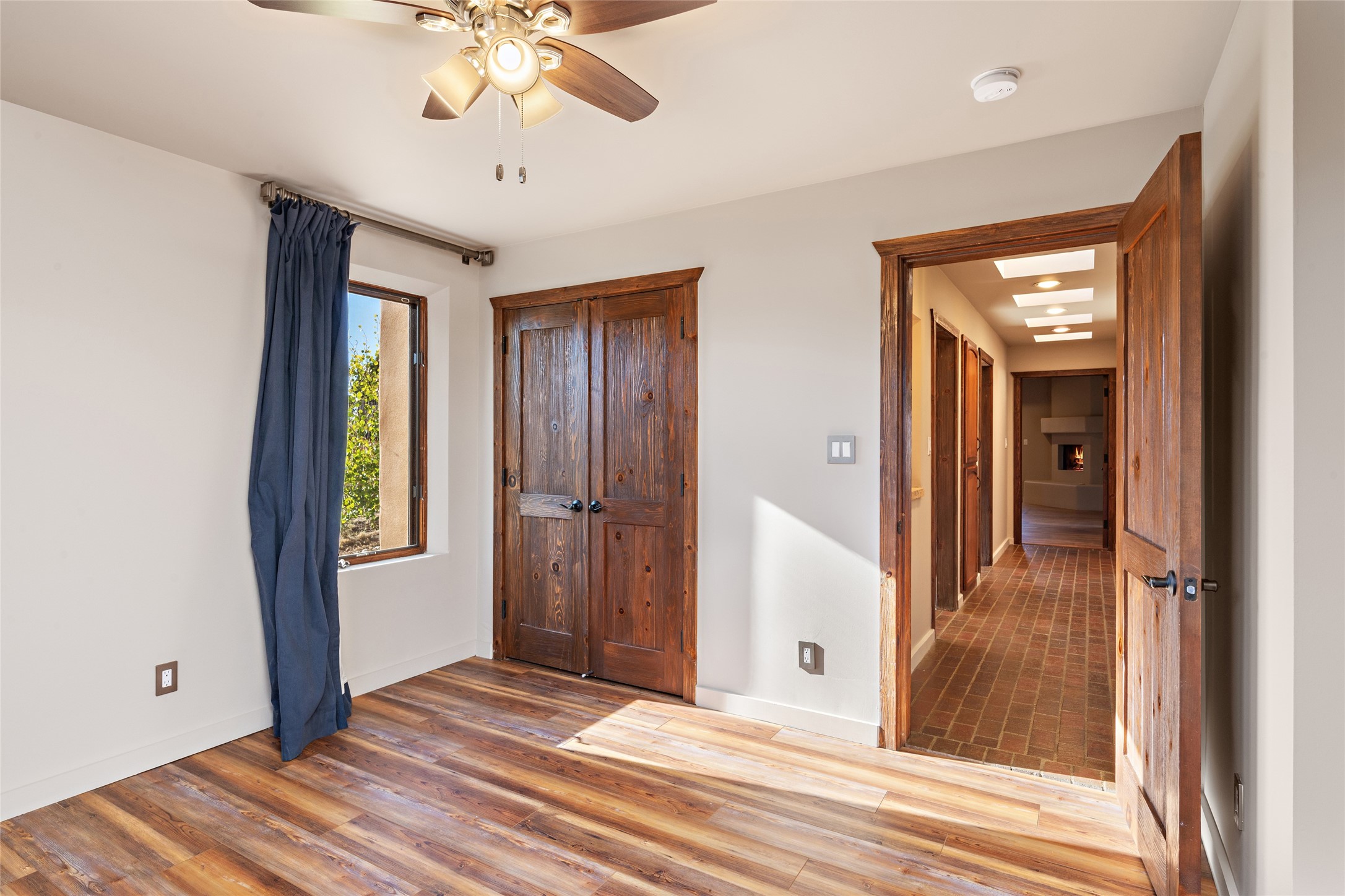 ENTERTAINER'S PARADISE! Not to mention the spectacular postcard-worthy sunset views of the Sandia and Ortiz, mountains from the back patio, and Sangres from the front patio. Sited on a large greenbelt at the end of a cul-de-sac. Four mini-splits provide real air conditioning. New stucco, interior paint and brick floors refinished in September 2023. Kitchen updated in 2022 with new appliances - a 6-burner Wolf gas range, Bosch dishwasher and LG refrigerator and more counter seating and storage. Two primary suites on opposite ends of the house, both with large walk-in closets, provide numerous options, from an in-law suite, to a large artist's studio. The larger of the suites has a sitting room with fantastic mountain views, a smaller room that is plumbed to be a kitchenette, and a separate back entrance. Huge closest with an entire wall of built-in shelves and drawers in first primary bedroom with beautiful spa-like bath with jetted tub, and double sinks. Banco with storage under picture window. Primary bedroom two has a generous 2-person jetted tub, double sinks and beautiful shower. Both primary suites have a fireplace, and there are two more in living areas, for a total of four. Fifth bedroom is set up as a beautiful office with built-ins. The new brick back patio has a sunken seating area with a built-in gas grill, a fire table and a long covered portal which is a great place to entertain or relax. The two added front flagstone patios provide additional space for seating and gorgeous views of snow-covered mountains in the winter - both patios have solar lighting. There is also a secure coyote-fenced backyard space that provides a safe area for dogs to play. Generous laundry room with sink and pantry. Oversized, extra deep 2-car garage with storage. A few steps up from the garage, otherwise single-level. Radiant is PEX. Domestic is copper. Water softener 2019. Each room has a ceiling fan. Custom screen doors, insulated blinds.