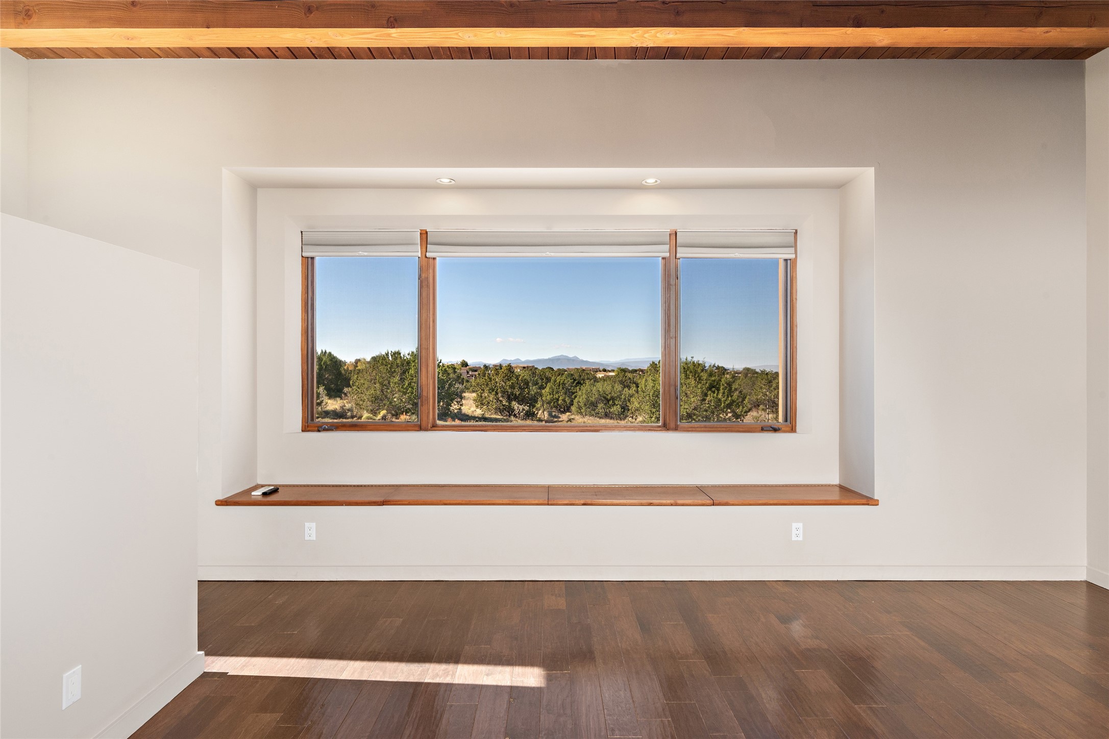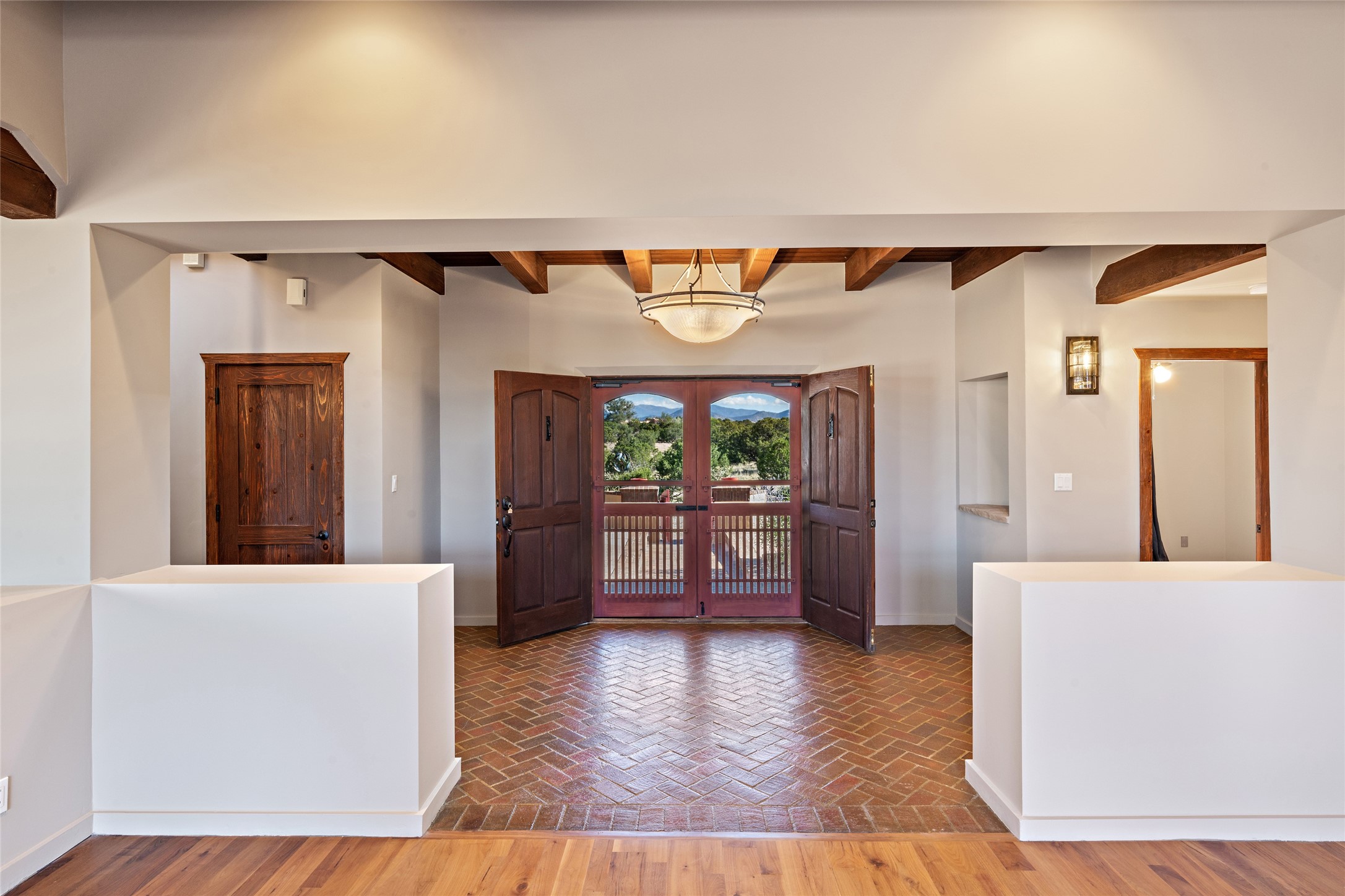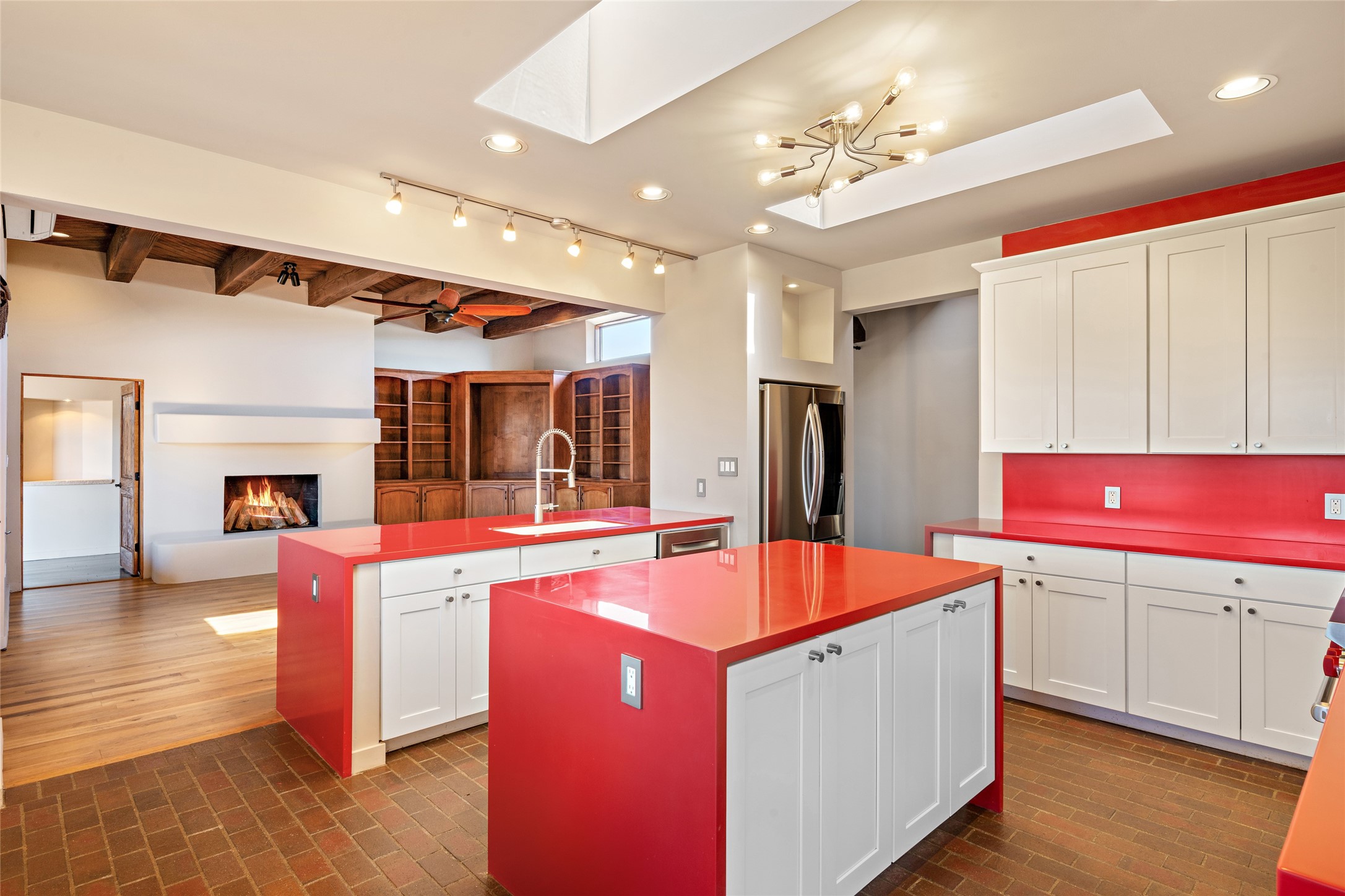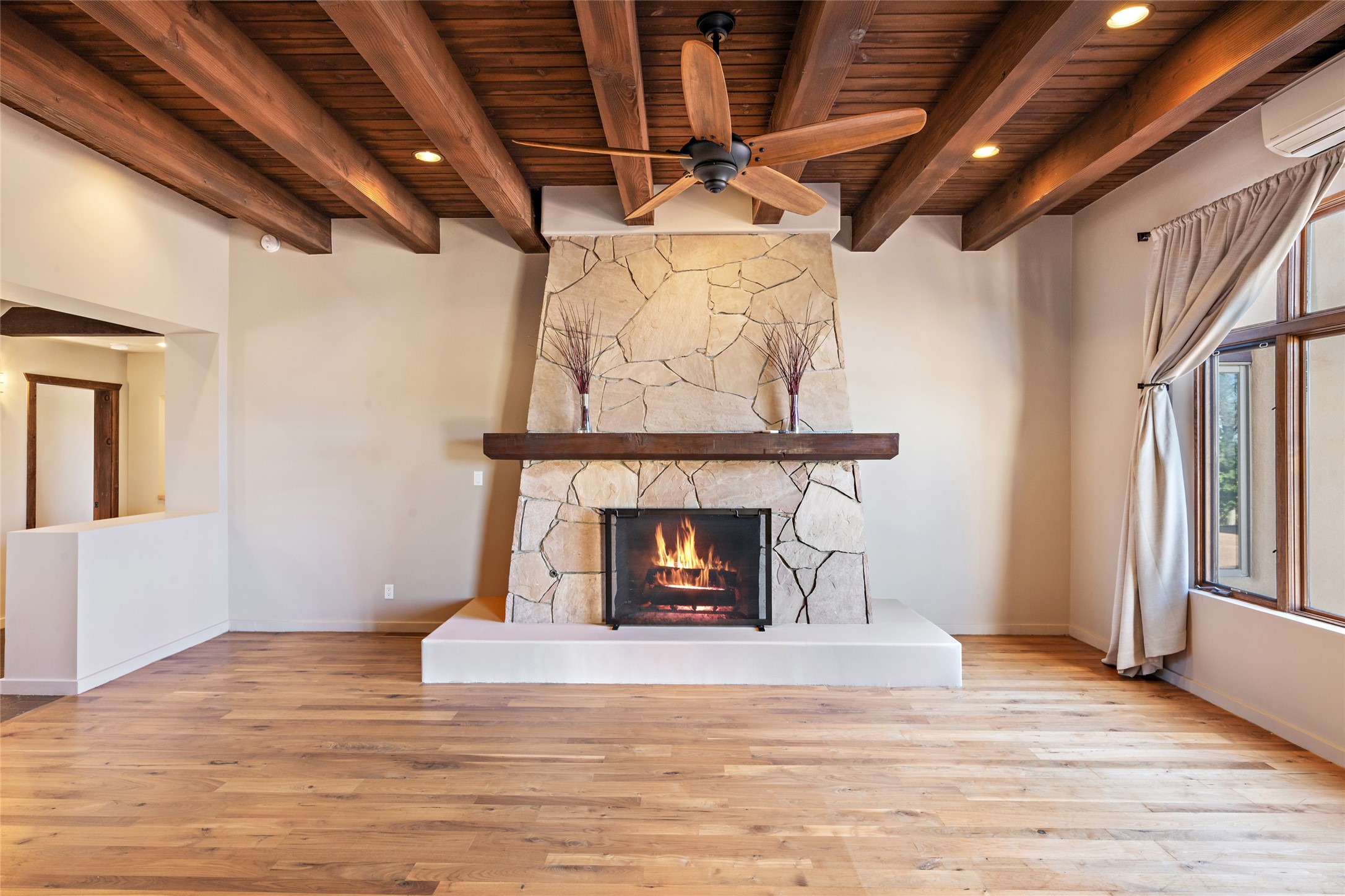 ENTERTAINER'S PARADISE! Not to mention the spectacular postcard-worthy sunset views of the Sandia and Ortiz, mountains from the back patio, and Sangres from the front patio. Sited on a large greenbelt at the end of a cul-de-sac. Four mini-splits provide real air conditioning. New stucco, interior paint and brick floors refinished in September 2023. Kitchen updated in 2022 with new appliances - a 6-burner Wolf gas range, Bosch dishwasher and LG refrigerator and more counter seating and storage. Two primary suites on opposite ends of the house, both with large walk-in closets, provide numerous options, from an in-law suite, to a large artist's studio. The larger of the suites has a sitting room with fantastic mountain views, a smaller room that is plumbed to be a kitchenette, and a separate back entrance. Huge closest with an entire wall of built-in shelves and drawers in first primary bedroom with beautiful spa-like bath with jetted tub, and double sinks. Banco with storage under picture window. Primary bedroom two has a generous 2-person jetted tub, double sinks and beautiful shower. Both primary suites have a fireplace, and there are two more in living areas, for a total of four. Fifth bedroom is set up as a beautiful office with built-ins. The new brick back patio has a sunken seating area with a built-in gas grill, a fire table and a long covered portal which is a great place to entertain or relax. The two added front flagstone patios provide additional space for seating and gorgeous views of snow-covered mountains in the winter - both patios have solar lighting. There is also a secure coyote-fenced backyard space that provides a safe area for dogs to play. Generous laundry room with sink and pantry. Oversized, extra deep 2-car garage with storage. A few steps up from the garage, otherwise single-level. Radiant is PEX. Domestic is copper. Water softener 2019. Each room has a ceiling fan. Custom screen doors, insulated blinds.
