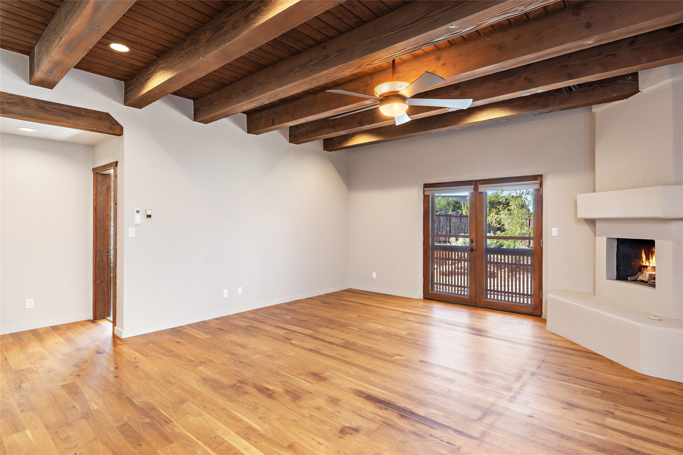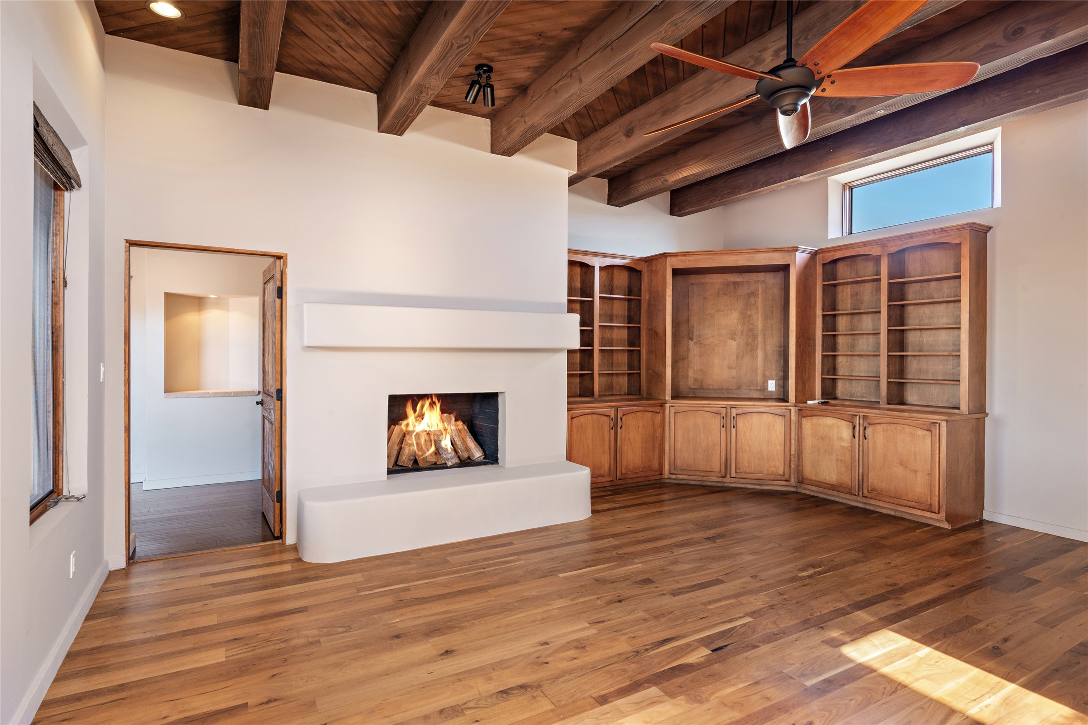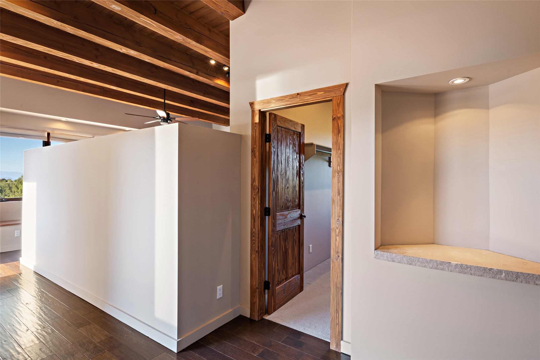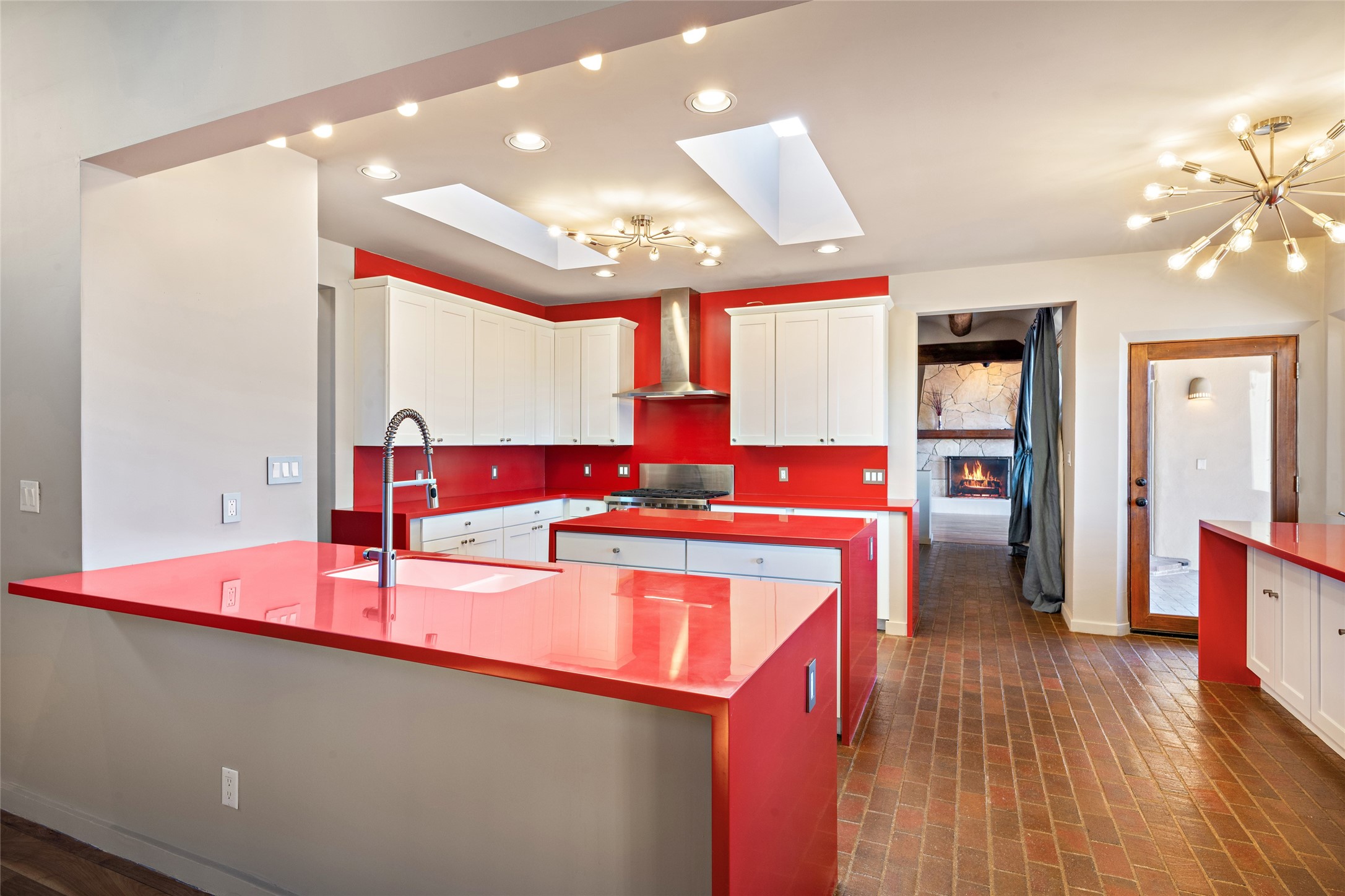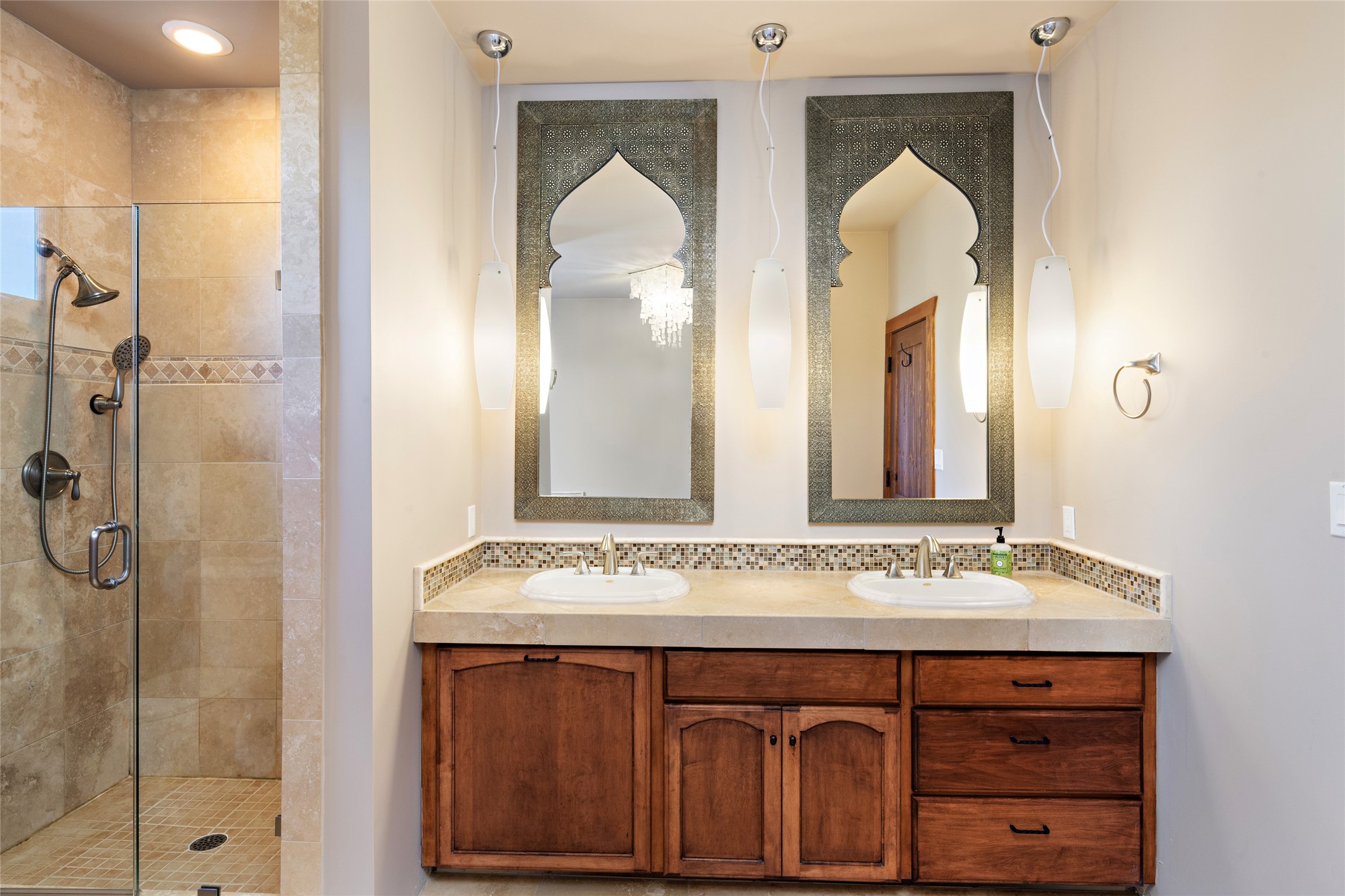 ENTERTAINER'S PARADISE! Not to mention the spectacular postcard-worthy sunset views of the Sandia and Ortiz, mountains from the back patio, and Sangres from the front patio. Sited on a large greenbelt at the end of a cul-de-sac. Four mini-splits provide real air conditioning. New stucco, interior paint and brick floors refinished in September 2023. Kitchen updated in 2022 with new appliances - a 6-burner Wolf gas range, Bosch dishwasher and LG refrigerator and more counter seating and storage. Two primary suites on opposite ends of the house, both with large walk-in closets, provide numerous options, from an in-law suite, to a large artist's studio. The larger of the suites has a sitting room with fantastic mountain views, a smaller room that is plumbed to be a kitchenette, and a separate back entrance. Huge closest with an entire wall of built-in shelves and drawers in first primary bedroom with beautiful spa-like bath with jetted tub, and double sinks. Banco with storage under picture window. Primary bedroom two has a generous 2-person jetted tub, double sinks and beautiful shower. Both primary suites have a fireplace, and there are two more in living areas, for a total of four. Fifth bedroom is set up as a beautiful office with built-ins. The new brick back patio has a sunken seating area with a built-in gas grill, a fire table and a long covered portal which is a great place to entertain or relax. The two added front flagstone patios provide additional space for seating and gorgeous views of snow-covered mountains in the winter - both patios have solar lighting. There is also a secure coyote-fenced backyard space that provides a safe area for dogs to play. Generous laundry room with sink and pantry. Oversized, extra deep 2-car garage with storage. A few steps up from the garage, otherwise single-level. Radiant is PEX. Domestic is copper. Water softener 2019. Each room has a ceiling fan. Custom screen doors, insulated blinds.