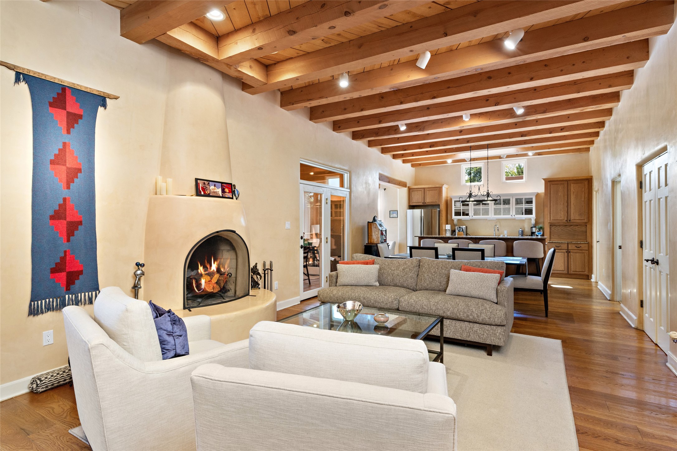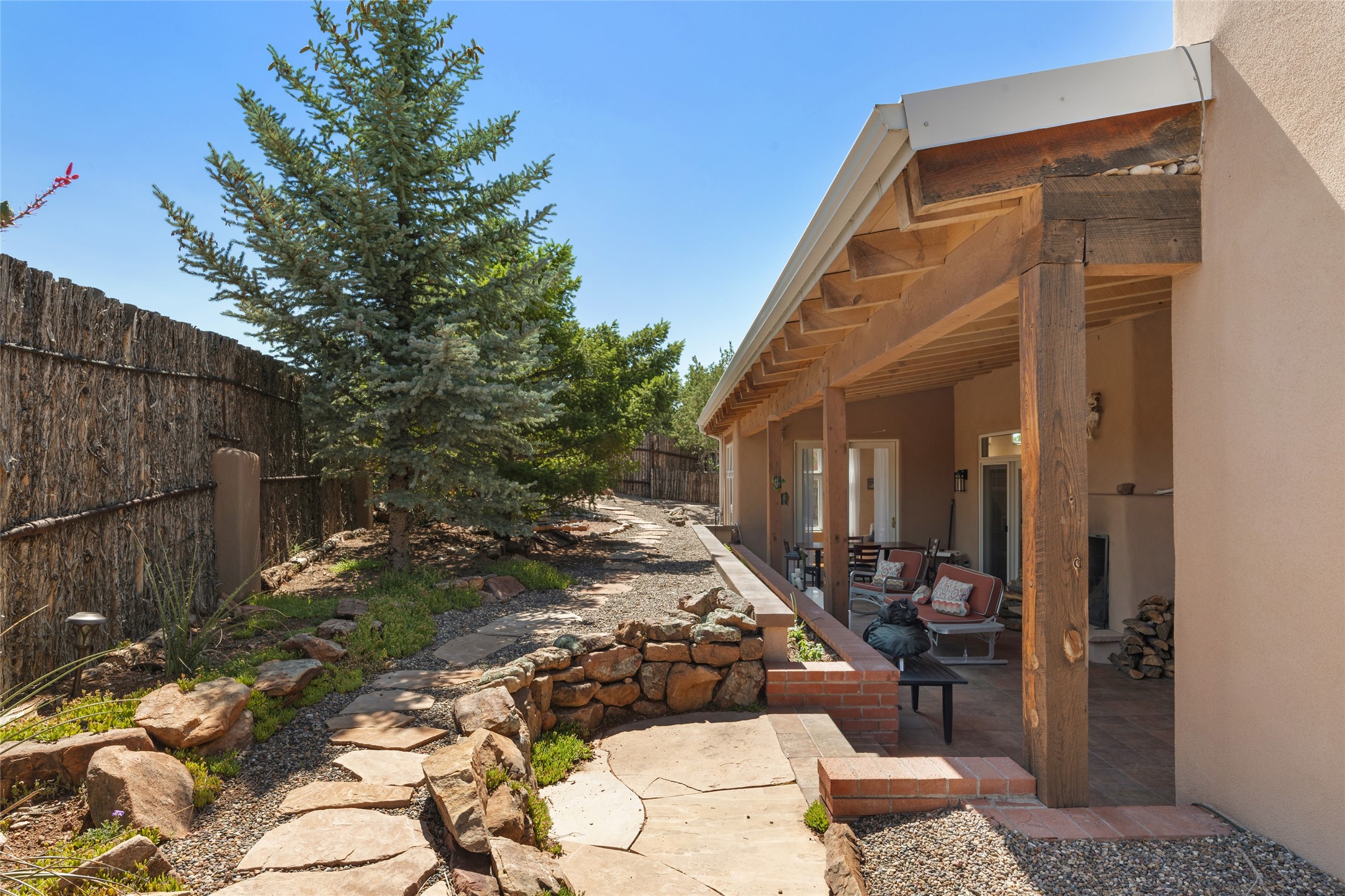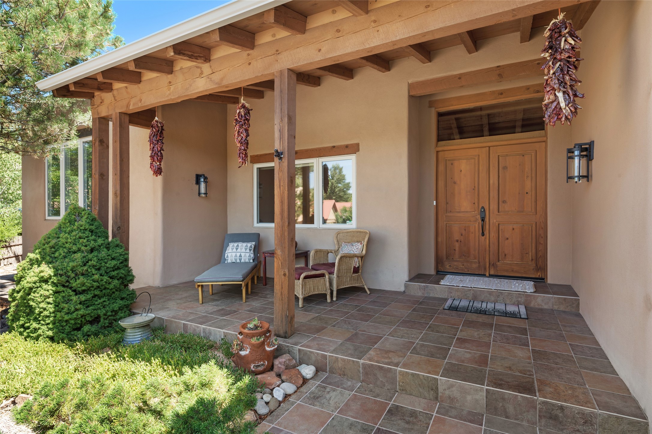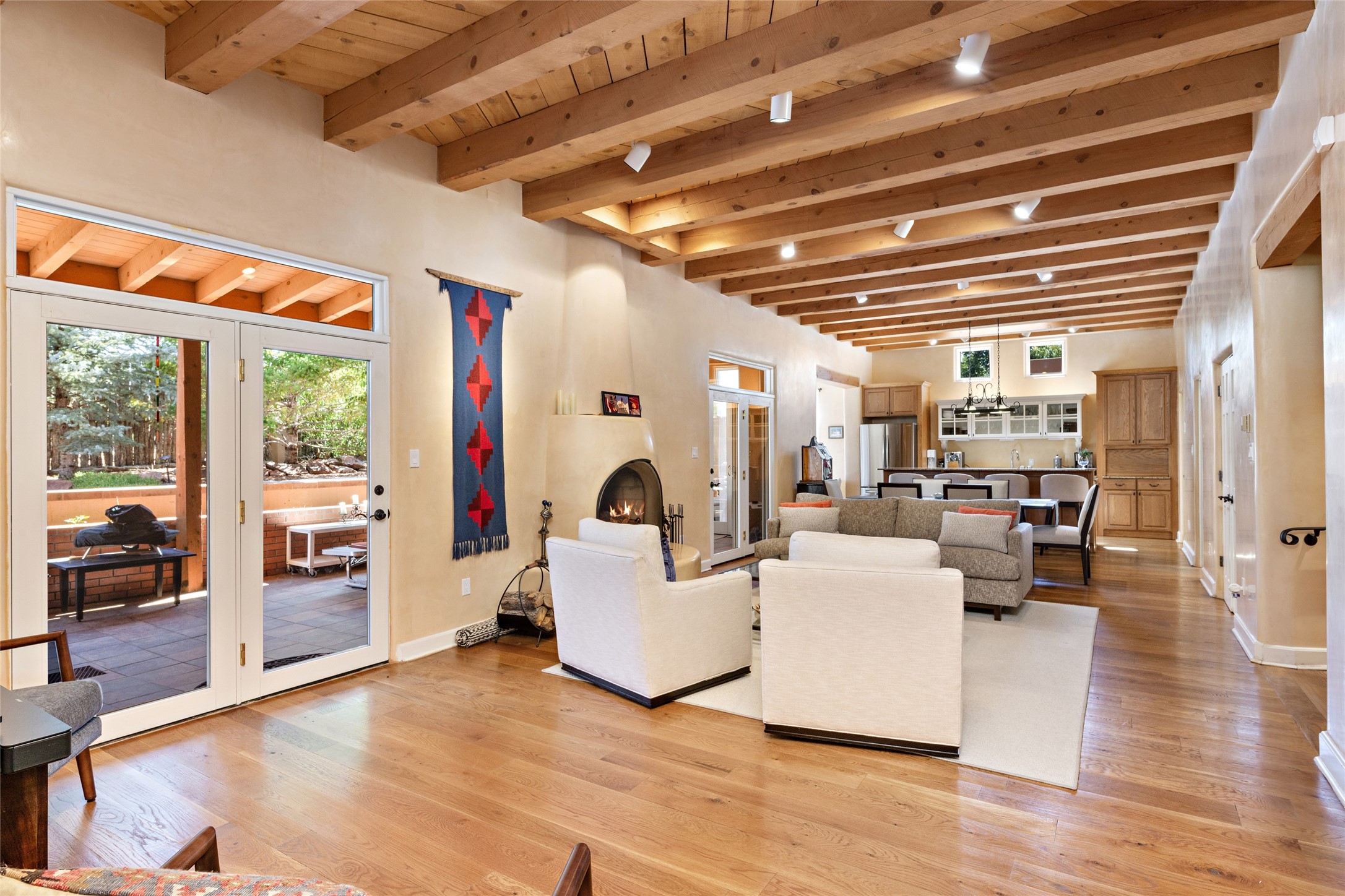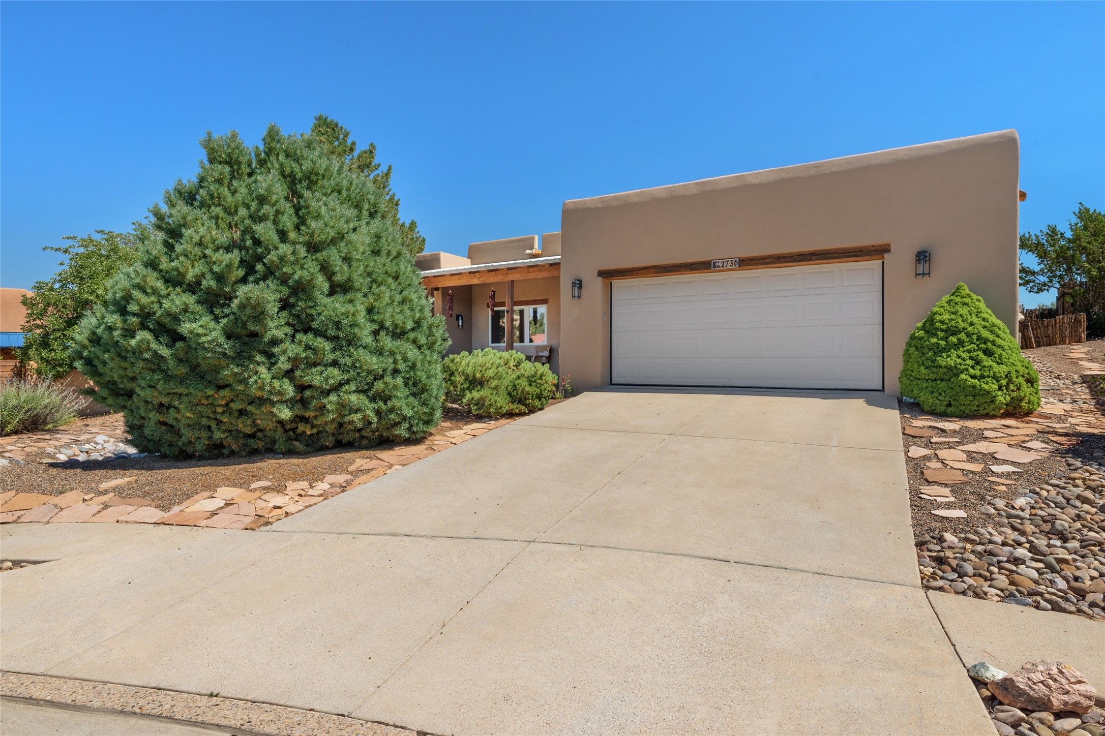 Discover the enchantment of Santa Fe in this 3-bed, 2-bath home. Built in 2002 on .22 acres, it exudes Southwestern charm with a Sun Mountain view, wood floors, and open layout. The living room boasts a kiva fireplace, high ceilings, and skylights, creating an inviting ambiance. The kitchen, complete with a large island, new appliances, and walk-in pantry, is perfect for culinary enthusiasts. Unwind in the primary bedroom, a true homeowner's retreat, featuring a kiva fireplace and access to the back portal. The spacious primary bathroom offers a jetted tub for relaxation. Custom closet organizers enhance the primary walk-in closet, and beautiful hardwood floors grace the home. A newer roof adds value and peace of mind. Radiant heat and evaporative cooling ensure year-round comfort indoors. Step outside to a xeriscaped yard with a captivating garden, soothing fountain, and a cozy Rumford fireplace. This outdoor oasis sets the stage for entertaining and tranquil moments. The garage organization and abundant storage throughout the home make staying organized effortless. Meticulously maintained, this property embodies the beauty of Santa Fe living and entertaining. Beyond a house, it's a sanctuary, a retreat, and a statement of living well. Embrace Southwestern elegance and make 2736 Pradera your home today.