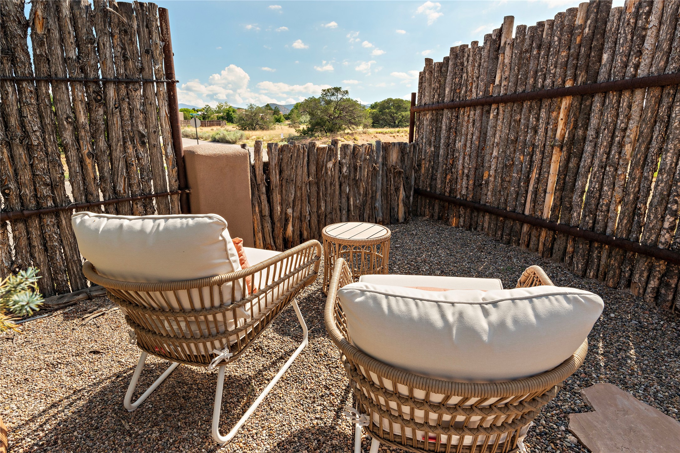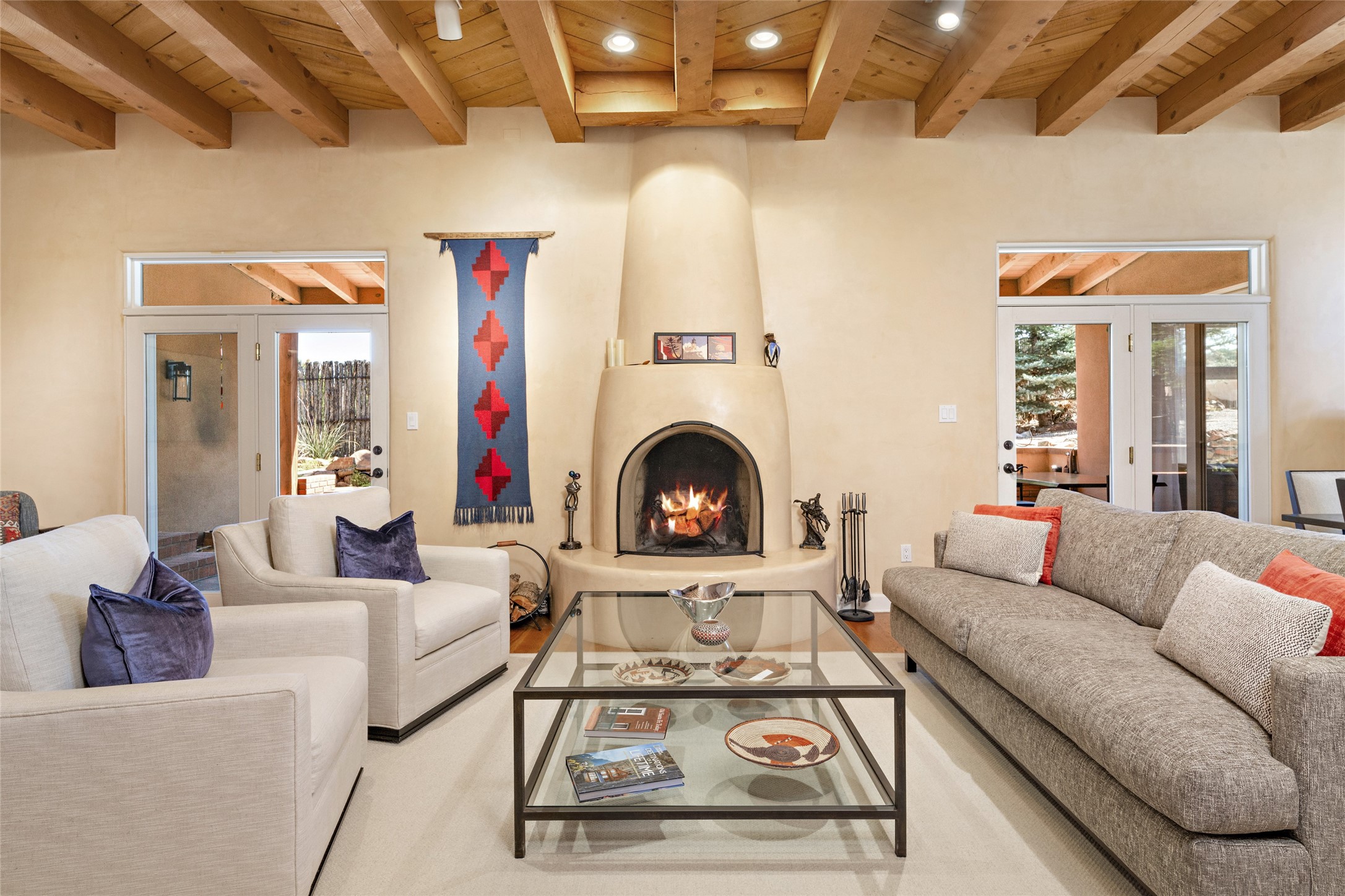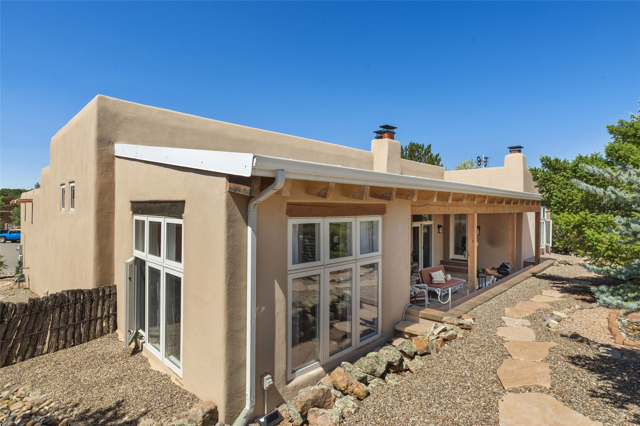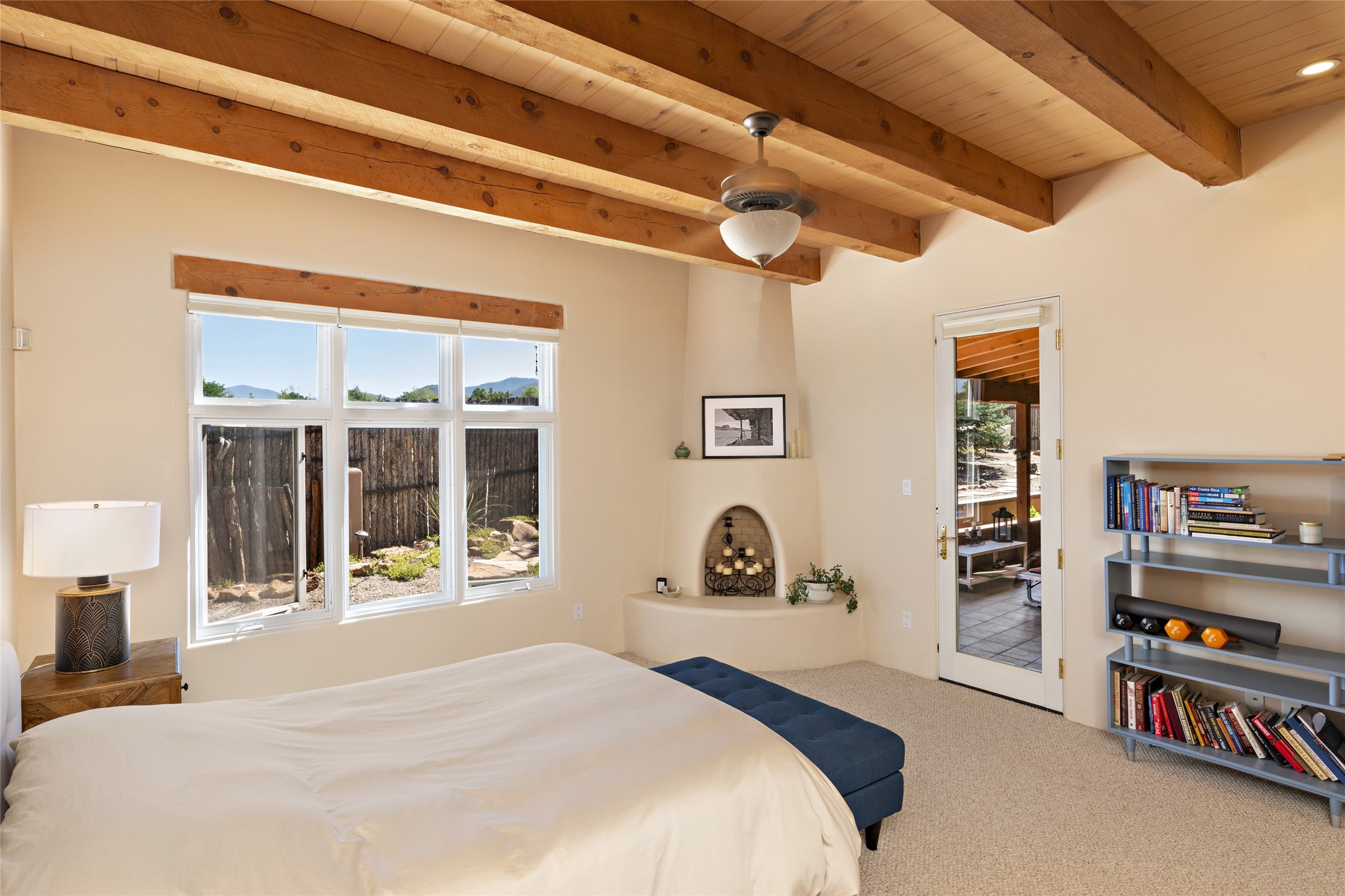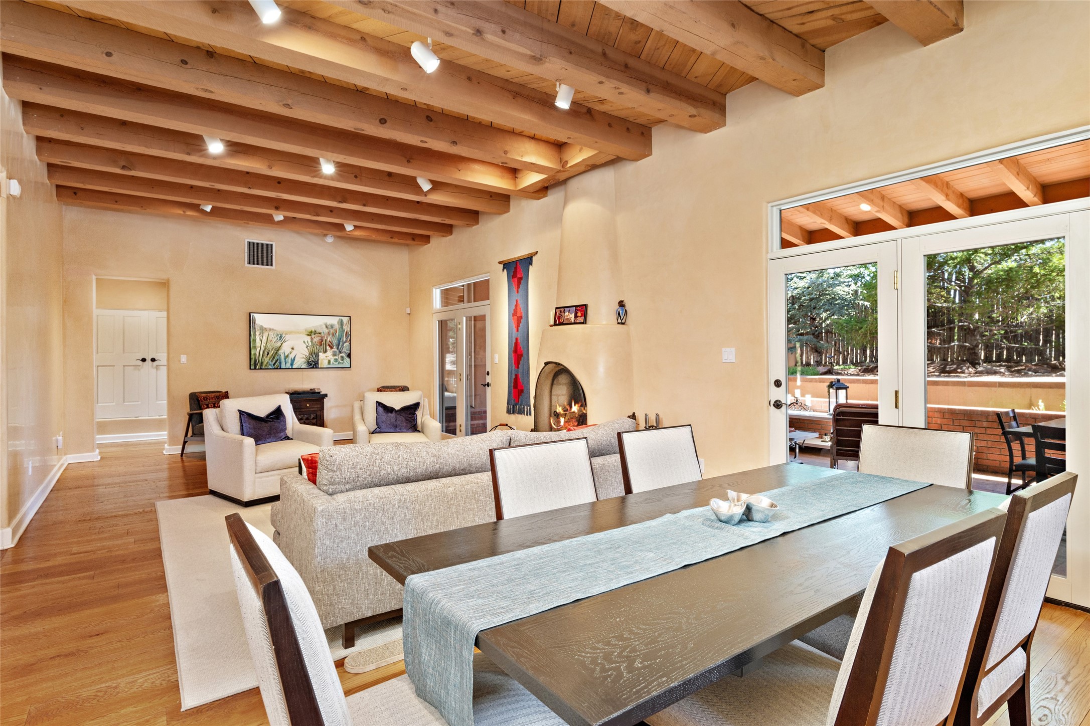 Discover the enchantment of Santa Fe in this 3-bed, 2-bath home. Built in 2002 on .22 acres, it exudes Southwestern charm with a Sun Mountain view, wood floors, and open layout. The living room boasts a kiva fireplace, high ceilings, and skylights, creating an inviting ambiance. The kitchen, complete with a large island, new appliances, and walk-in pantry, is perfect for culinary enthusiasts. Unwind in the primary bedroom, a true homeowner's retreat, featuring a kiva fireplace and access to the back portal. The spacious primary bathroom offers a jetted tub for relaxation. Custom closet organizers enhance the primary walk-in closet, and beautiful hardwood floors grace the home. A newer roof adds value and peace of mind. Radiant heat and evaporative cooling ensure year-round comfort indoors. Step outside to a xeriscaped yard with a captivating garden, soothing fountain, and a cozy Rumford fireplace. This outdoor oasis sets the stage for entertaining and tranquil moments. The garage organization and abundant storage throughout the home make staying organized effortless. Meticulously maintained, this property embodies the beauty of Santa Fe living and entertaining. Beyond a house, it's a sanctuary, a retreat, and a statement of living well. Embrace Southwestern elegance and make 2736 Pradera your home today.