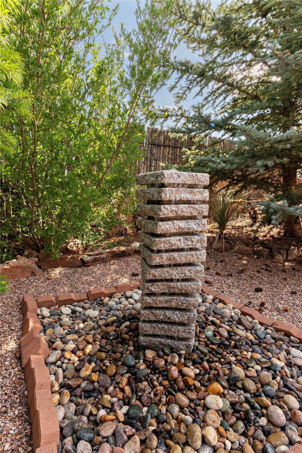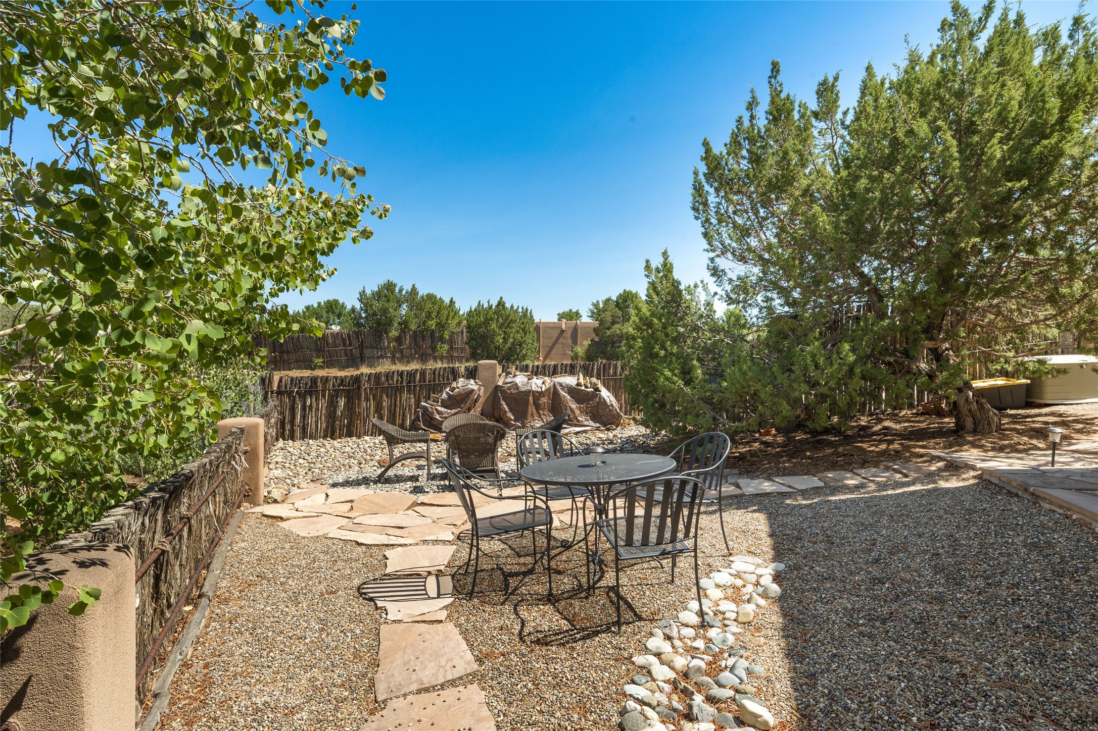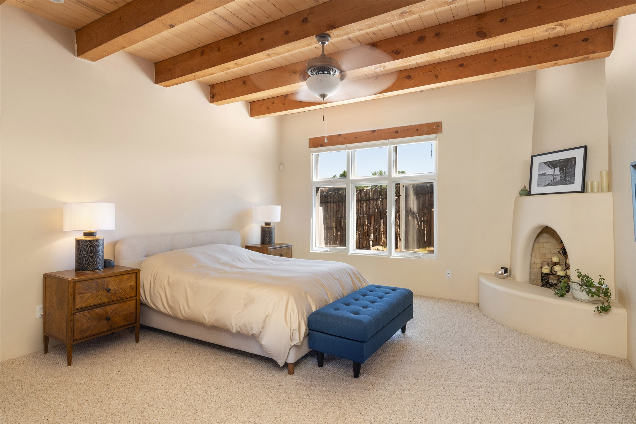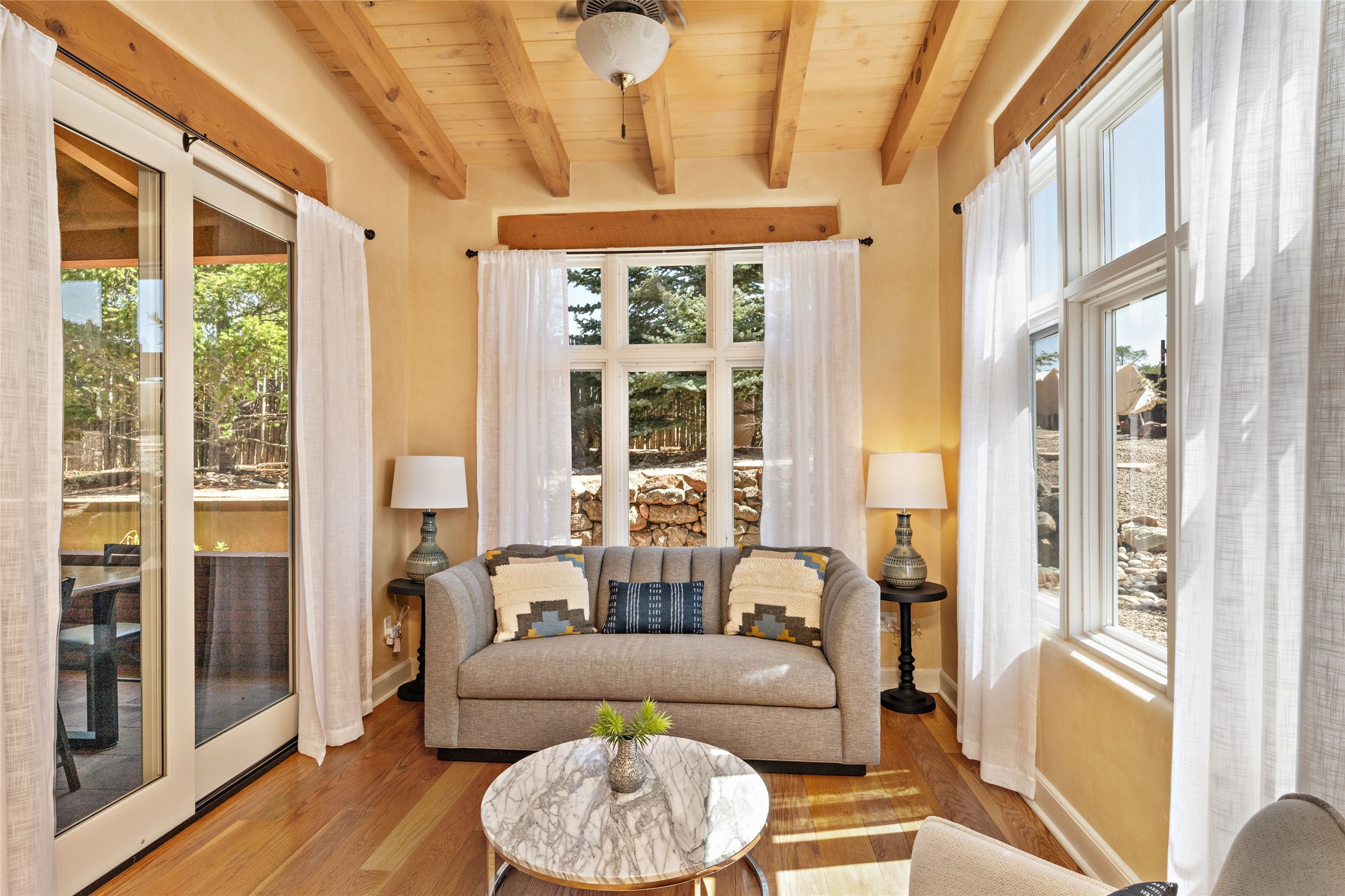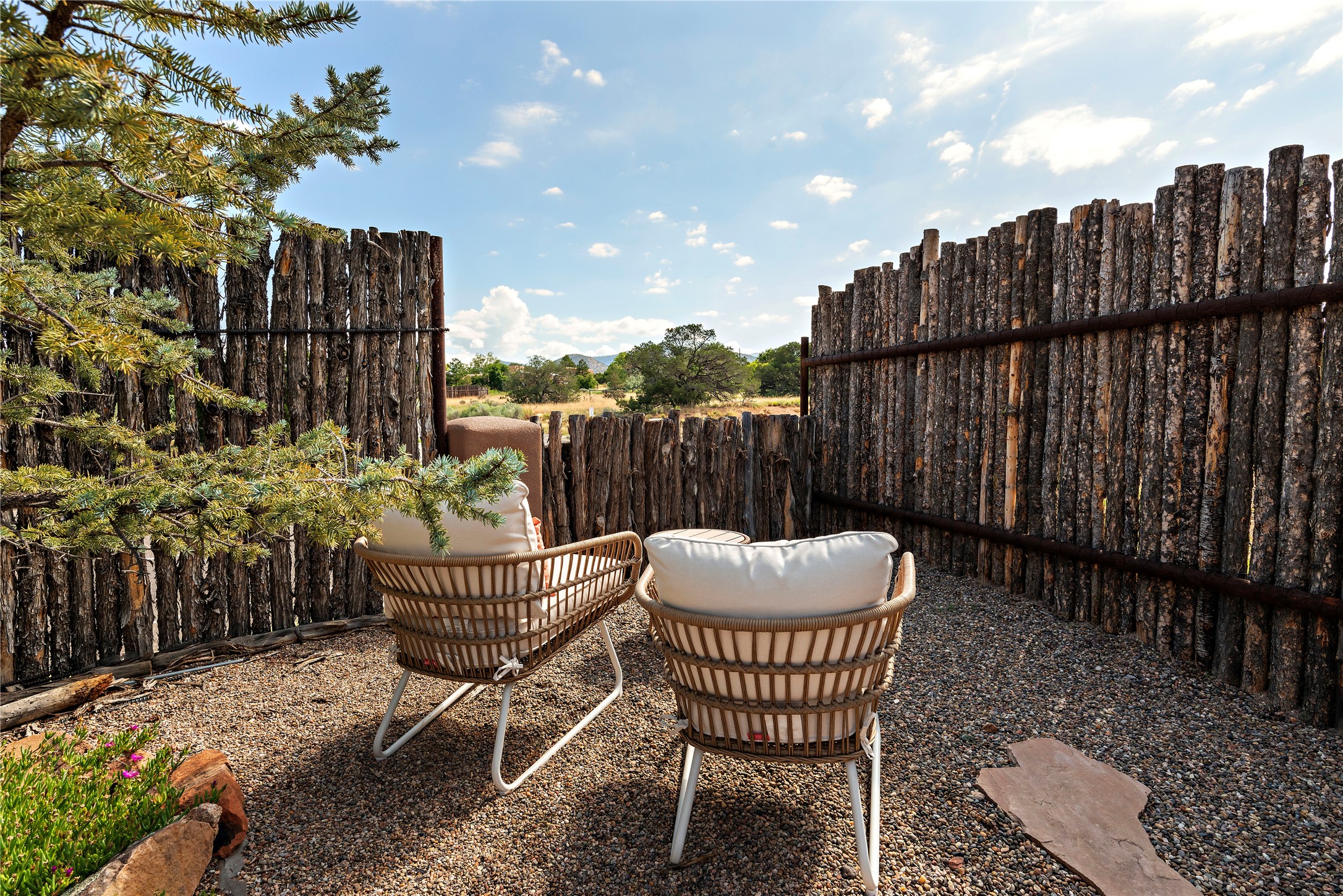 Discover the enchantment of Santa Fe in this 3-bed, 2-bath home. Built in 2002 on .22 acres, it exudes Southwestern charm with a Sun Mountain view, wood floors, and open layout. The living room boasts a kiva fireplace, high ceilings, and skylights, creating an inviting ambiance. The kitchen, complete with a large island, new appliances, and walk-in pantry, is perfect for culinary enthusiasts. Unwind in the primary bedroom, a true homeowner's retreat, featuring a kiva fireplace and access to the back portal. The spacious primary bathroom offers a jetted tub for relaxation. Custom closet organizers enhance the primary walk-in closet, and beautiful hardwood floors grace the home. A newer roof adds value and peace of mind. Radiant heat and evaporative cooling ensure year-round comfort indoors. Step outside to a xeriscaped yard with a captivating garden, soothing fountain, and a cozy Rumford fireplace. This outdoor oasis sets the stage for entertaining and tranquil moments. The garage organization and abundant storage throughout the home make staying organized effortless. Meticulously maintained, this property embodies the beauty of Santa Fe living and entertaining. Beyond a house, it's a sanctuary, a retreat, and a statement of living well. Embrace Southwestern elegance and make 2736 Pradera your home today.