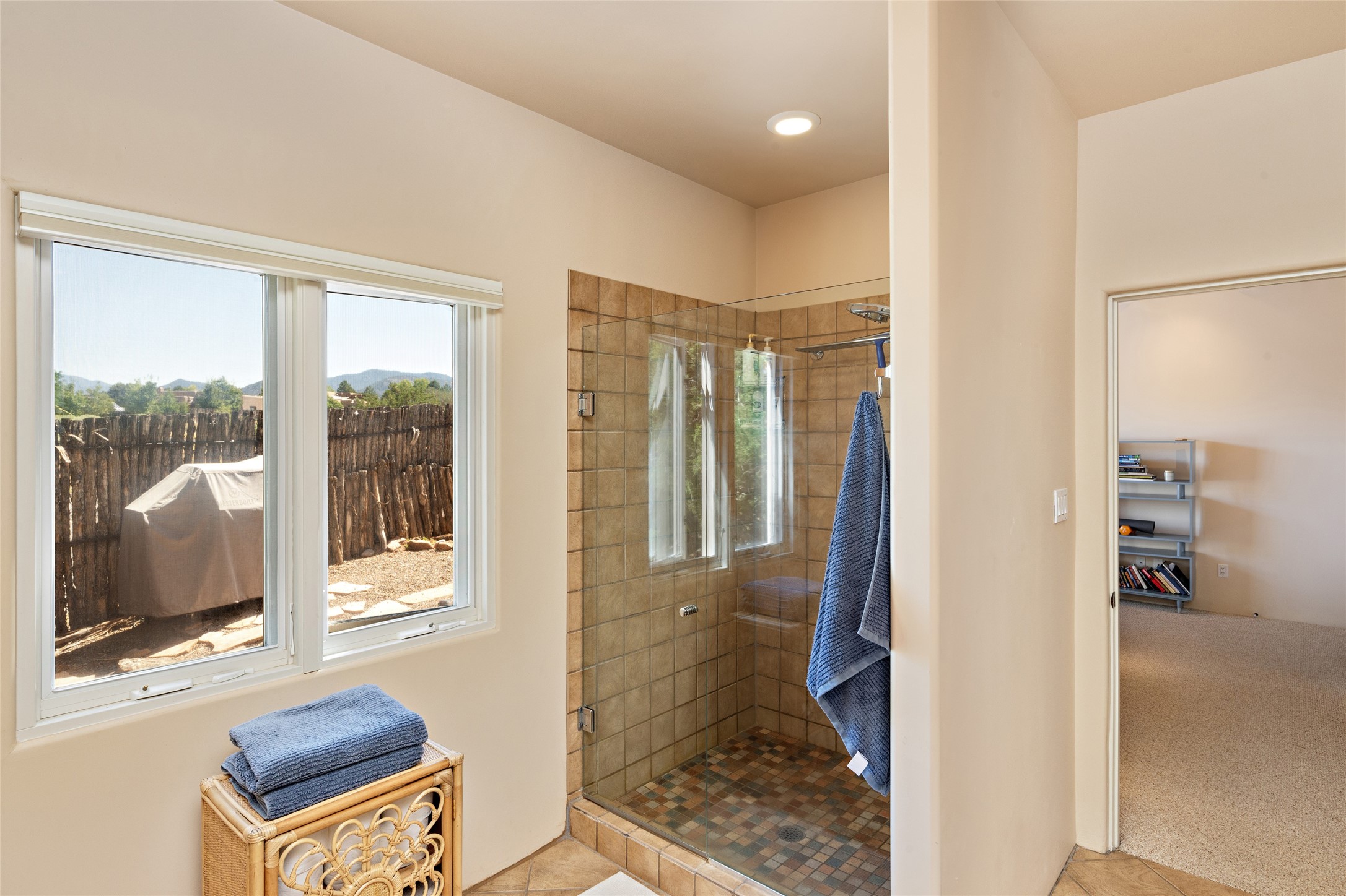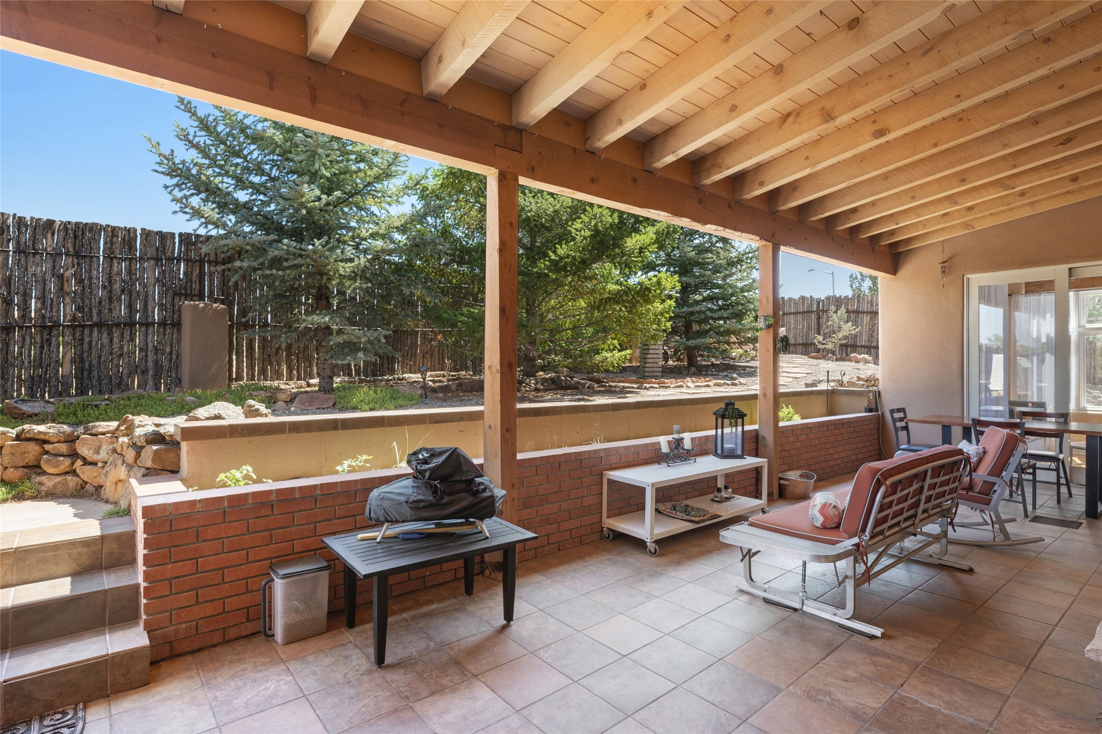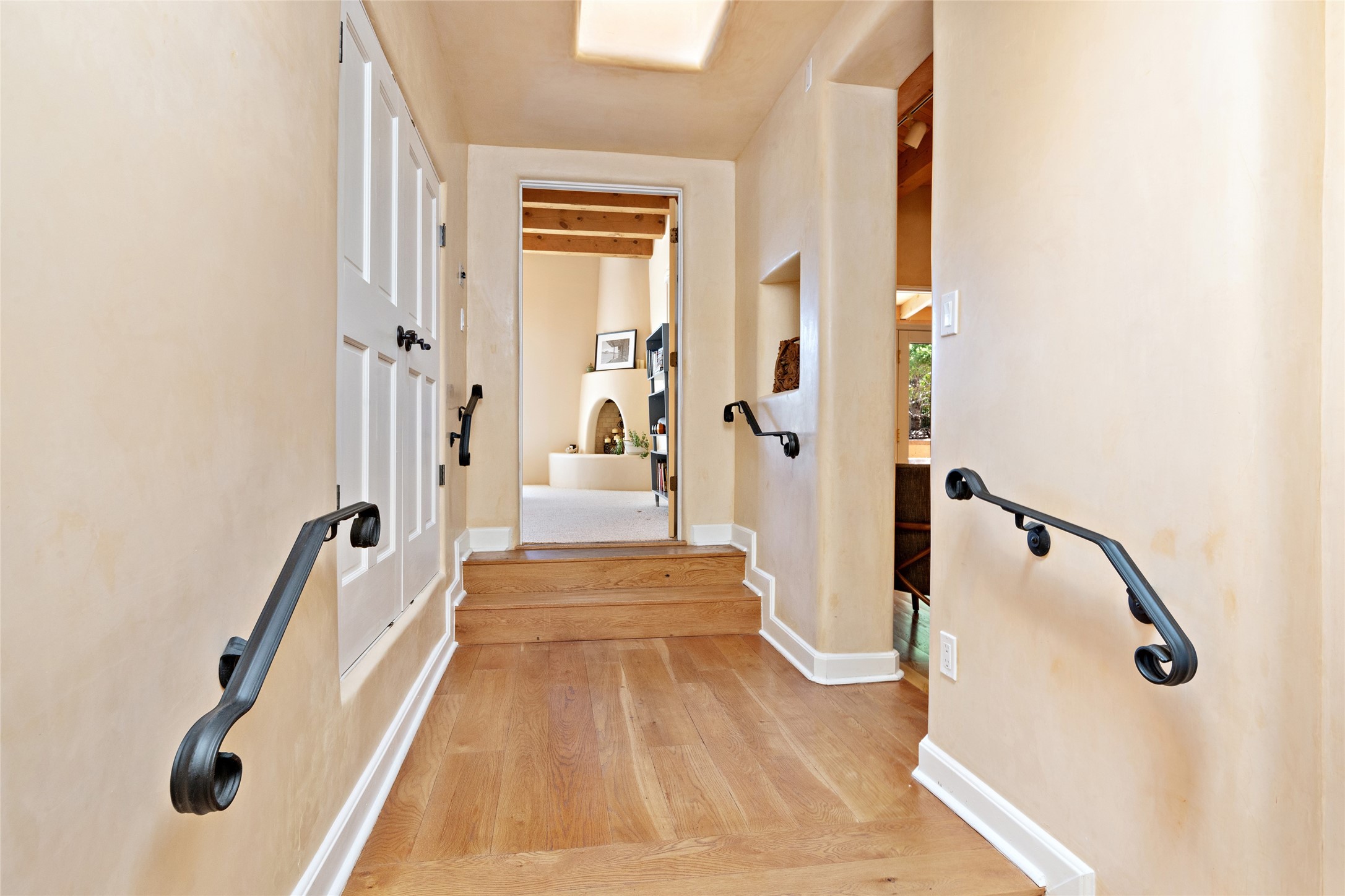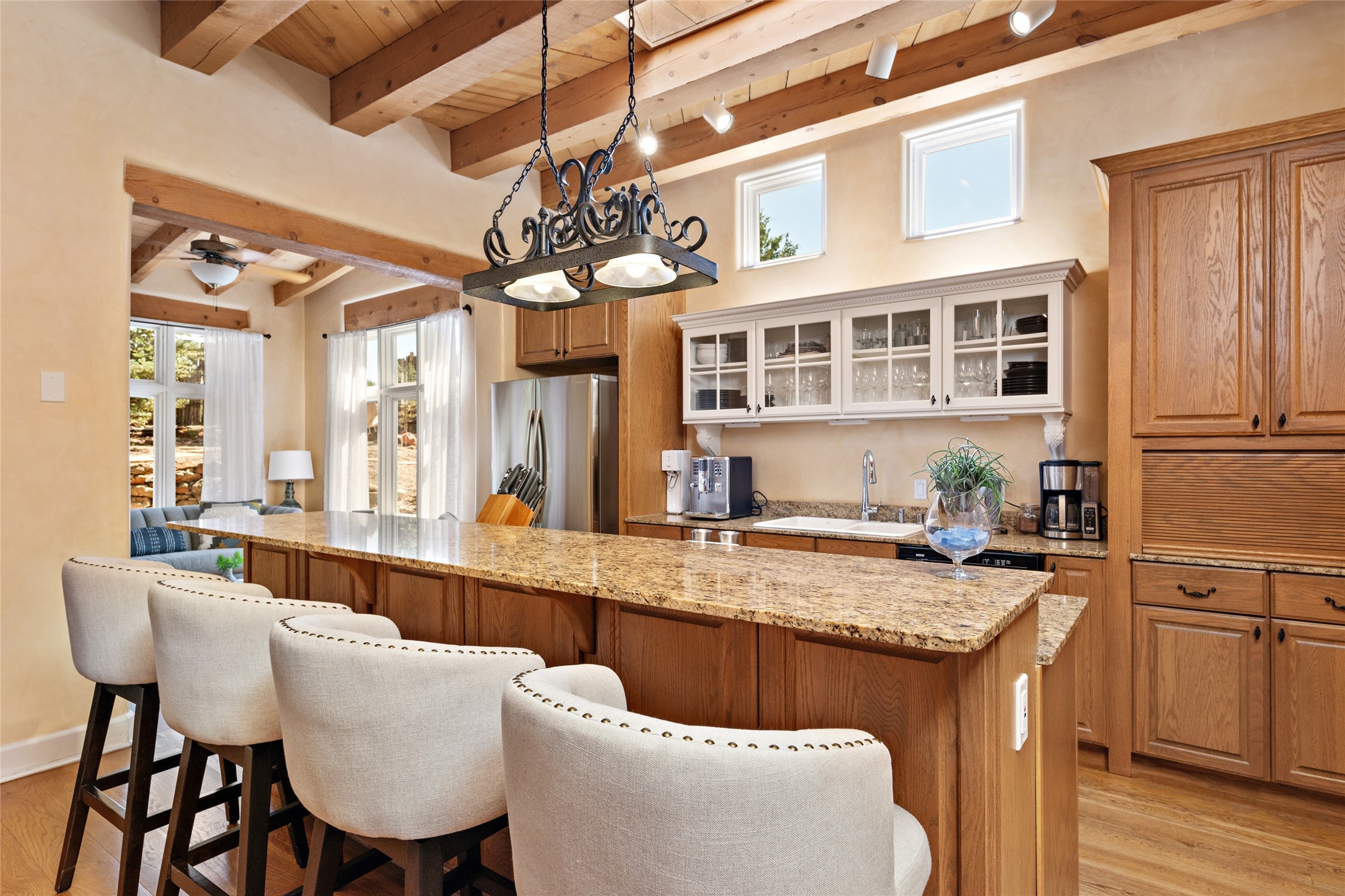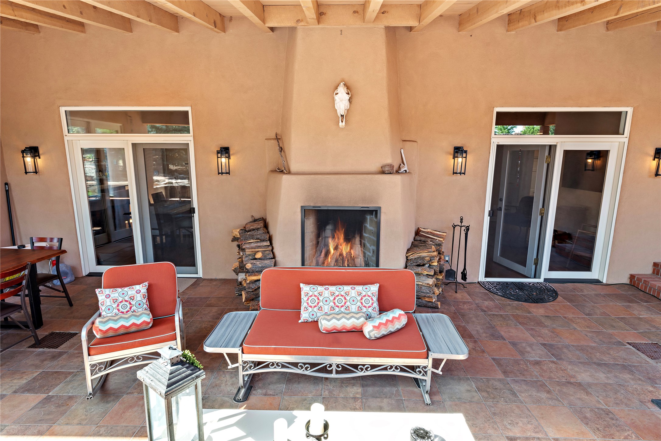 Discover the enchantment of Santa Fe in this 3-bed, 2-bath home. Built in 2002 on .22 acres, it exudes Southwestern charm with a Sun Mountain view, wood floors, and open layout. The living room boasts a kiva fireplace, high ceilings, and skylights, creating an inviting ambiance. The kitchen, complete with a large island, new appliances, and walk-in pantry, is perfect for culinary enthusiasts. Unwind in the primary bedroom, a true homeowner's retreat, featuring a kiva fireplace and access to the back portal. The spacious primary bathroom offers a jetted tub for relaxation. Custom closet organizers enhance the primary walk-in closet, and beautiful hardwood floors grace the home. A newer roof adds value and peace of mind. Radiant heat and evaporative cooling ensure year-round comfort indoors. Step outside to a xeriscaped yard with a captivating garden, soothing fountain, and a cozy Rumford fireplace. This outdoor oasis sets the stage for entertaining and tranquil moments. The garage organization and abundant storage throughout the home make staying organized effortless. Meticulously maintained, this property embodies the beauty of Santa Fe living and entertaining. Beyond a house, it's a sanctuary, a retreat, and a statement of living well. Embrace Southwestern elegance and make 2736 Pradera your home today.
