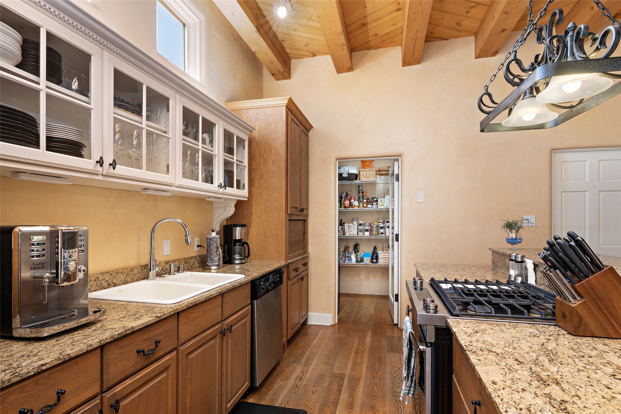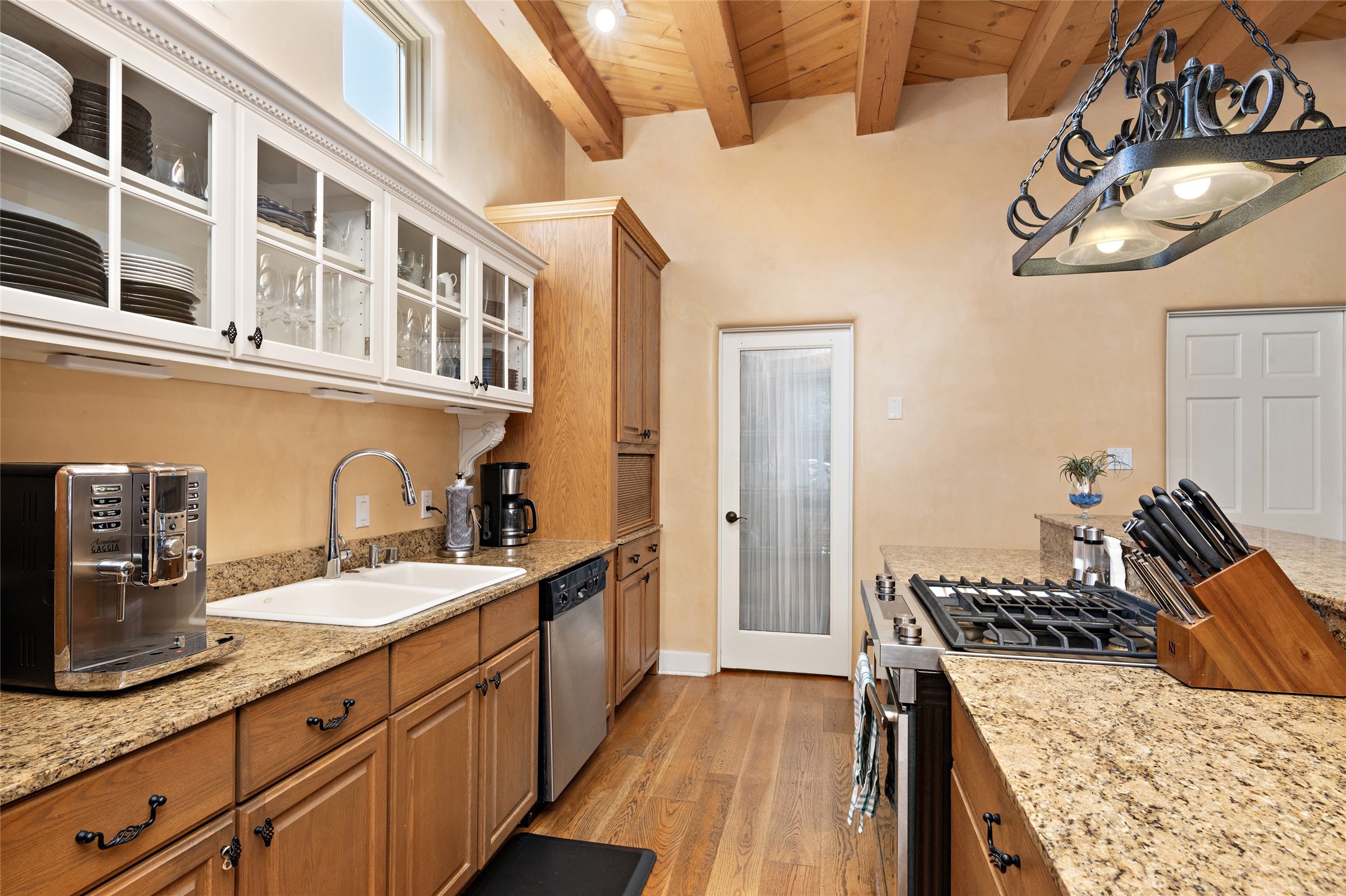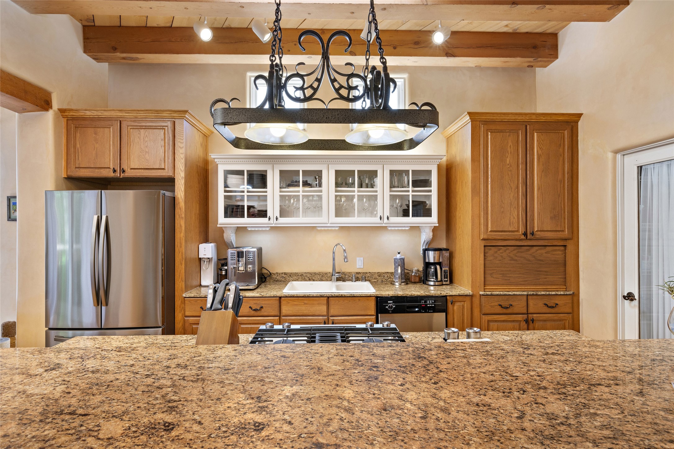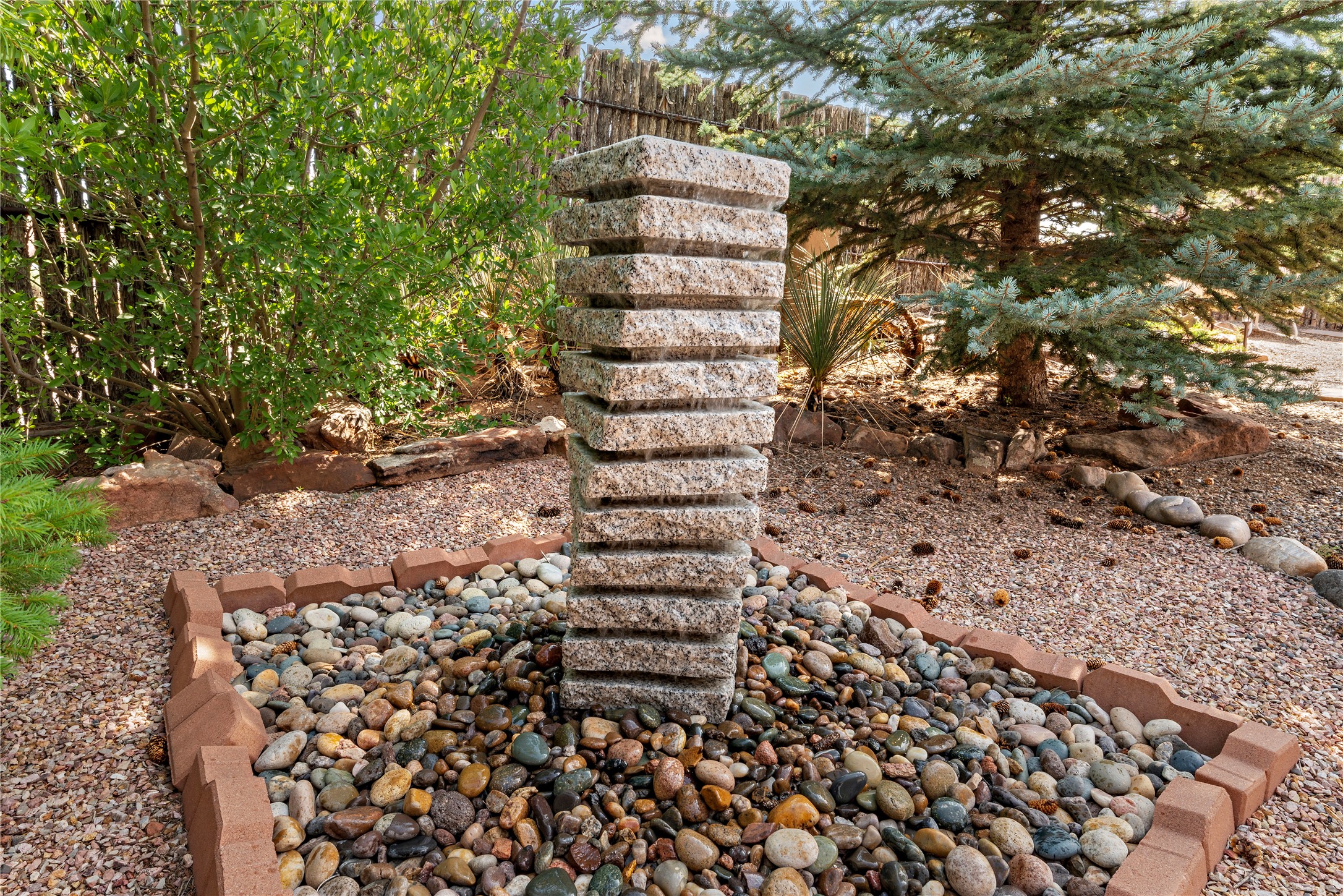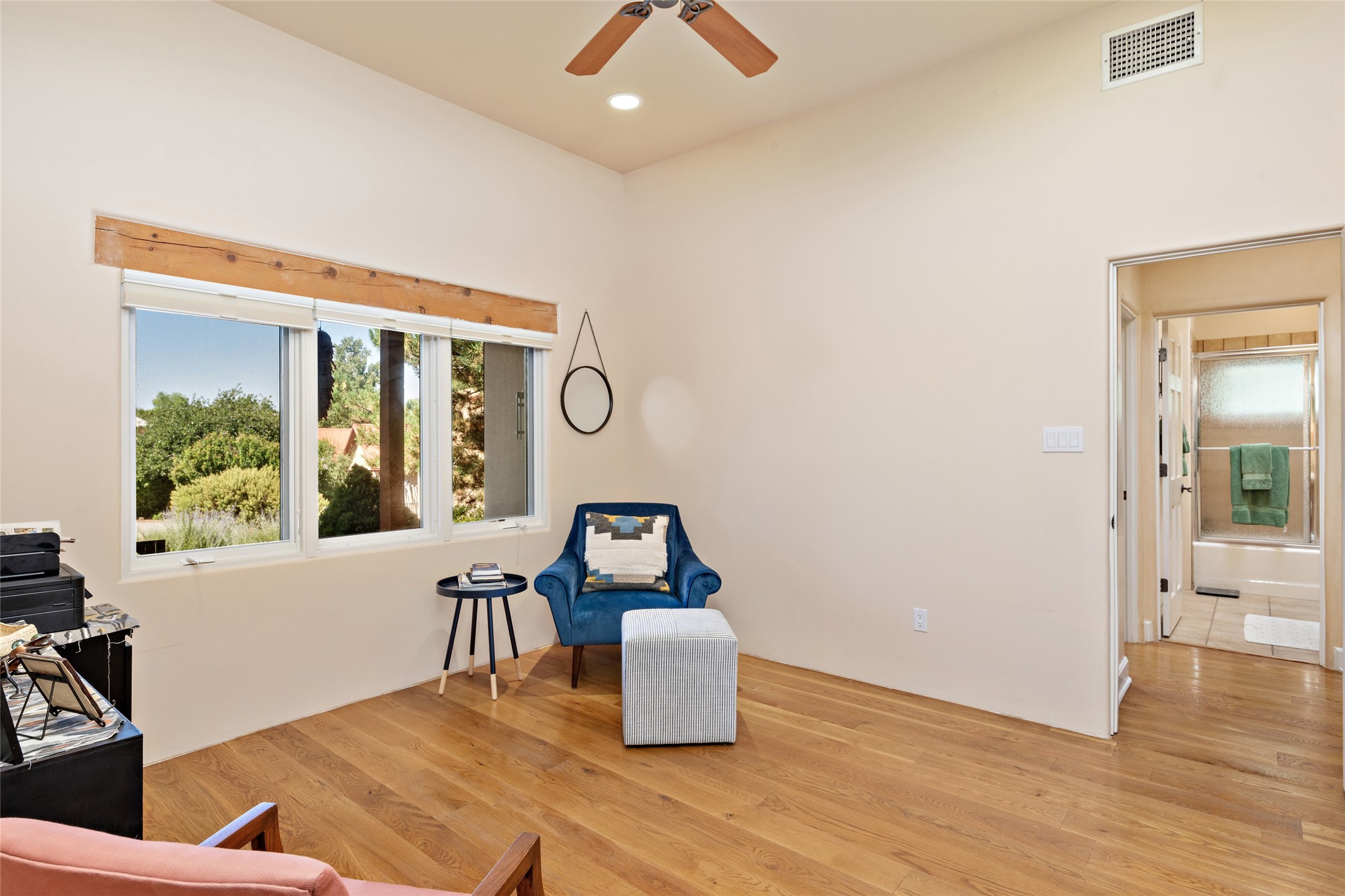 Discover the enchantment of Santa Fe in this 3-bed, 2-bath home. Built in 2002 on .22 acres, it exudes Southwestern charm with a Sun Mountain view, wood floors, and open layout. The living room boasts a kiva fireplace, high ceilings, and skylights, creating an inviting ambiance. The kitchen, complete with a large island, new appliances, and walk-in pantry, is perfect for culinary enthusiasts. Unwind in the primary bedroom, a true homeowner's retreat, featuring a kiva fireplace and access to the back portal. The spacious primary bathroom offers a jetted tub for relaxation. Custom closet organizers enhance the primary walk-in closet, and beautiful hardwood floors grace the home. A newer roof adds value and peace of mind. Radiant heat and evaporative cooling ensure year-round comfort indoors. Step outside to a xeriscaped yard with a captivating garden, soothing fountain, and a cozy Rumford fireplace. This outdoor oasis sets the stage for entertaining and tranquil moments. The garage organization and abundant storage throughout the home make staying organized effortless. Meticulously maintained, this property embodies the beauty of Santa Fe living and entertaining. Beyond a house, it's a sanctuary, a retreat, and a statement of living well. Embrace Southwestern elegance and make 2736 Pradera your home today.