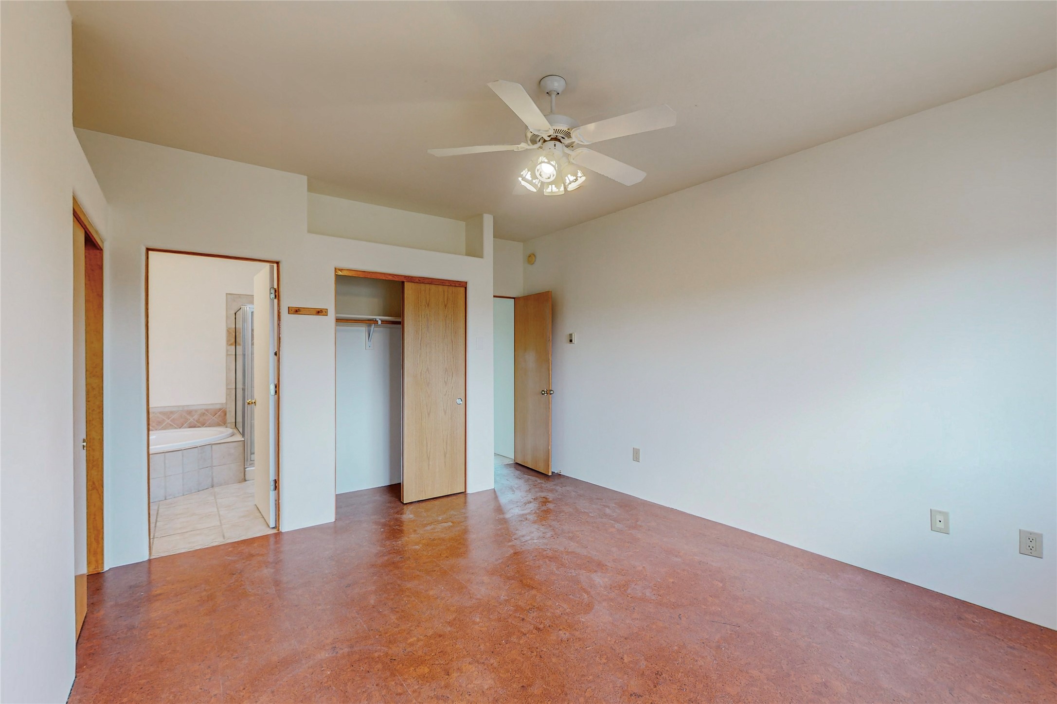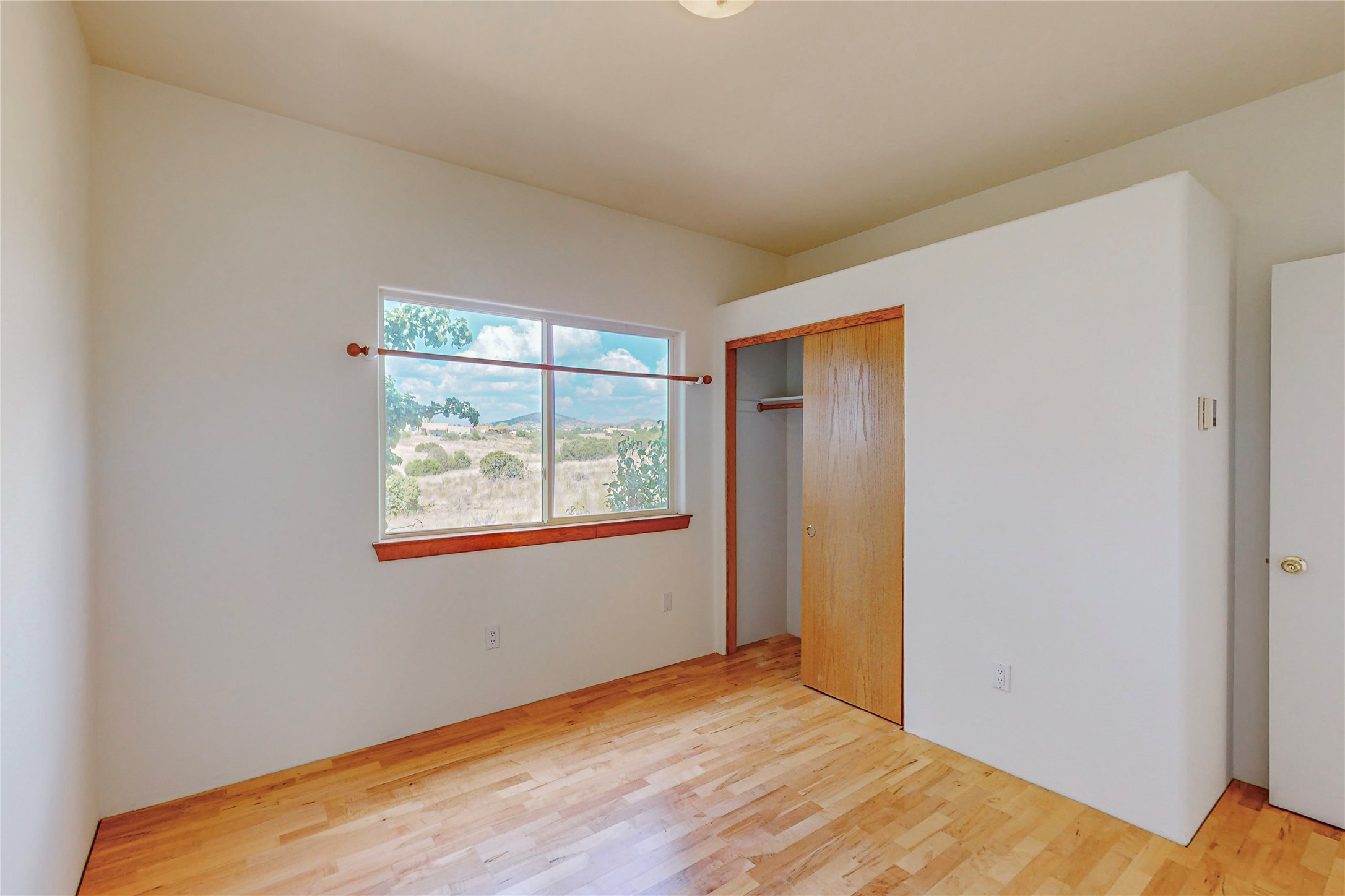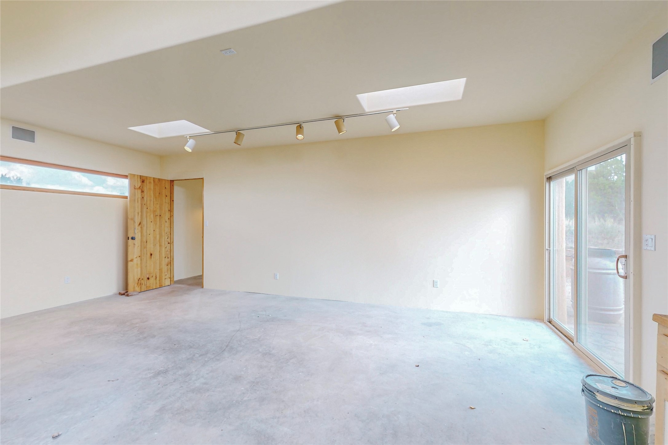 Open plan, split 3 bedroom, 2 bath home attached 800 sqft. 2 heated studios with huge high ceilings. Although small the high ceilings create a spacious feel. A sunburst design viga ceiling and corner living room fireplace opens to the kitchen and dining areas. The surrounding landscape is ready and invites your personal touches, and has sweeping mountain and sunset views. A large 2-car garage and plenty of guest parking adds convenience. Privately located on a cul de sac bordering a large greenbelt yet close to paved access roads leading to local shopping, restaurants, schools, senior center, and library. This home accesses all of Eldorado community activities and trails plus only minutes into Santa Fe.