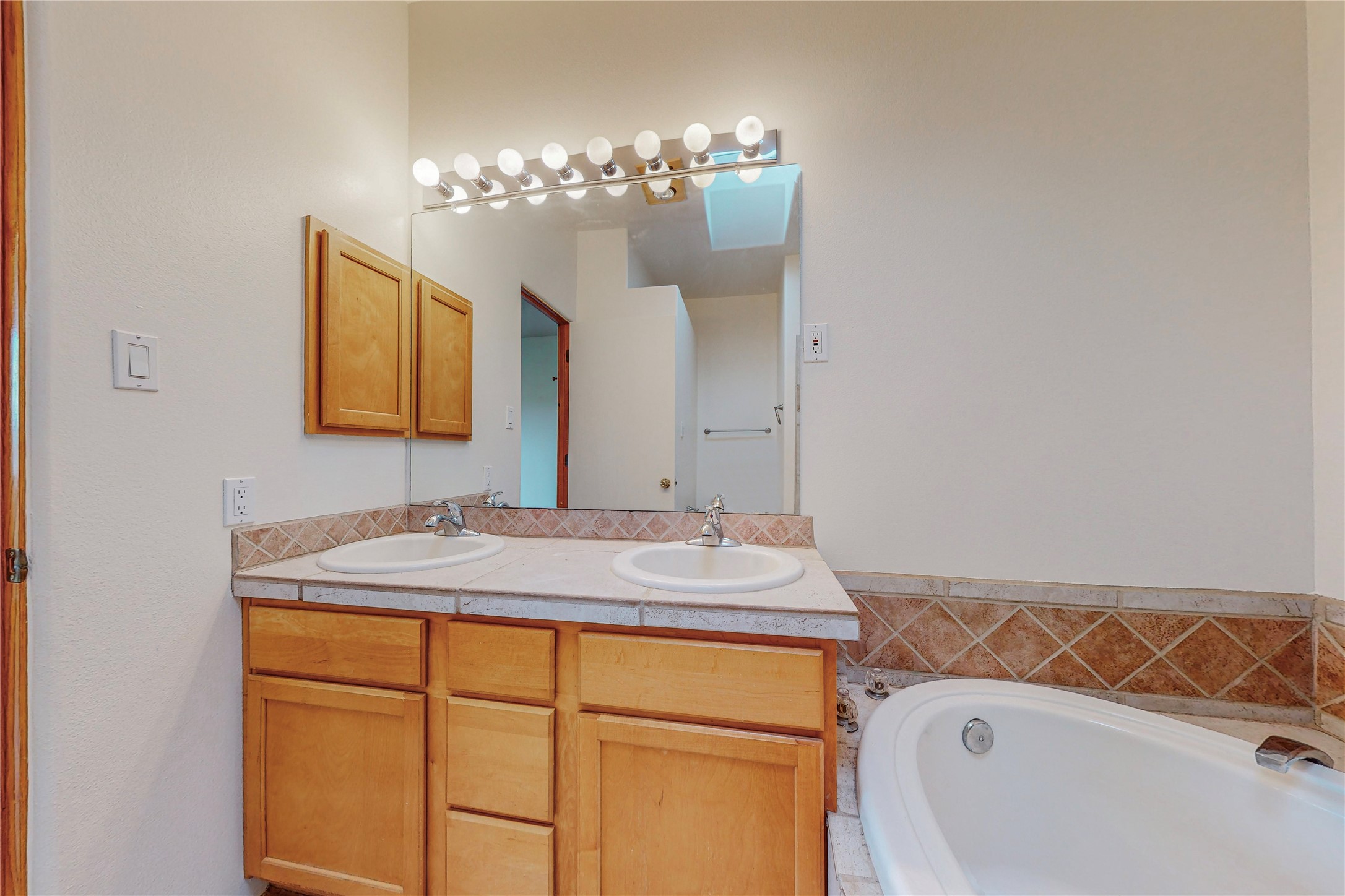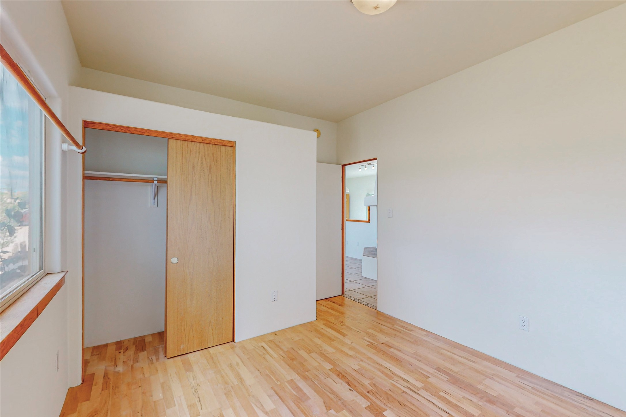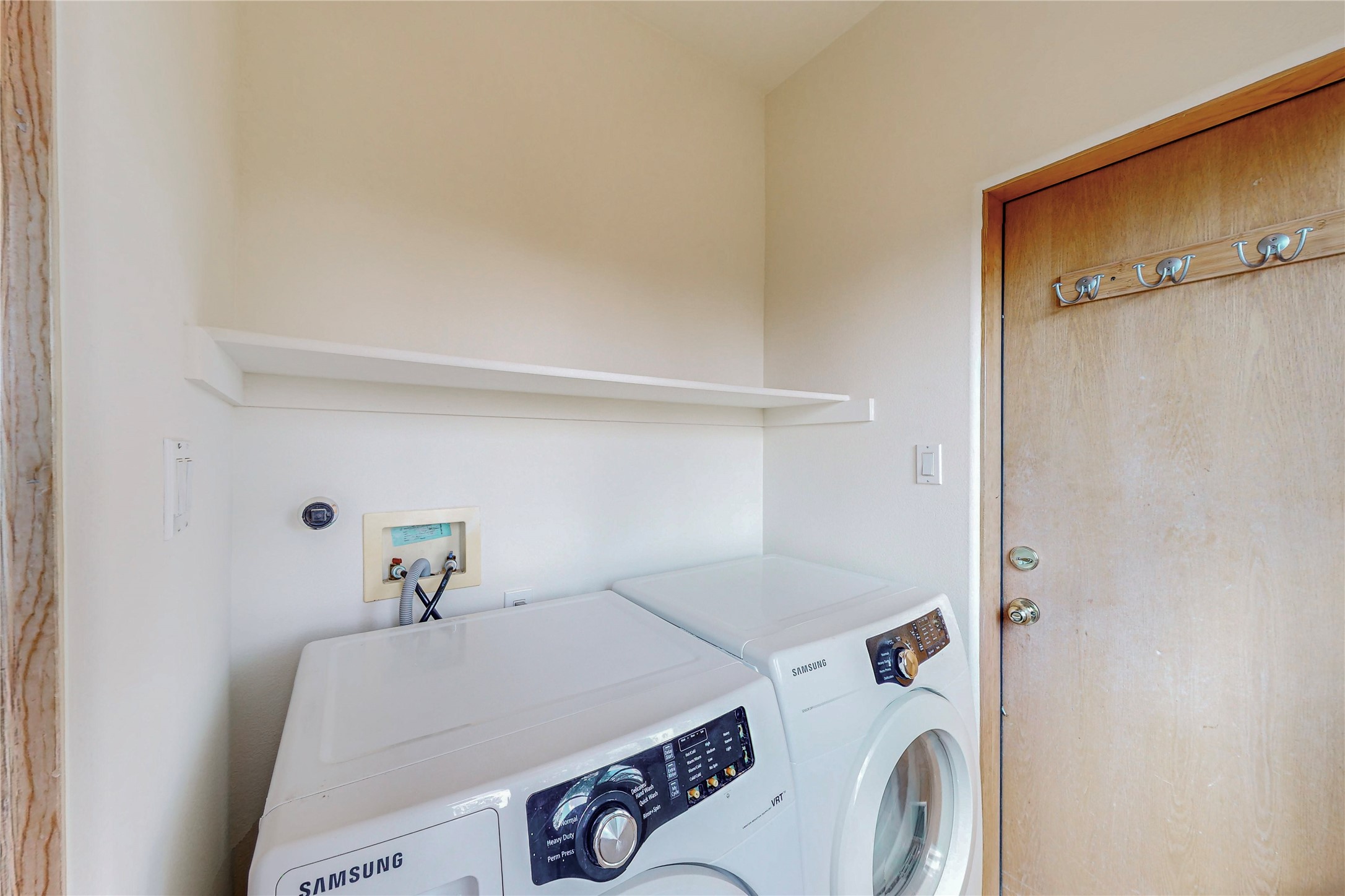 Open plan, split 3 bedroom, 2 bath home attached 800 sqft. 2 heated studios with huge high ceilings. Although small the high ceilings create a spacious feel. A sunburst design viga ceiling and corner living room fireplace opens to the kitchen and dining areas. The surrounding landscape is ready and invites your personal touches, and has sweeping mountain and sunset views. A large 2-car garage and plenty of guest parking adds convenience. Privately located on a cul de sac bordering a large greenbelt yet close to paved access roads leading to local shopping, restaurants, schools, senior center, and library. This home accesses all of Eldorado community activities and trails plus only minutes into Santa Fe.