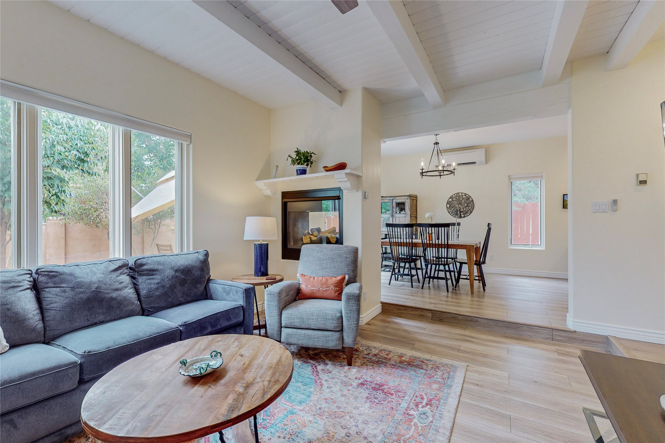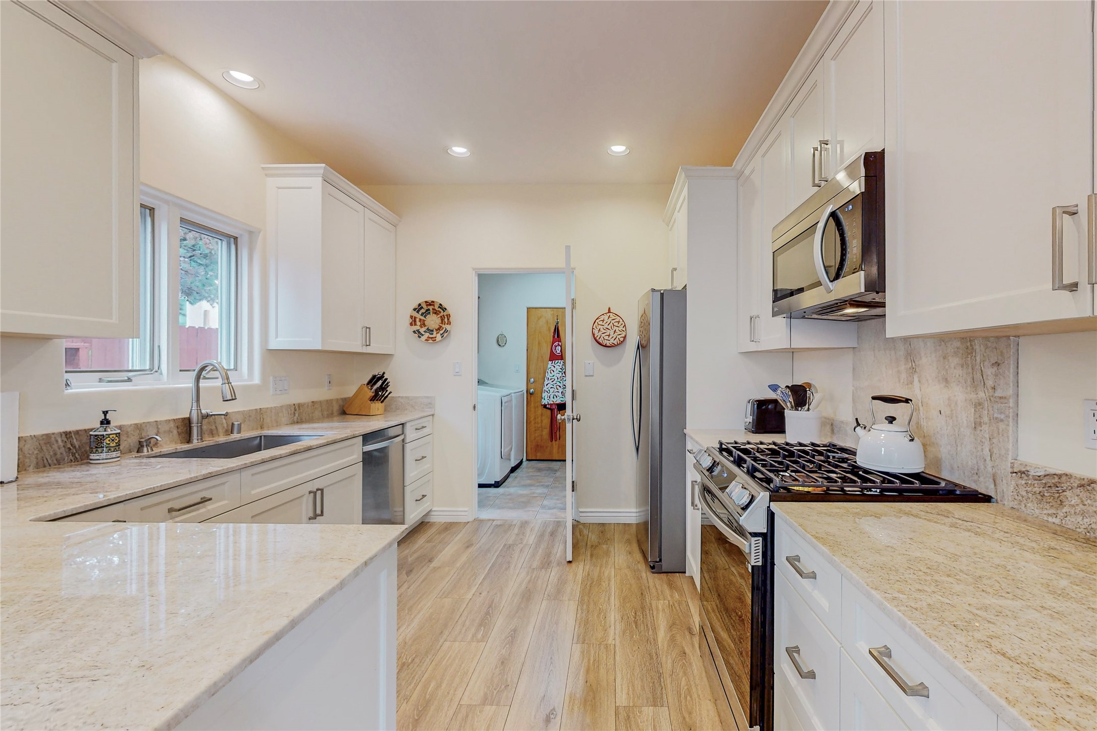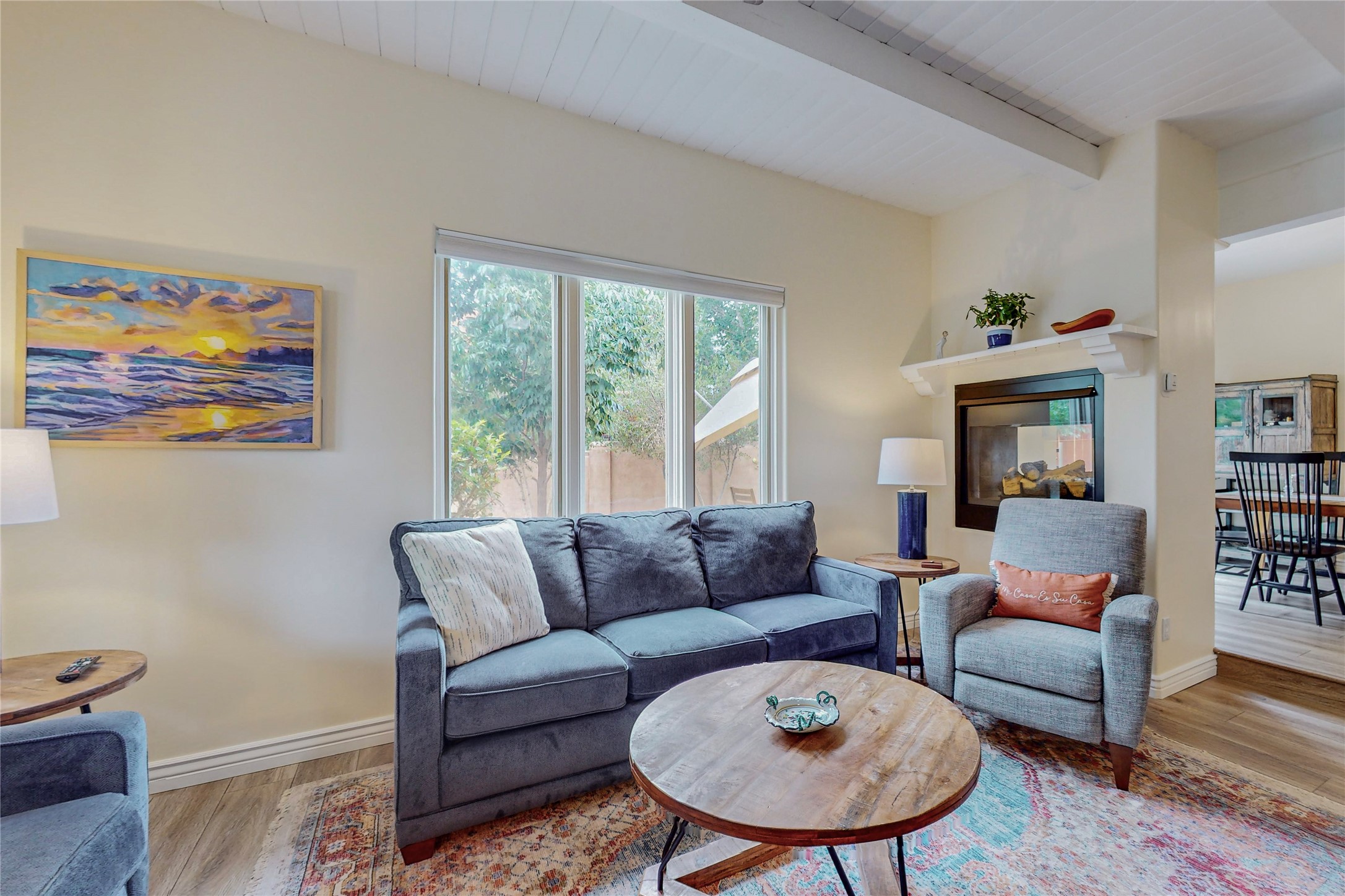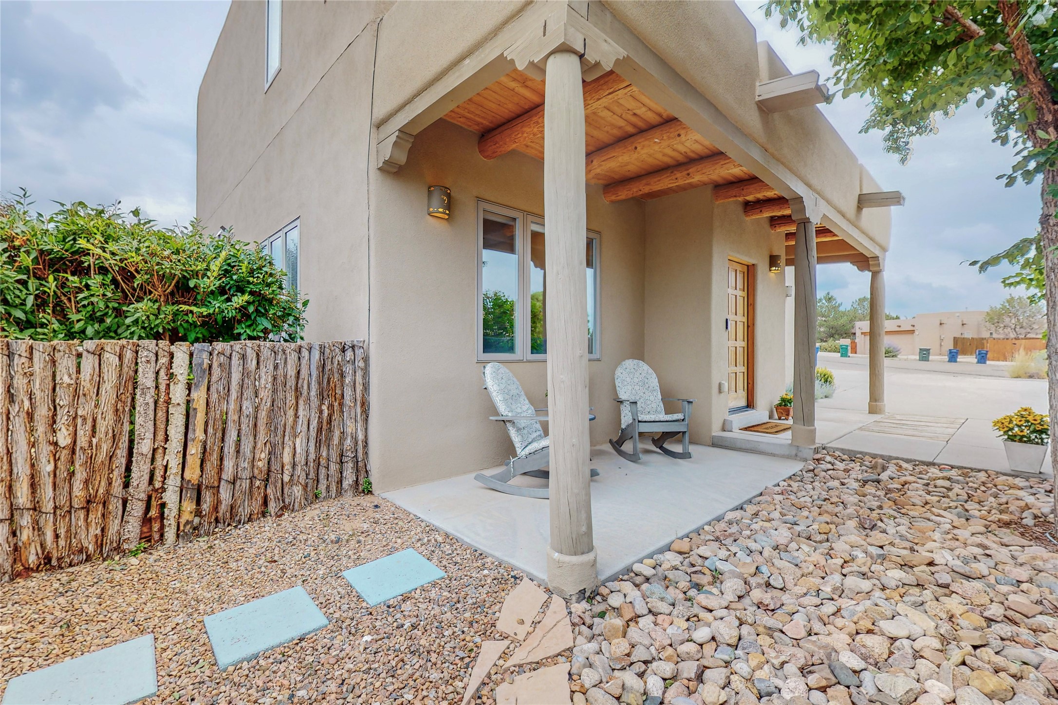 This 3 bed, 3 bath home is located on a quiet cul-de-sac in the desirable Pueblos Del Sol neighborhood. Recent updates include new flooring, new kitchen cabinets, new countertops and all new appliances. All the baths in the home have been updated. This owner has recently had new ductless (mini-split) HVAC units that both cool and heat added. Enjoy views of the Sangre de Cristo Mountains from the primary bedroom and western views from the upstairs guest bedroom. One fireplace that serves dining and living areas. Primary shower is a walk-in. There is one guest bedroom and full bath on the ground level.
