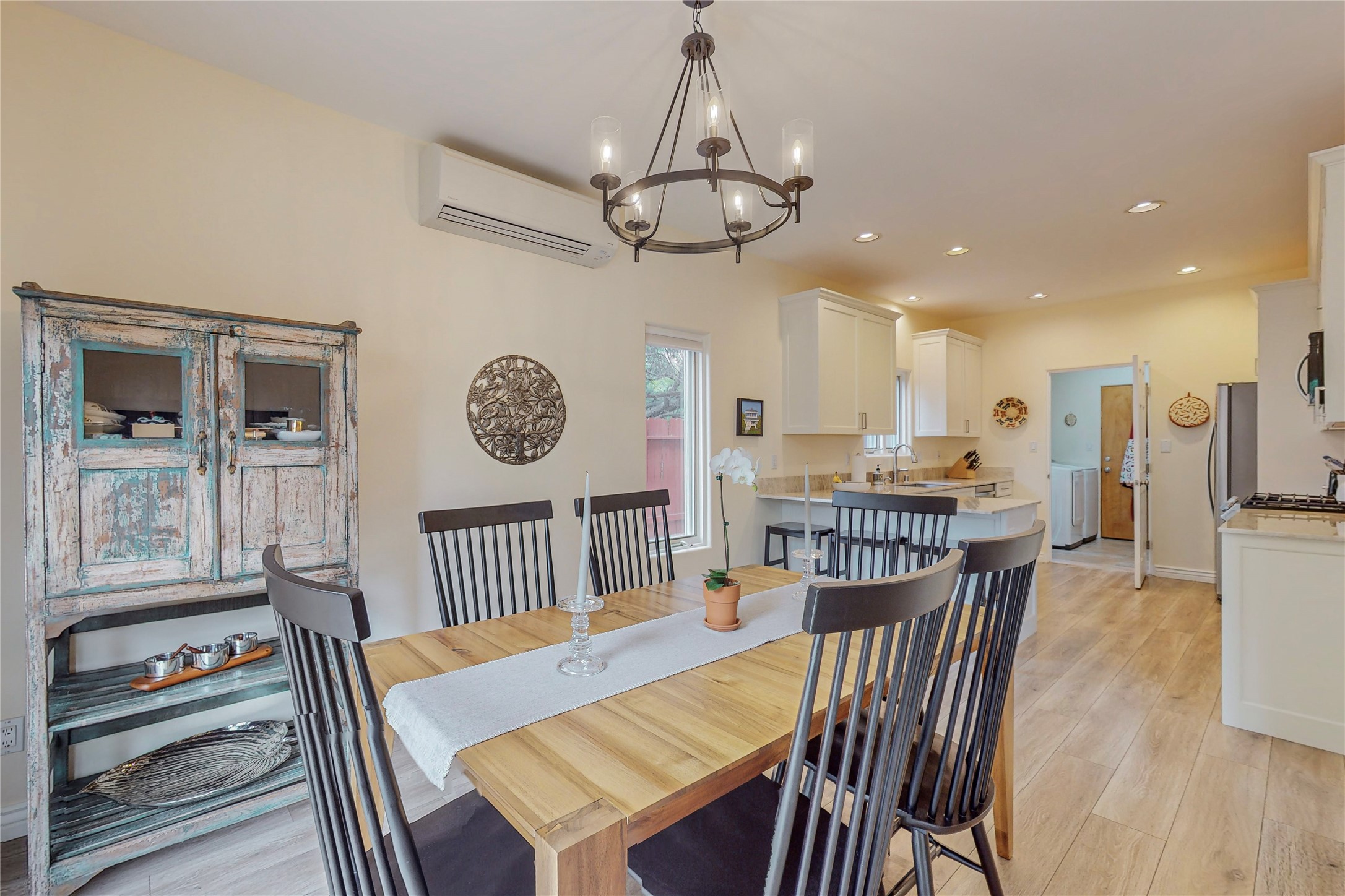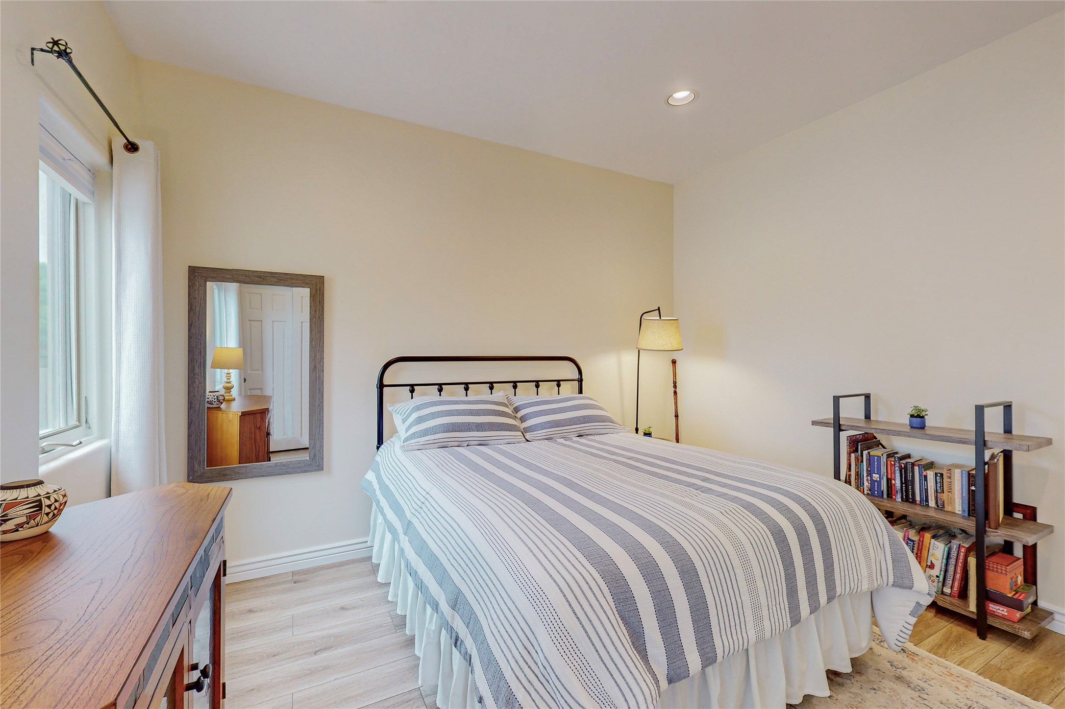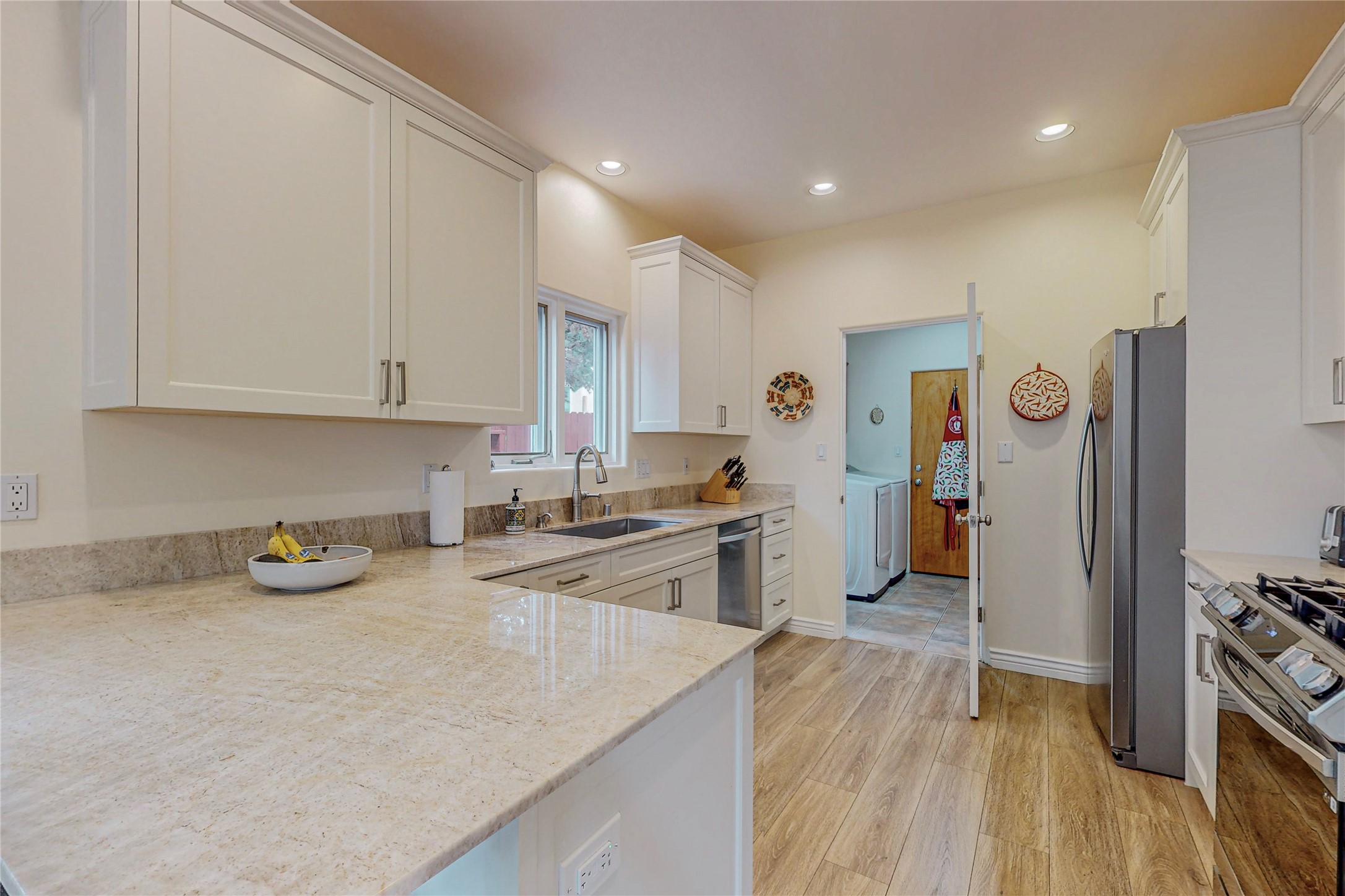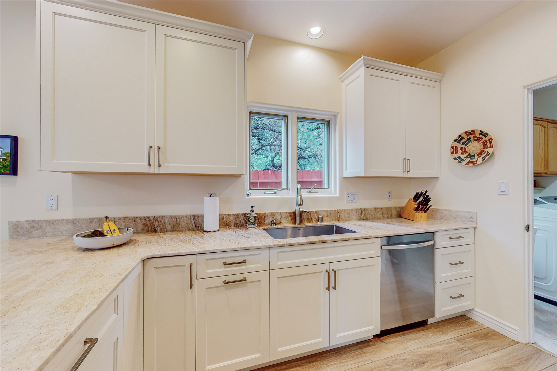 This 3 bed, 3 bath home is located on a quiet cul-de-sac in the desirable Pueblos Del Sol neighborhood. Recent updates include new flooring, new kitchen cabinets, new countertops and all new appliances. All the baths in the home have been updated. This owner has recently had new ductless (mini-split) HVAC units that both cool and heat added. Enjoy views of the Sangre de Cristo Mountains from the primary bedroom and western views from the upstairs guest bedroom. One fireplace that serves dining and living areas. Primary shower is a walk-in. There is one guest bedroom and full bath on the ground level.