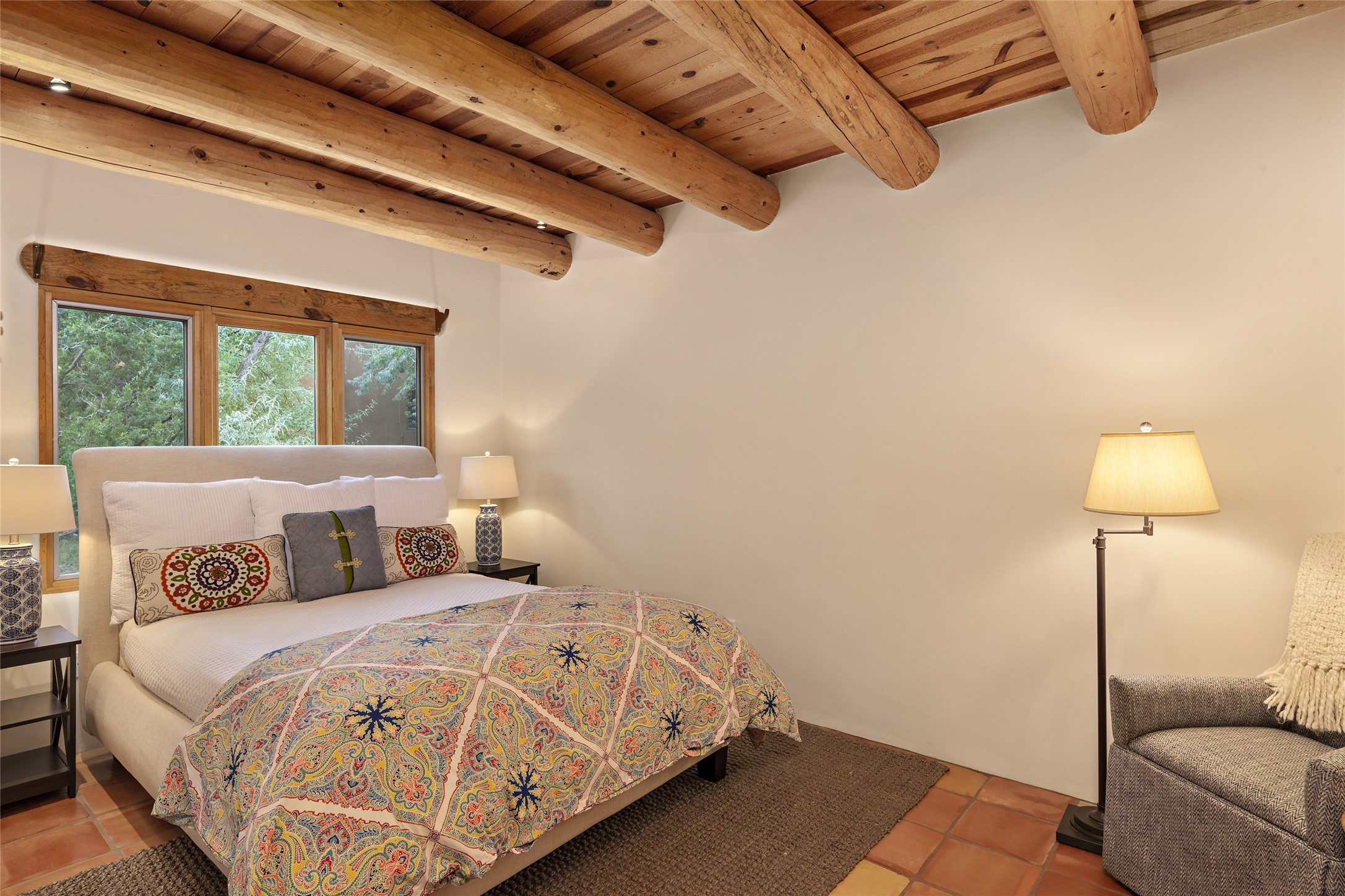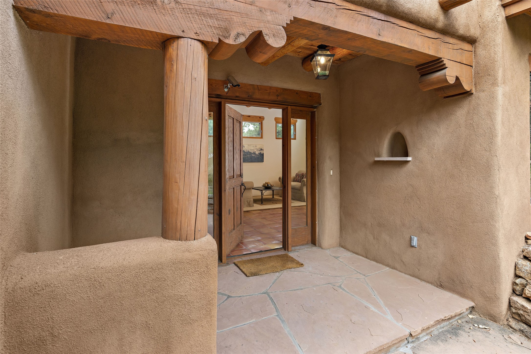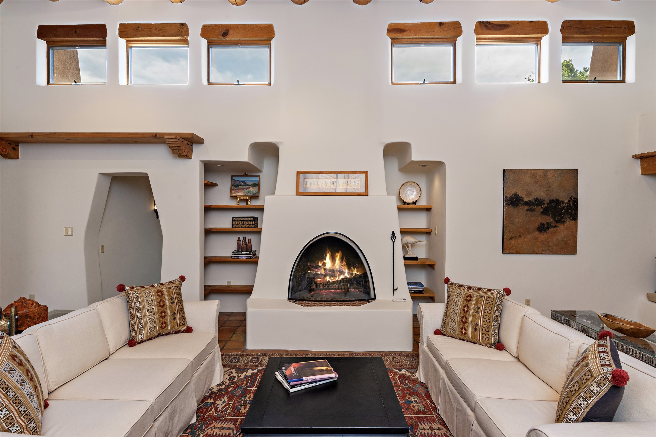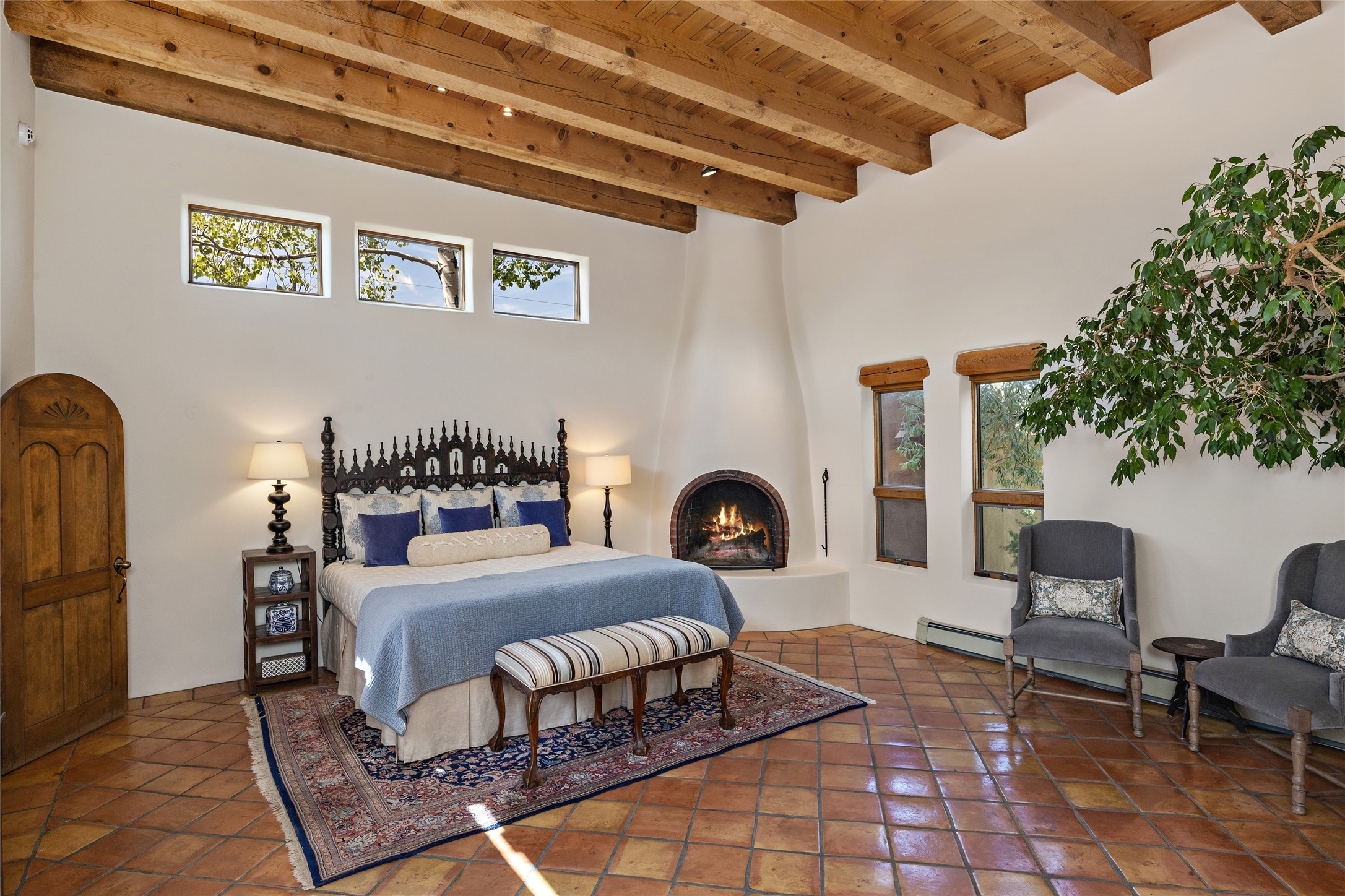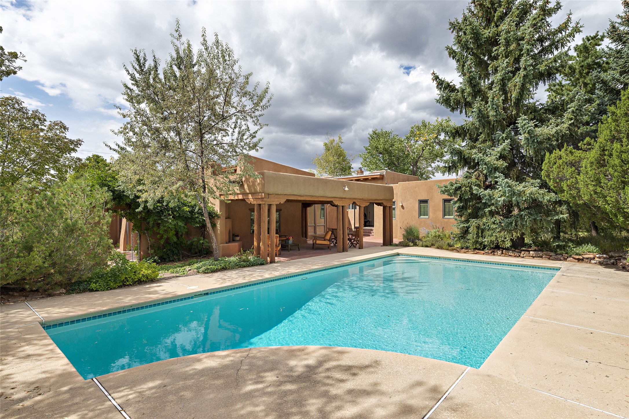 Embraced by lush, coyote-fenced grounds, this exquisite classic pueblo residence with casita and FOUR-CAR garaging, is an exceptional sanctuary. Abundant architectural details include vigas, beams, lintels and corbels with bullet carving & hand-painted accents, and rows of clerestory windows. The superb open concept design features a dramatic living room with soaring ceiling, track lighting, a fireplace flanked by deep, lighted alcoves with shelving, and French doors to the fabulous entertaining portal, pool area and mature trees & plantings. A generous dining area accesses the custom-designed chef's kitchen with breakfast & sitting/TV areas. An impressive private owner's suite bedroom boasts a high beamed ceiling, track lighting and kiva fireplace. The beautifully redesigned owner's bath and a private study have diamond plaster and in-floor radiant heat. A separate two-bedroom guest wing features a spacious high-walled courtyard with a gate to the pool & rear grounds. The delightful guest casita includes a high-ceilinged living room with fireplace, dining/office area, a bedroom and full bath. The 5 Daikon ductless mini-splits and a mini-split in the casita ensure year-round comfort. Situated just up the street from the storied Sol y Sombra estate, (owned by Georgia O'Keeffe; more recently by the late Paul Allen, co-founder of Microsoft), and within the Wood Gormley school district.