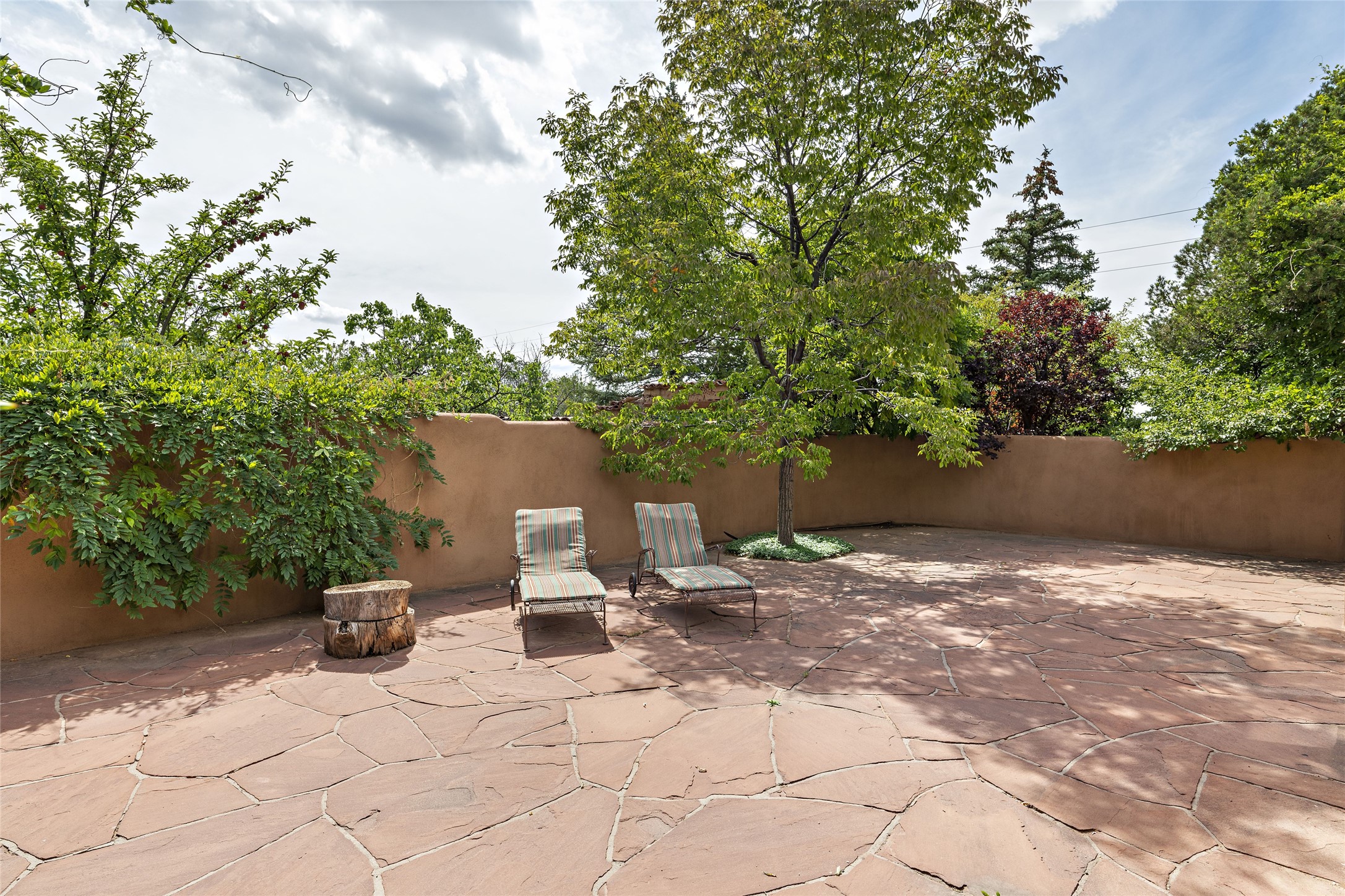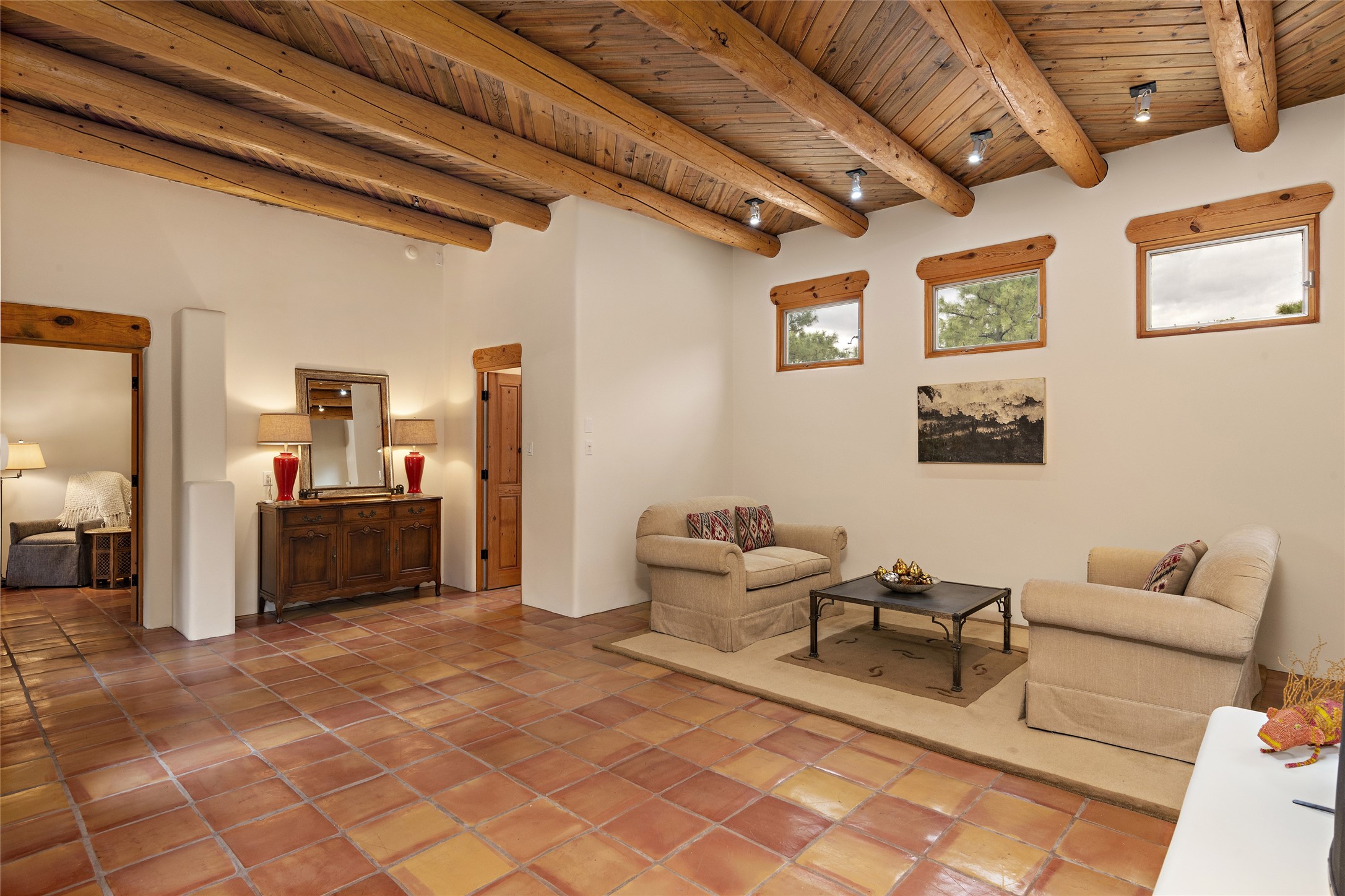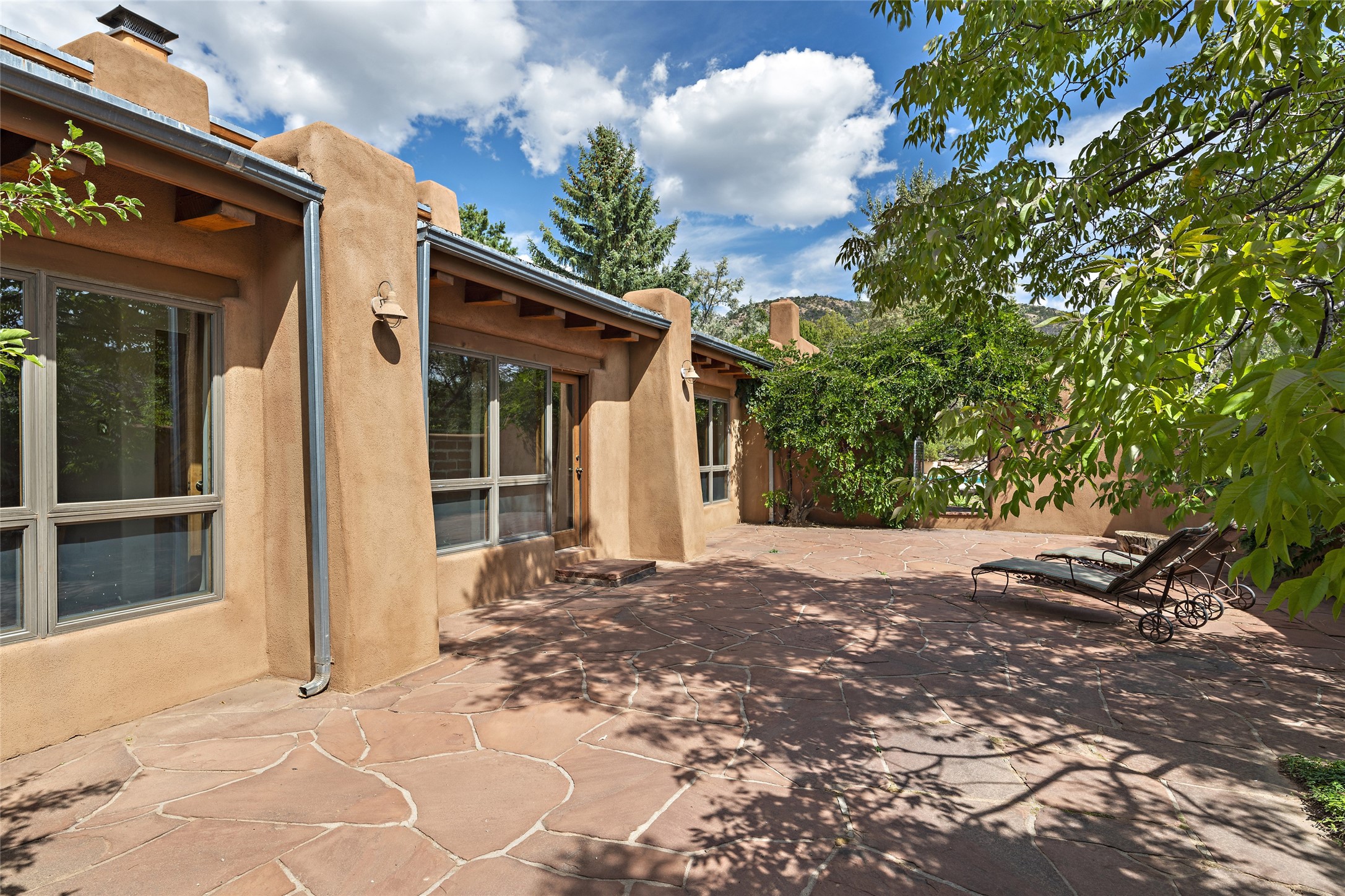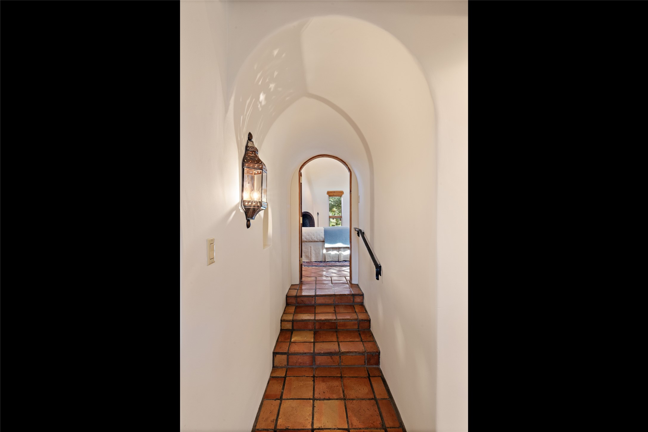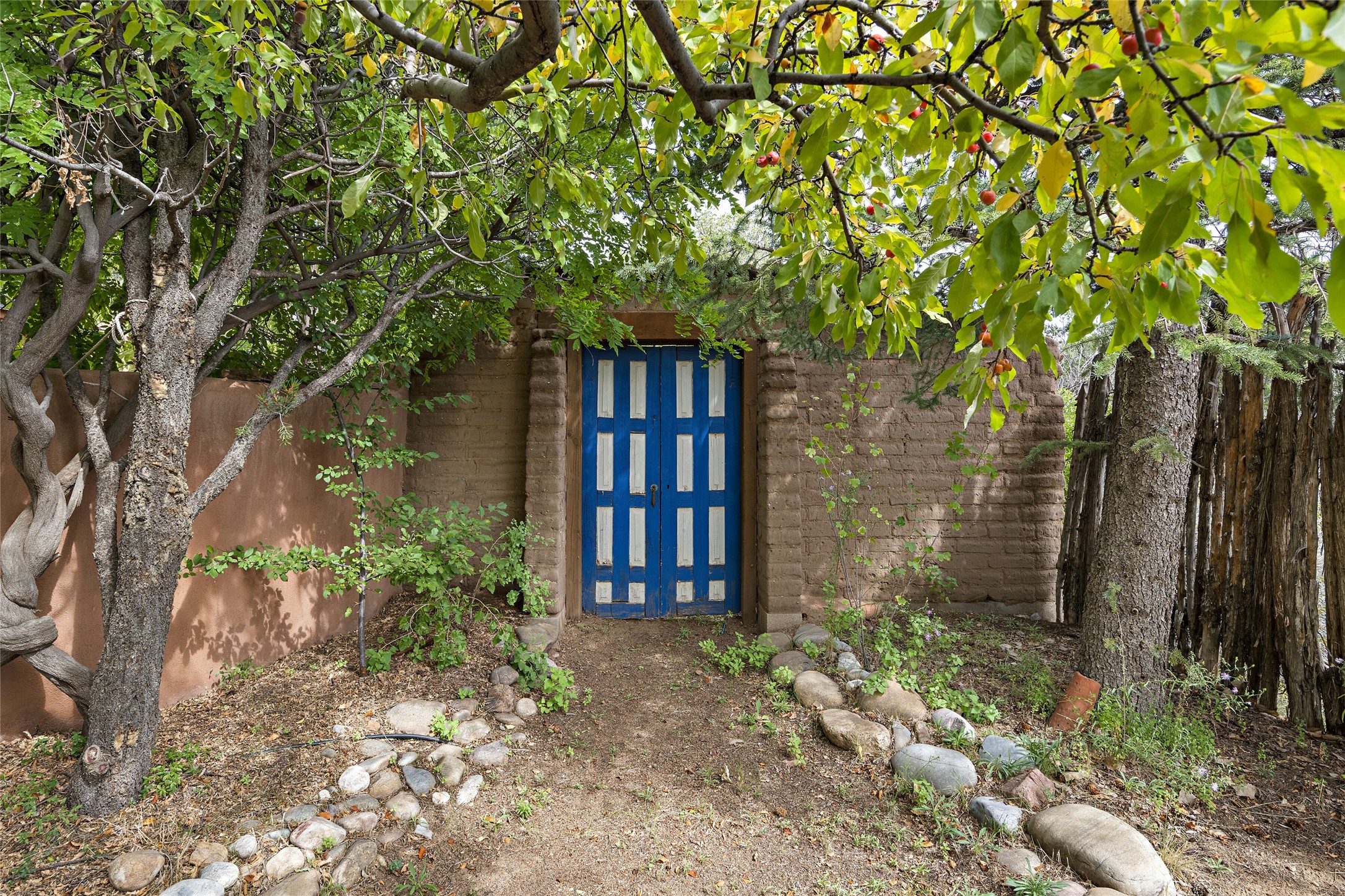 Embraced by lush, coyote-fenced grounds, this exquisite classic pueblo residence with casita and FOUR-CAR garaging, is an exceptional sanctuary. Abundant architectural details include vigas, beams, lintels and corbels with bullet carving & hand-painted accents, and rows of clerestory windows. The superb open concept design features a dramatic living room with soaring ceiling, track lighting, a fireplace flanked by deep, lighted alcoves with shelving, and French doors to the fabulous entertaining portal, pool area and mature trees & plantings. A generous dining area accesses the custom-designed chef's kitchen with breakfast & sitting/TV areas. An impressive private owner's suite bedroom boasts a high beamed ceiling, track lighting and kiva fireplace. The beautifully redesigned owner's bath and a private study have diamond plaster and in-floor radiant heat. A separate two-bedroom guest wing features a spacious high-walled courtyard with a gate to the pool & rear grounds. The delightful guest casita includes a high-ceilinged living room with fireplace, dining/office area, a bedroom and full bath. The 5 Daikon ductless mini-splits and a mini-split in the casita ensure year-round comfort. Situated just up the street from the storied Sol y Sombra estate, (owned by Georgia O'Keeffe; more recently by the late Paul Allen, co-founder of Microsoft), and within the Wood Gormley school district.