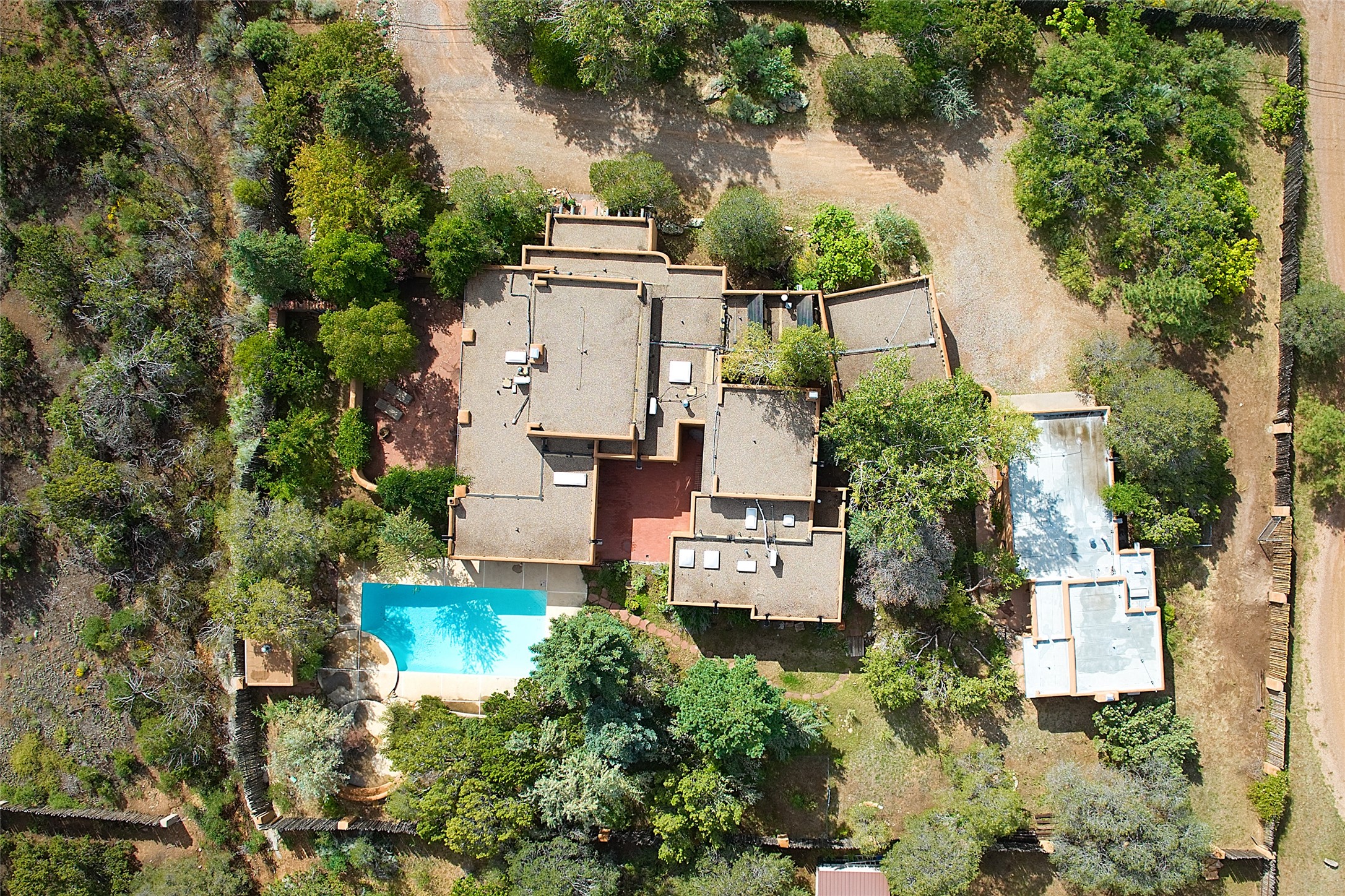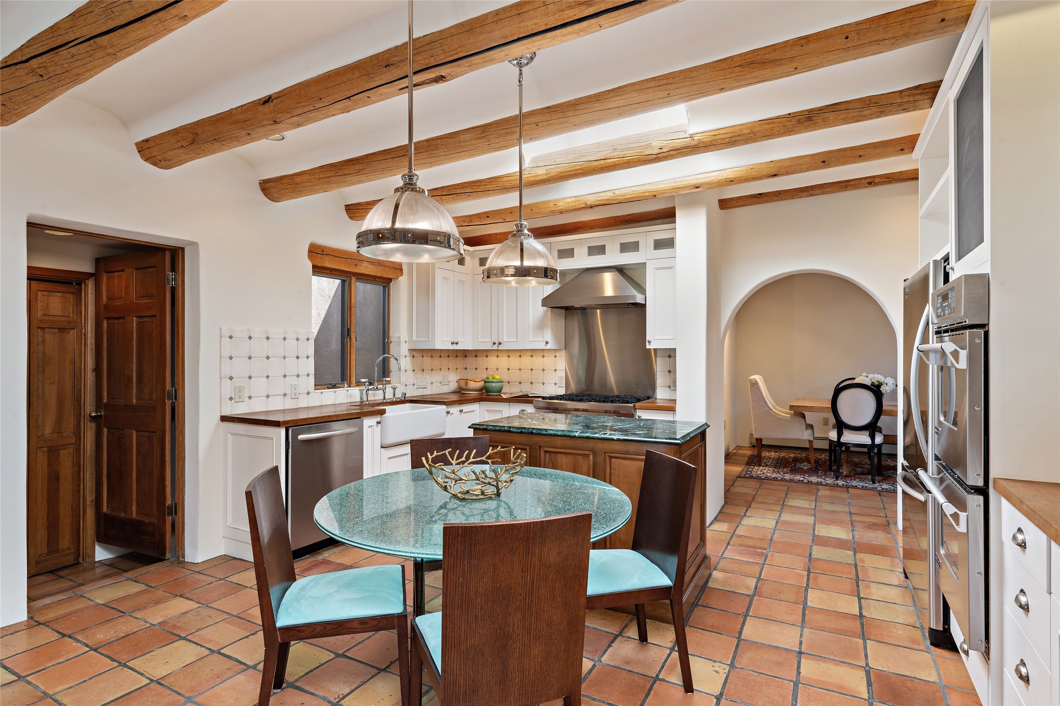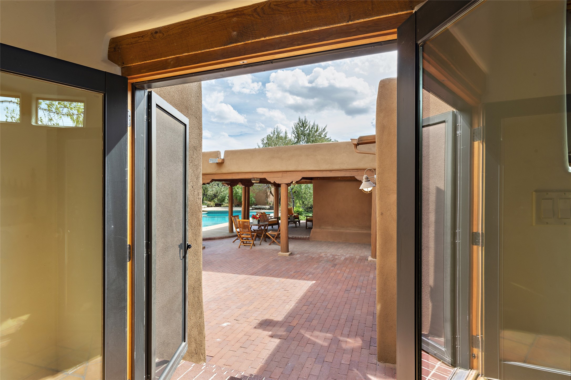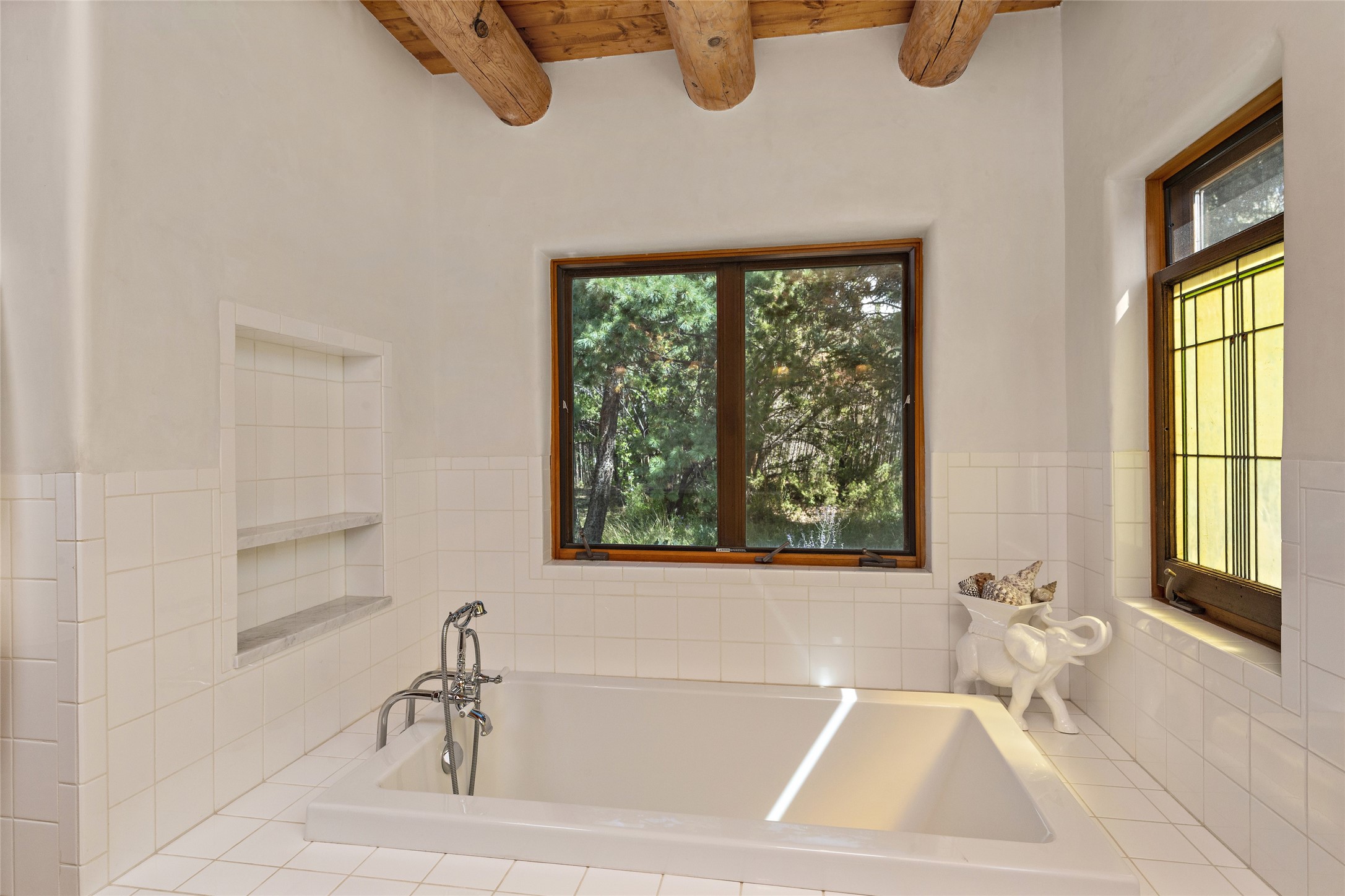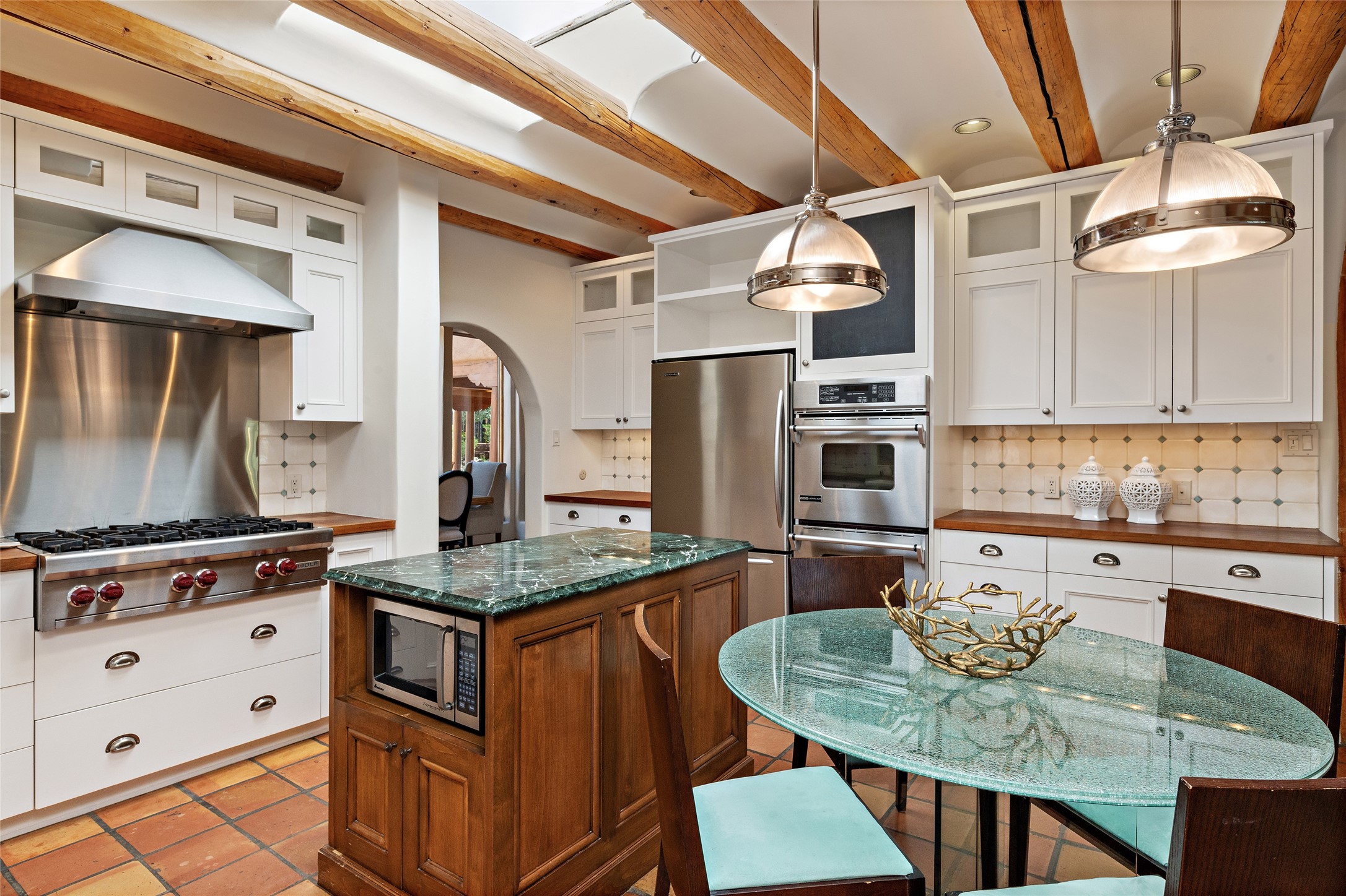Embraced by lush, coyote-fenced grounds, this exquisite classic pueblo residence with casita and FOUR-CAR garaging, is an exceptional sanctuary. Abundant architectural details include vigas, beams, lintels and corbels with bullet carving & hand-painted accents, and rows of clerestory windows. The superb open concept design features a dramatic living room with soaring ceiling, track lighting, a fireplace flanked by deep, lighted alcoves with shelving, and French doors to the fabulous entertaining portal, pool area and mature trees & plantings. A generous dining area accesses the custom-designed chef's kitchen with breakfast & sitting/TV areas. An impressive private owner's suite bedroom boasts a high beamed ceiling, track lighting and kiva fireplace. The beautifully redesigned owner's bath and a private study have diamond plaster and in-floor radiant heat. A separate two-bedroom guest wing features a spacious high-walled courtyard with a gate to the pool & rear grounds. The delightful guest casita includes a high-ceilinged living room with fireplace, dining/office area, a bedroom and full bath. The 5 Daikon ductless mini-splits and a mini-split in the casita ensure year-round comfort. Situated just up the street from the storied Sol y Sombra estate, (owned by Georgia O'Keeffe; more recently by the late Paul Allen, co-founder of Microsoft), and within the Wood Gormley school district.
