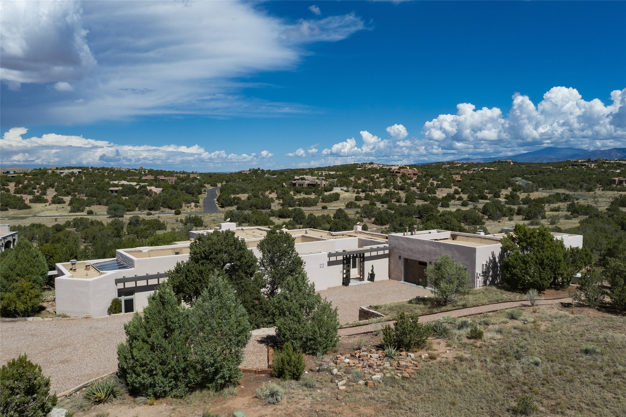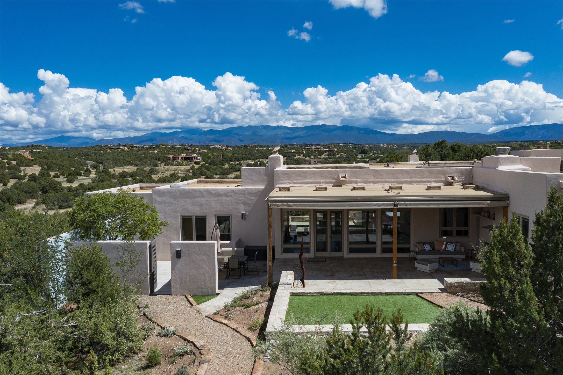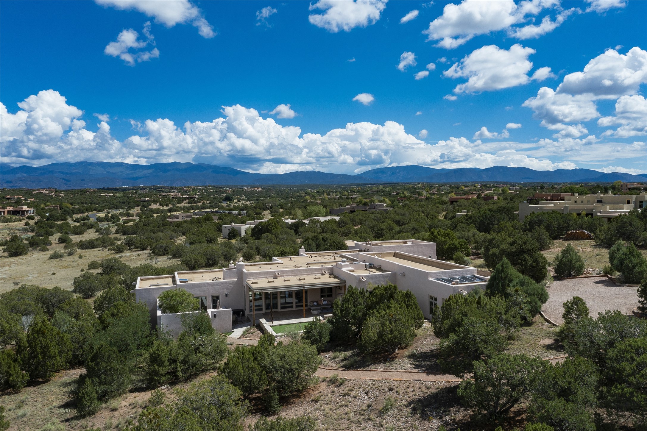 Experience the ultimate Santa Fe lifestyle with this Tour de Force contemporary house and guest house with unparalleled Sangre De Cristo Mountain views and a fabulous heated indoor lap pool. Located within close proximity to the Plaza and The Club at Las Campanas, and sited on a private, elevated 2+ acre cul de sac view lot, this sophisticated retreat, designed by renowned architect, Craig Hoopes, masterfully incorporates seamless indoor and outdoor living at its finest and perfectly blends contemporary design with Santa Fe warmth. The 3,127 square foot main house excites with a spacious open-concept great room complete with surround view windows which frame the Sangre De Cristo Mountains, fireplace, and access to dual outdoor portals and zen gardens. The industrial-style island kitchen is ideal for entertaining with stainless appliances, a casual dining area with a fireplace, and a large walk-in pantry, all of which enjoy expansive views and opens directly to the formal dining room and all main living areas. The spacious owner's suite delights with mountain views, fireplace, sitting area, a spa-like bath with its own private outdoor lounging area, dual walk-in closets, and a generous attached bonus room ideal as an office, media room, or art studio. Separate from the main living area is a private ensuite bedroom, a secondary bedroom or office, and access to the 1,183 square foot pool house complete with a resort-like indoor heated lap pool, sauna, shower, and exercise areas. Guests enjoy complete independence with the well-appointed detached 876 square foot one-bedroom guest house with a full kitchen, living room, fireplace, full bath, washer/dryer, and stunning views. Exceptional features include endless art walls, soft natural light, a flexible floor plan, excellent storage throughout, a backup generator, an updated roof, 2 newly replaced boilers, and updated interior plaster. This home represents a rare opportunity and truly, the ultimate Santa Fe lifestyle.