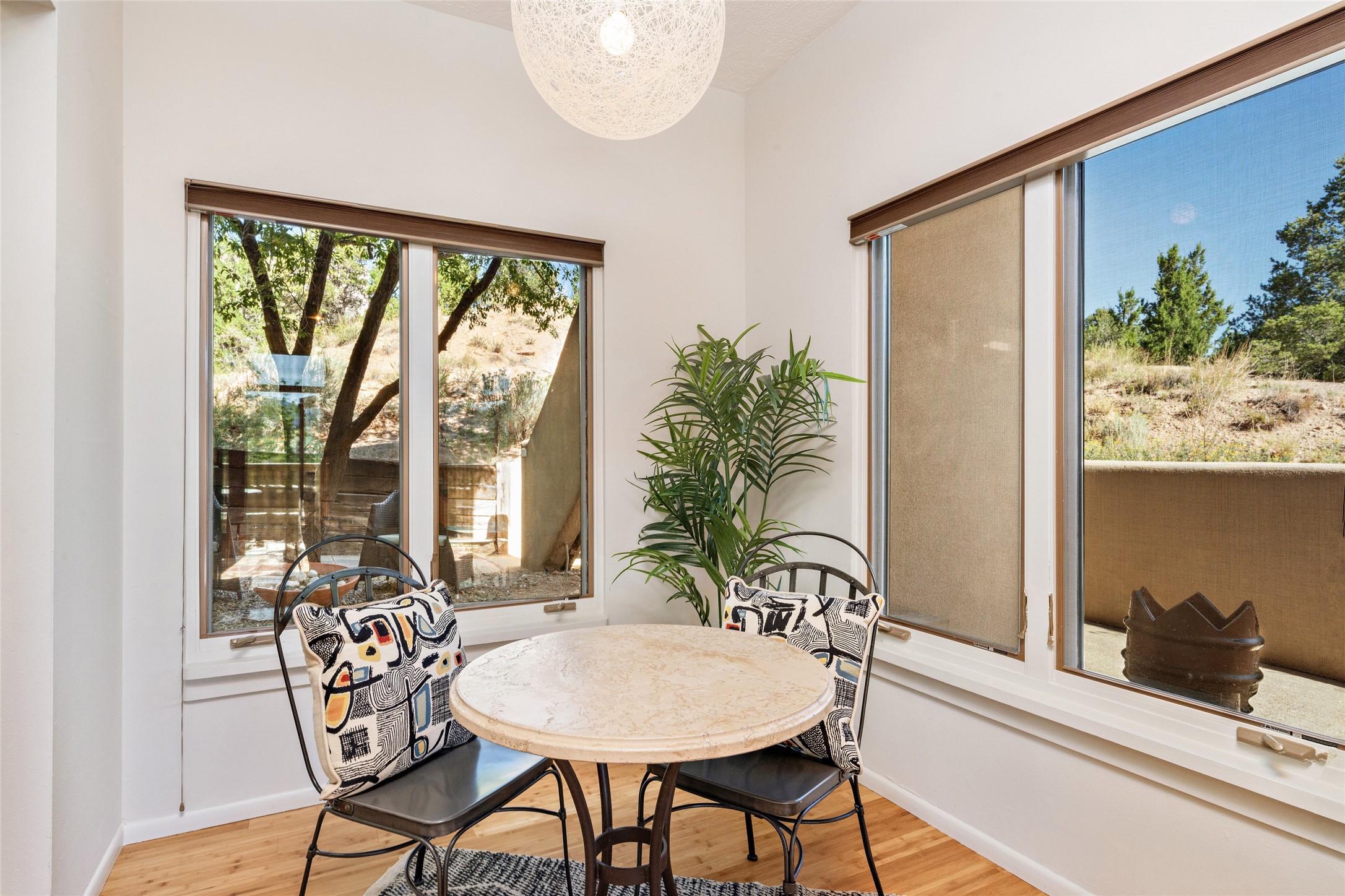 What is not to like about this crisp, compact, newly refurbished condominium in a superb location just minutes from the heart of Santa Fe? At the end unit of the Vieto del Norte complex, the sweet home enjoys the advantage of no neighbors on the north side; hence, more windows for better light and extra views. A bright interior flows seamlessly into the large balcony off both the living room and bedroom, nearly doubling the enjoyable space for entertaining and peaceful relaxation. Wood floors, plank and square cut beam ceilings, and wood frame glass paned doors offer a handsome counterpoint to the lighter touch given to the rest of the dcor. The kitchen and dining spaces are cozy yet fully functional with renovated shelves and countertops as well as new appliances. The bathroom has been completely renovated and the space maximized by installing a large reach-in closet. A stacked washer/dryer lives in the kitchen pantry/storage closet and a downstairs garage provides room for one vehicle and additional storage. A perfect home for quick and easy access to all of Santa Fe's special summer fairs and festivals and an equally easy spot to languish in after long winter days spent at the ski basin. Whether looking for an easy seasonal foothold in Santa Fe, a profitable rental property, or a charming carefree home in a prime part of Santa Fe, this special unit should not be missed.