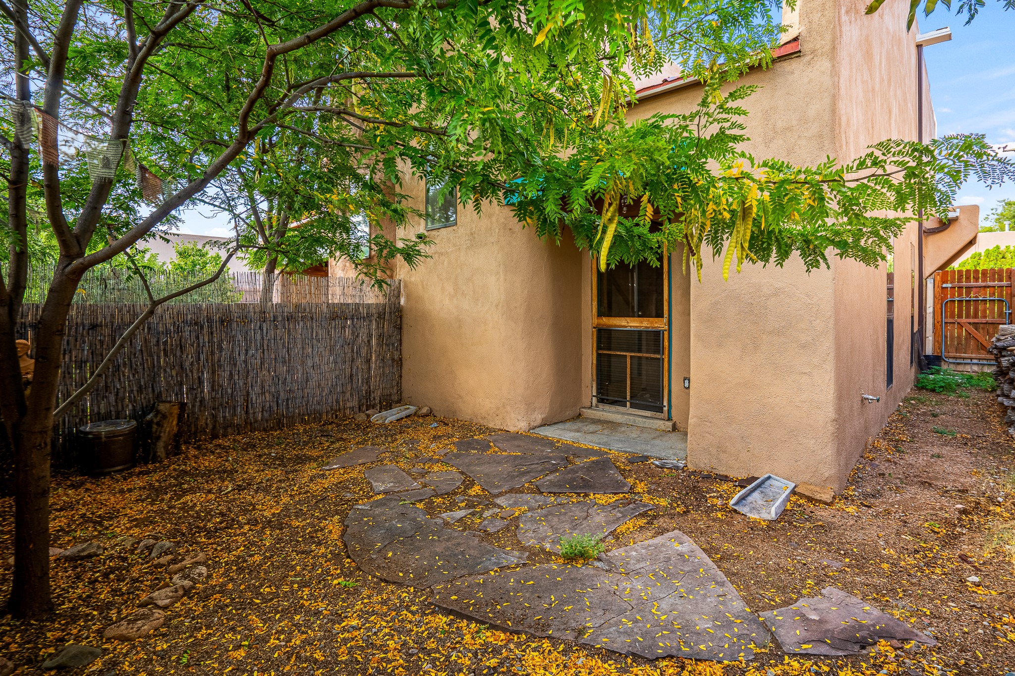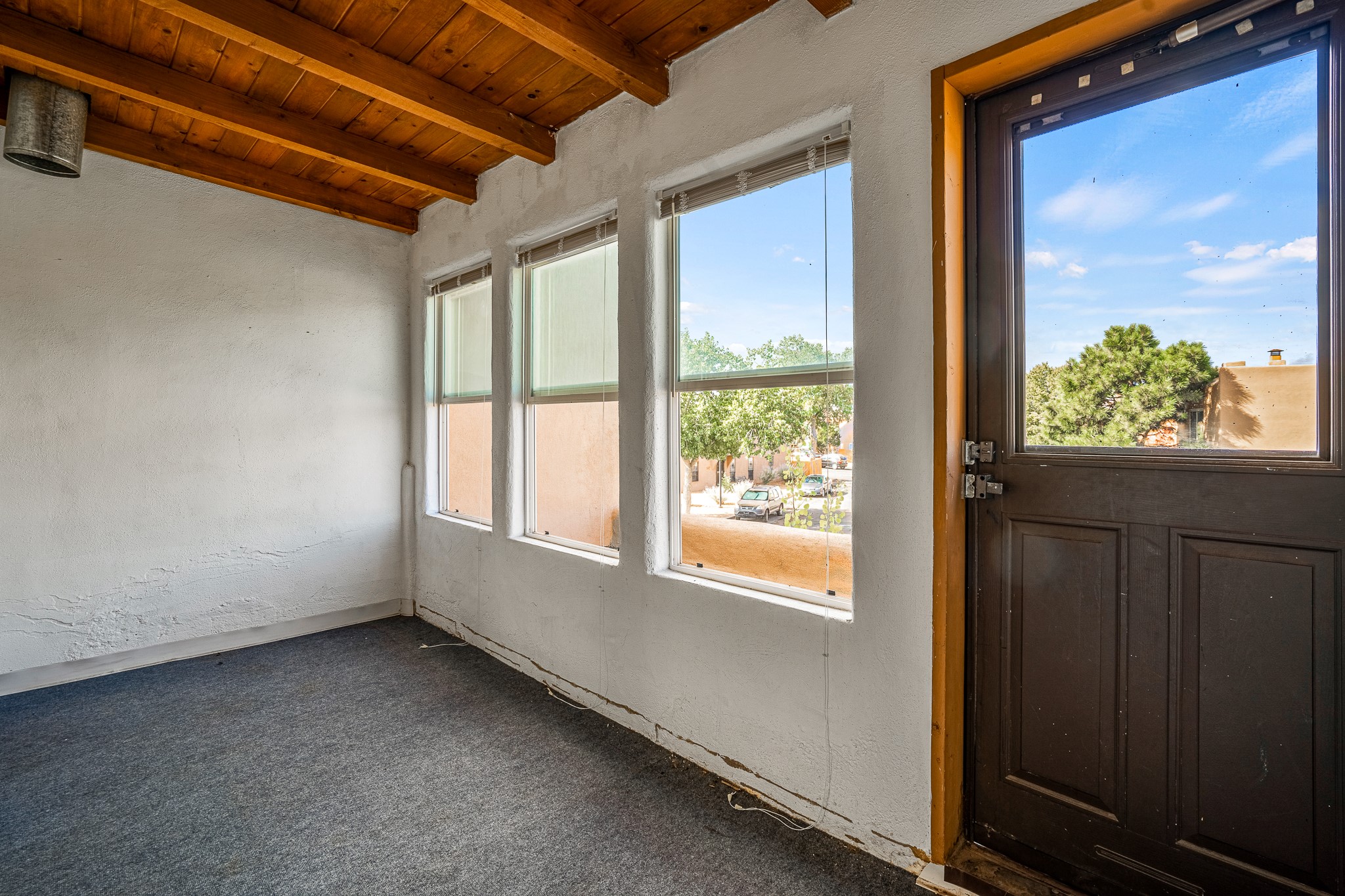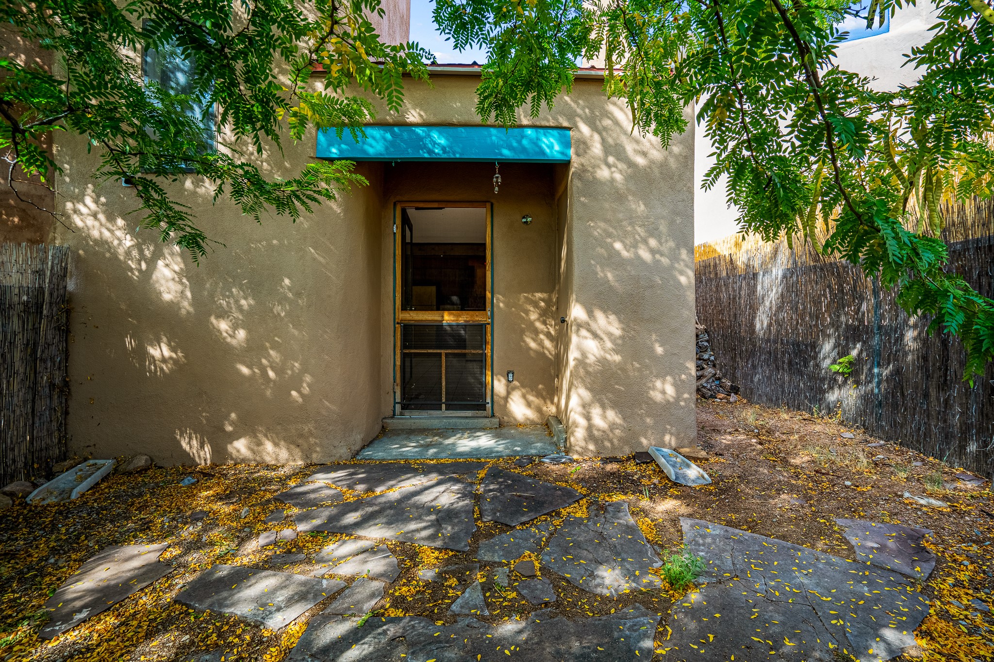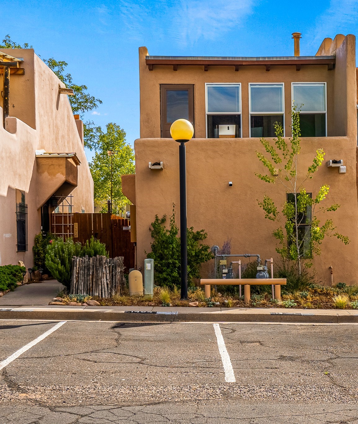 This home is centrally located with convenient access to everything that Santa Fe has to offer. With an abundance of natural light in the open-concept living space boasting high beamed ceilings and a beautiful wood-burning kiva fireplace. The shady backyard is fenced and private. The full bathroom and primary bedroom with lots of closet space are located on the first floor. On the second floor, there is a loft-style bedroom open to the living space below with a generously sized sunroom/bonus room. The home comes with two designated parking spaces off Avenida de Las Americas.