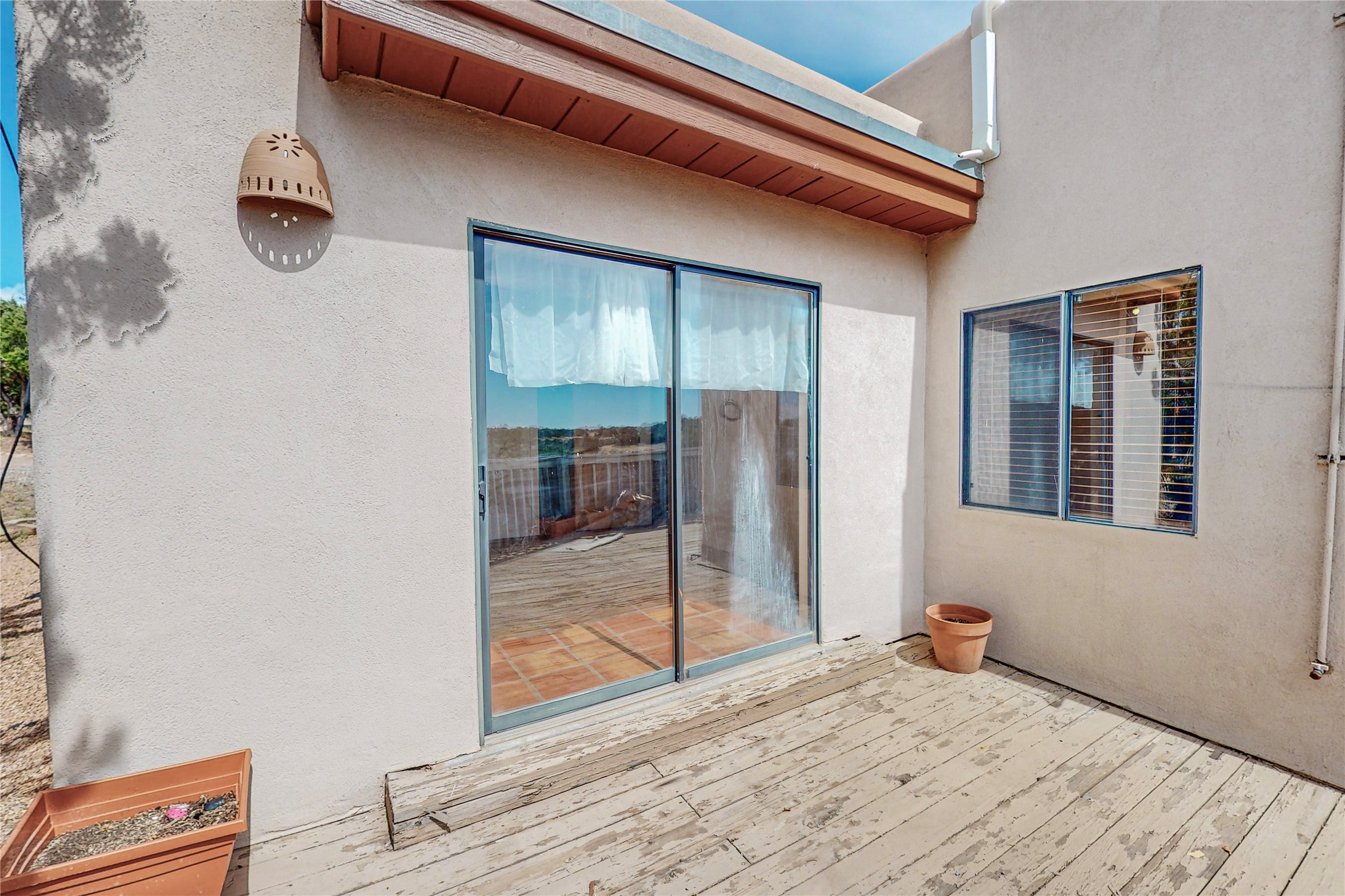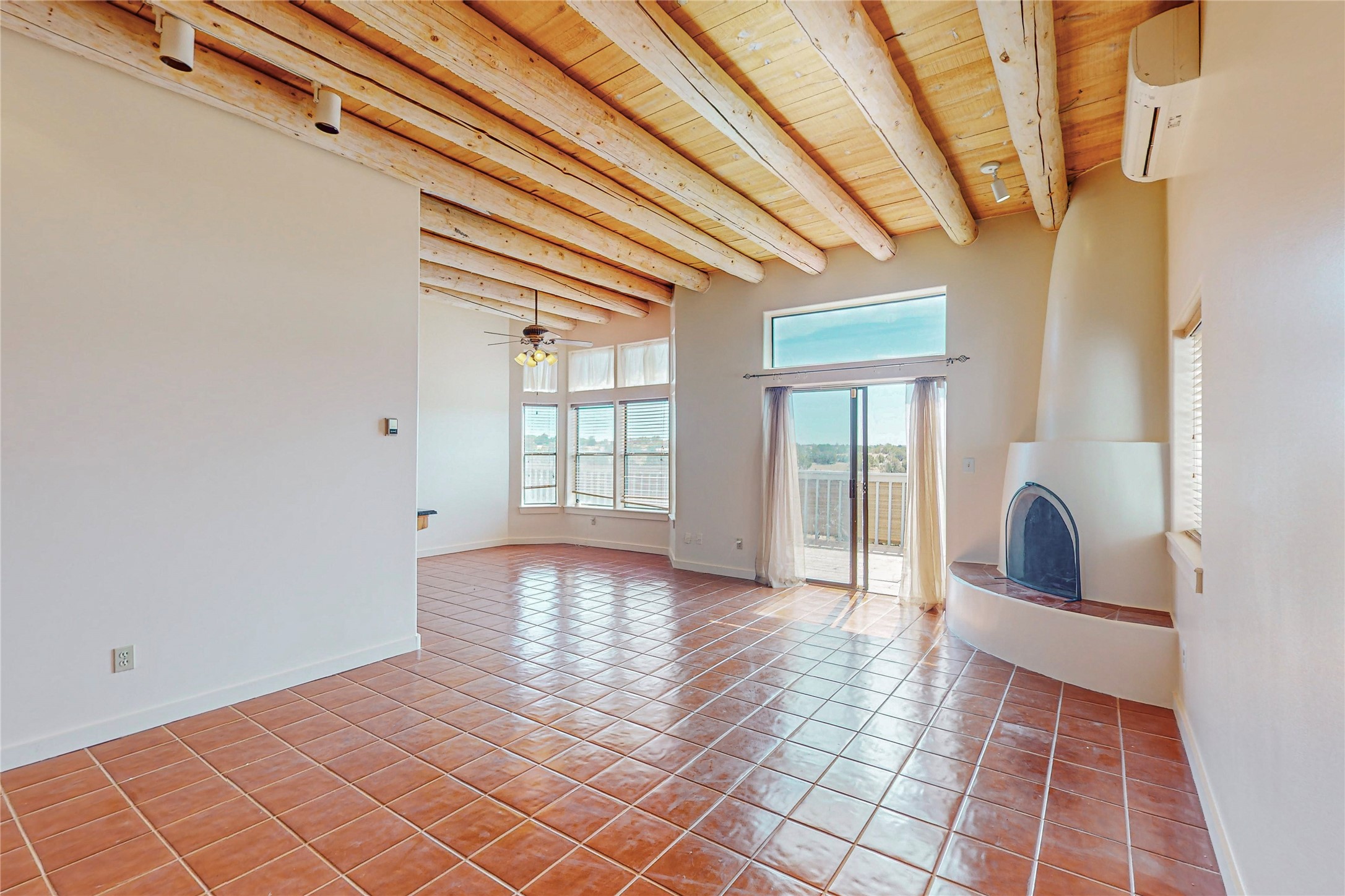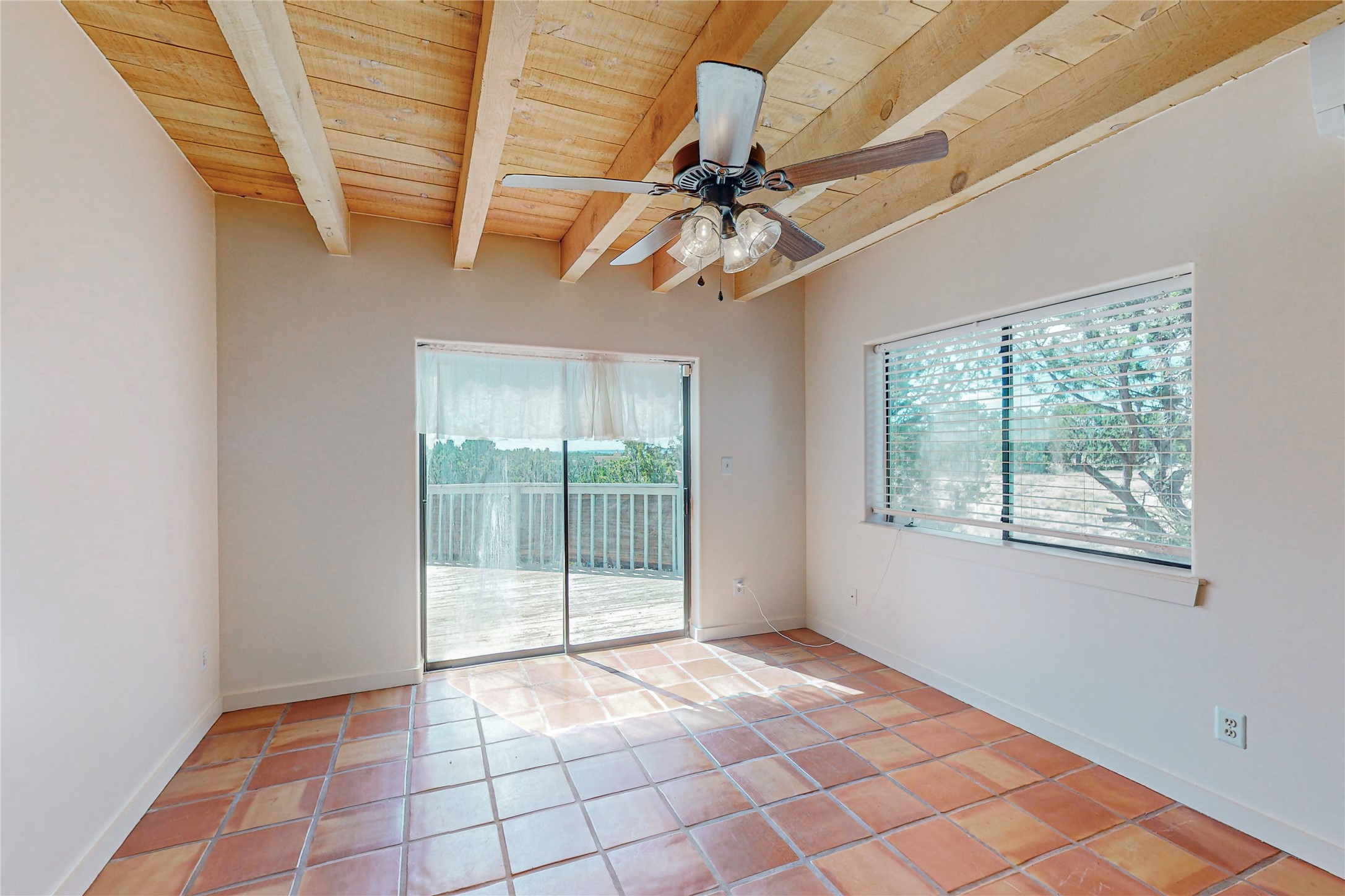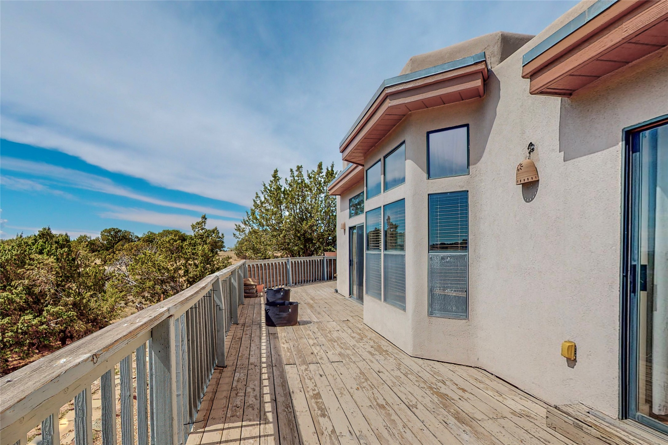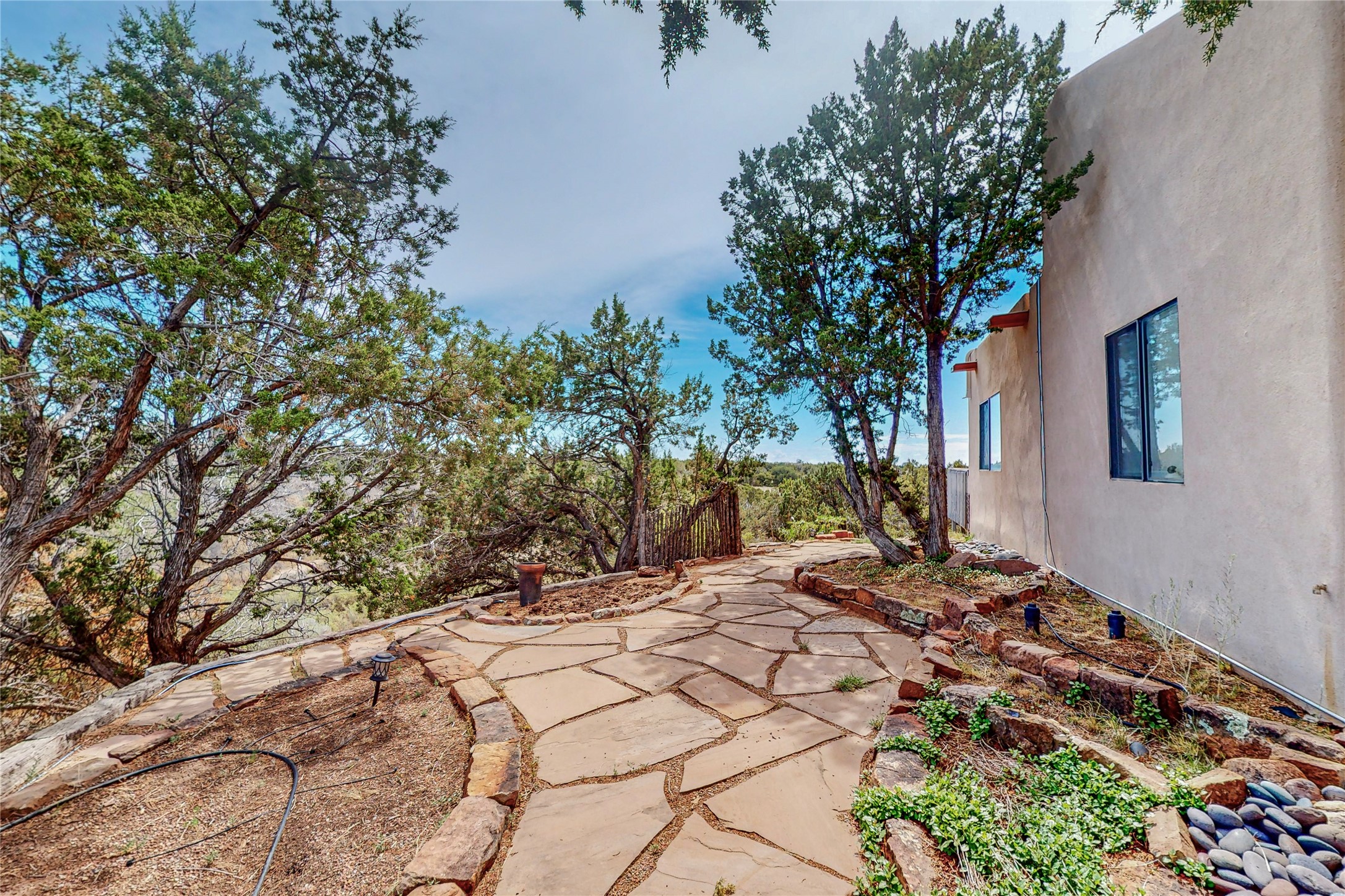 A rare exceptionally semi-private location with no thru streets and minimal ambient noise. Lot backs to a large greenbelt with direct access to social paths and the rail trail. East side of lot borders a retired historic railroad spur that runs between the Santa Fe Railyard and Lamy. The spur and subsequent train cars are occasionally used for slow-roll excursions and Hollywood movie sets (Oppenheimer). The east side of the home also features a flagstone patio with lovely views. The quaint home offers a super bright and light open flow passive solar design with high ceilings adding to spacious feel. Flexible floor plan. Great separation between owner's suite and the 2 guest bedrooms. Livingroom with corner kiva fireplace can be converted back to gas. Freshly painted throughout the interior; the canales, stucco and overhangs newly maintained. All appliances are newer, along with chef sink. New lighting in kitchen, foyer, & bathrooms.Three mini-splits were installed in 2021 for extra heating and cooling. There is a 2-car garage with circular driveway and guest parking. A large wood deck spans the length of the home. All this plus Eldorado amenities, Senior Center, Library, local shopping and only minutes into Santa Fe.