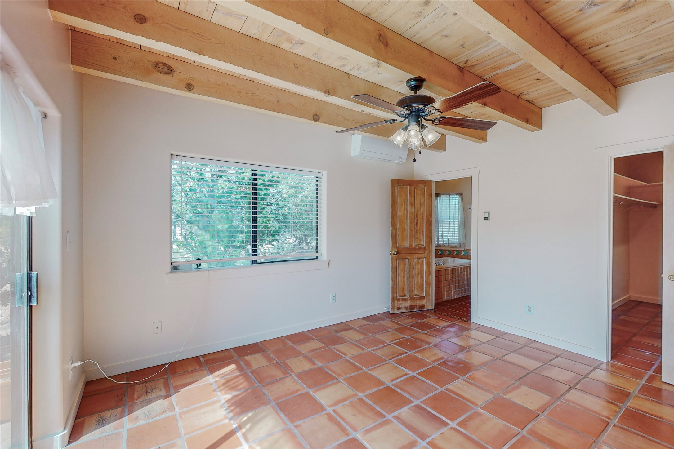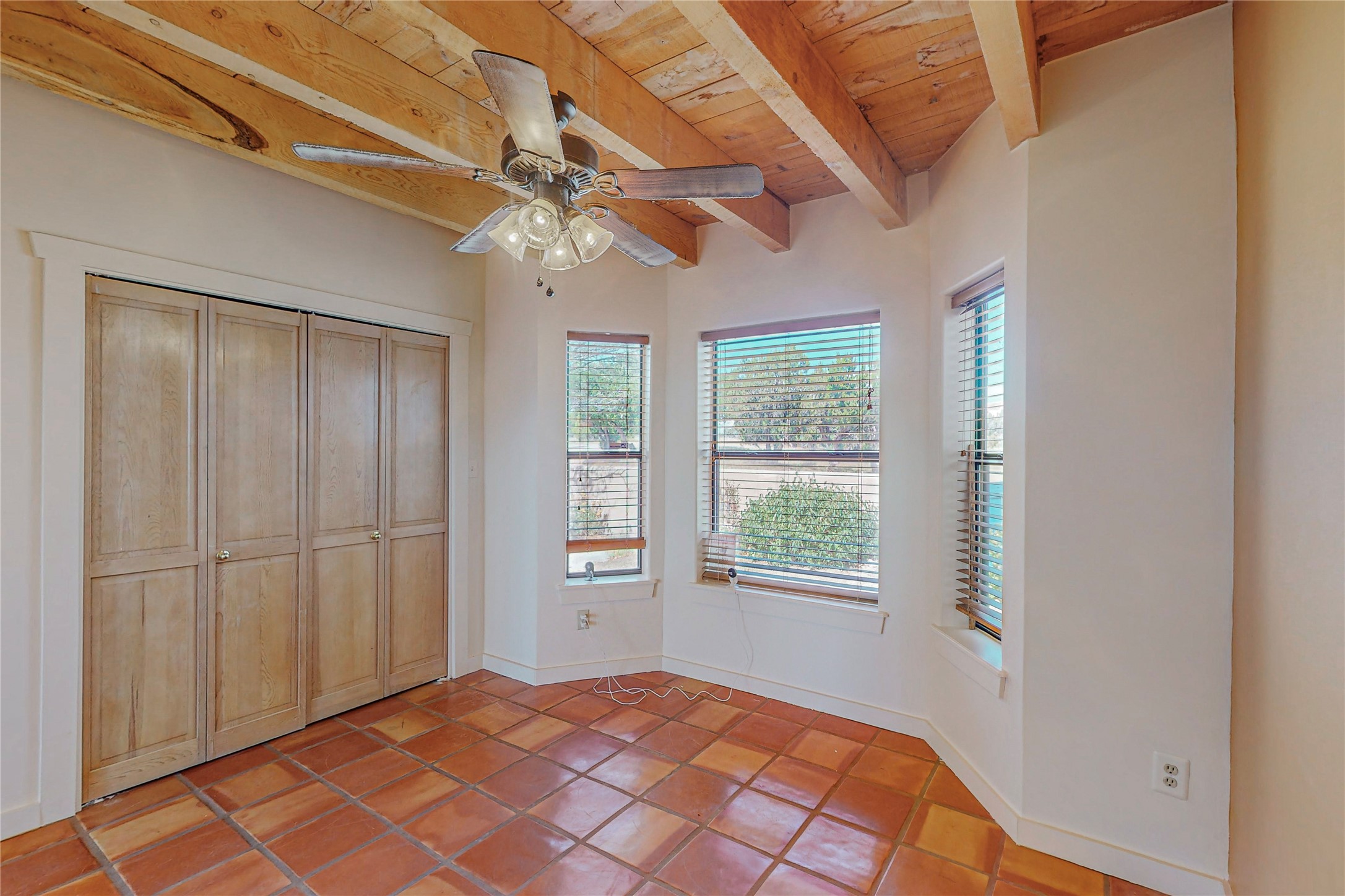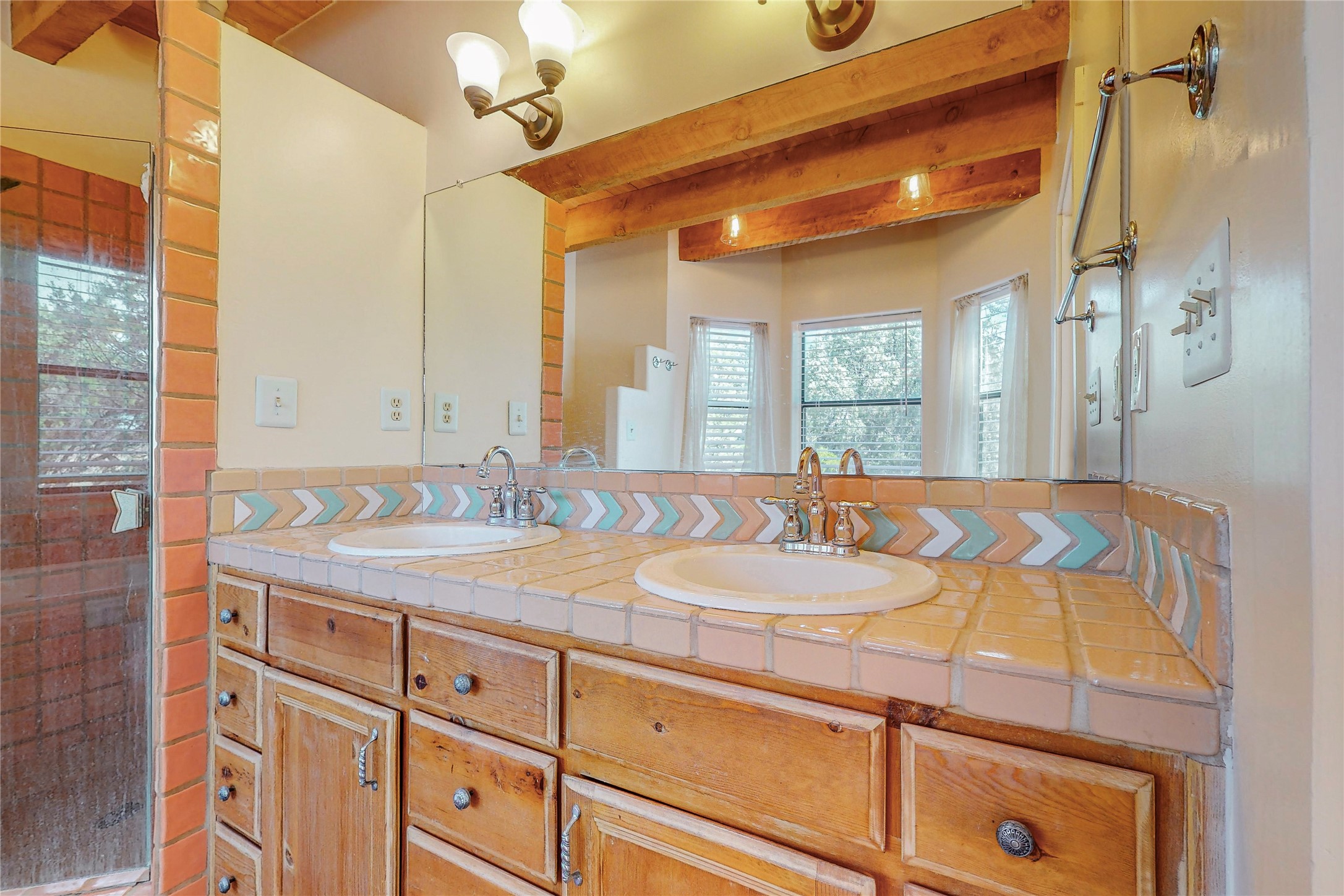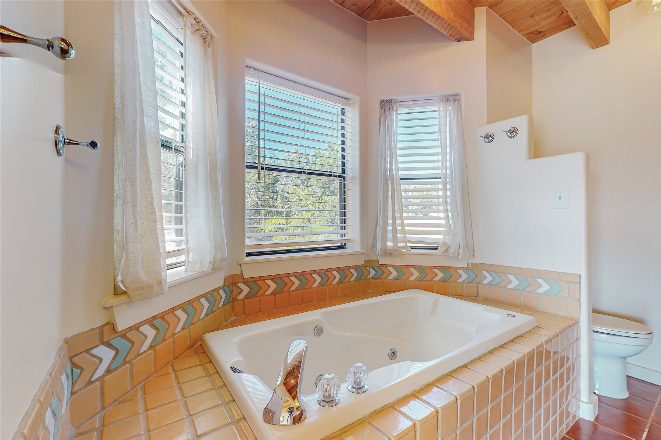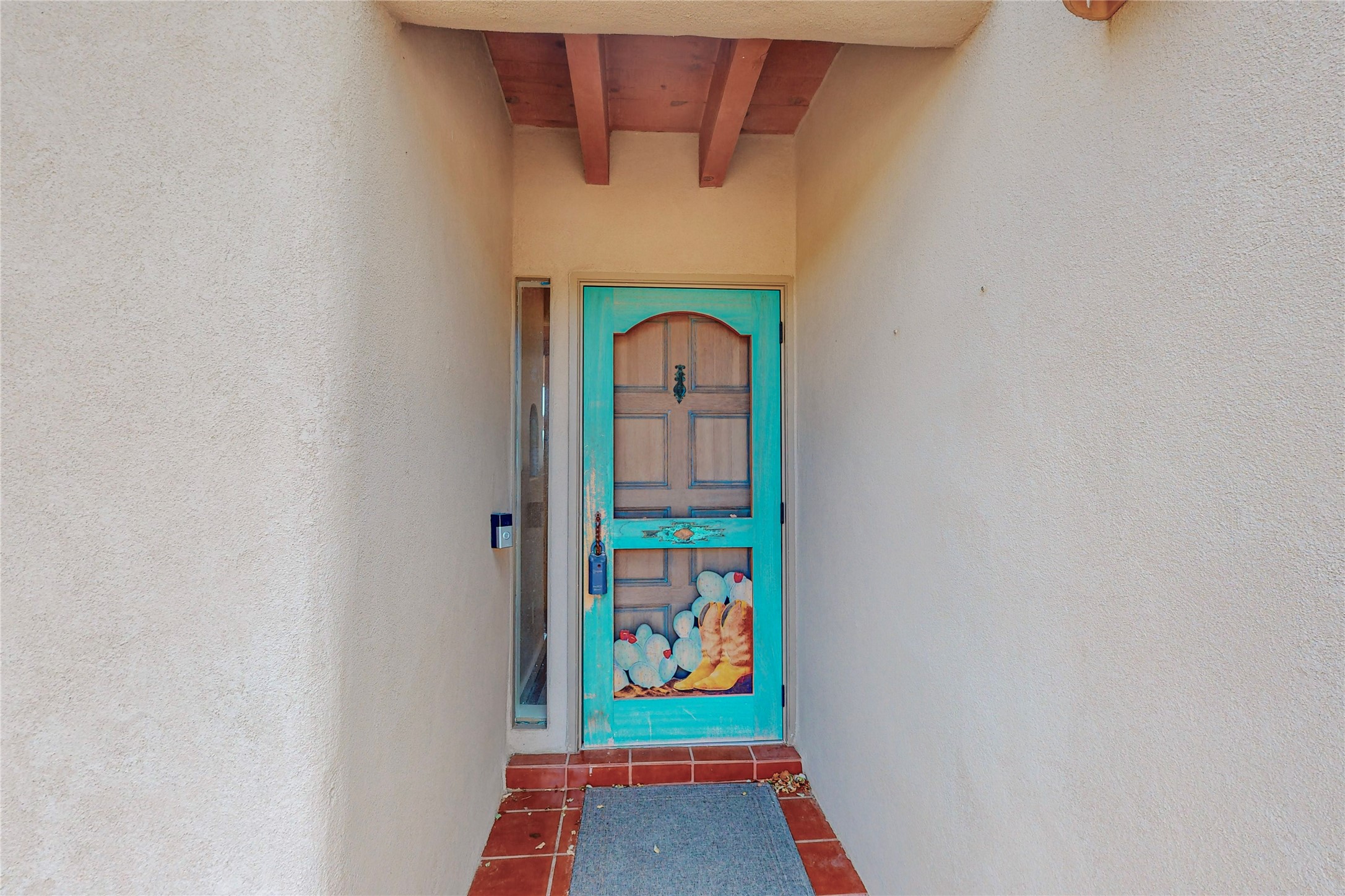 A rare exceptionally semi-private location with no thru streets and minimal ambient noise. Lot backs to a large greenbelt with direct access to social paths and the rail trail. East side of lot borders a retired historic railroad spur that runs between the Santa Fe Railyard and Lamy. The spur and subsequent train cars are occasionally used for slow-roll excursions and Hollywood movie sets (Oppenheimer). The east side of the home also features a flagstone patio with lovely views. The quaint home offers a super bright and light open flow passive solar design with high ceilings adding to spacious feel. Flexible floor plan. Great separation between owner's suite and the 2 guest bedrooms. Livingroom with corner kiva fireplace can be converted back to gas. Freshly painted throughout the interior; the canales, stucco and overhangs newly maintained. All appliances are newer, along with chef sink. New lighting in kitchen, foyer, & bathrooms.Three mini-splits were installed in 2021 for extra heating and cooling. There is a 2-car garage with circular driveway and guest parking. A large wood deck spans the length of the home. All this plus Eldorado amenities, Senior Center, Library, local shopping and only minutes into Santa Fe.