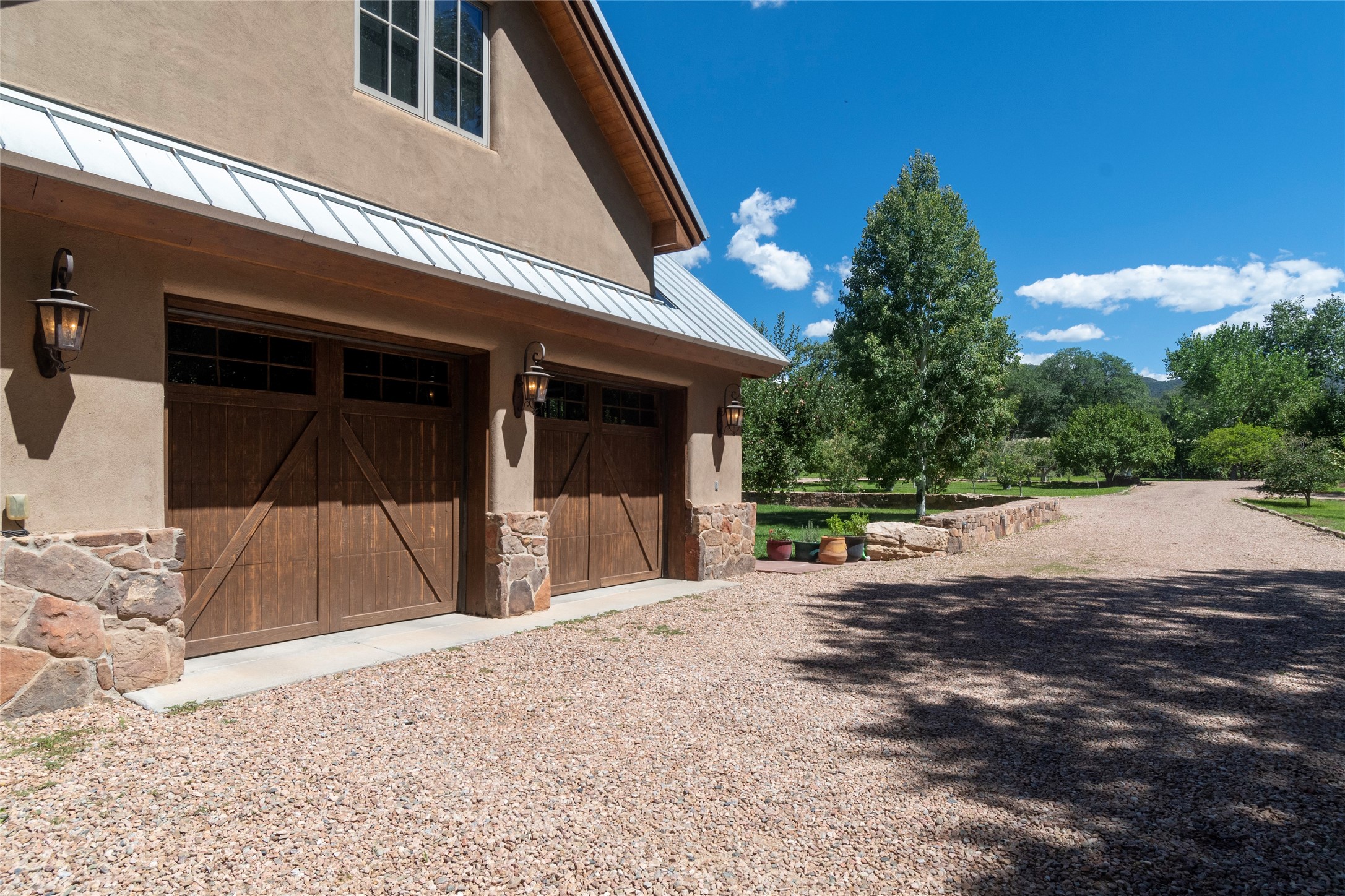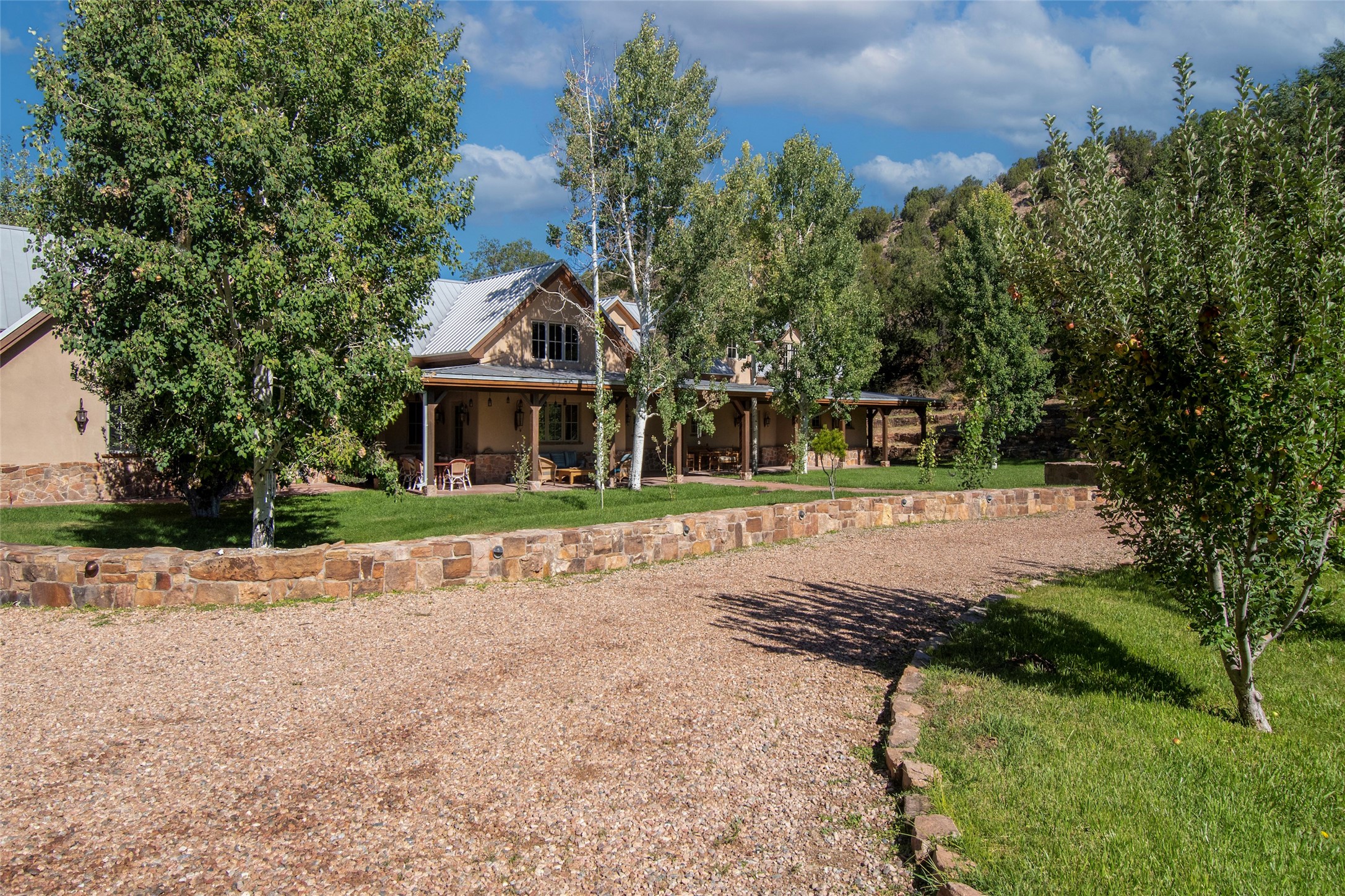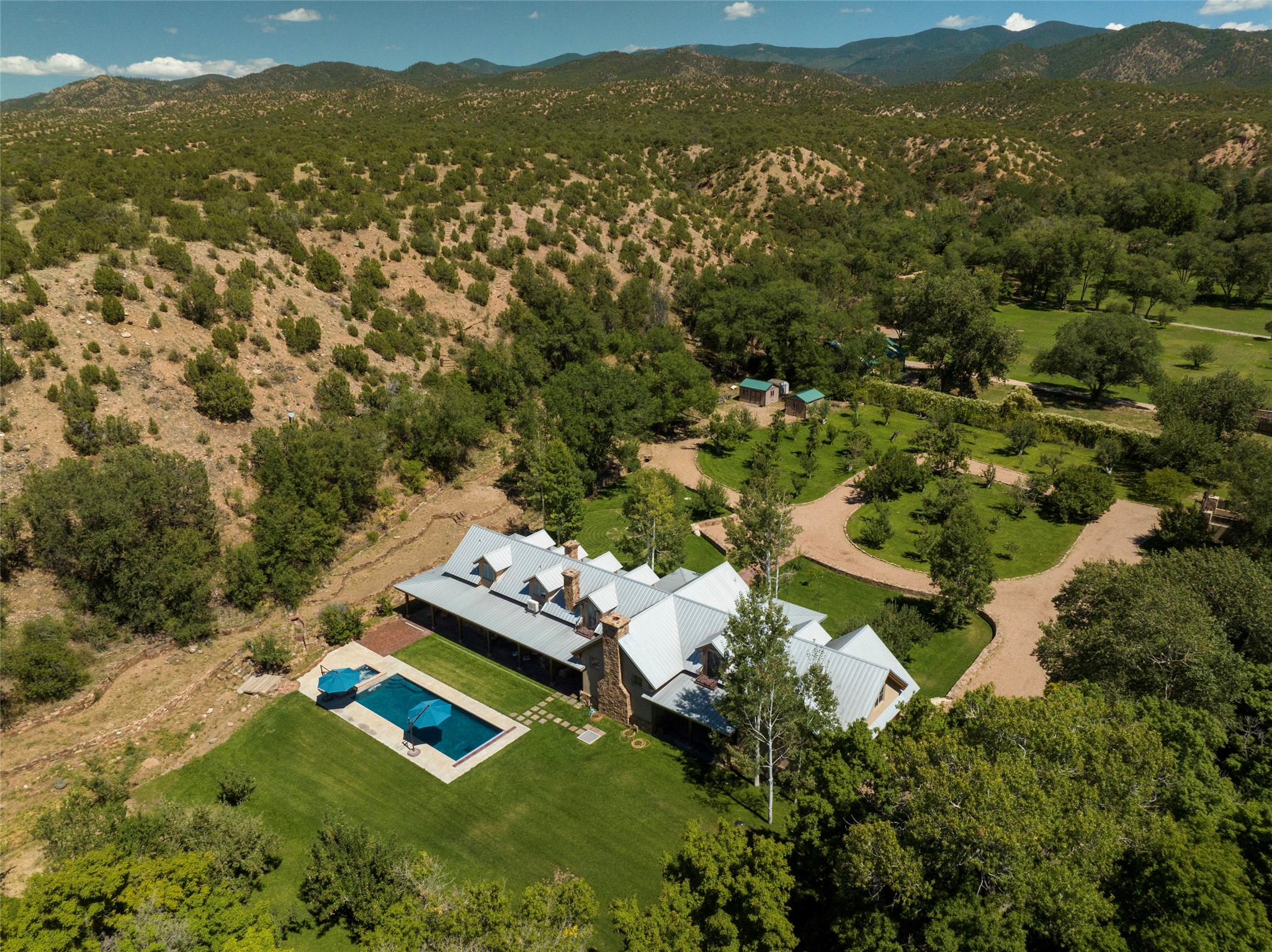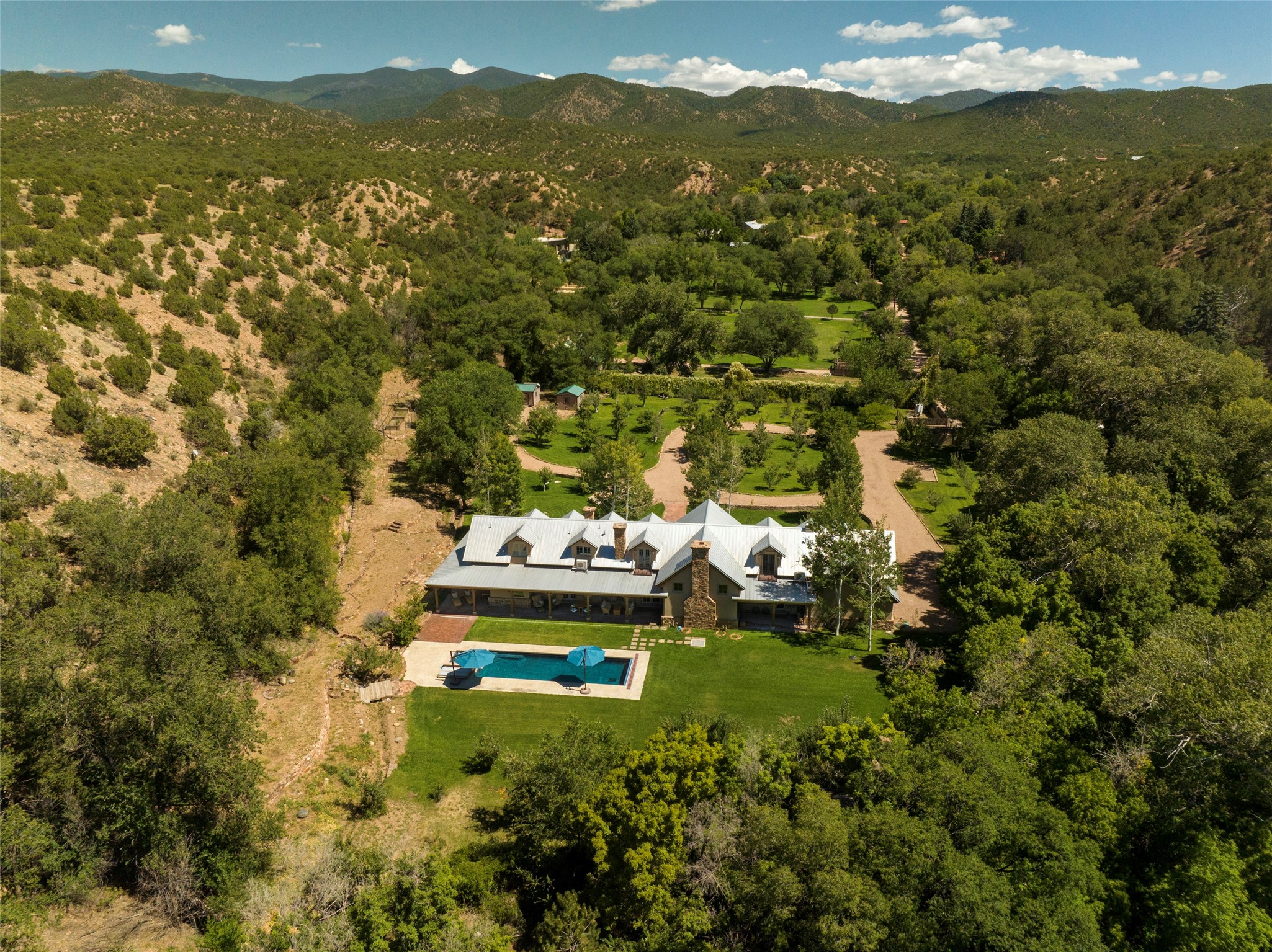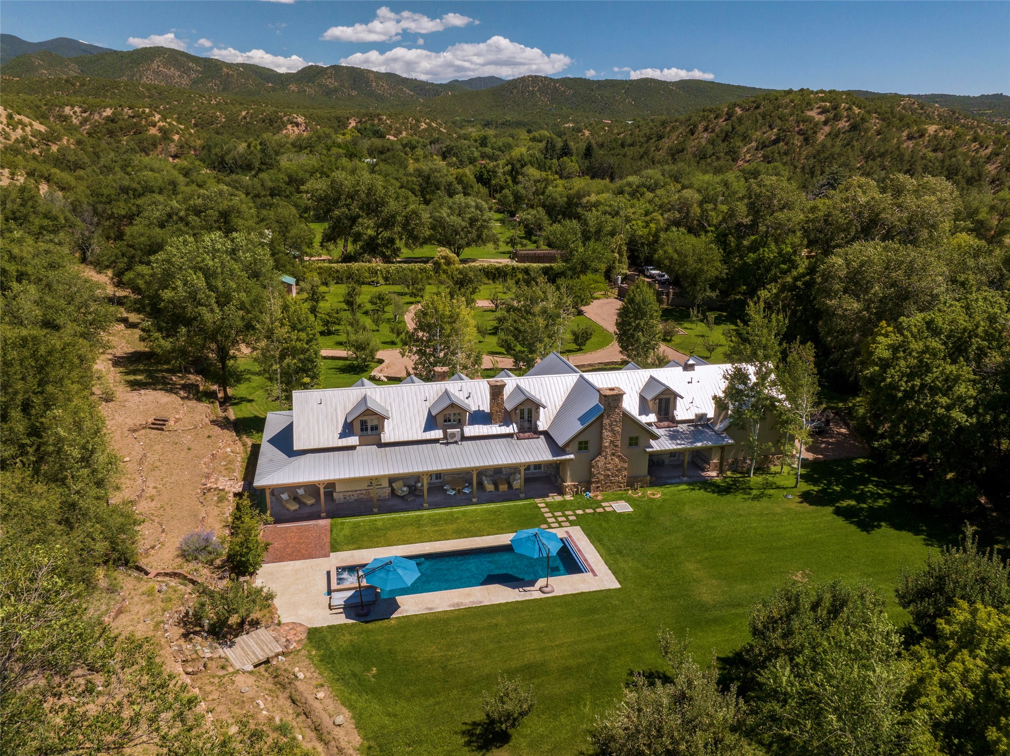 Designer David Naylor and architects Colin Keegan and Larry Andren have brought this remarkable Northern New Mexico style home to life. Featured in designer David Naylor's book "Old World Interiors - A Modern Interpretation," this home is a stunning tribute to craftsmanship and is unique in every way. The standing seam pitched roof and wrap around portal accent the architectural style. The kitchen, with excellent quality appliances and an abundance of cabinets and counterspace, and the dining room both open to the great room with high, coffered ceilings and stone fireplace. The main suite to the right of the entry hall on the first floor has a walk-in closet with built-in cabinets. The good-sized bathroom has natural stone floors, shower, jetted tub, two sinks and a water closet. French doors on either side of the bedroom lead to the wraparound portal. A sparkling blue swimming pool with waterfall feature and spa are near the master, and an outdoor shower is conveniently located just outside. The upstairs is divided into two loft sections with each having its own stairway. The stairway to the left loft leads up to a sitting room featuring a balcony. This loft has a good-sized bedroom, with a 3/4 bath. The right loft features two ensuite bedrooms and each with a balcony. One bedroom has a study with built-in bookshelves. From upstairs it is easy to view this well-maintained property: Bishop Lamy lilac bushes, a vegetable garden, the labyrinth. There are terraces and gardens, and even an organic apple orchard (plus pear, apricot and plum)! Two acequias run through the property and there is a well on each of the two legal lots. Some land overlooks the Tesuque River and abuts the Santa Fe National Forest. Completely private, this home is just minutes to town. Built from Rastra, an energy efficient and very strong material, this property is simply magnificent in every way.