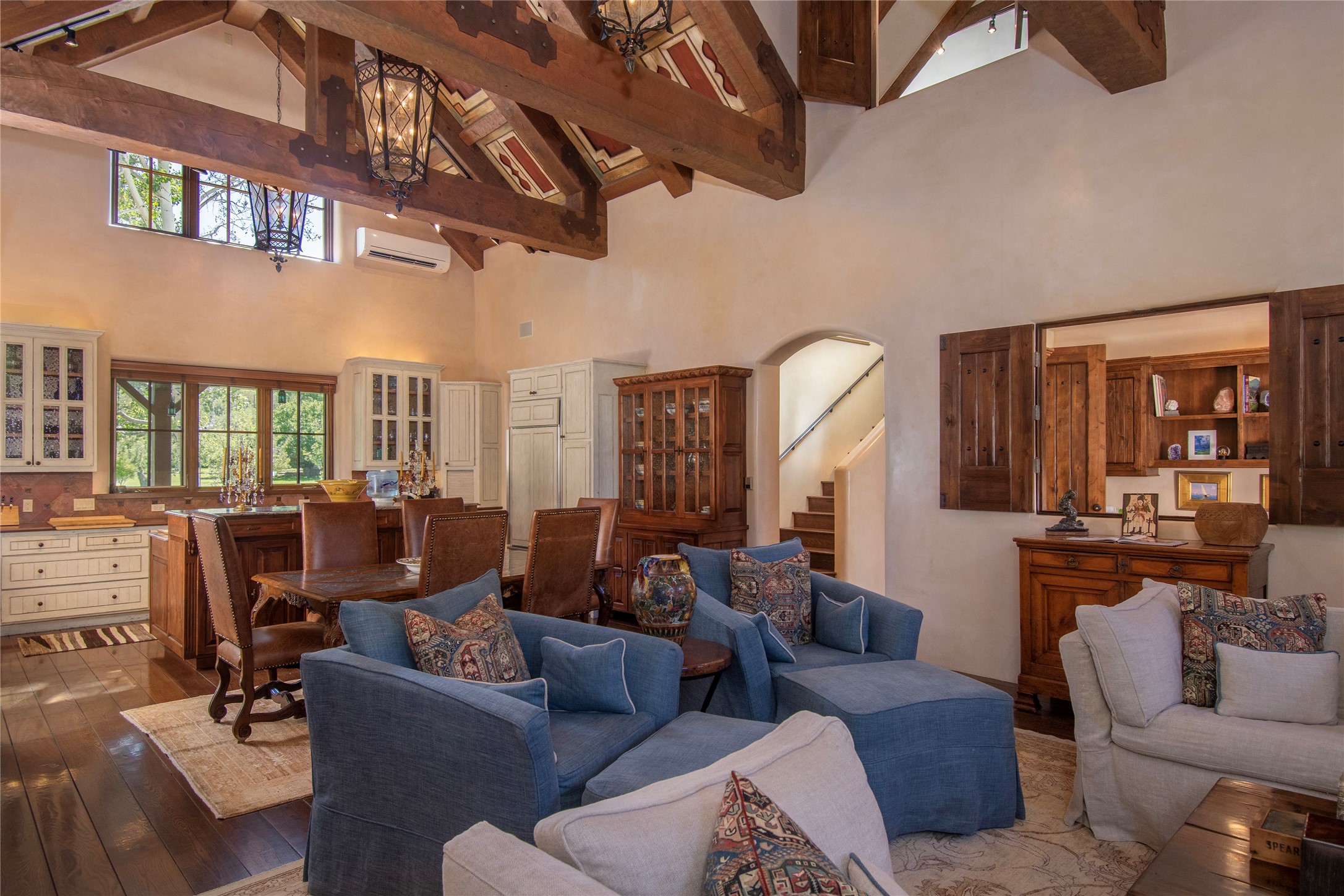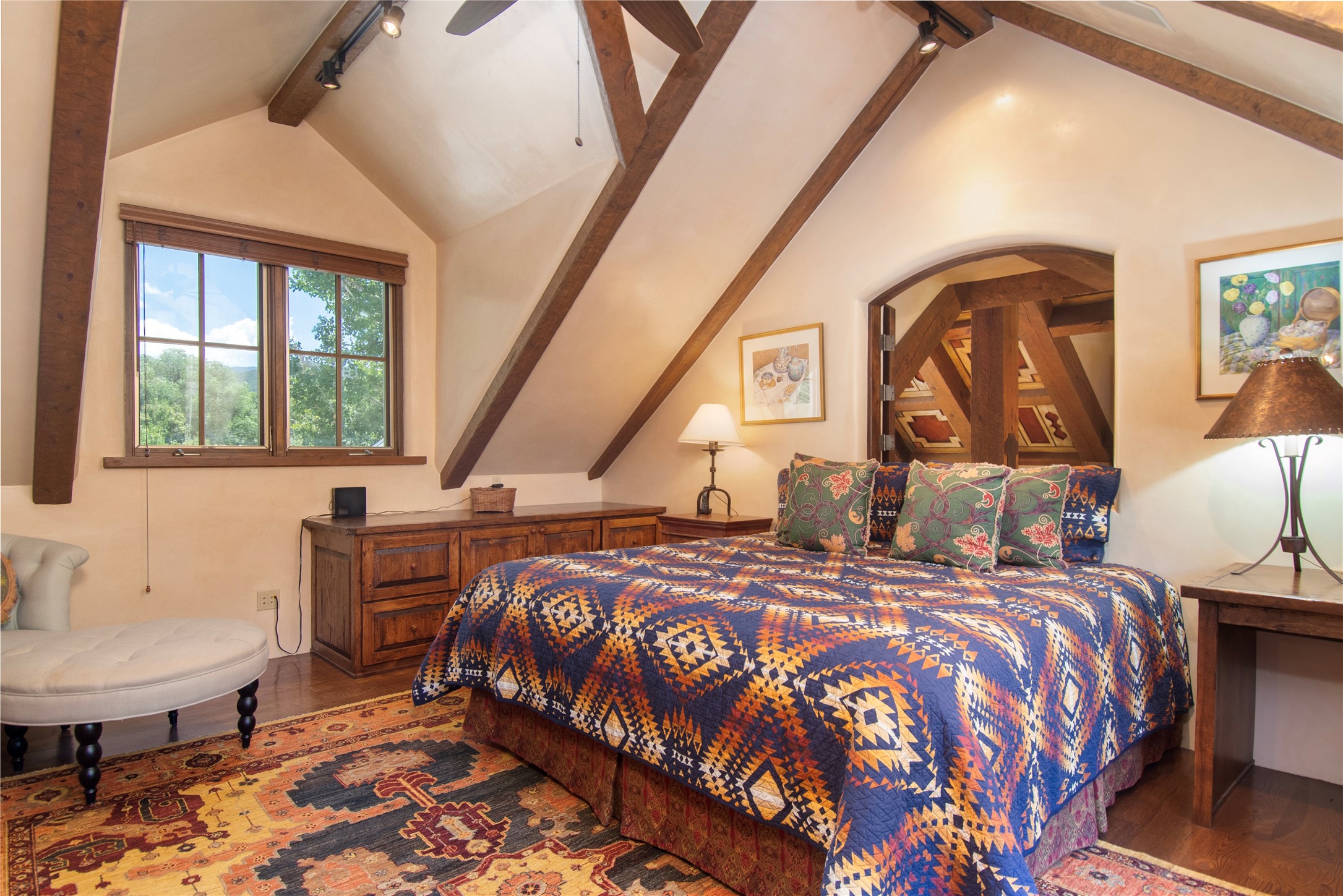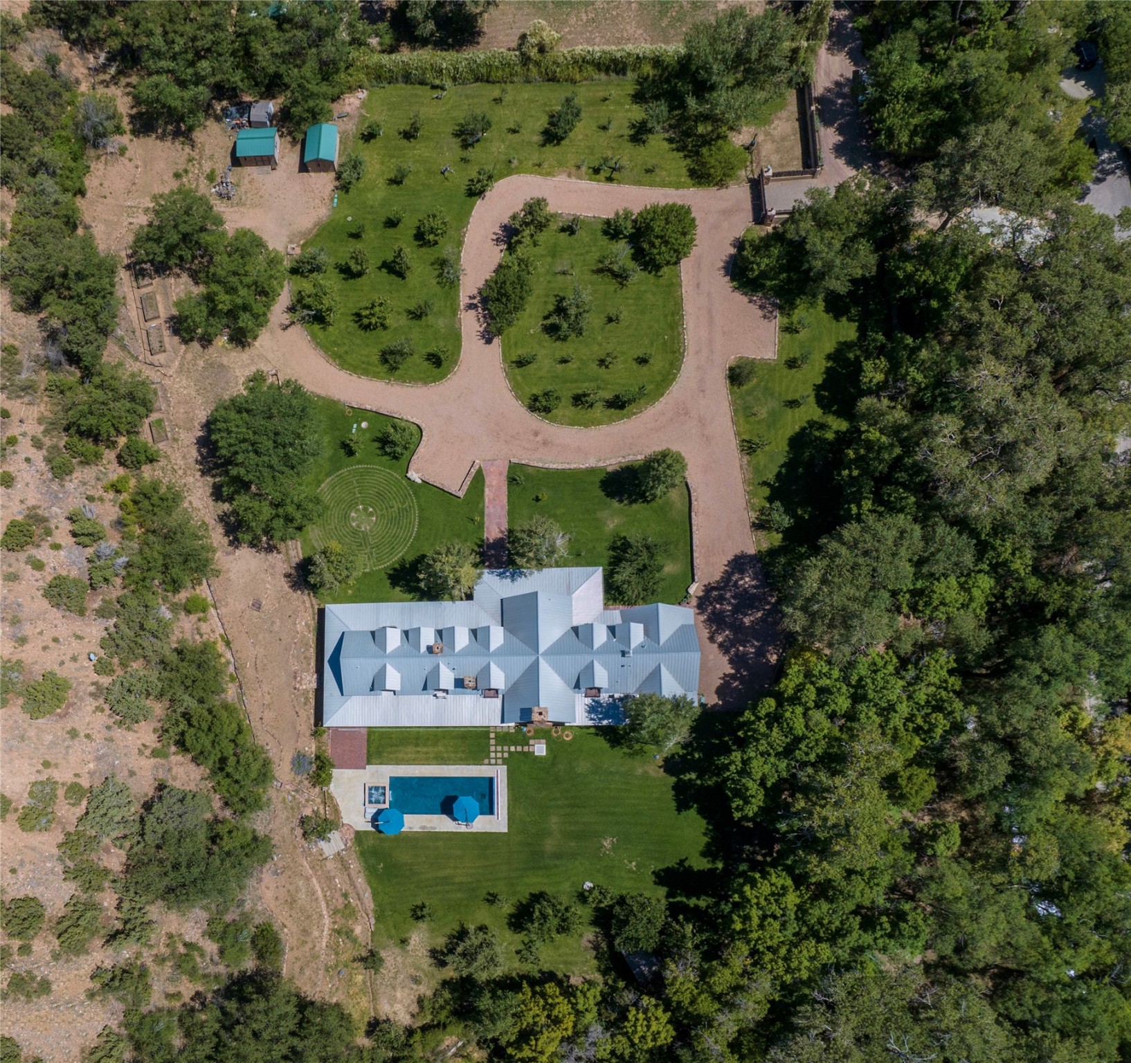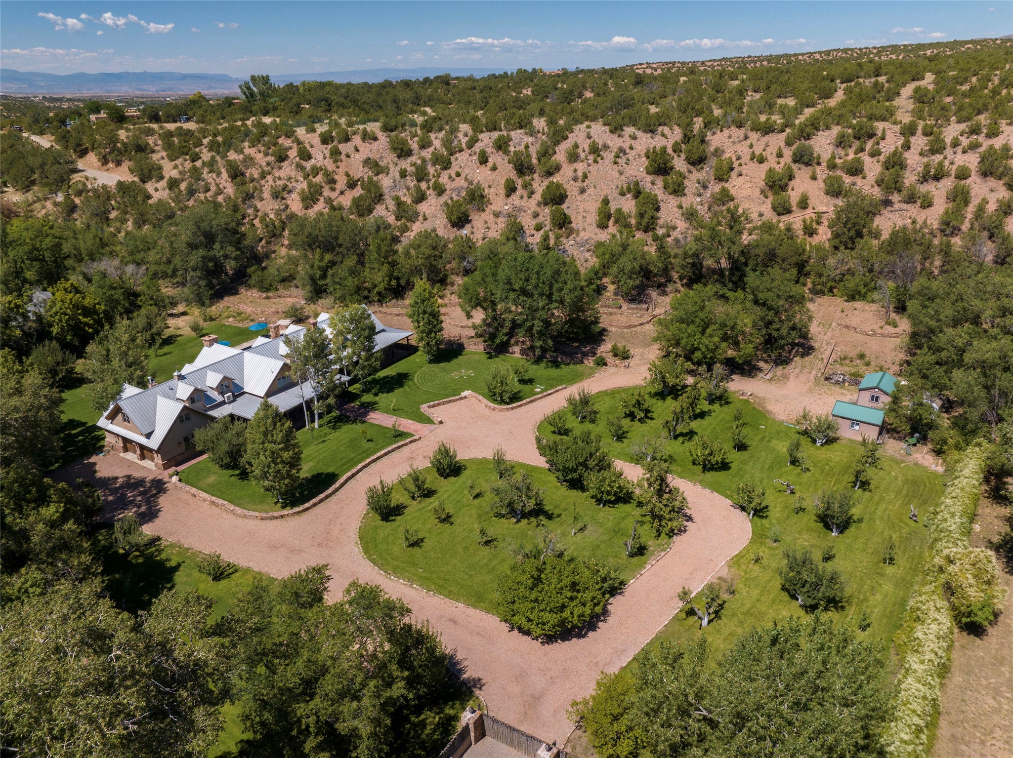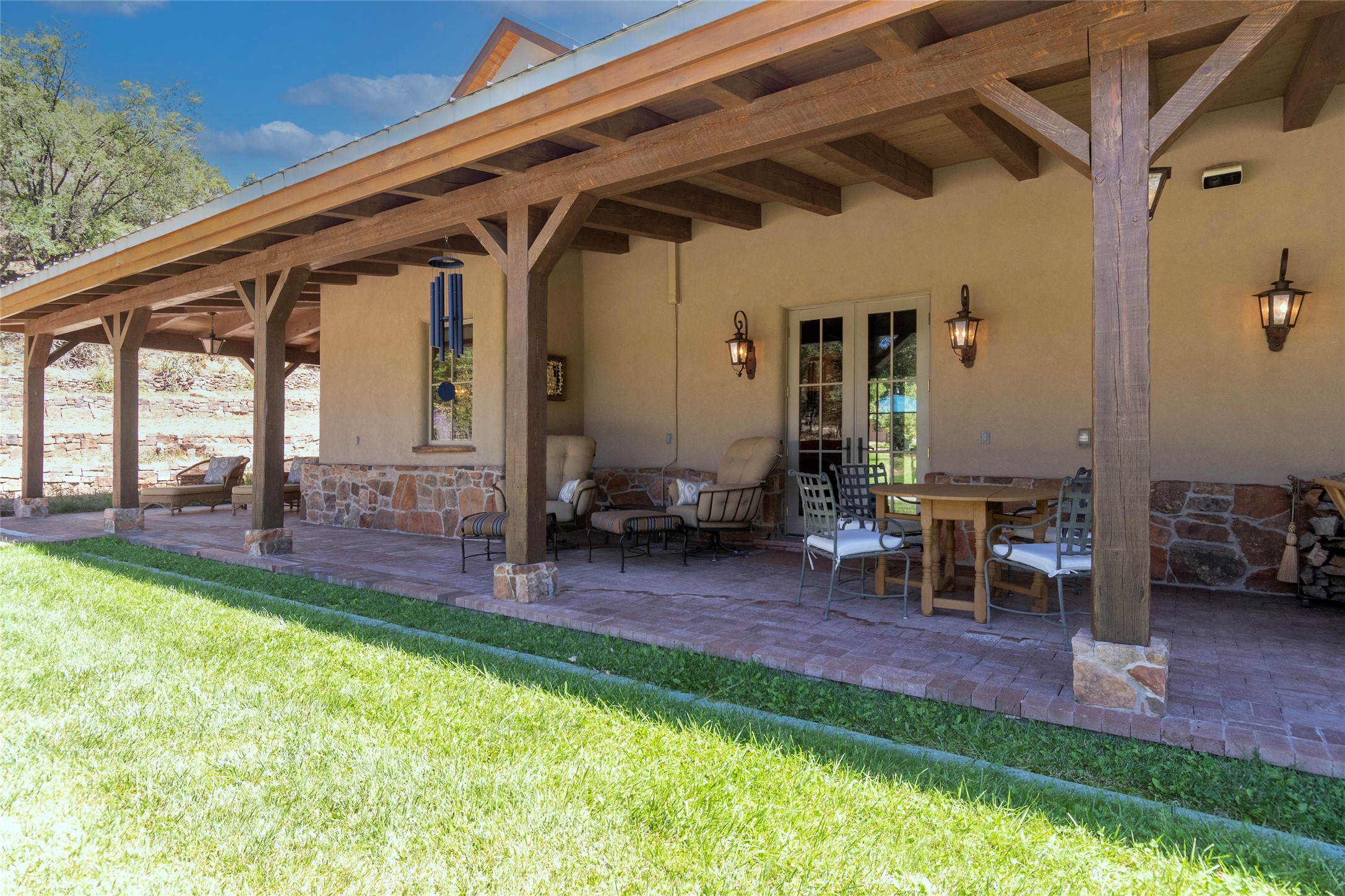 Designer David Naylor and architects Colin Keegan and Larry Andren have brought this remarkable Northern New Mexico style home to life. Featured in designer David Naylor's book "Old World Interiors - A Modern Interpretation," this home is a stunning tribute to craftsmanship and is unique in every way. The standing seam pitched roof and wrap around portal accent the architectural style. The kitchen, with excellent quality appliances and an abundance of cabinets and counterspace, and the dining room both open to the great room with high, coffered ceilings and stone fireplace. The main suite to the right of the entry hall on the first floor has a walk-in closet with built-in cabinets. The good-sized bathroom has natural stone floors, shower, jetted tub, two sinks and a water closet. French doors on either side of the bedroom lead to the wraparound portal. A sparkling blue swimming pool with waterfall feature and spa are near the master, and an outdoor shower is conveniently located just outside. The upstairs is divided into two loft sections with each having its own stairway. The stairway to the left loft leads up to a sitting room featuring a balcony. This loft has a good-sized bedroom, with a 3/4 bath. The right loft features two ensuite bedrooms and each with a balcony. One bedroom has a study with built-in bookshelves. From upstairs it is easy to view this well-maintained property: Bishop Lamy lilac bushes, a vegetable garden, the labyrinth. There are terraces and gardens, and even an organic apple orchard (plus pear, apricot and plum)! Two acequias run through the property and there is a well on each of the two legal lots. Some land overlooks the Tesuque River and abuts the Santa Fe National Forest. Completely private, this home is just minutes to town. Built from Rastra, an energy efficient and very strong material, this property is simply magnificent in every way.