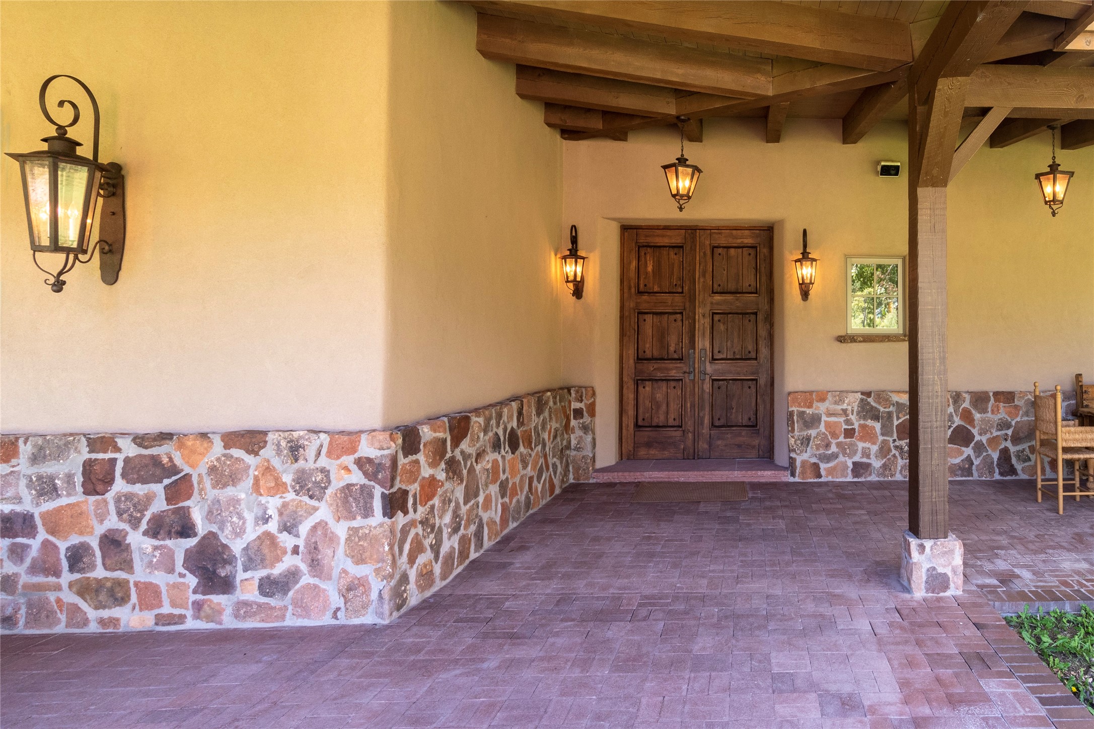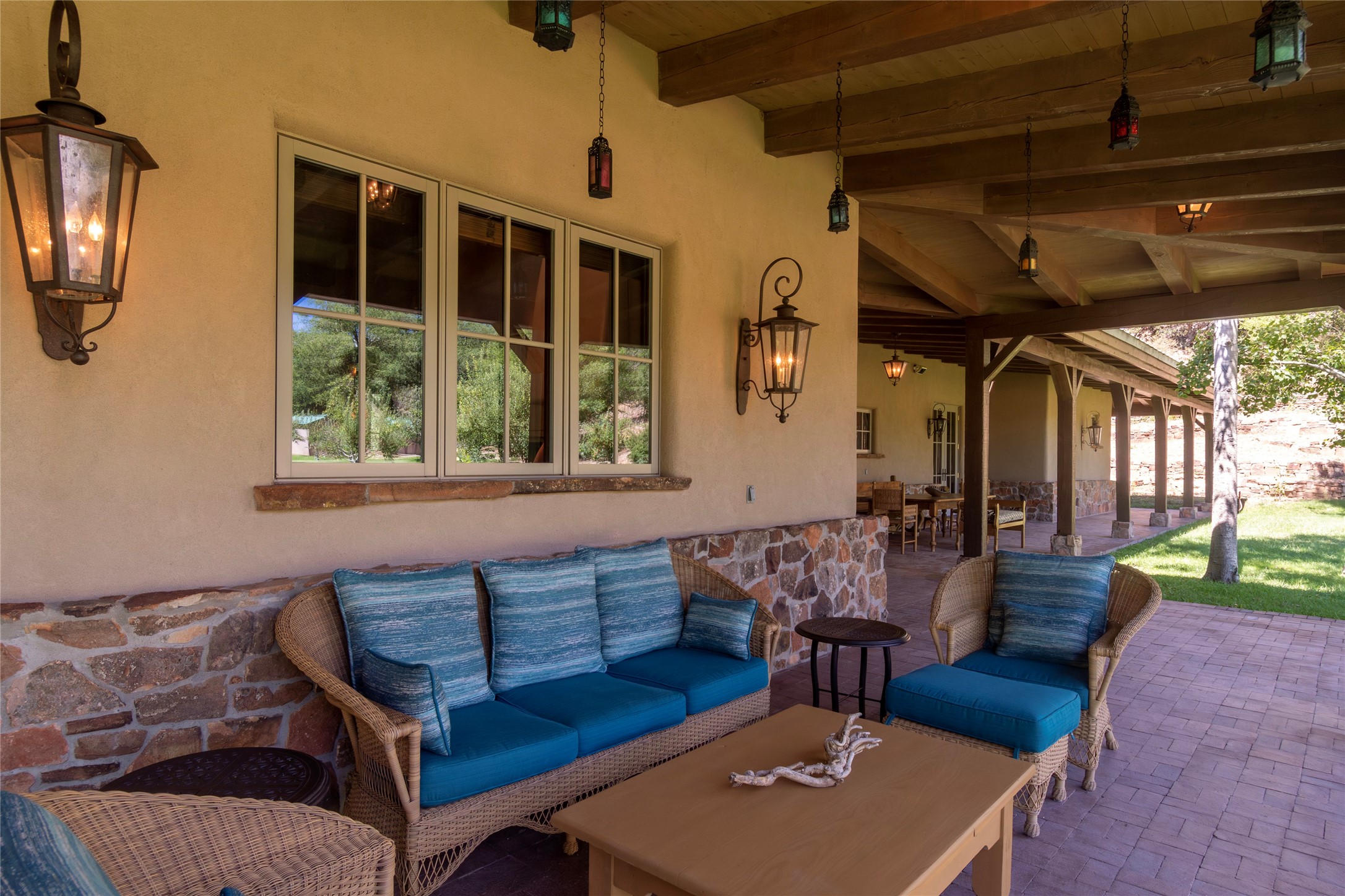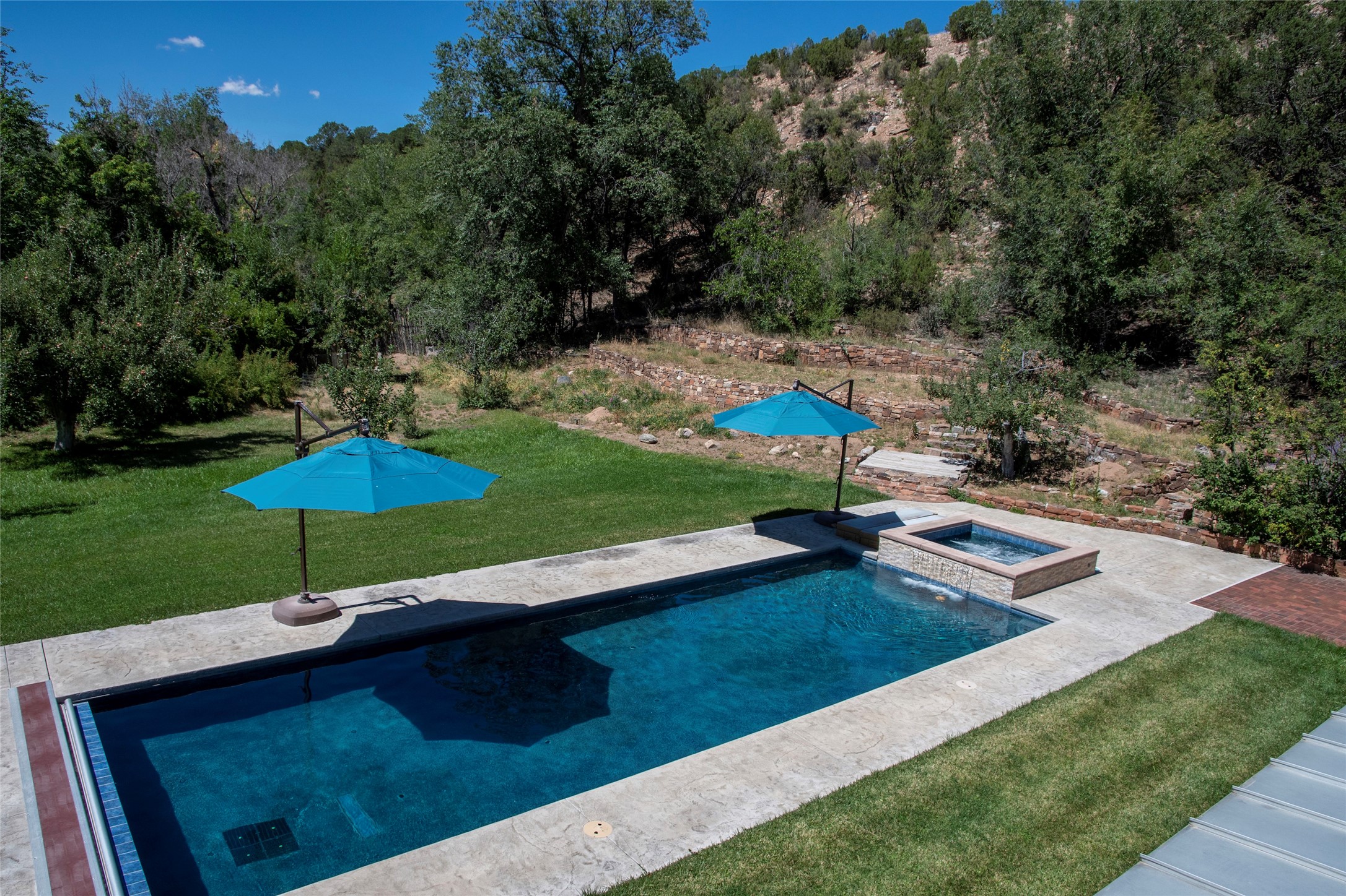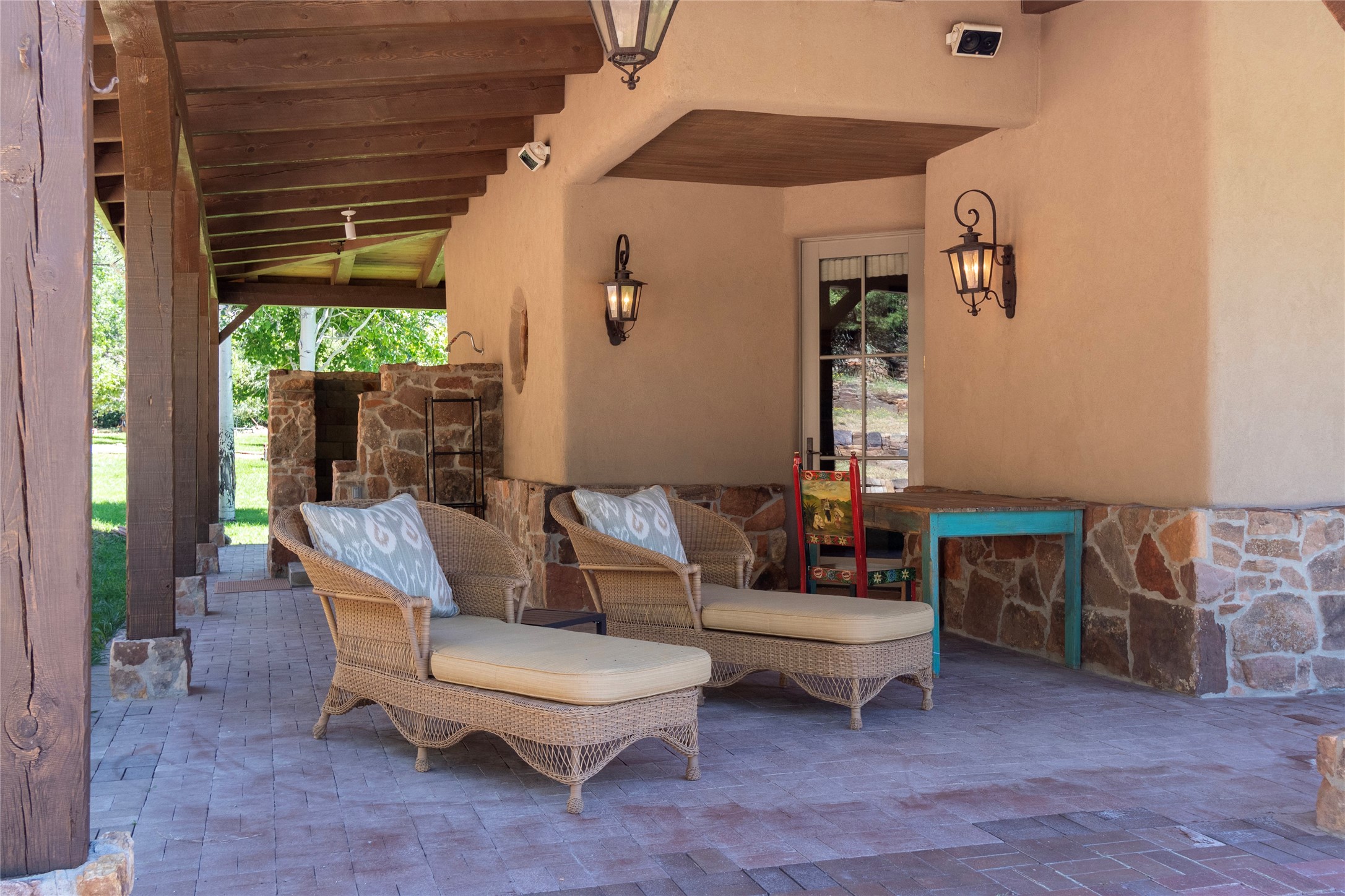 Designer David Naylor and architects Colin Keegan and Larry Andren have brought this remarkable Northern New Mexico style home to life. Featured in designer David Naylor's book "Old World Interiors - A Modern Interpretation," this home is a stunning tribute to craftsmanship and is unique in every way. The standing seam pitched roof and wrap around portal accent the architectural style. The kitchen, with excellent quality appliances and an abundance of cabinets and counterspace, and the dining room both open to the great room with high, coffered ceilings and stone fireplace. The main suite to the right of the entry hall on the first floor has a walk-in closet with built-in cabinets. The good-sized bathroom has natural stone floors, shower, jetted tub, two sinks and a water closet. French doors on either side of the bedroom lead to the wraparound portal. A sparkling blue swimming pool with waterfall feature and spa are near the master, and an outdoor shower is conveniently located just outside. The upstairs is divided into two loft sections with each having its own stairway. The stairway to the left loft leads up to a sitting room featuring a balcony. This loft has a good-sized bedroom, with a 3/4 bath. The right loft features two ensuite bedrooms and each with a balcony. One bedroom has a study with built-in bookshelves. From upstairs it is easy to view this well-maintained property: Bishop Lamy lilac bushes, a vegetable garden, the labyrinth. There are terraces and gardens, and even an organic apple orchard (plus pear, apricot and plum)! Two acequias run through the property and there is a well on each of the two legal lots. Some land overlooks the Tesuque River and abuts the Santa Fe National Forest. Completely private, this home is just minutes to town. Built from Rastra, an energy efficient and very strong material, this property is simply magnificent in every way.