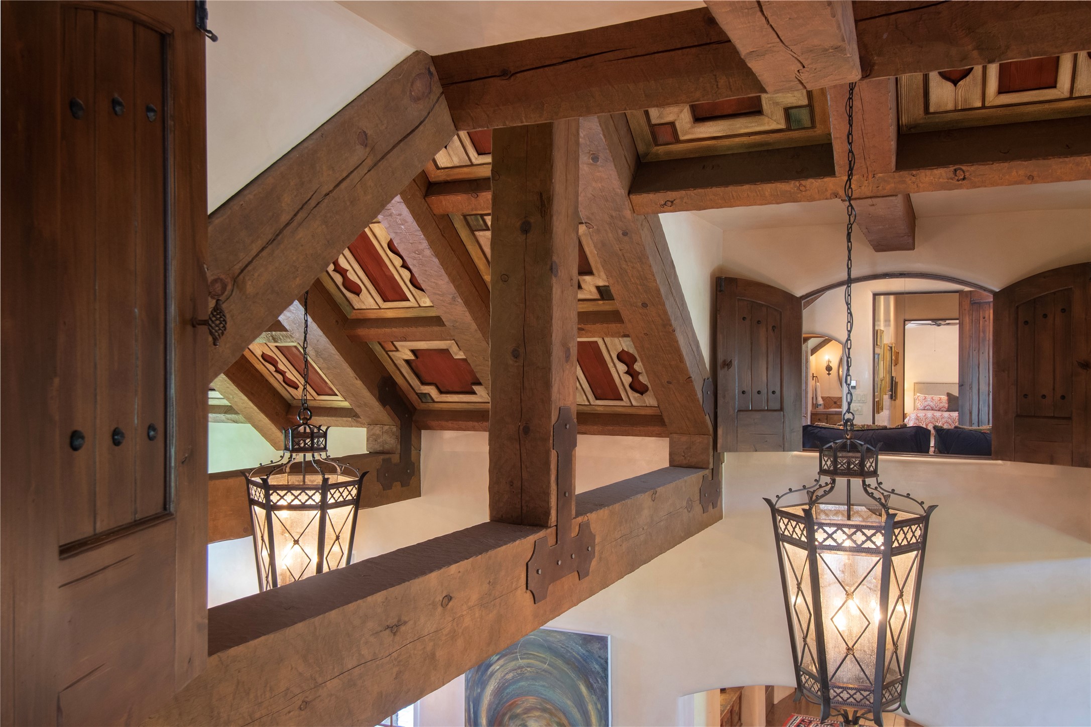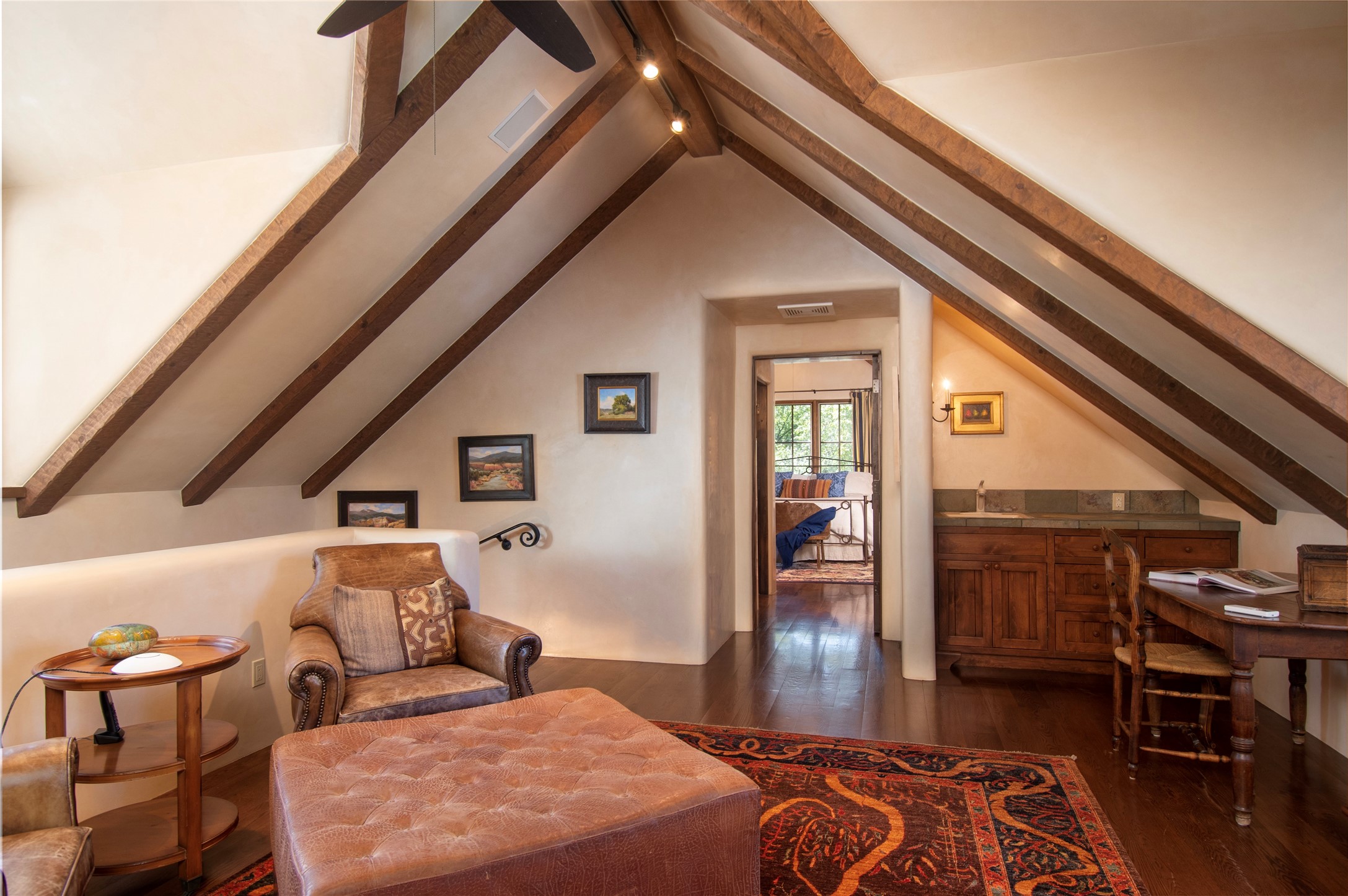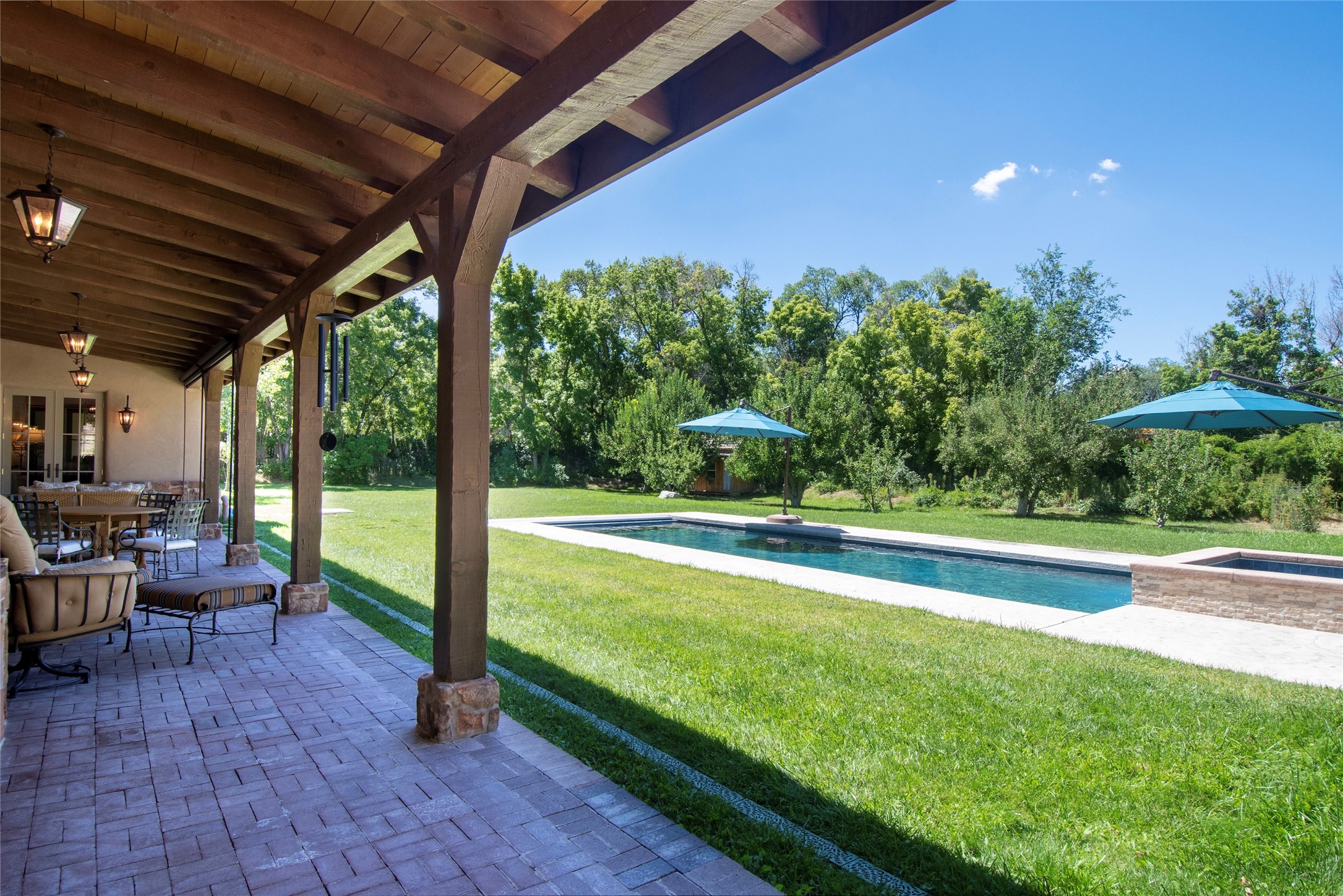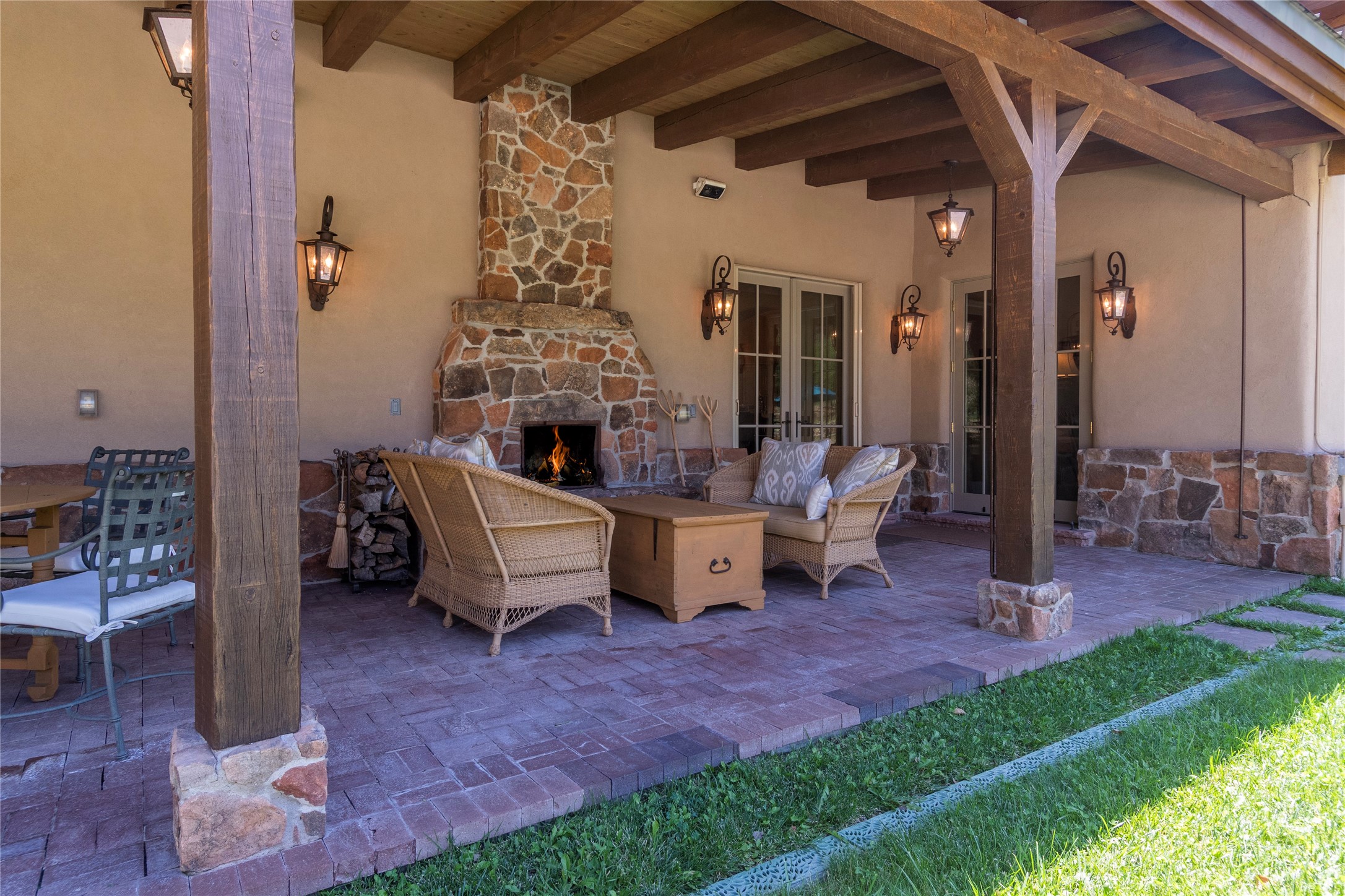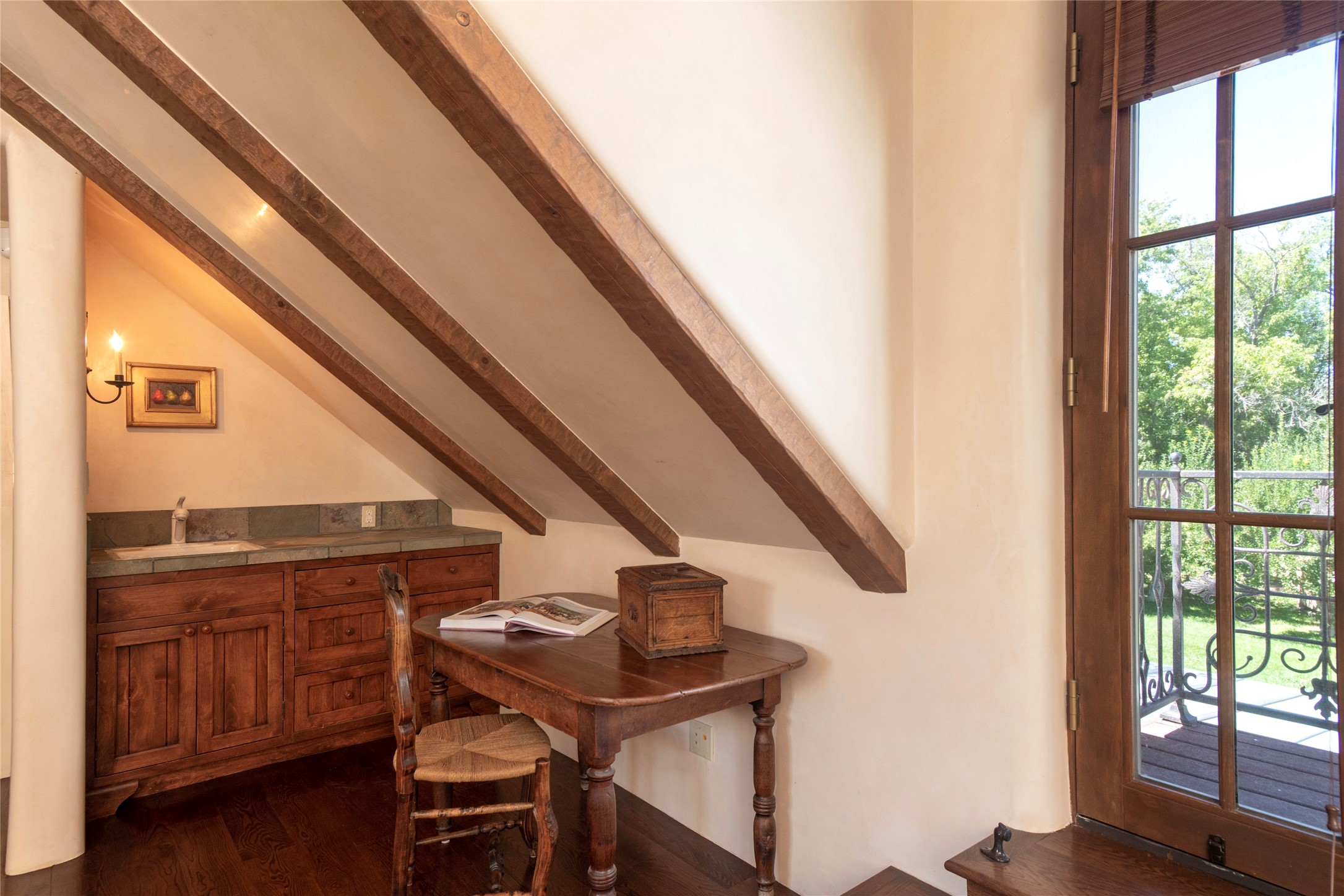 Designer David Naylor and architects Colin Keegan and Larry Andren have brought this remarkable Northern New Mexico style home to life. Featured in designer David Naylor's book "Old World Interiors - A Modern Interpretation," this home is a stunning tribute to craftsmanship and is unique in every way. The standing seam pitched roof and wrap around portal accent the architectural style. The kitchen, with excellent quality appliances and an abundance of cabinets and counterspace, and the dining room both open to the great room with high, coffered ceilings and stone fireplace. The main suite to the right of the entry hall on the first floor has a walk-in closet with built-in cabinets. The good-sized bathroom has natural stone floors, shower, jetted tub, two sinks and a water closet. French doors on either side of the bedroom lead to the wraparound portal. A sparkling blue swimming pool with waterfall feature and spa are near the master, and an outdoor shower is conveniently located just outside. The upstairs is divided into two loft sections with each having its own stairway. The stairway to the left loft leads up to a sitting room featuring a balcony. This loft has a good-sized bedroom, with a 3/4 bath. The right loft features two ensuite bedrooms and each with a balcony. One bedroom has a study with built-in bookshelves. From upstairs it is easy to view this well-maintained property: Bishop Lamy lilac bushes, a vegetable garden, the labyrinth. There are terraces and gardens, and even an organic apple orchard (plus pear, apricot and plum)! Two acequias run through the property and there is a well on each of the two legal lots. Some land overlooks the Tesuque River and abuts the Santa Fe National Forest. Completely private, this home is just minutes to town. Built from Rastra, an energy efficient and very strong material, this property is simply magnificent in every way.