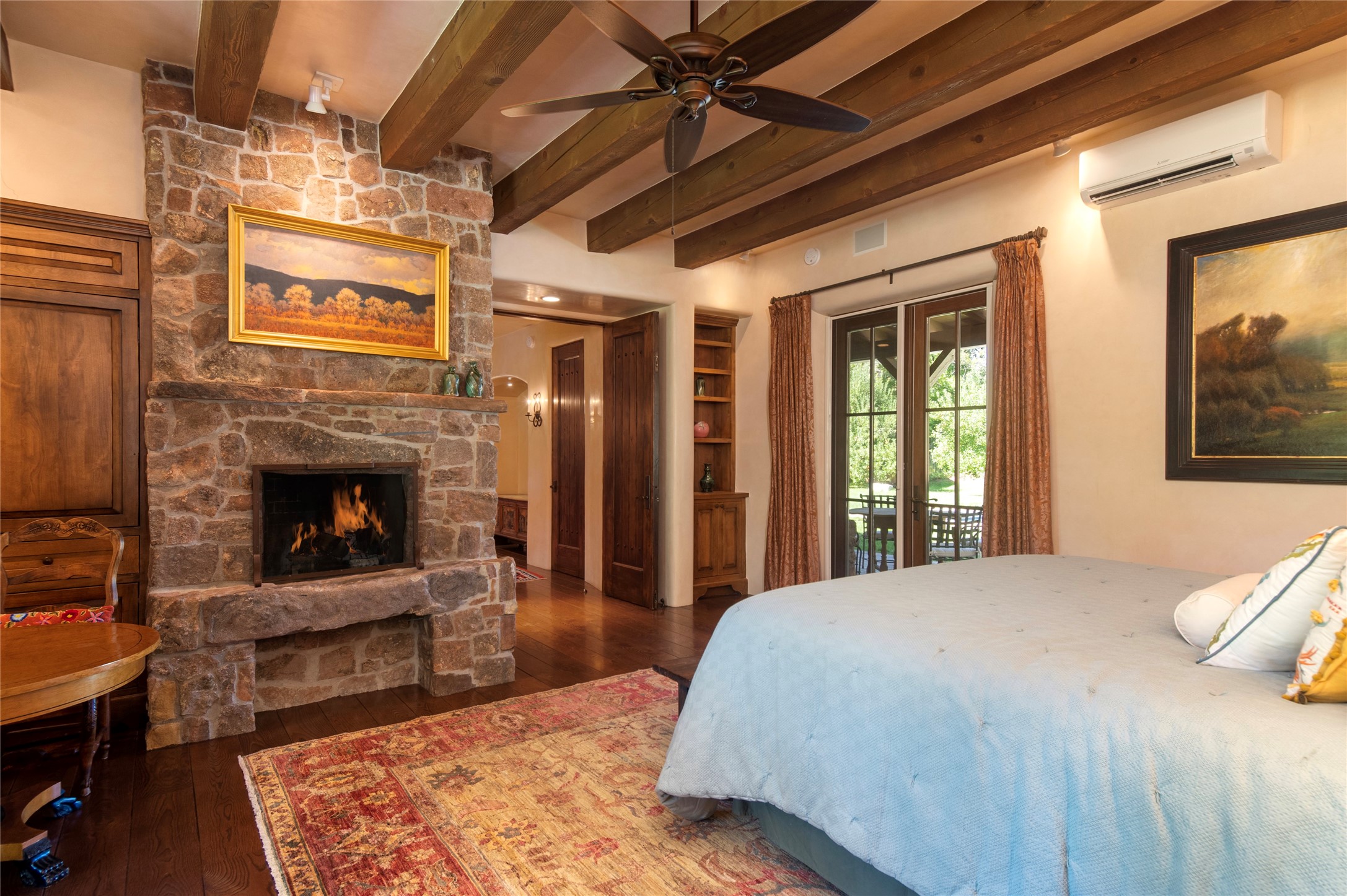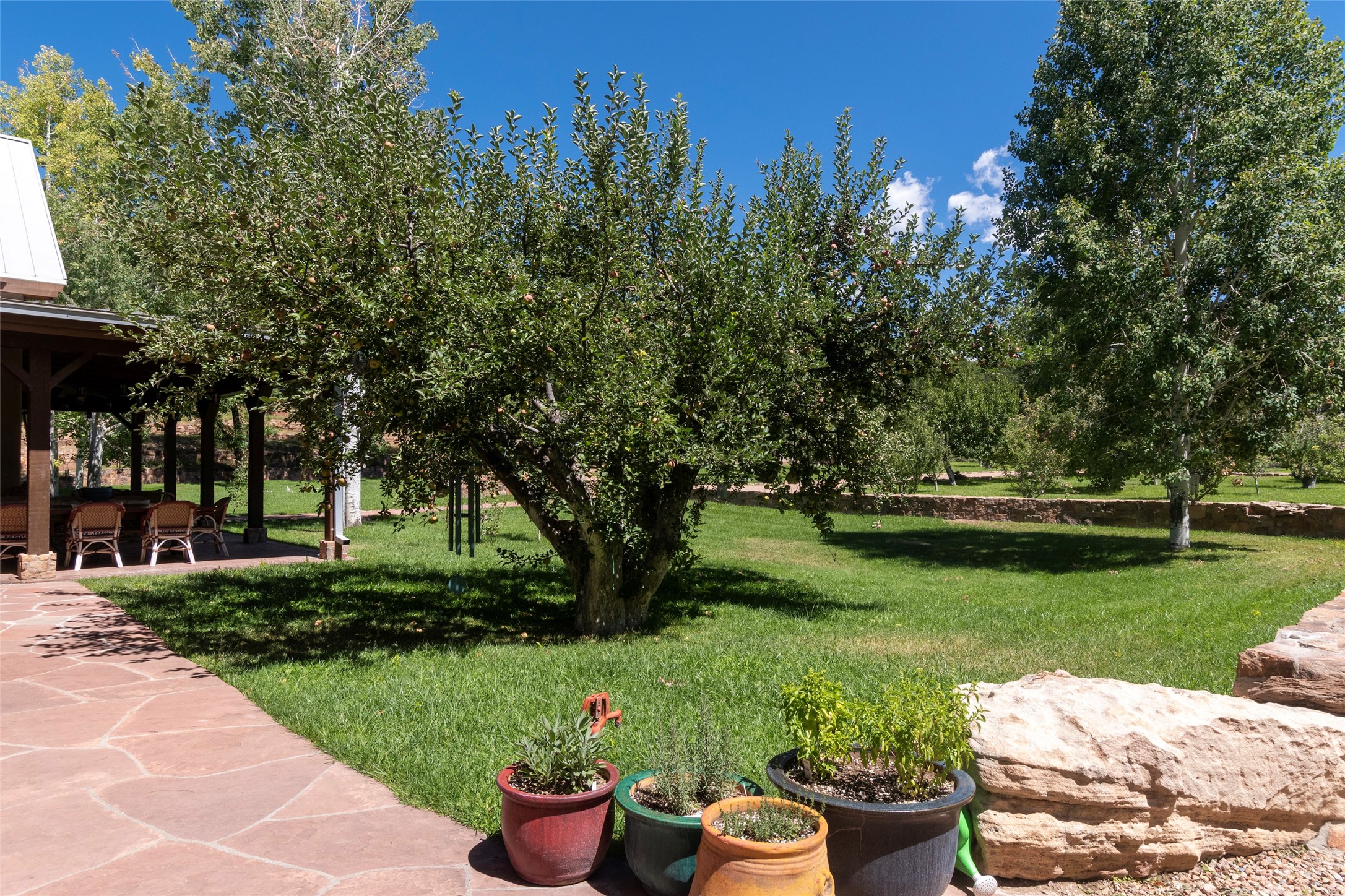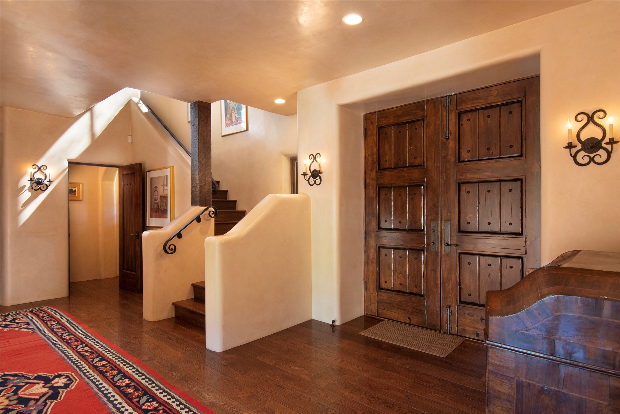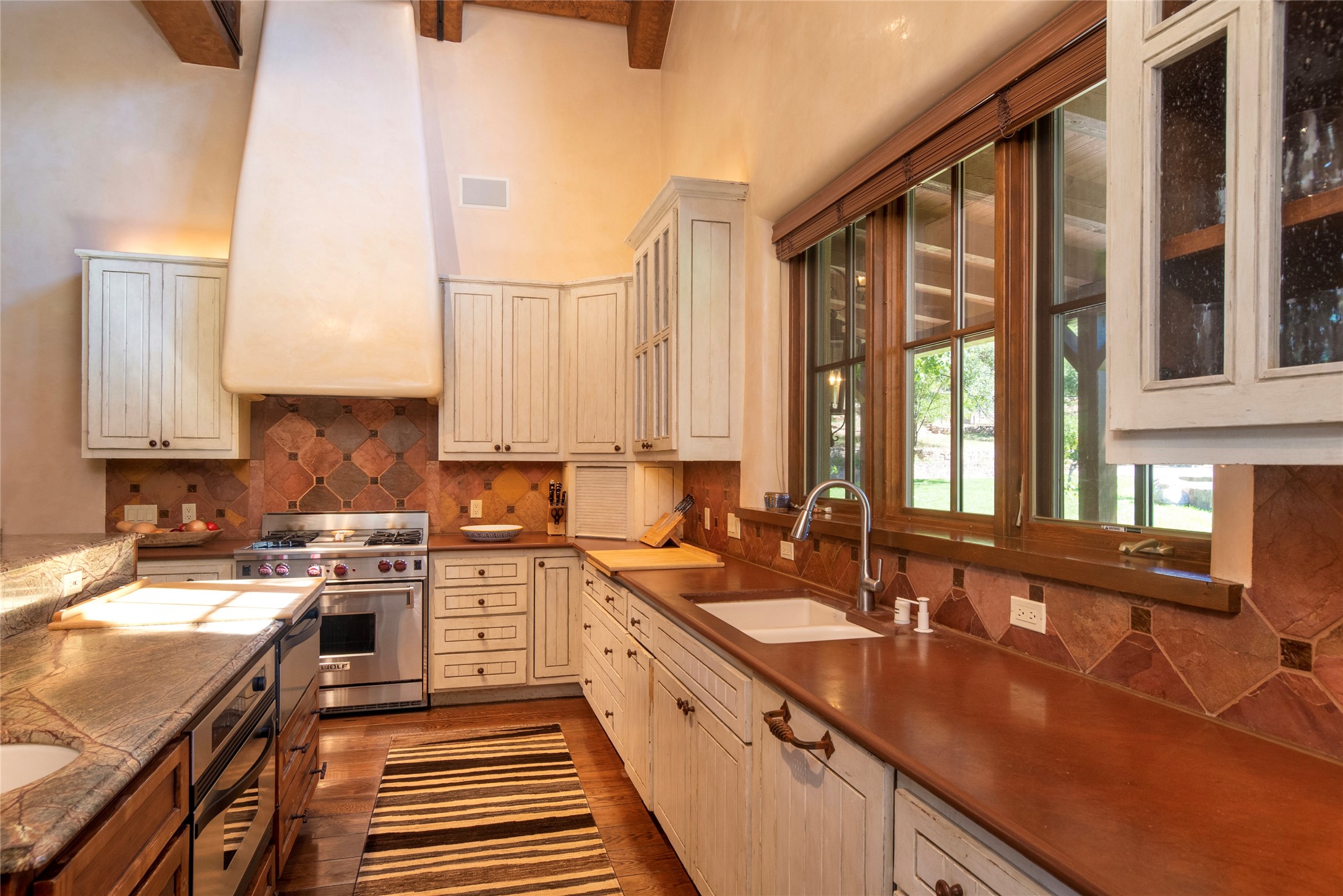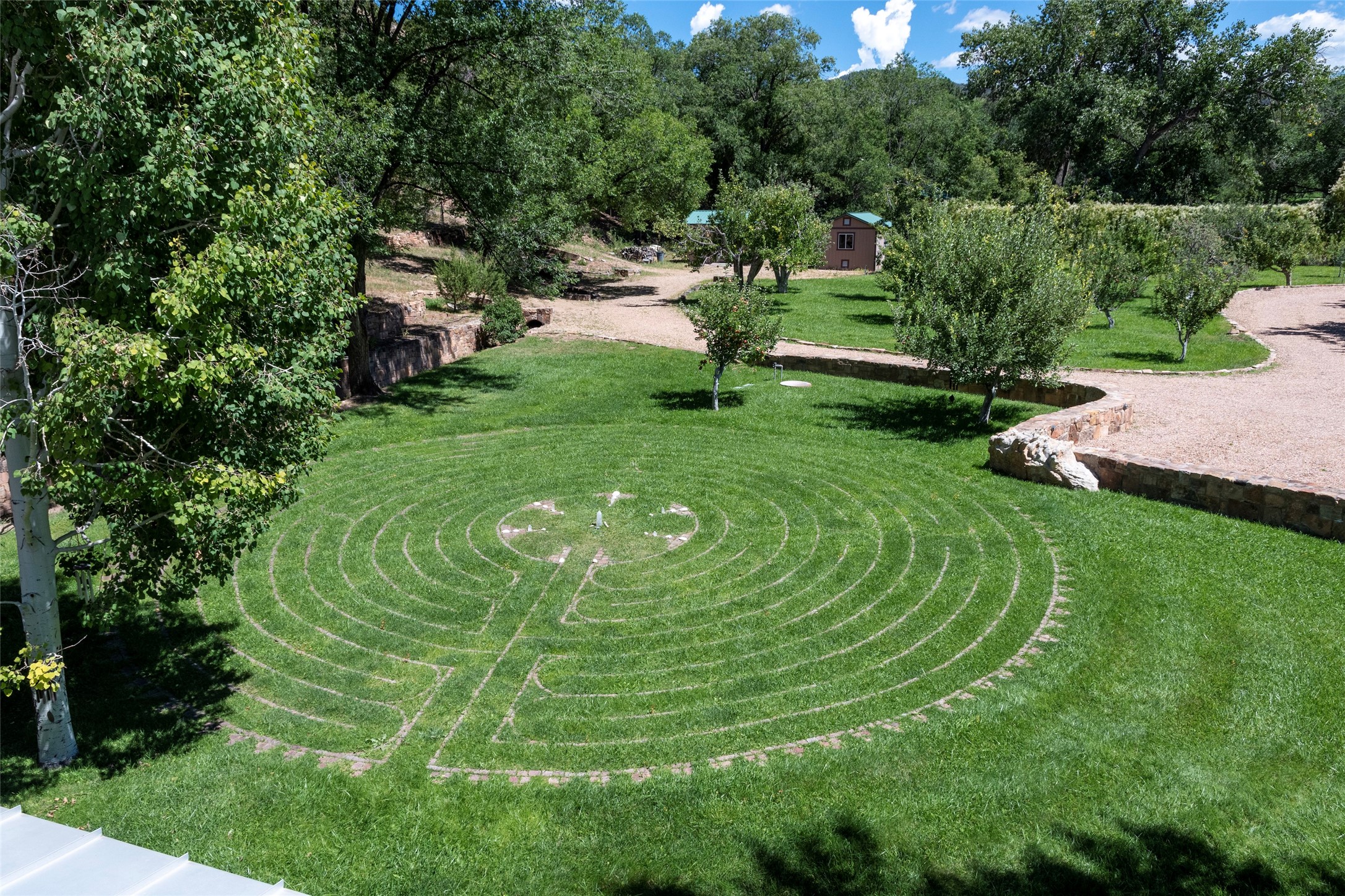 Designer David Naylor and architects Colin Keegan and Larry Andren have brought this remarkable Northern New Mexico style home to life. Featured in designer David Naylor's book "Old World Interiors - A Modern Interpretation," this home is a stunning tribute to craftsmanship and is unique in every way. The standing seam pitched roof and wrap around portal accent the architectural style. The kitchen, with excellent quality appliances and an abundance of cabinets and counterspace, and the dining room both open to the great room with high, coffered ceilings and stone fireplace. The main suite to the right of the entry hall on the first floor has a walk-in closet with built-in cabinets. The good-sized bathroom has natural stone floors, shower, jetted tub, two sinks and a water closet. French doors on either side of the bedroom lead to the wraparound portal. A sparkling blue swimming pool with waterfall feature and spa are near the master, and an outdoor shower is conveniently located just outside. The upstairs is divided into two loft sections with each having its own stairway. The stairway to the left loft leads up to a sitting room featuring a balcony. This loft has a good-sized bedroom, with a 3/4 bath. The right loft features two ensuite bedrooms and each with a balcony. One bedroom has a study with built-in bookshelves. From upstairs it is easy to view this well-maintained property: Bishop Lamy lilac bushes, a vegetable garden, the labyrinth. There are terraces and gardens, and even an organic apple orchard (plus pear, apricot and plum)! Two acequias run through the property and there is a well on each of the two legal lots. Some land overlooks the Tesuque River and abuts the Santa Fe National Forest. Completely private, this home is just minutes to town. Built from Rastra, an energy efficient and very strong material, this property is simply magnificent in every way.