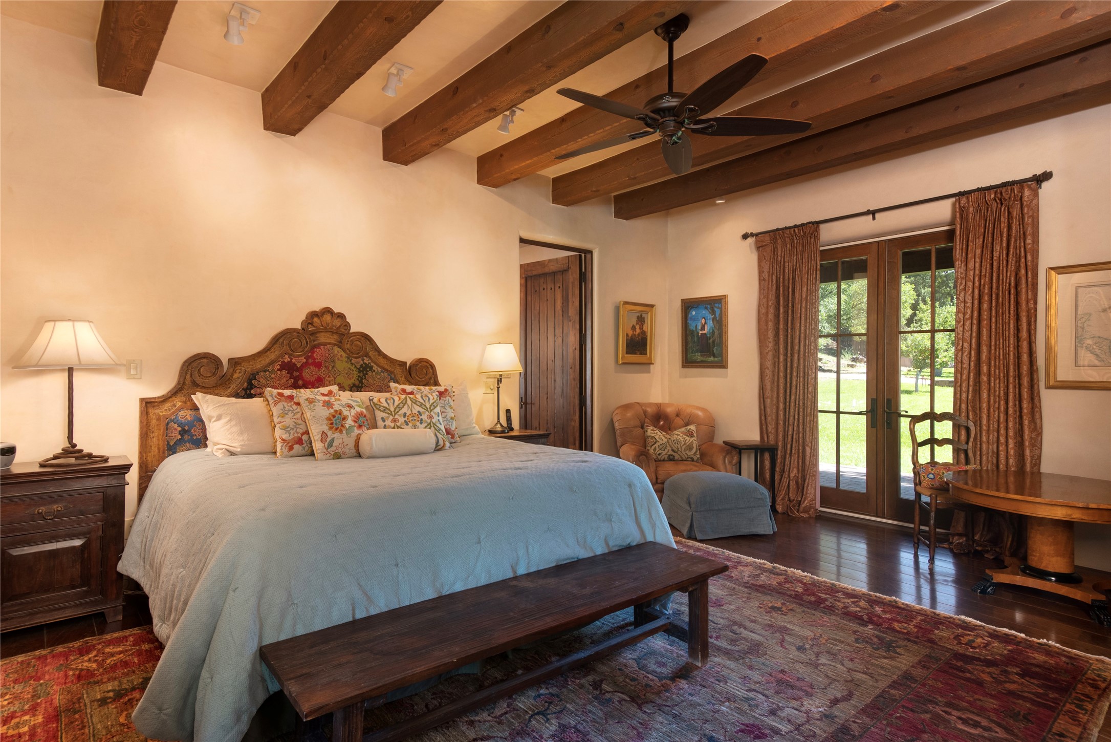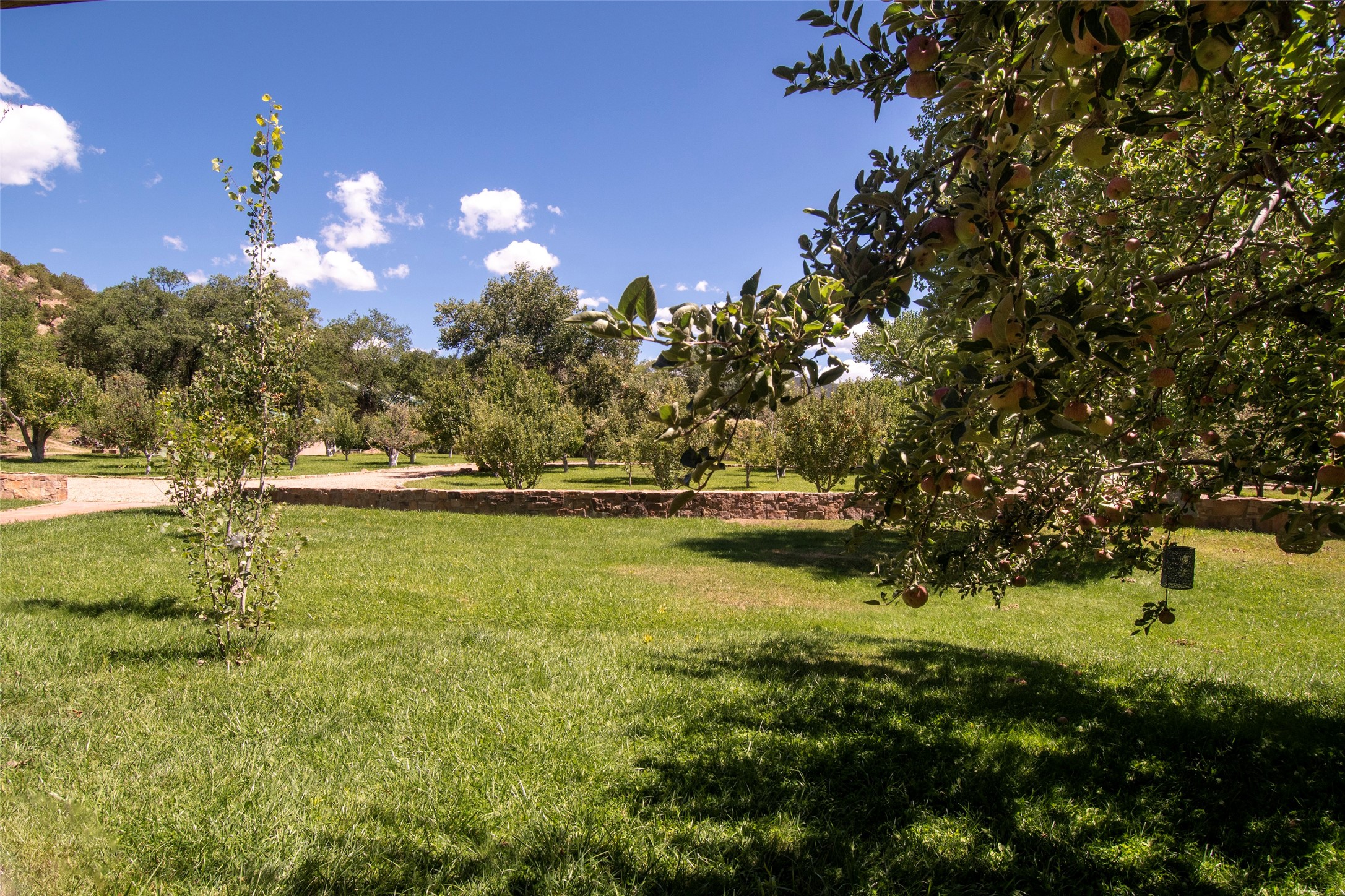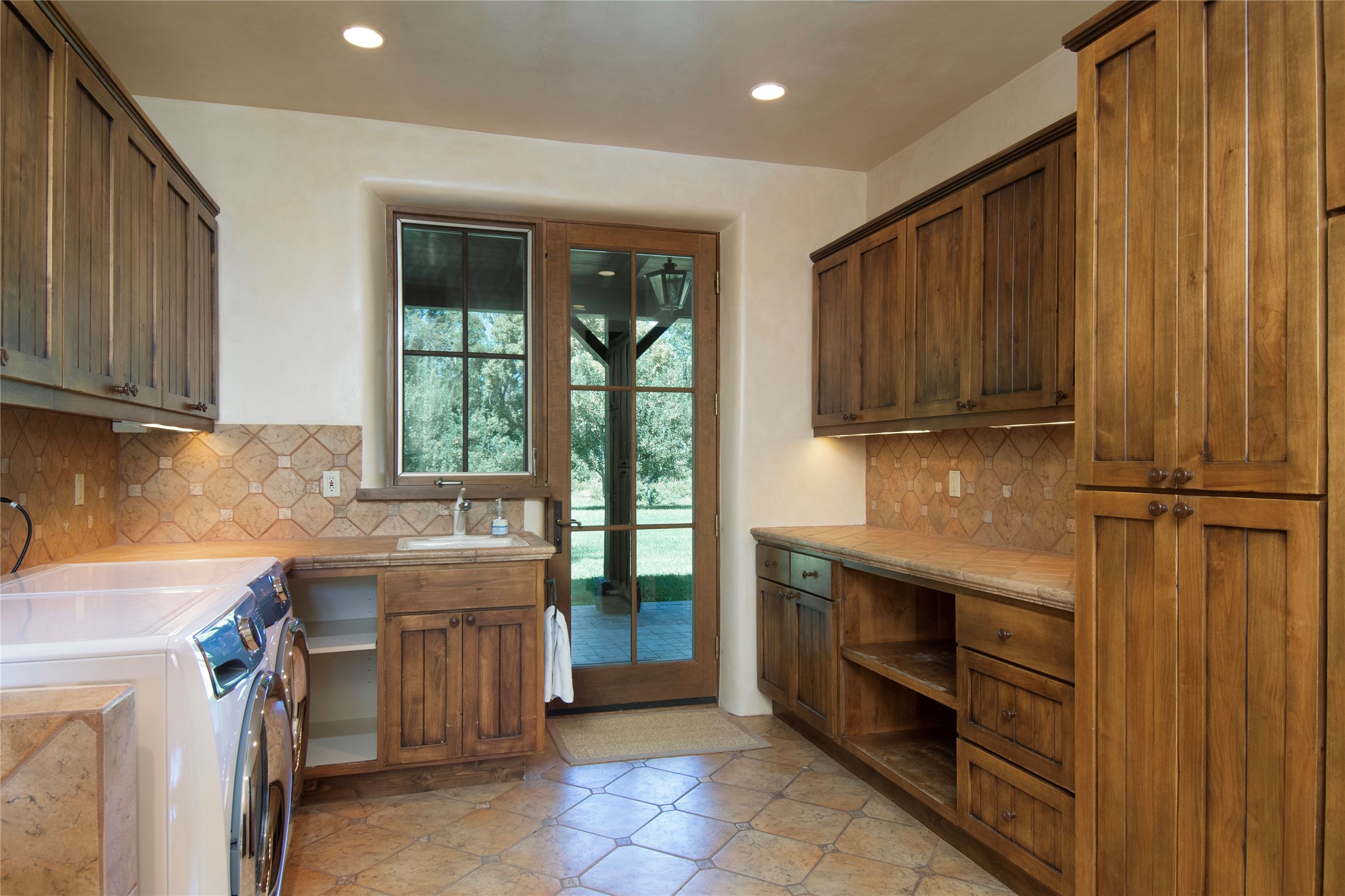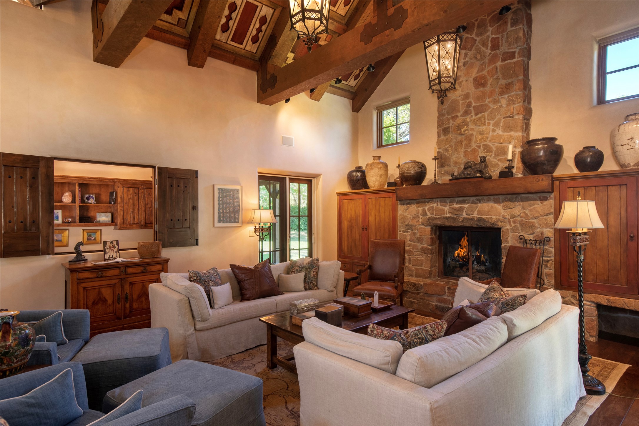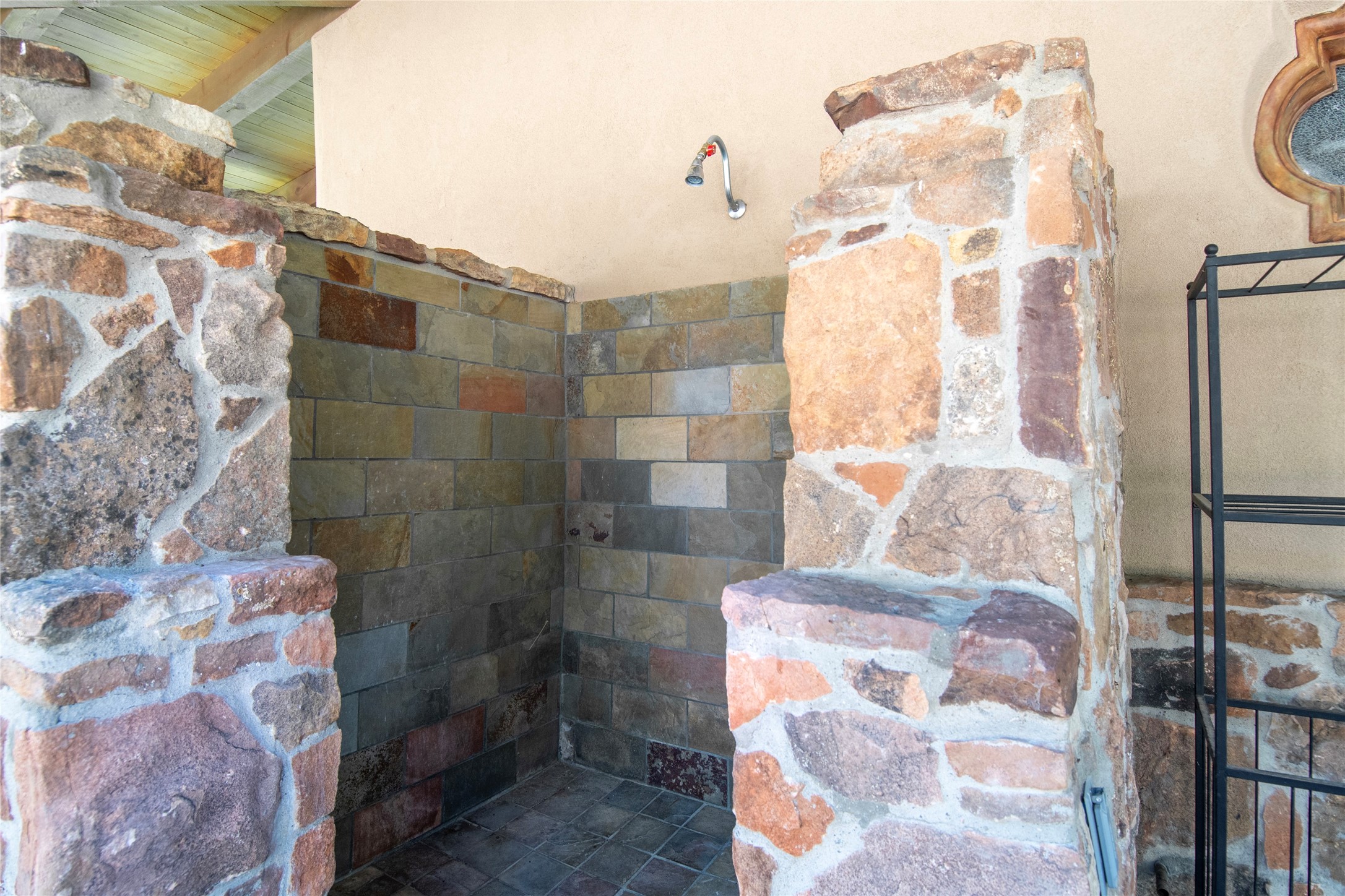 Designer David Naylor and architects Colin Keegan and Larry Andren have brought this remarkable Northern New Mexico style home to life. Featured in designer David Naylor's book "Old World Interiors - A Modern Interpretation," this home is a stunning tribute to craftsmanship and is unique in every way. The standing seam pitched roof and wrap around portal accent the architectural style. The kitchen, with excellent quality appliances and an abundance of cabinets and counterspace, and the dining room both open to the great room with high, coffered ceilings and stone fireplace. The main suite to the right of the entry hall on the first floor has a walk-in closet with built-in cabinets. The good-sized bathroom has natural stone floors, shower, jetted tub, two sinks and a water closet. French doors on either side of the bedroom lead to the wraparound portal. A sparkling blue swimming pool with waterfall feature and spa are near the master, and an outdoor shower is conveniently located just outside. The upstairs is divided into two loft sections with each having its own stairway. The stairway to the left loft leads up to a sitting room featuring a balcony. This loft has a good-sized bedroom, with a 3/4 bath. The right loft features two ensuite bedrooms and each with a balcony. One bedroom has a study with built-in bookshelves. From upstairs it is easy to view this well-maintained property: Bishop Lamy lilac bushes, a vegetable garden, the labyrinth. There are terraces and gardens, and even an organic apple orchard (plus pear, apricot and plum)! Two acequias run through the property and there is a well on each of the two legal lots. Some land overlooks the Tesuque River and abuts the Santa Fe National Forest. Completely private, this home is just minutes to town. Built from Rastra, an energy efficient and very strong material, this property is simply magnificent in every way.