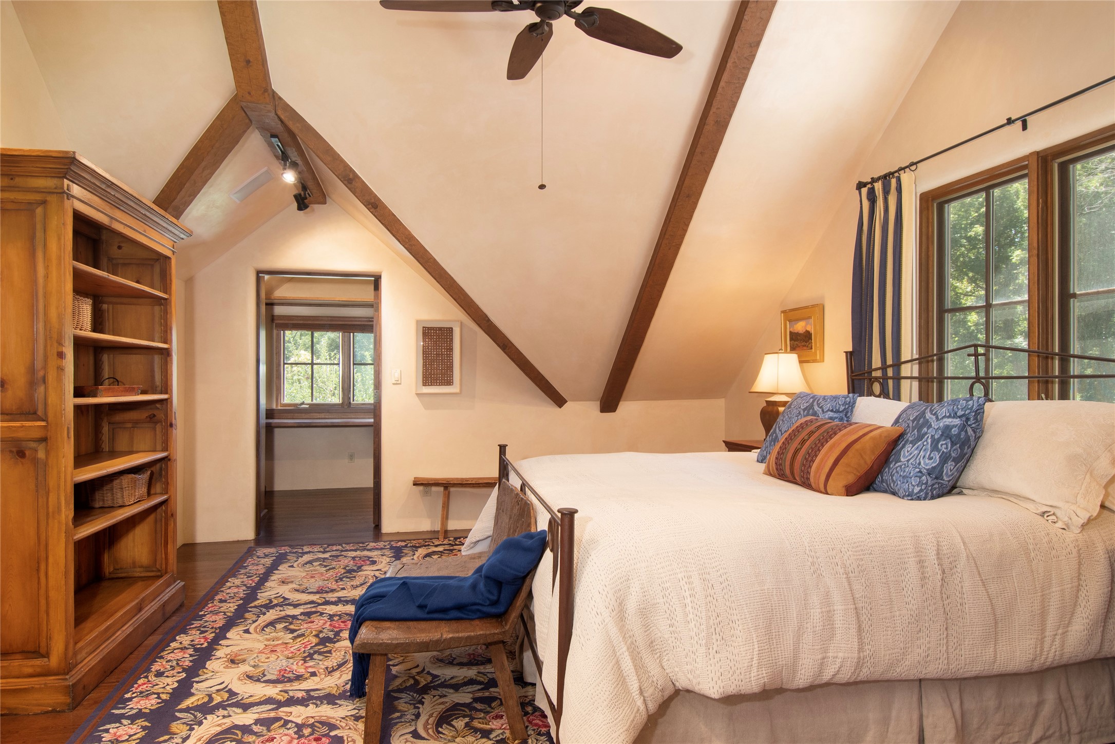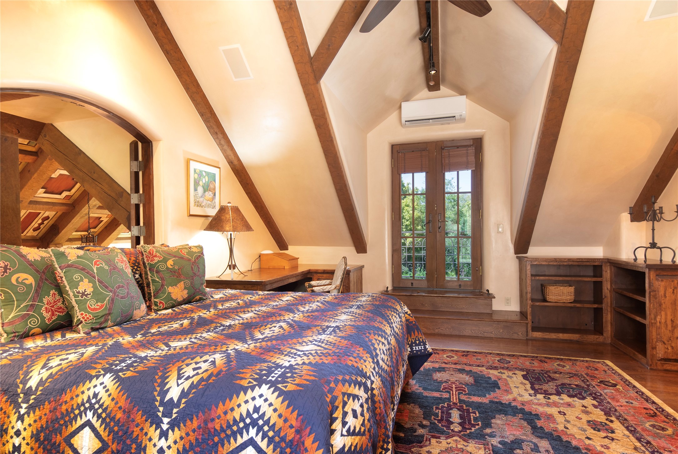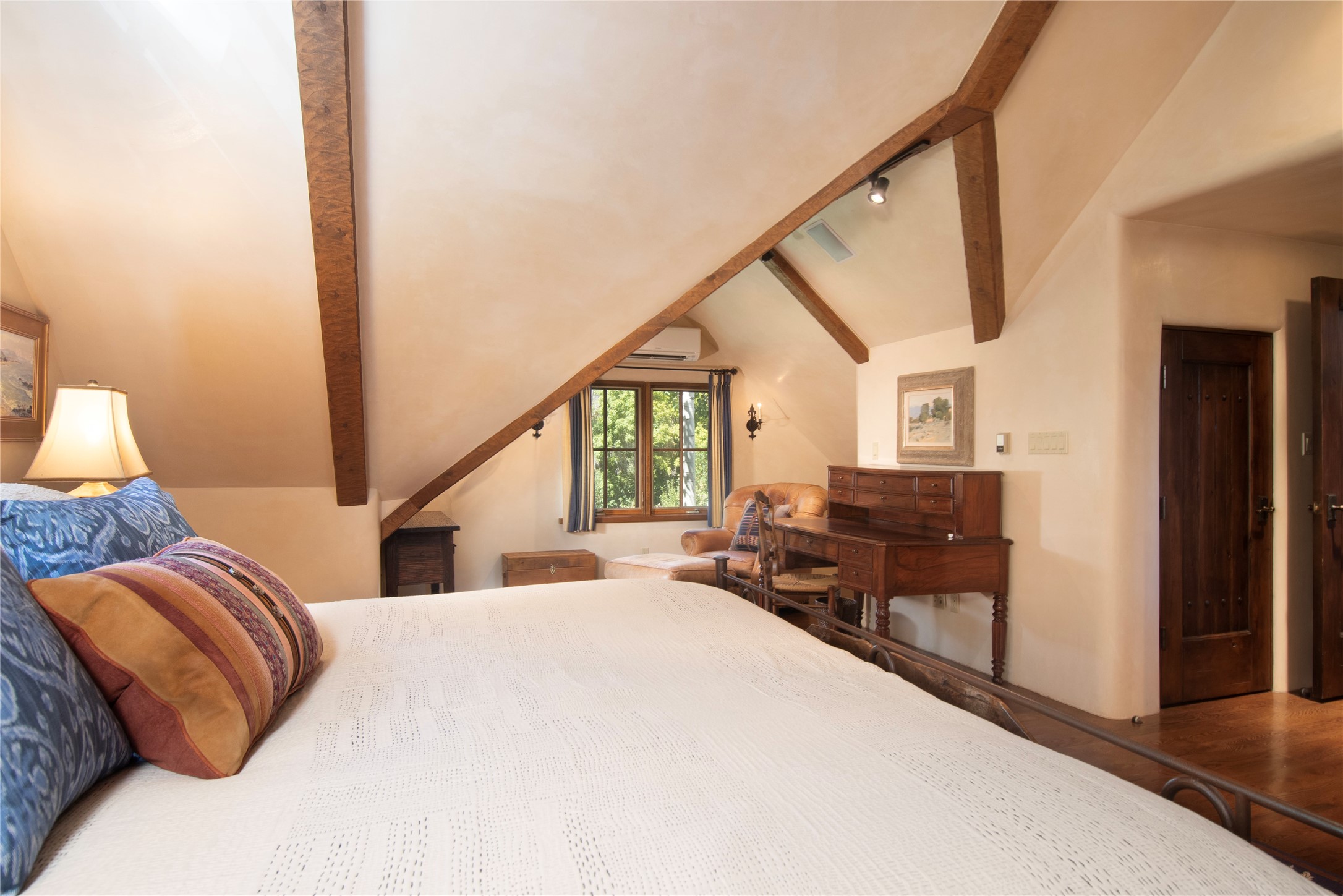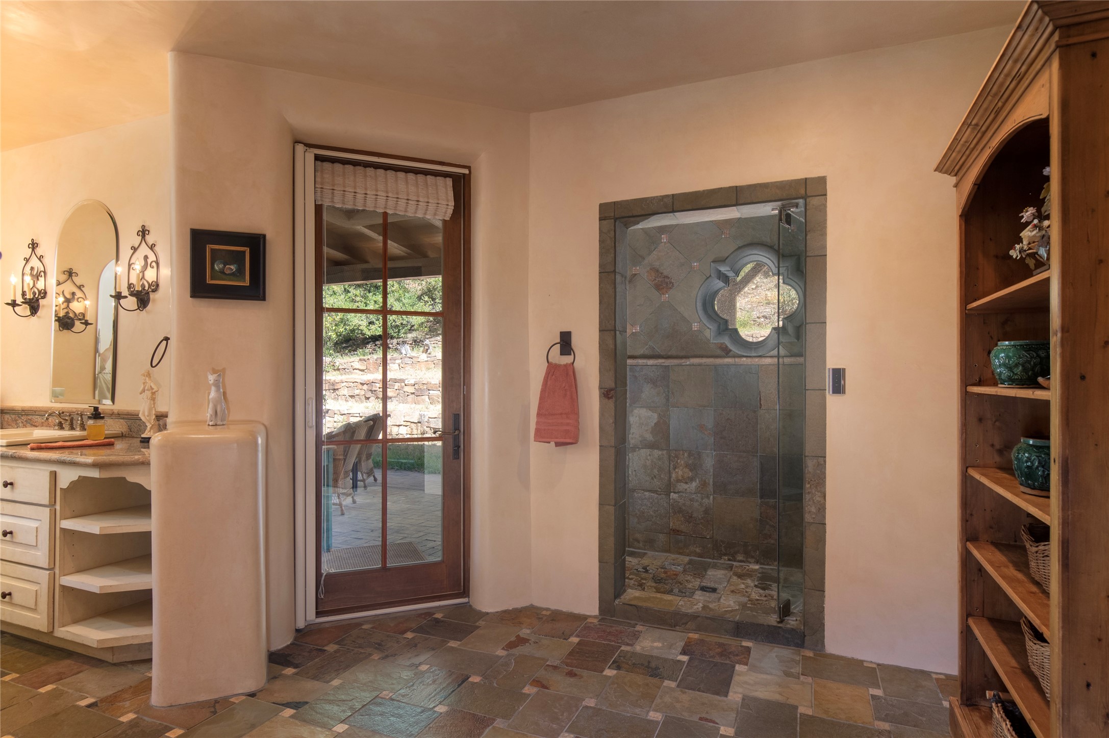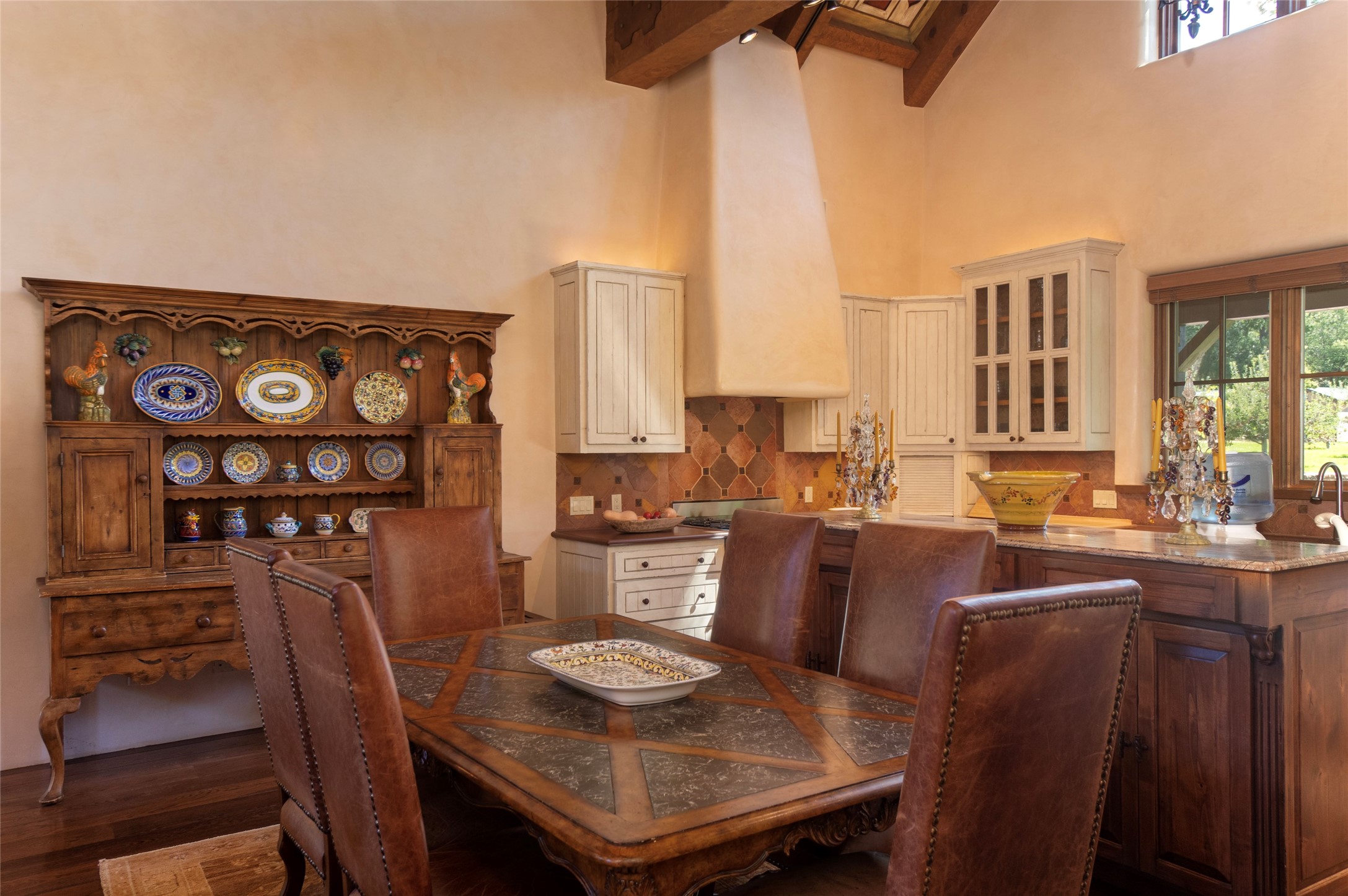 Designer David Naylor and architects Colin Keegan and Larry Andren have brought this remarkable Northern New Mexico style home to life. Featured in designer David Naylor's book "Old World Interiors - A Modern Interpretation," this home is a stunning tribute to craftsmanship and is unique in every way. The standing seam pitched roof and wrap around portal accent the architectural style. The kitchen, with excellent quality appliances and an abundance of cabinets and counterspace, and the dining room both open to the great room with high, coffered ceilings and stone fireplace. The main suite to the right of the entry hall on the first floor has a walk-in closet with built-in cabinets. The good-sized bathroom has natural stone floors, shower, jetted tub, two sinks and a water closet. French doors on either side of the bedroom lead to the wraparound portal. A sparkling blue swimming pool with waterfall feature and spa are near the master, and an outdoor shower is conveniently located just outside. The upstairs is divided into two loft sections with each having its own stairway. The stairway to the left loft leads up to a sitting room featuring a balcony. This loft has a good-sized bedroom, with a 3/4 bath. The right loft features two ensuite bedrooms and each with a balcony. One bedroom has a study with built-in bookshelves. From upstairs it is easy to view this well-maintained property: Bishop Lamy lilac bushes, a vegetable garden, the labyrinth. There are terraces and gardens, and even an organic apple orchard (plus pear, apricot and plum)! Two acequias run through the property and there is a well on each of the two legal lots. Some land overlooks the Tesuque River and abuts the Santa Fe National Forest. Completely private, this home is just minutes to town. Built from Rastra, an energy efficient and very strong material, this property is simply magnificent in every way.