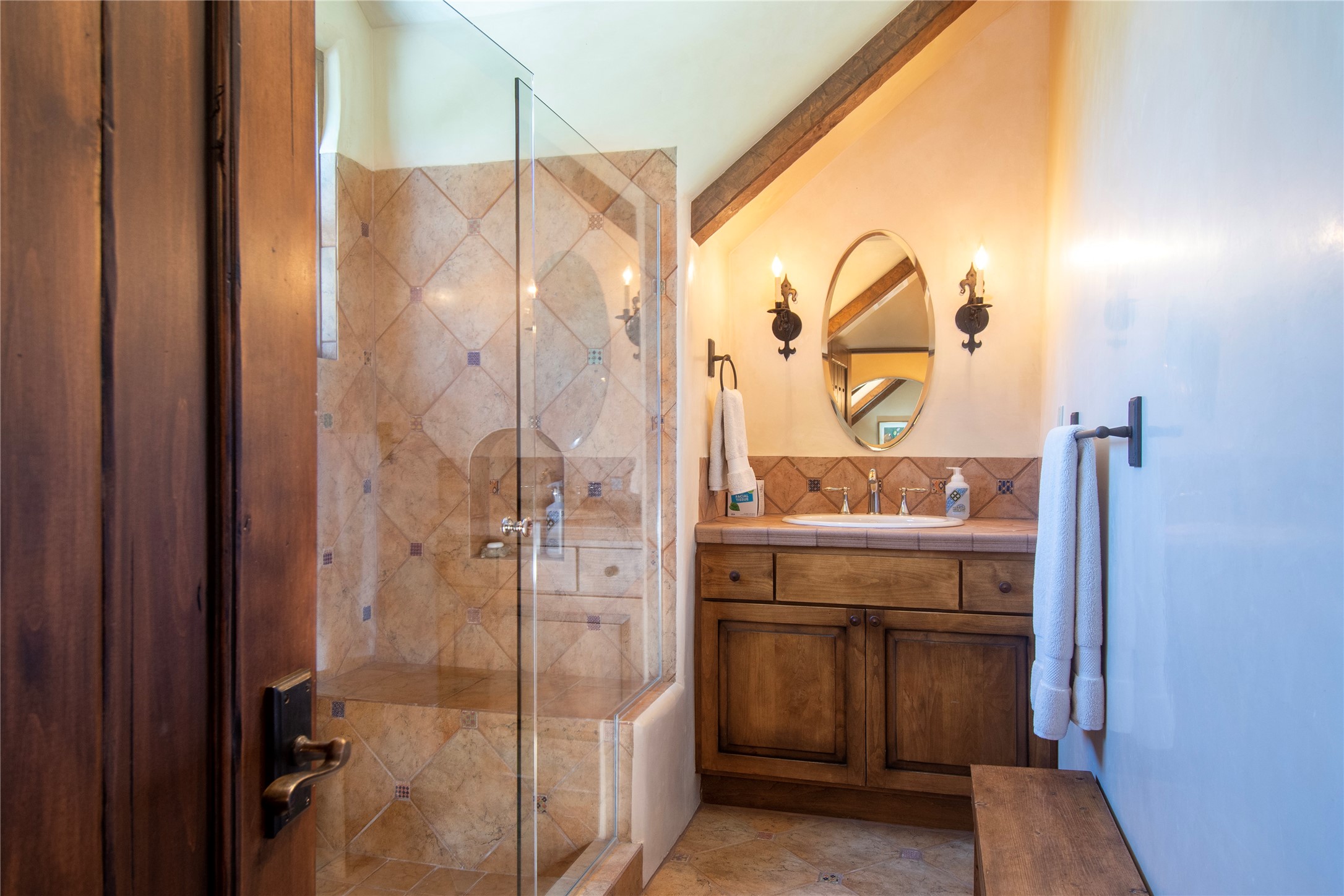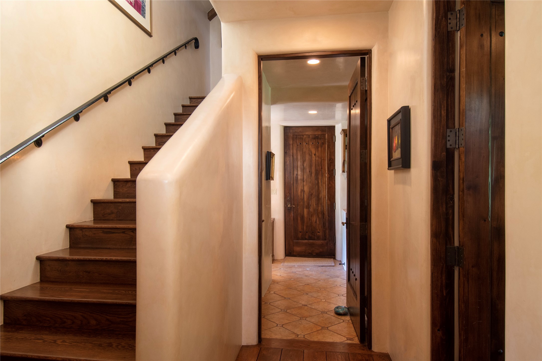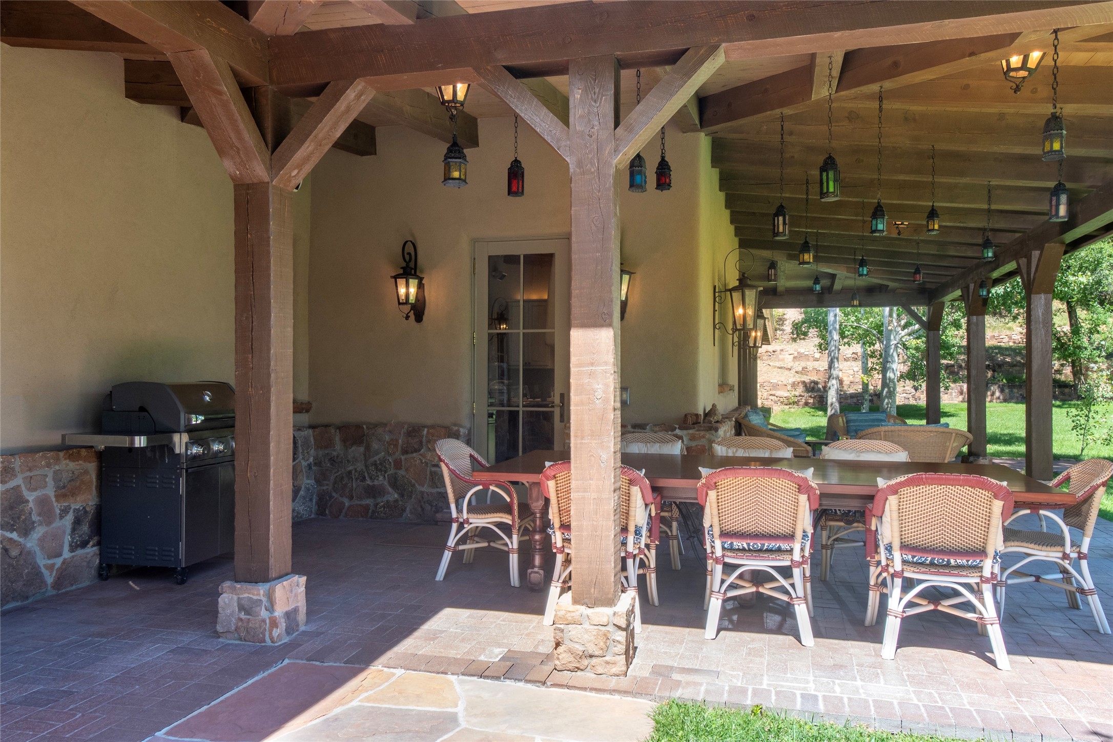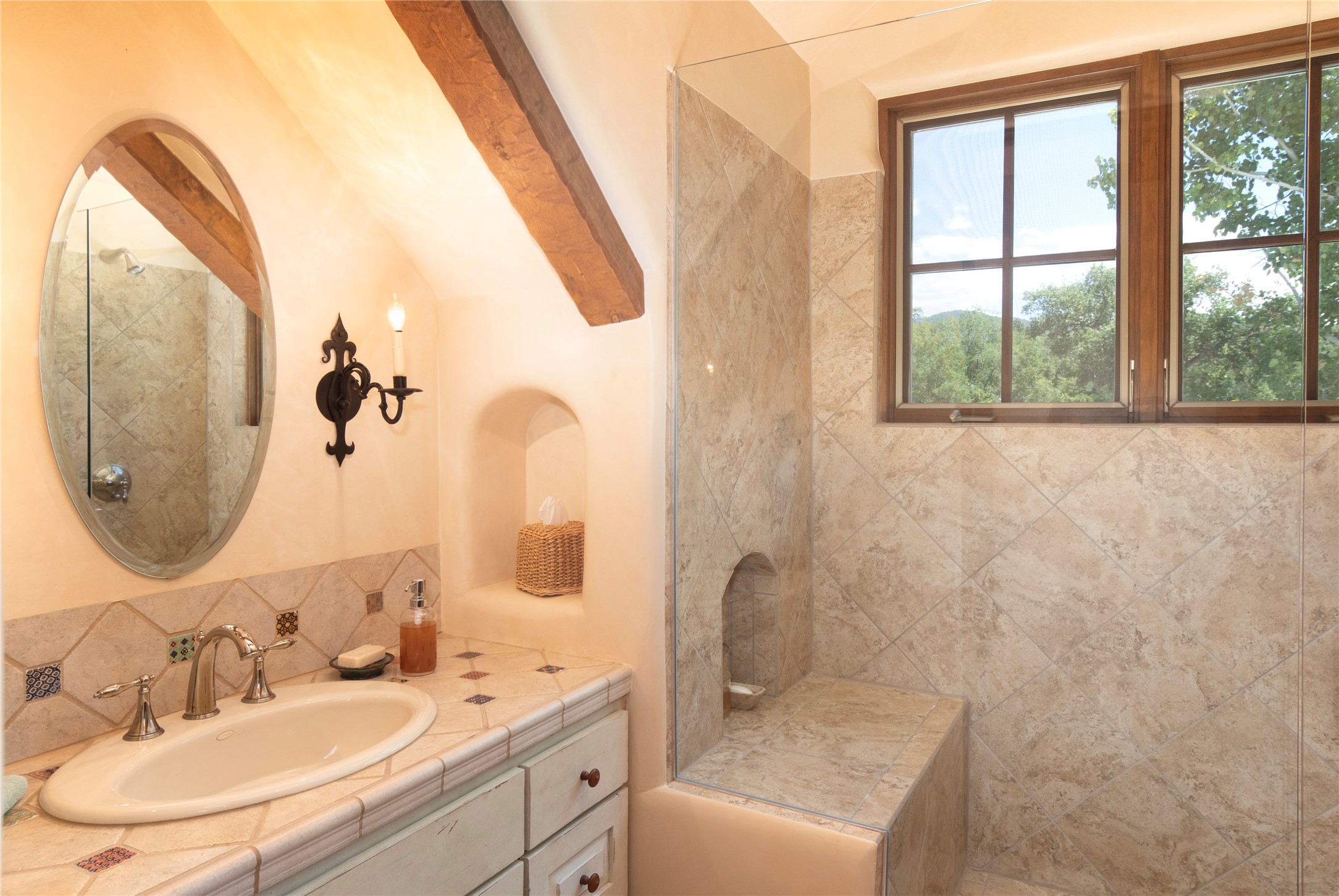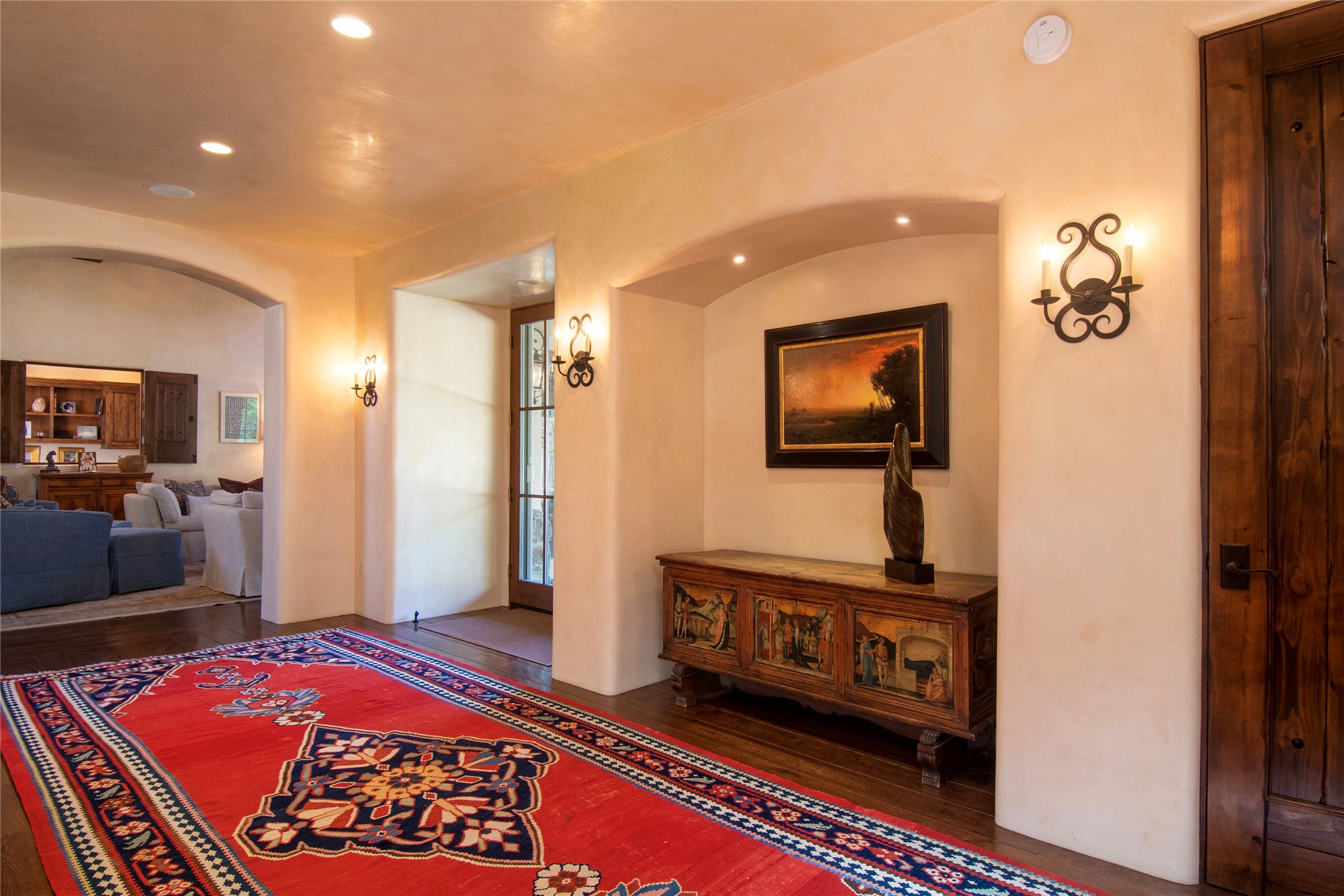 Designer David Naylor and architects Colin Keegan and Larry Andren have brought this remarkable Northern New Mexico style home to life. Featured in designer David Naylor's book "Old World Interiors - A Modern Interpretation," this home is a stunning tribute to craftsmanship and is unique in every way. The standing seam pitched roof and wrap around portal accent the architectural style. The kitchen, with excellent quality appliances and an abundance of cabinets and counterspace, and the dining room both open to the great room with high, coffered ceilings and stone fireplace. The main suite to the right of the entry hall on the first floor has a walk-in closet with built-in cabinets. The good-sized bathroom has natural stone floors, shower, jetted tub, two sinks and a water closet. French doors on either side of the bedroom lead to the wraparound portal. A sparkling blue swimming pool with waterfall feature and spa are near the master, and an outdoor shower is conveniently located just outside. The upstairs is divided into two loft sections with each having its own stairway. The stairway to the left loft leads up to a sitting room featuring a balcony. This loft has a good-sized bedroom, with a 3/4 bath. The right loft features two ensuite bedrooms and each with a balcony. One bedroom has a study with built-in bookshelves. From upstairs it is easy to view this well-maintained property: Bishop Lamy lilac bushes, a vegetable garden, the labyrinth. There are terraces and gardens, and even an organic apple orchard (plus pear, apricot and plum)! Two acequias run through the property and there is a well on each of the two legal lots. Some land overlooks the Tesuque River and abuts the Santa Fe National Forest. Completely private, this home is just minutes to town. Built from Rastra, an energy efficient and very strong material, this property is simply magnificent in every way.