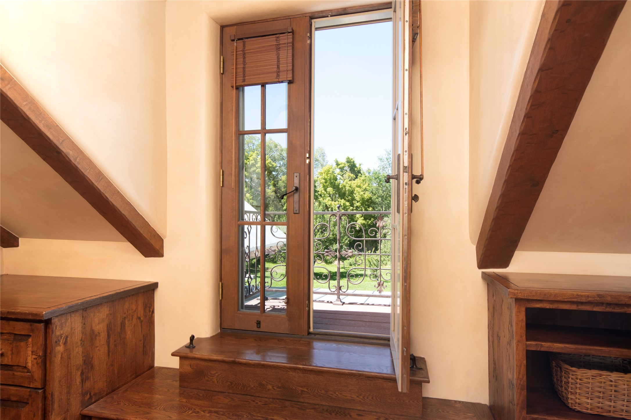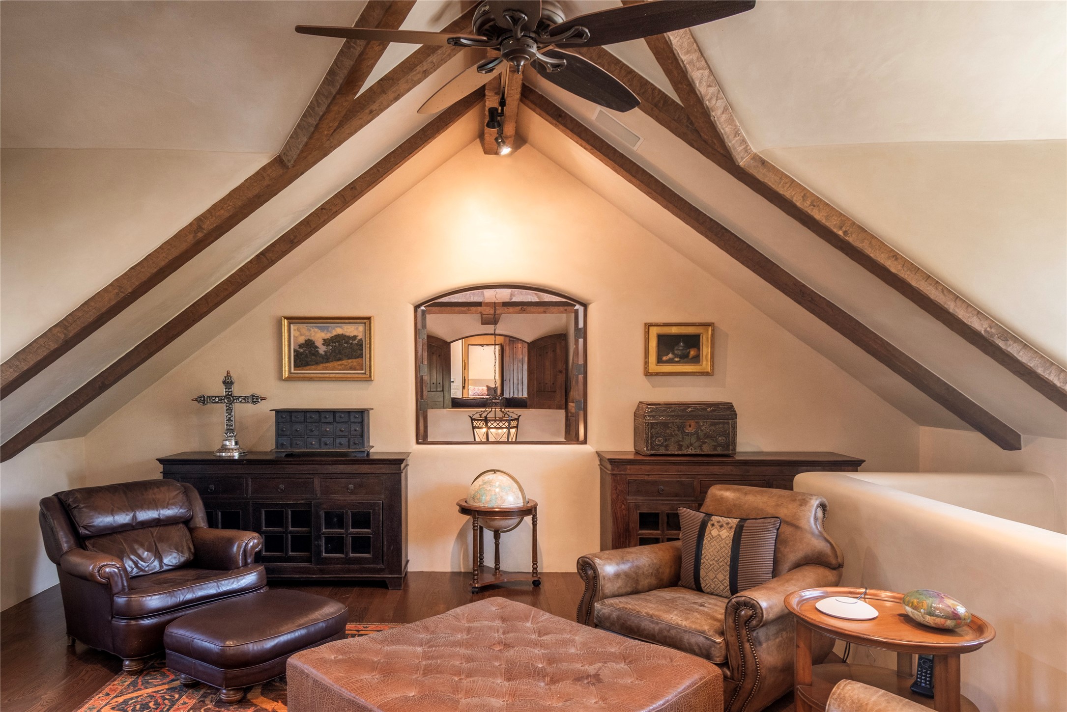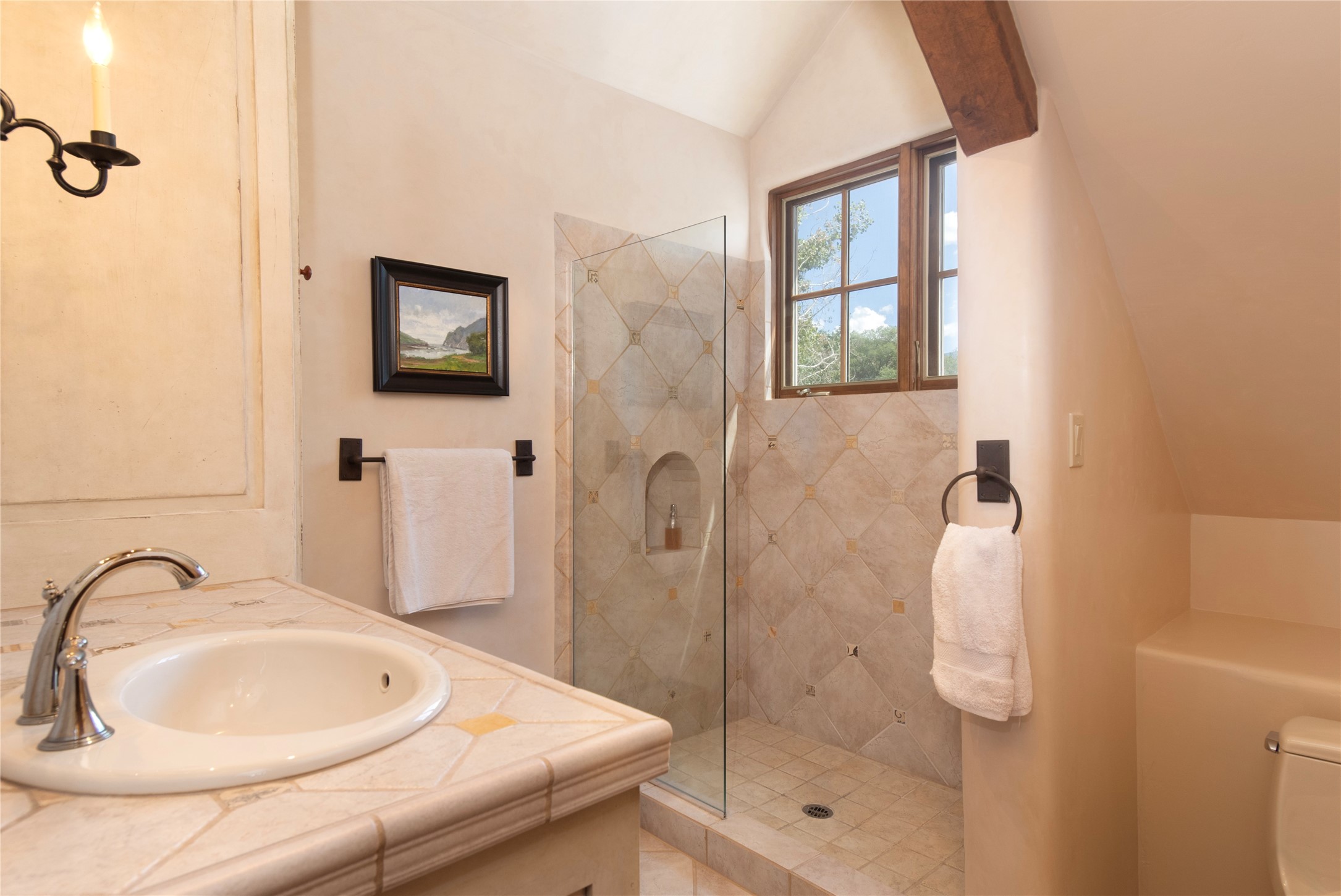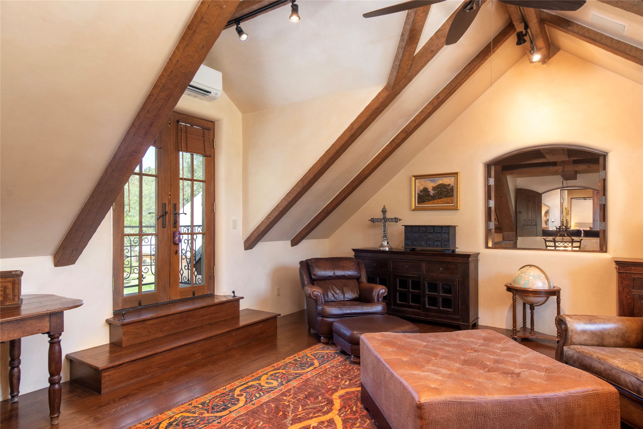 Designer David Naylor and architects Colin Keegan and Larry Andren have brought this remarkable Northern New Mexico style home to life. Featured in designer David Naylor's book "Old World Interiors - A Modern Interpretation," this home is a stunning tribute to craftsmanship and is unique in every way. The standing seam pitched roof and wrap around portal accent the architectural style. The kitchen, with excellent quality appliances and an abundance of cabinets and counterspace, and the dining room both open to the great room with high, coffered ceilings and stone fireplace. The main suite to the right of the entry hall on the first floor has a walk-in closet with built-in cabinets. The good-sized bathroom has natural stone floors, shower, jetted tub, two sinks and a water closet. French doors on either side of the bedroom lead to the wraparound portal. A sparkling blue swimming pool with waterfall feature and spa are near the master, and an outdoor shower is conveniently located just outside. The upstairs is divided into two loft sections with each having its own stairway. The stairway to the left loft leads up to a sitting room featuring a balcony. This loft has a good-sized bedroom, with a 3/4 bath. The right loft features two ensuite bedrooms and each with a balcony. One bedroom has a study with built-in bookshelves. From upstairs it is easy to view this well-maintained property: Bishop Lamy lilac bushes, a vegetable garden, the labyrinth. There are terraces and gardens, and even an organic apple orchard (plus pear, apricot and plum)! Two acequias run through the property and there is a well on each of the two legal lots. Some land overlooks the Tesuque River and abuts the Santa Fe National Forest. Completely private, this home is just minutes to town. Built from Rastra, an energy efficient and very strong material, this property is simply magnificent in every way.