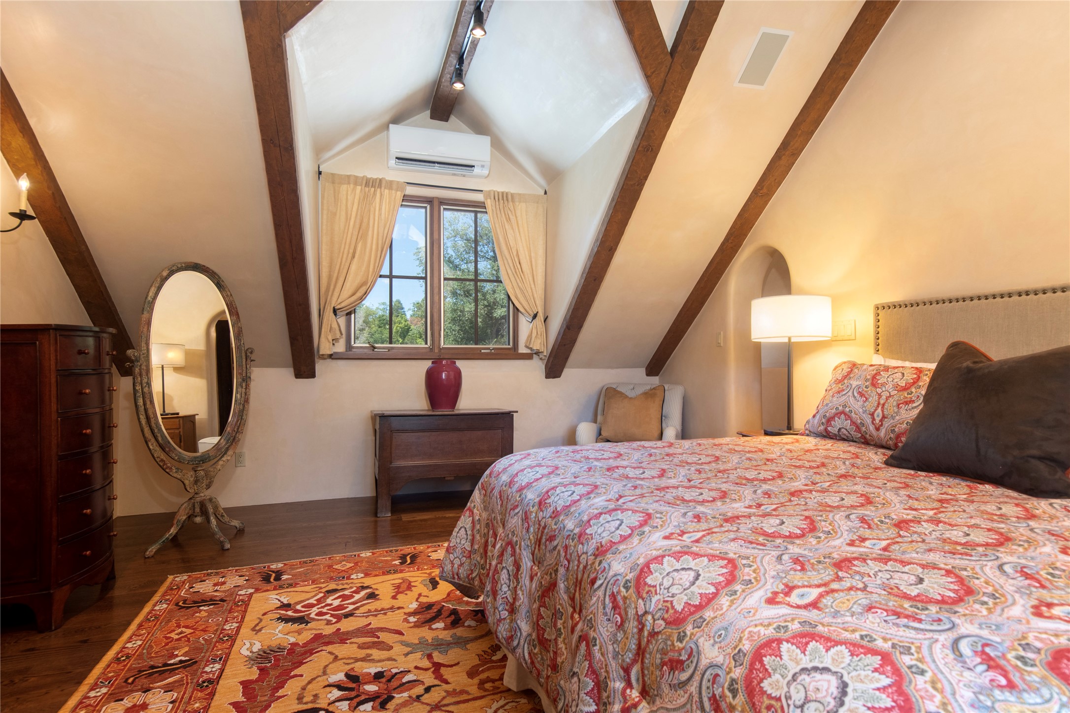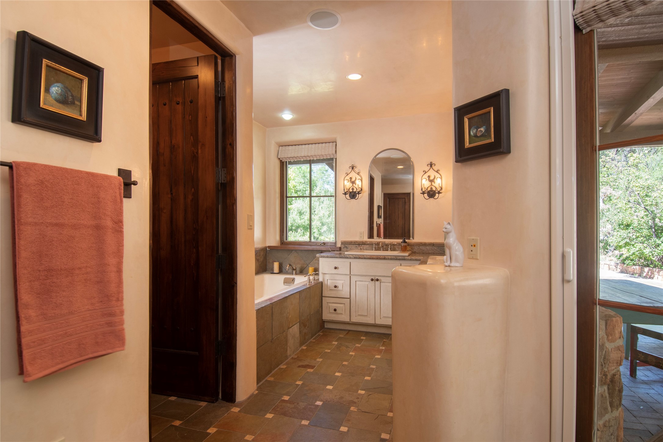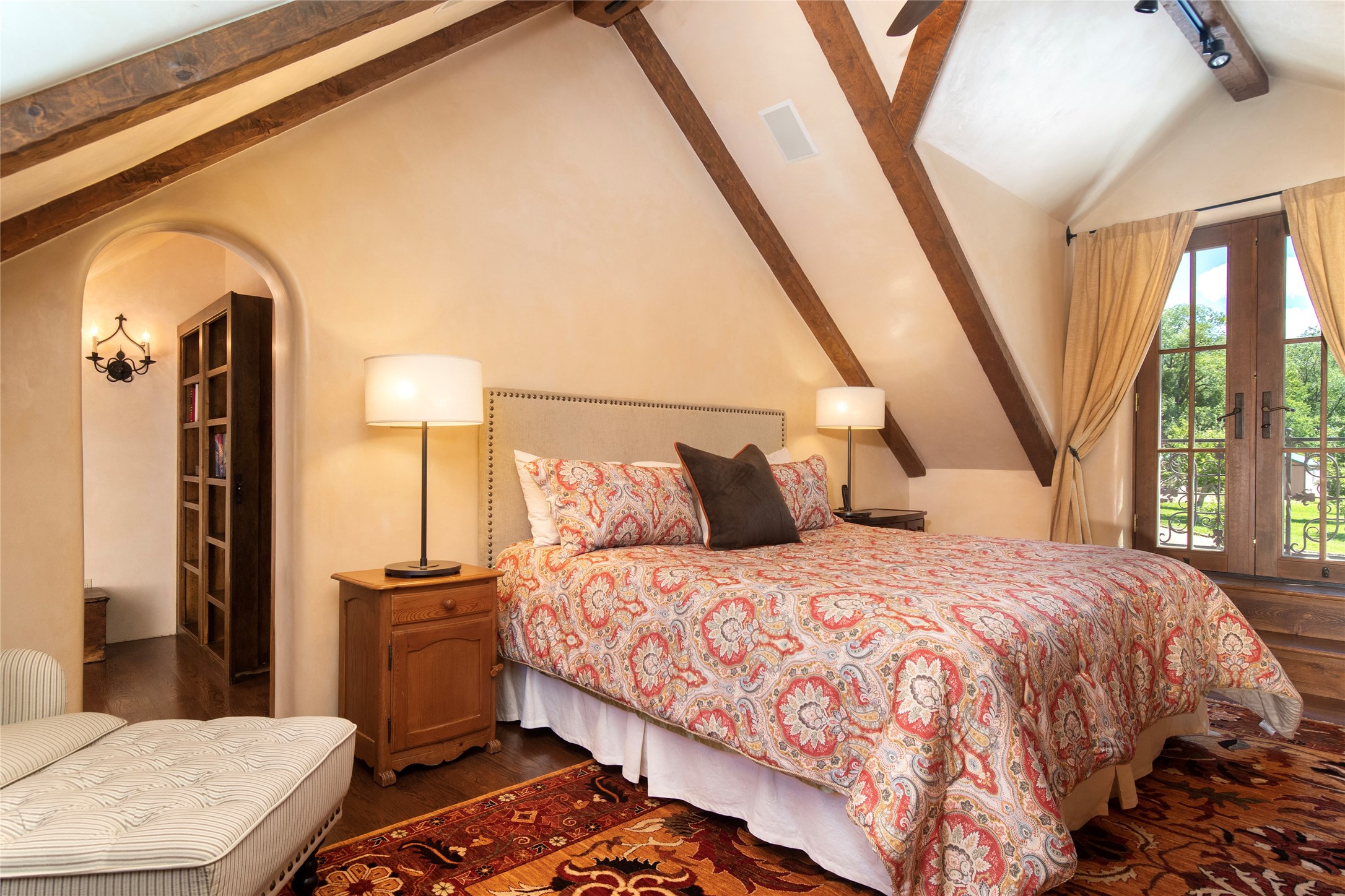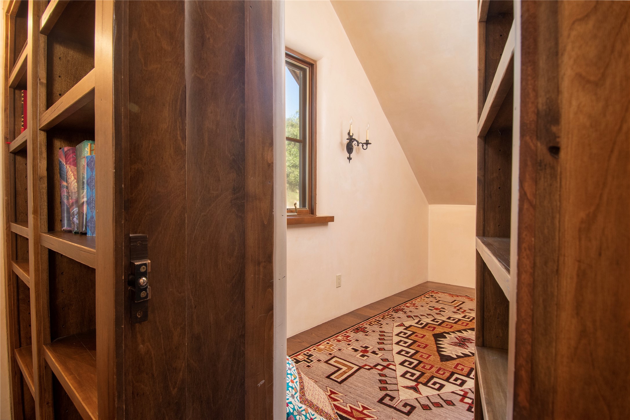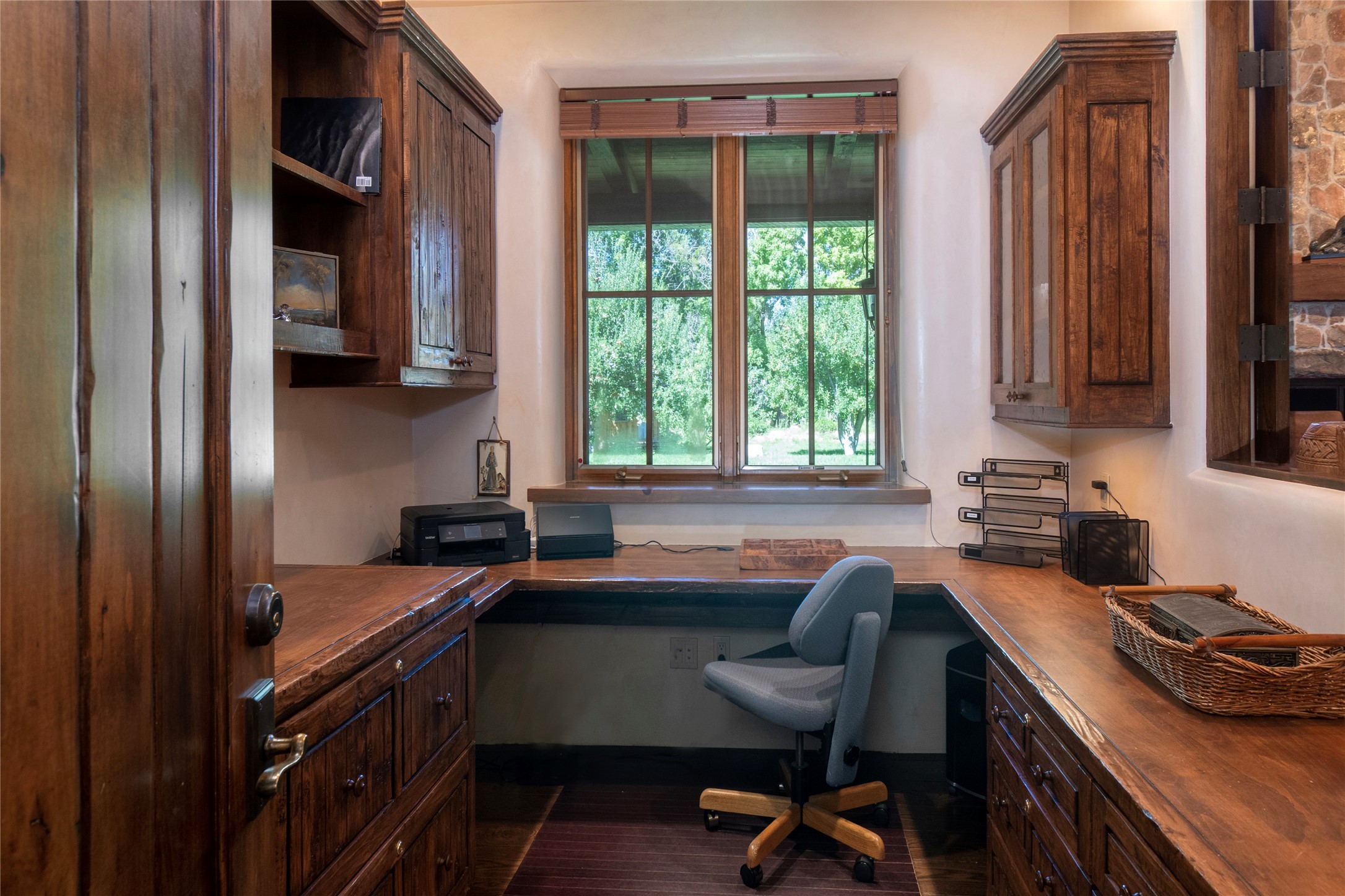 Designer David Naylor and architects Colin Keegan and Larry Andren have brought this remarkable Northern New Mexico style home to life. Featured in designer David Naylor's book "Old World Interiors - A Modern Interpretation," this home is a stunning tribute to craftsmanship and is unique in every way. The standing seam pitched roof and wrap around portal accent the architectural style. The kitchen, with excellent quality appliances and an abundance of cabinets and counterspace, and the dining room both open to the great room with high, coffered ceilings and stone fireplace. The main suite to the right of the entry hall on the first floor has a walk-in closet with built-in cabinets. The good-sized bathroom has natural stone floors, shower, jetted tub, two sinks and a water closet. French doors on either side of the bedroom lead to the wraparound portal. A sparkling blue swimming pool with waterfall feature and spa are near the master, and an outdoor shower is conveniently located just outside. The upstairs is divided into two loft sections with each having its own stairway. The stairway to the left loft leads up to a sitting room featuring a balcony. This loft has a good-sized bedroom, with a 3/4 bath. The right loft features two ensuite bedrooms and each with a balcony. One bedroom has a study with built-in bookshelves. From upstairs it is easy to view this well-maintained property: Bishop Lamy lilac bushes, a vegetable garden, the labyrinth. There are terraces and gardens, and even an organic apple orchard (plus pear, apricot and plum)! Two acequias run through the property and there is a well on each of the two legal lots. Some land overlooks the Tesuque River and abuts the Santa Fe National Forest. Completely private, this home is just minutes to town. Built from Rastra, an energy efficient and very strong material, this property is simply magnificent in every way.