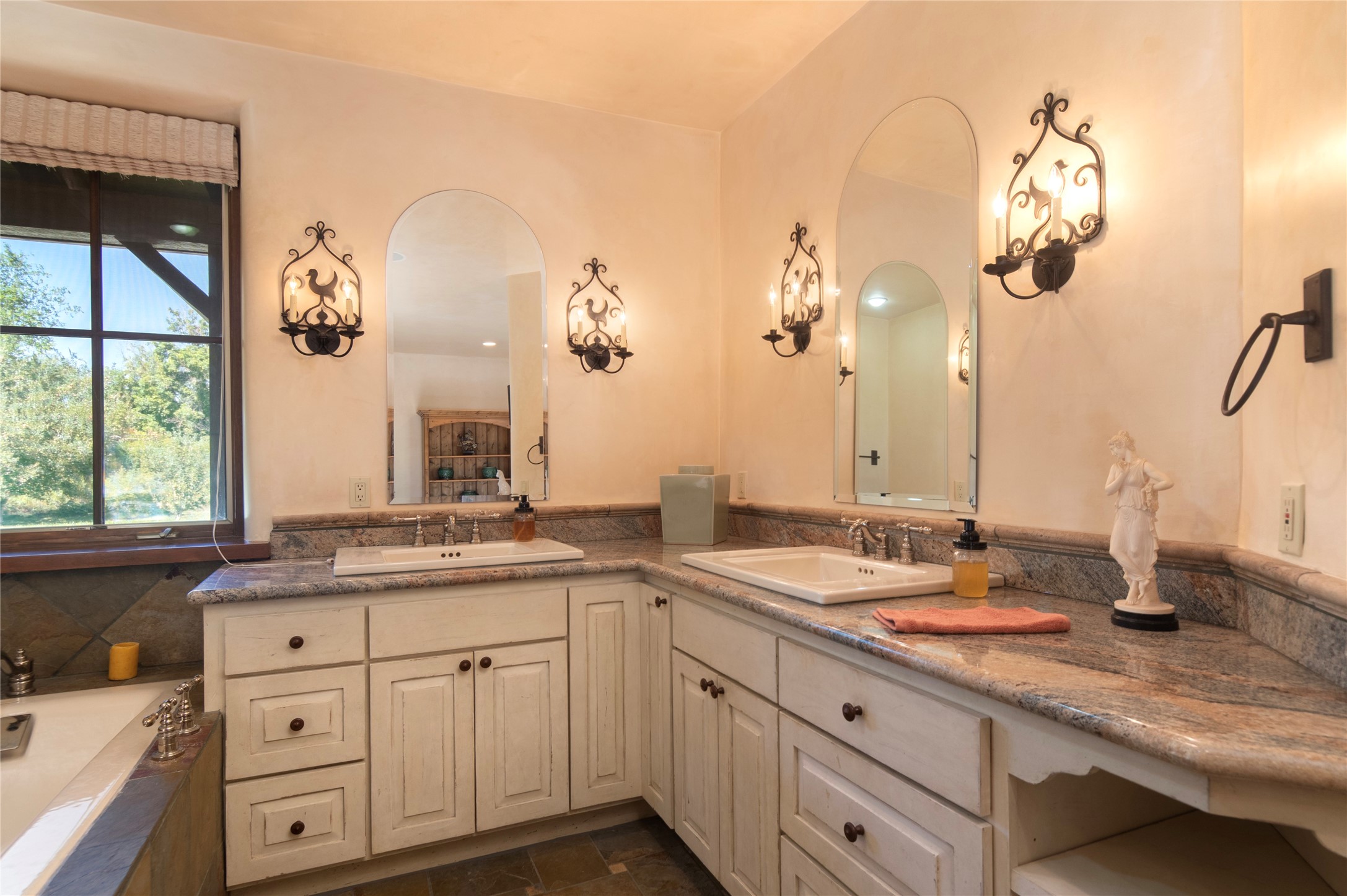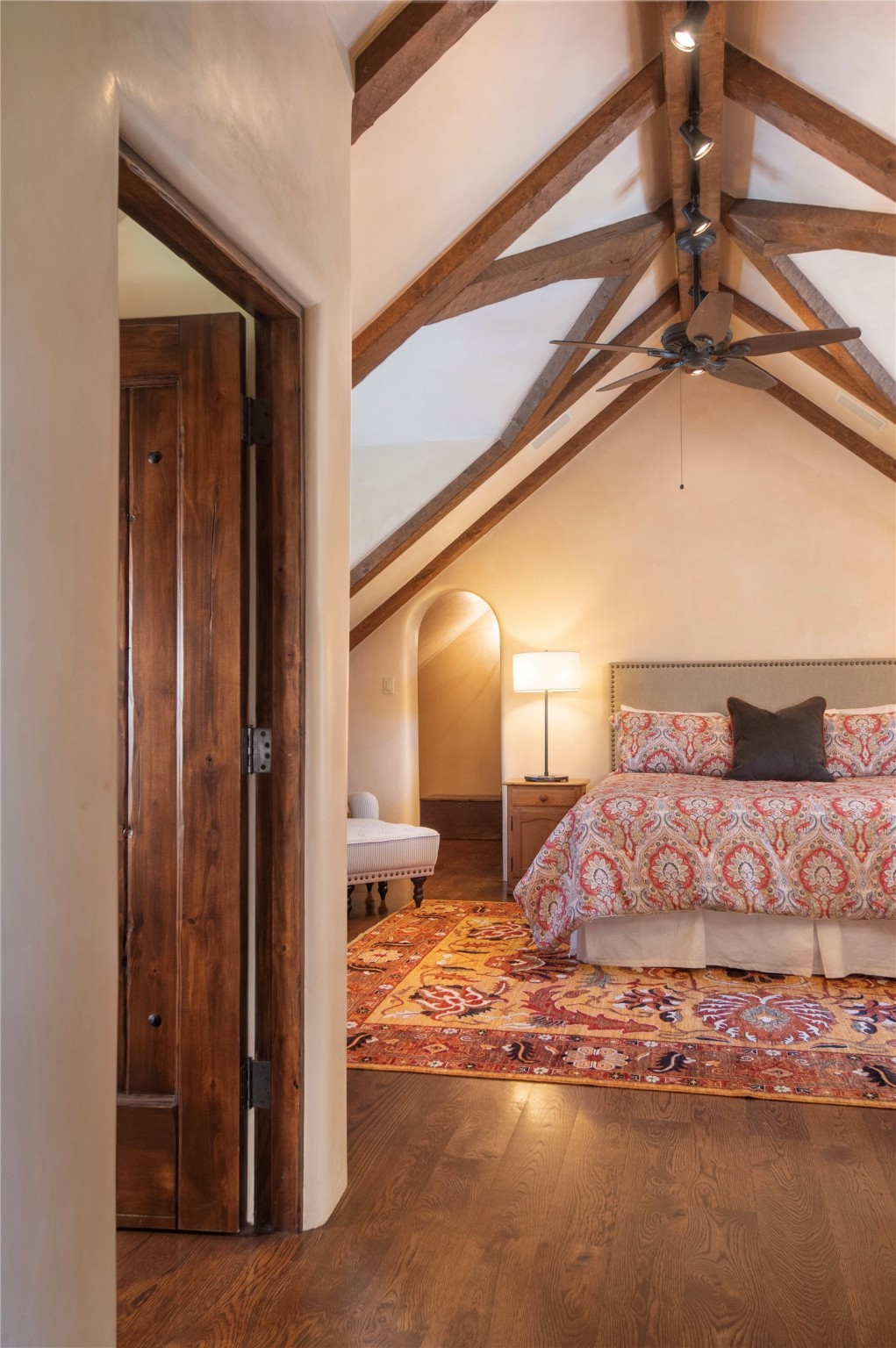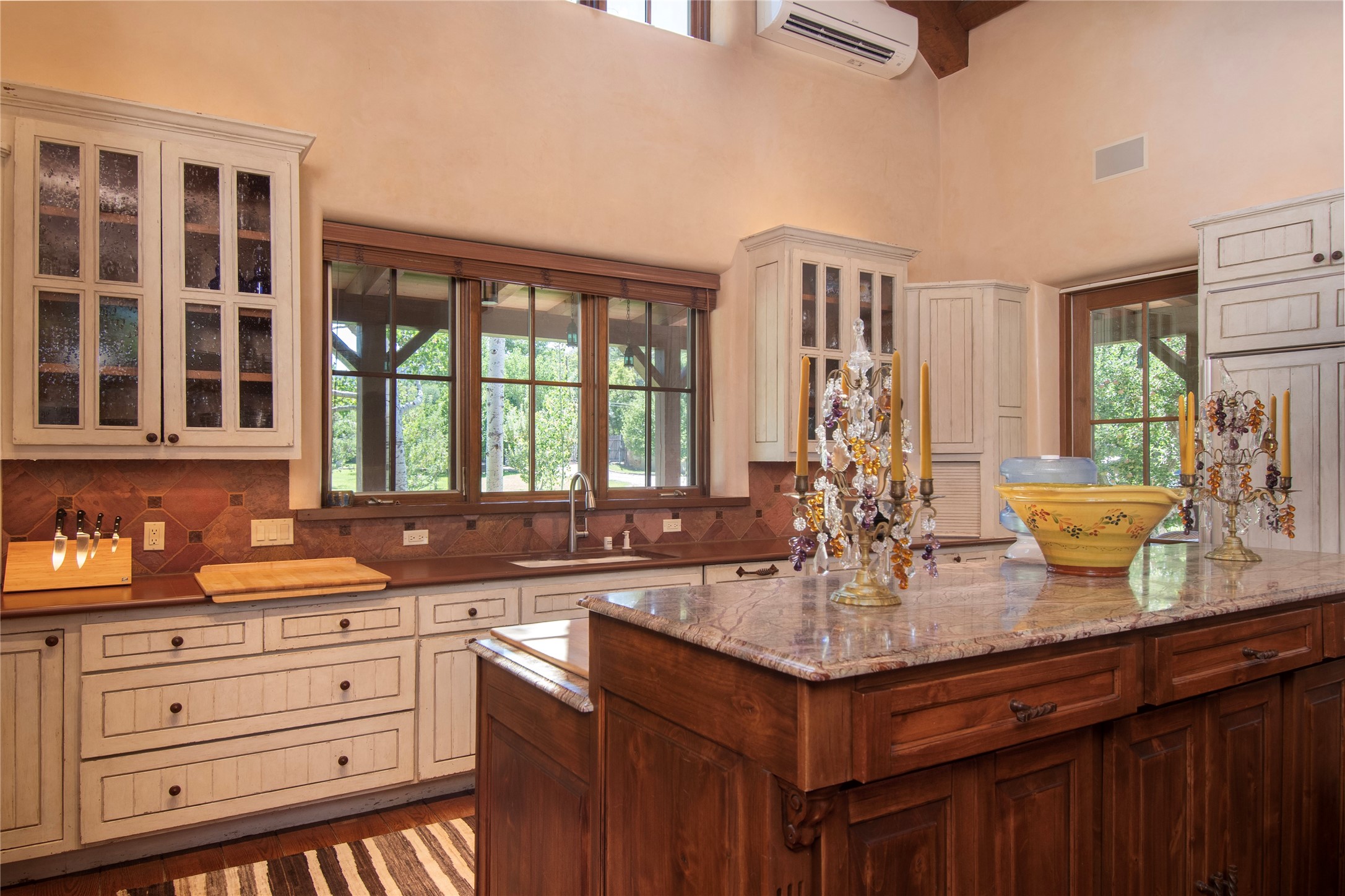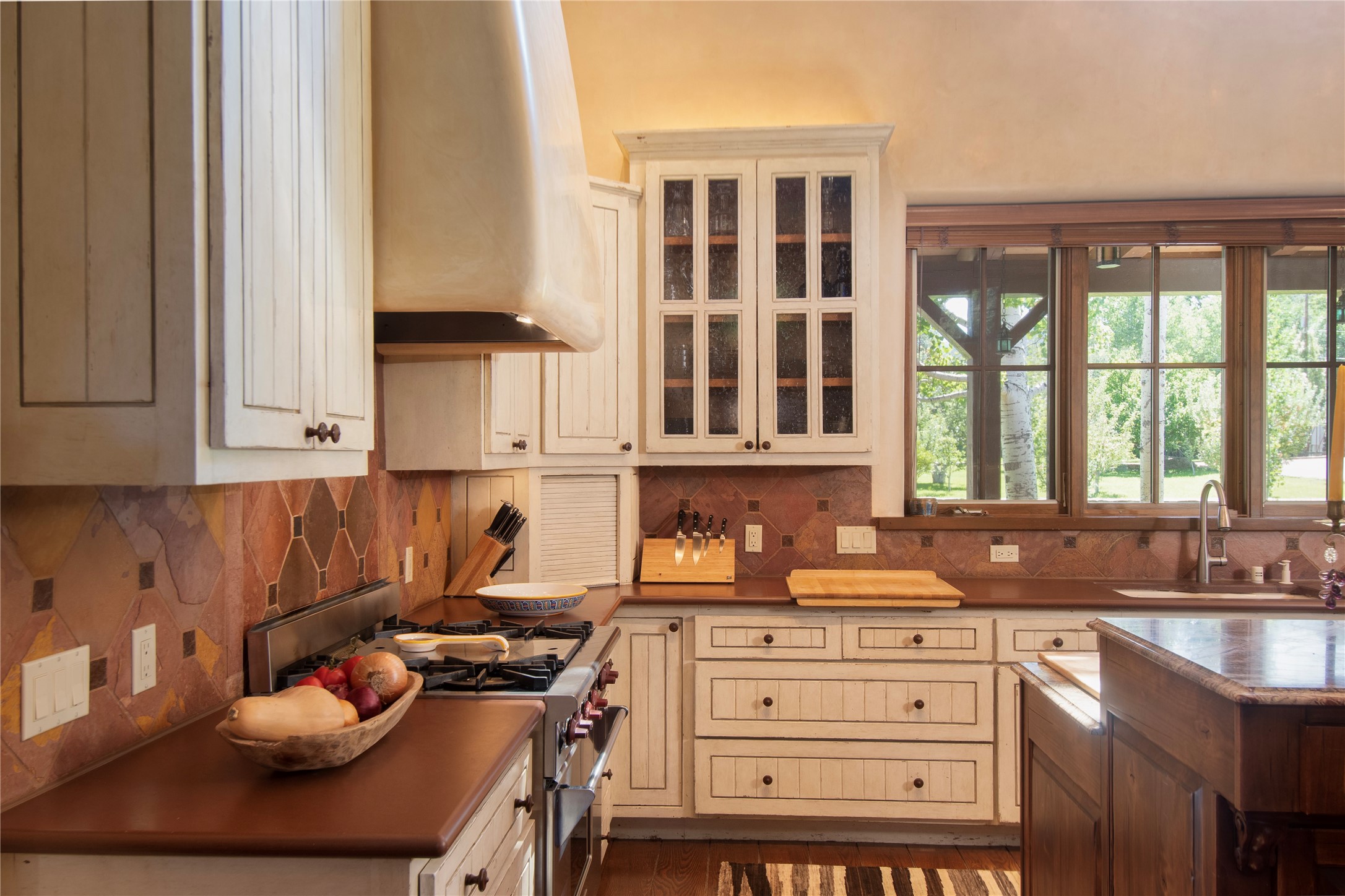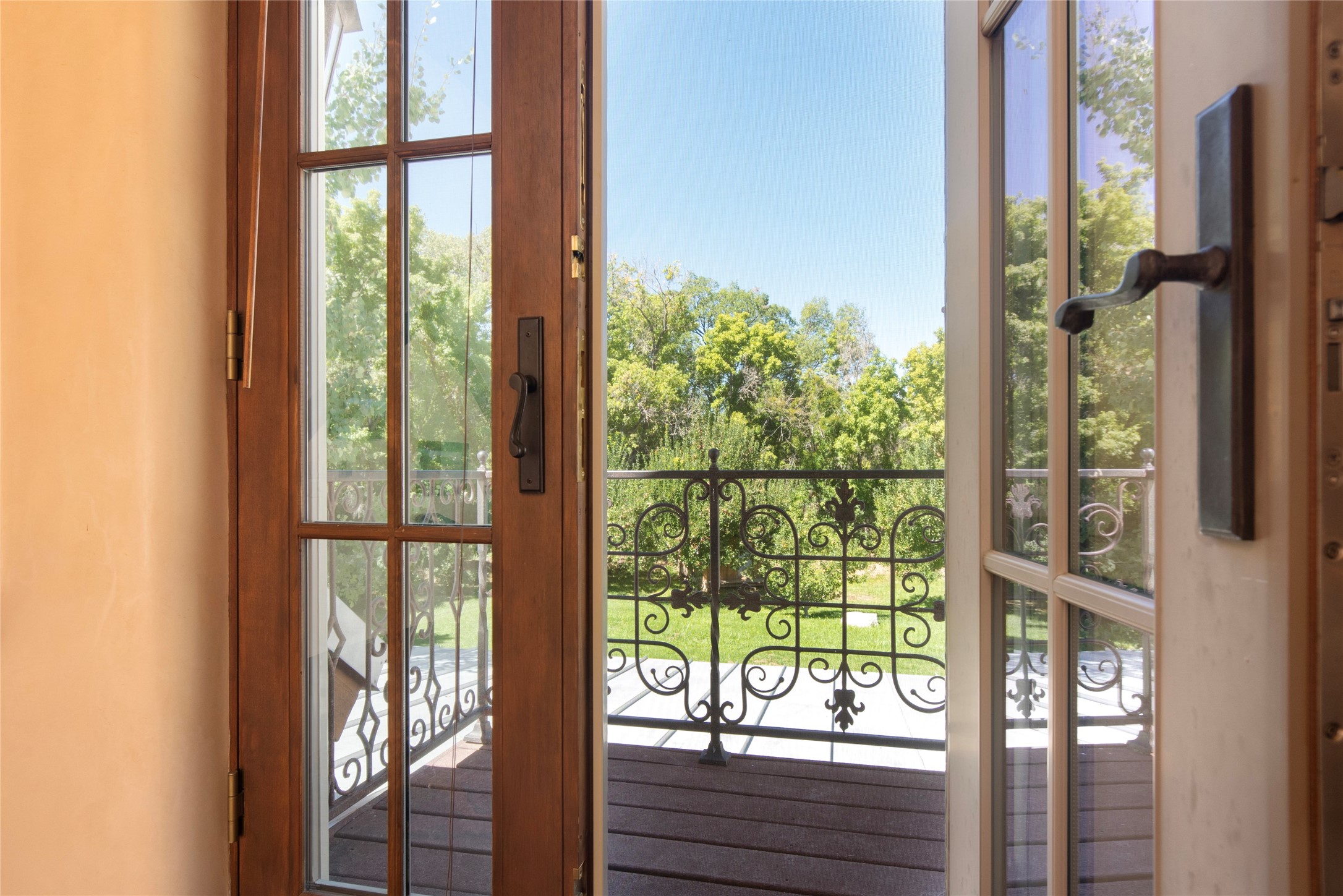 Designer David Naylor and architects Colin Keegan and Larry Andren have brought this remarkable Northern New Mexico style home to life. Featured in designer David Naylor's book "Old World Interiors - A Modern Interpretation," this home is a stunning tribute to craftsmanship and is unique in every way. The standing seam pitched roof and wrap around portal accent the architectural style. The kitchen, with excellent quality appliances and an abundance of cabinets and counterspace, and the dining room both open to the great room with high, coffered ceilings and stone fireplace. The main suite to the right of the entry hall on the first floor has a walk-in closet with built-in cabinets. The good-sized bathroom has natural stone floors, shower, jetted tub, two sinks and a water closet. French doors on either side of the bedroom lead to the wraparound portal. A sparkling blue swimming pool with waterfall feature and spa are near the master, and an outdoor shower is conveniently located just outside. The upstairs is divided into two loft sections with each having its own stairway. The stairway to the left loft leads up to a sitting room featuring a balcony. This loft has a good-sized bedroom, with a 3/4 bath. The right loft features two ensuite bedrooms and each with a balcony. One bedroom has a study with built-in bookshelves. From upstairs it is easy to view this well-maintained property: Bishop Lamy lilac bushes, a vegetable garden, the labyrinth. There are terraces and gardens, and even an organic apple orchard (plus pear, apricot and plum)! Two acequias run through the property and there is a well on each of the two legal lots. Some land overlooks the Tesuque River and abuts the Santa Fe National Forest. Completely private, this home is just minutes to town. Built from Rastra, an energy efficient and very strong material, this property is simply magnificent in every way.