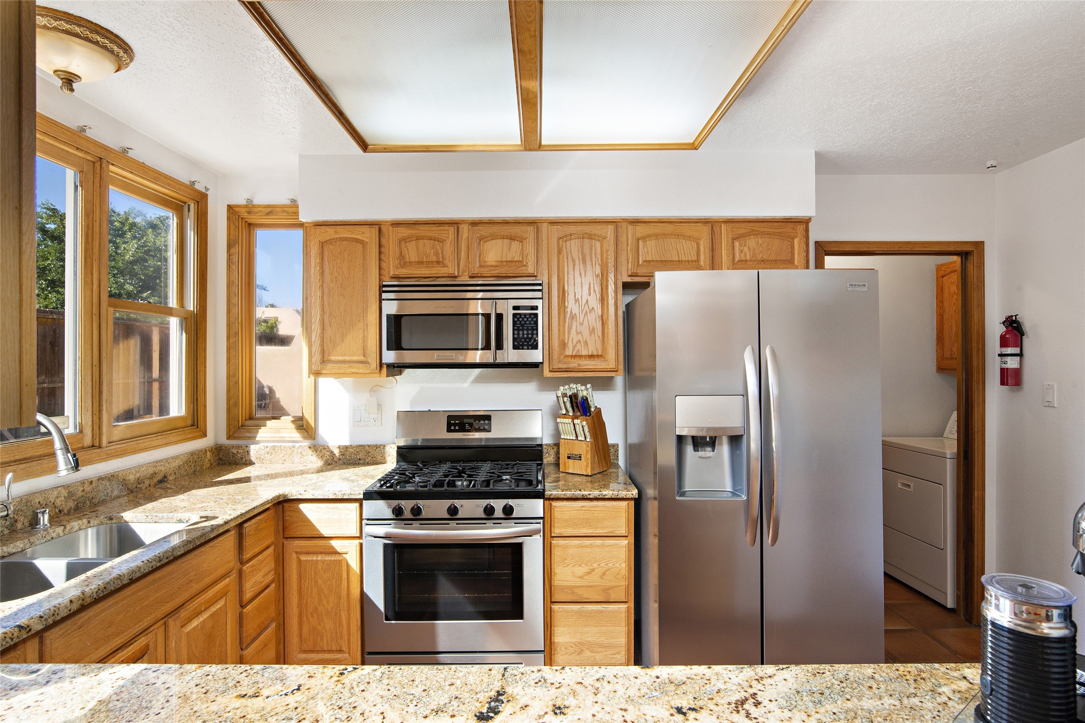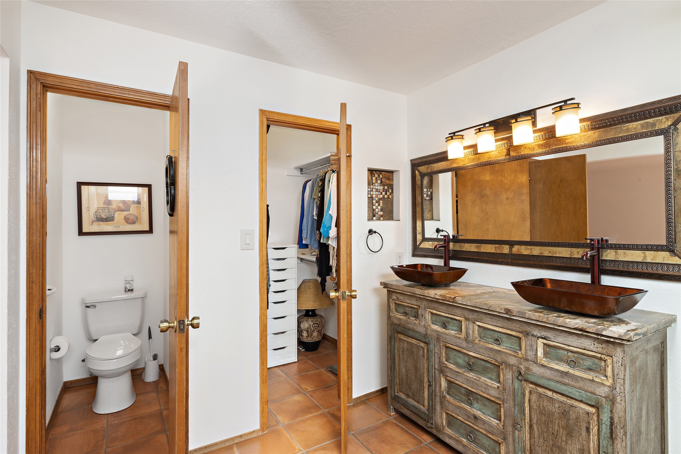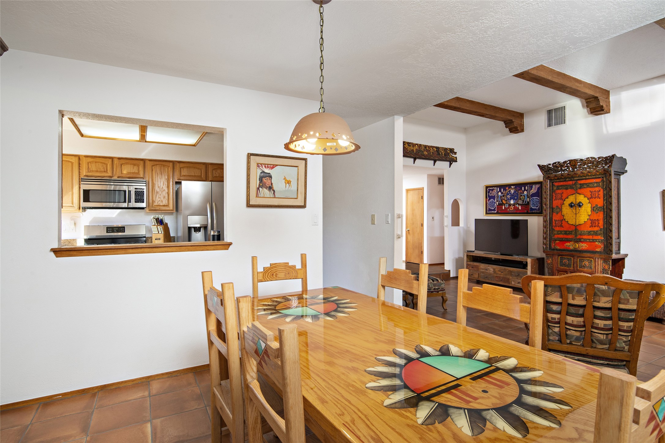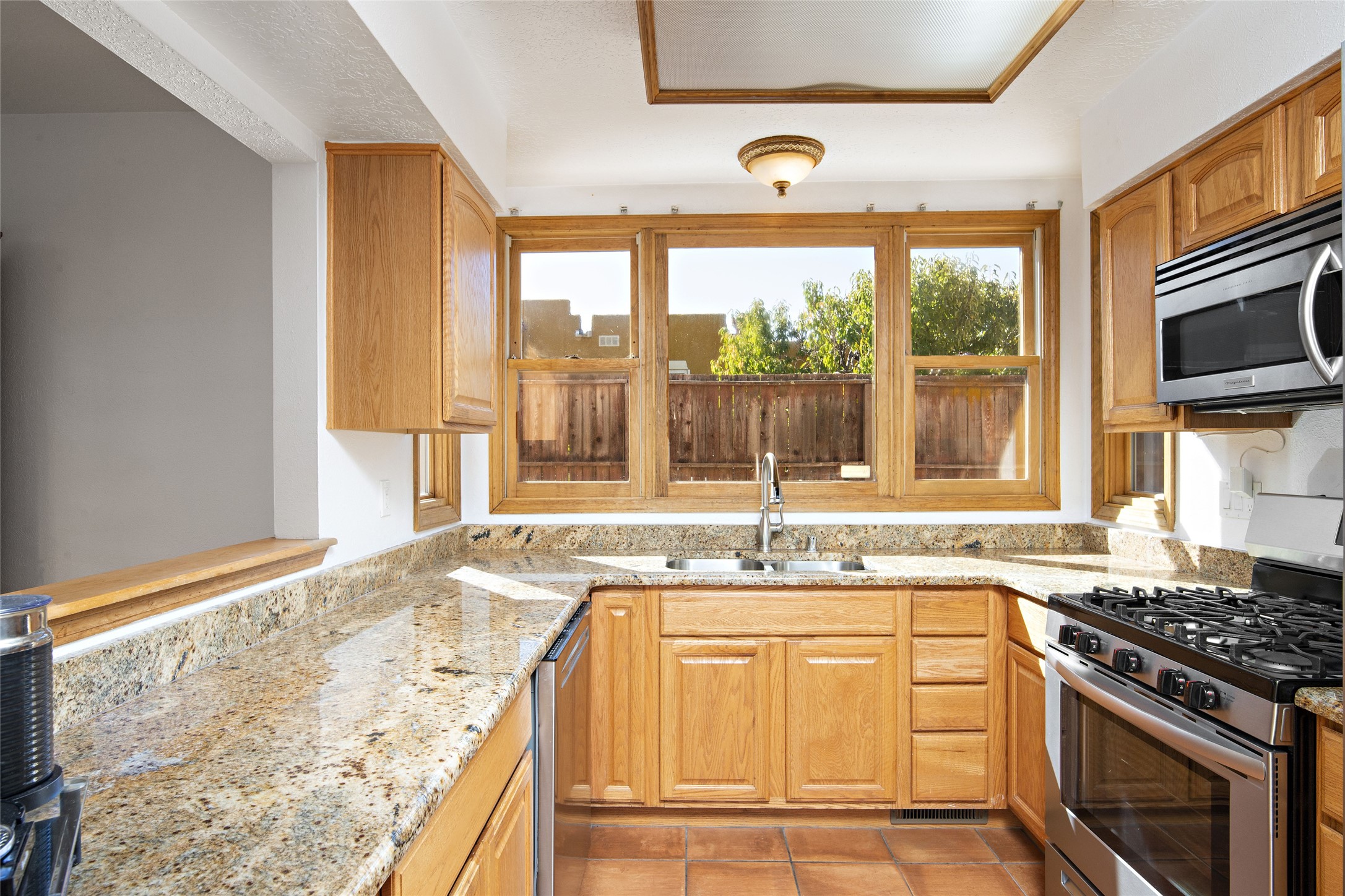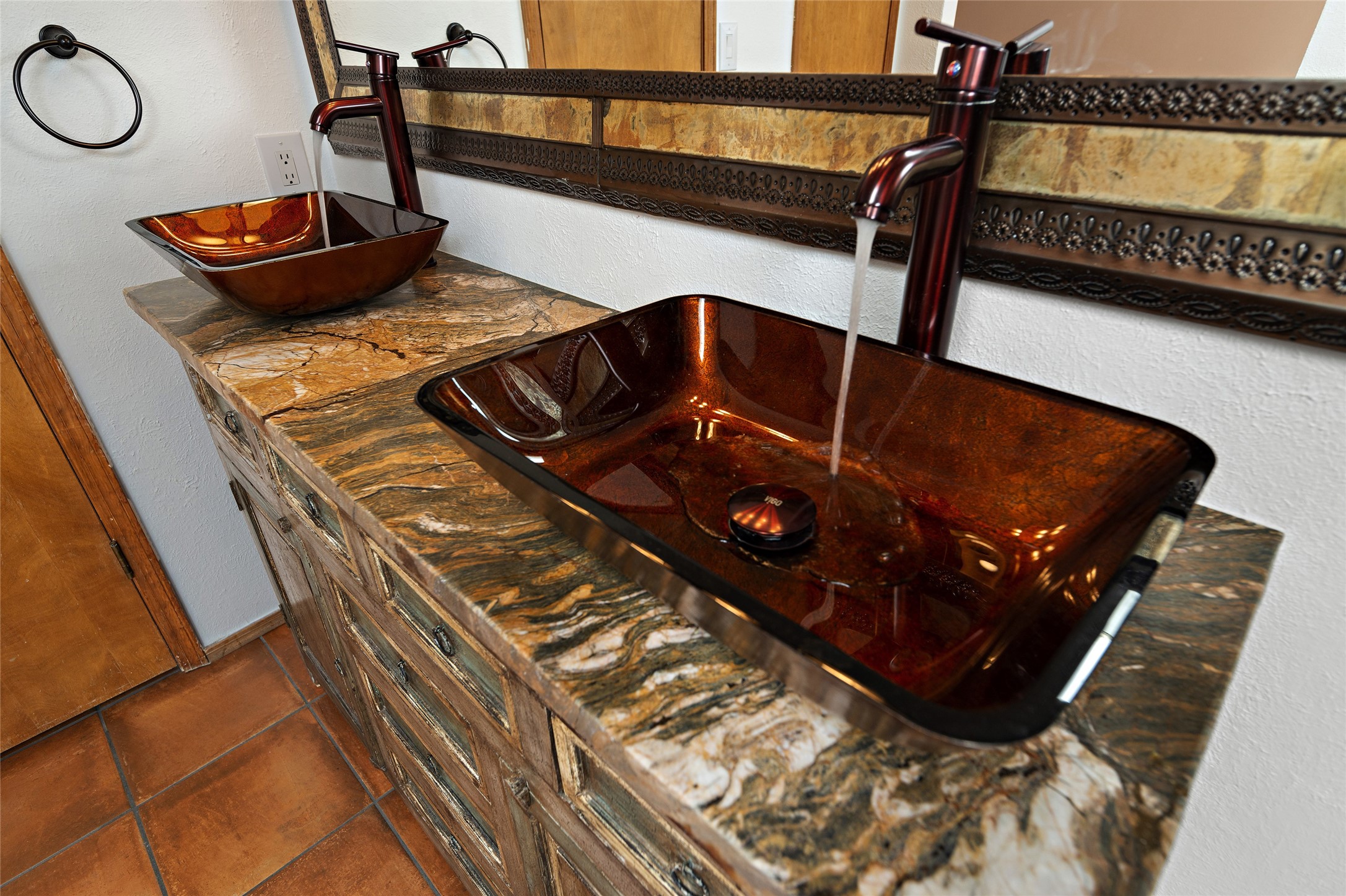 It's a great home if you commute to Los Alamos or Albuquerque. This three-bedroom, two-bathroom, well-cared-for home is on a large lot in a centrally located neighborhood with no HOA. The house has an upgraded Kitchen, and in 2019, the sizeable primary bathroom was beautifully upgraded with two glass bowl sinks, a walk-in shower, and a tub. The house is completely tiled, and the living, sun, dining rooms, and Kitchen flow nicely for entertaining or large gatherings. The garden area in the backyard has been enriched with 100 bags of Black Gold in the two raised garden beds. The fenced backyard is private with many places to enjoy the evenings, entertain, dine alfresco and Bar-B-Que! There is a private walled deck off of the primary bedroom. Take a look!