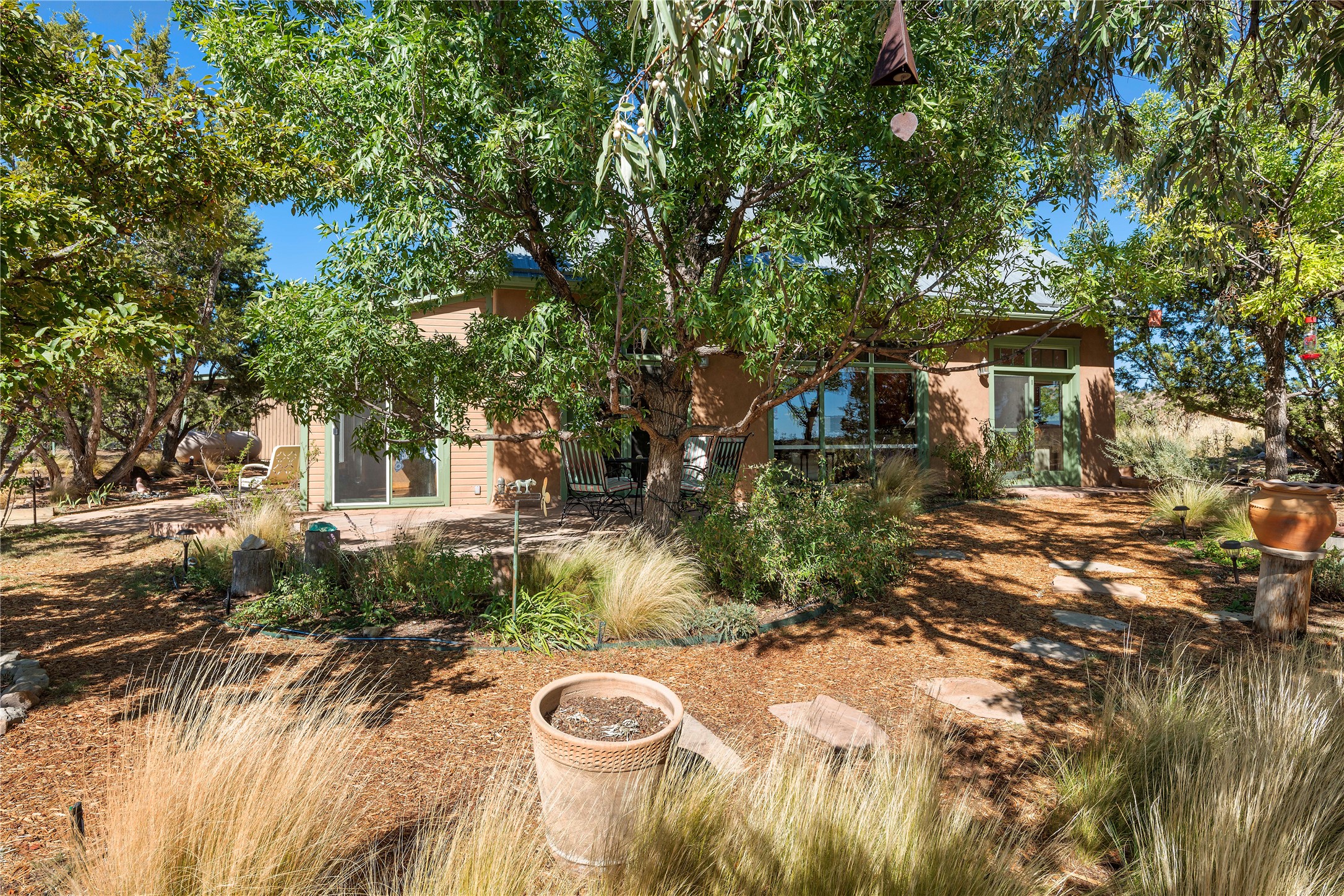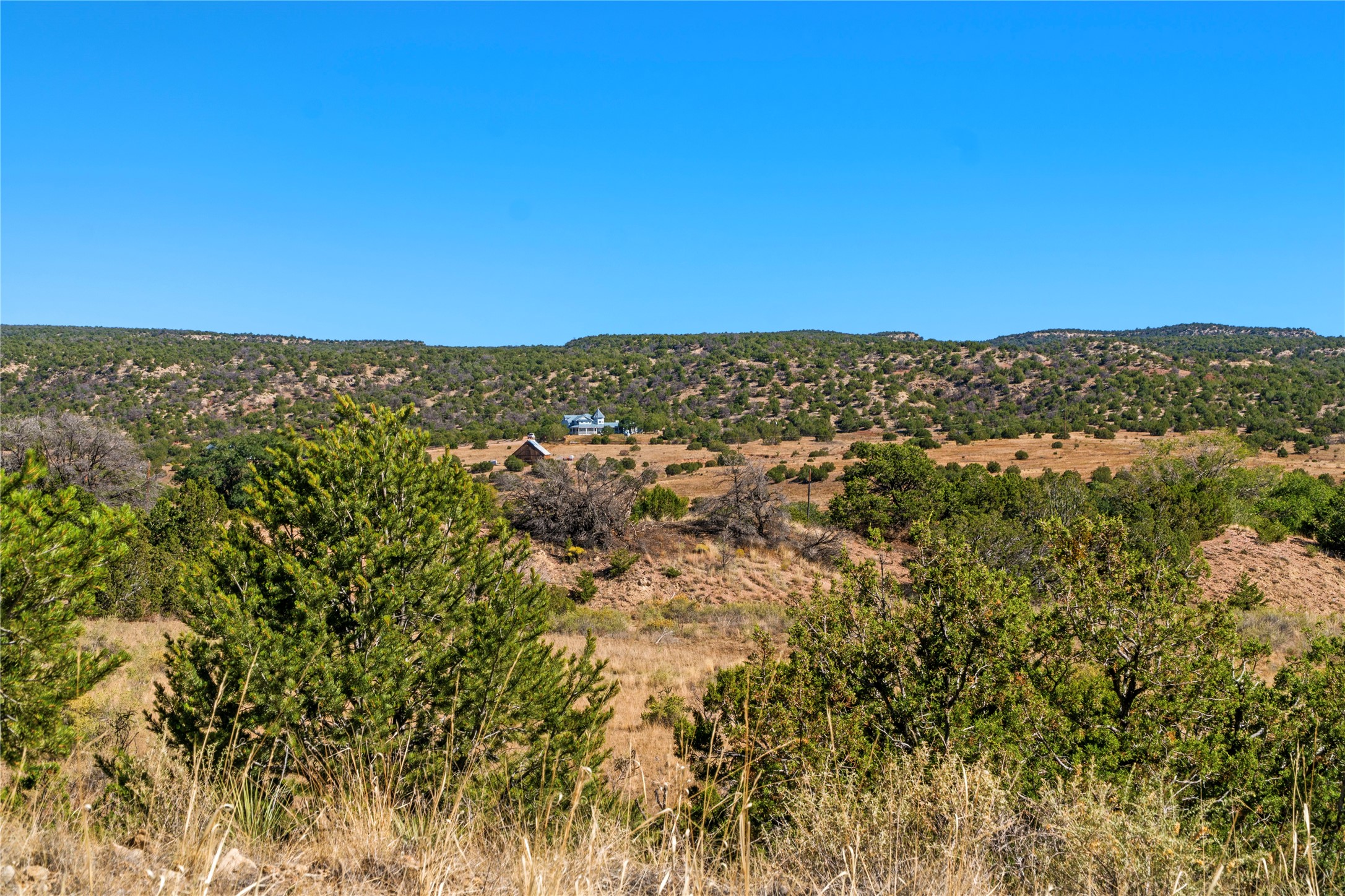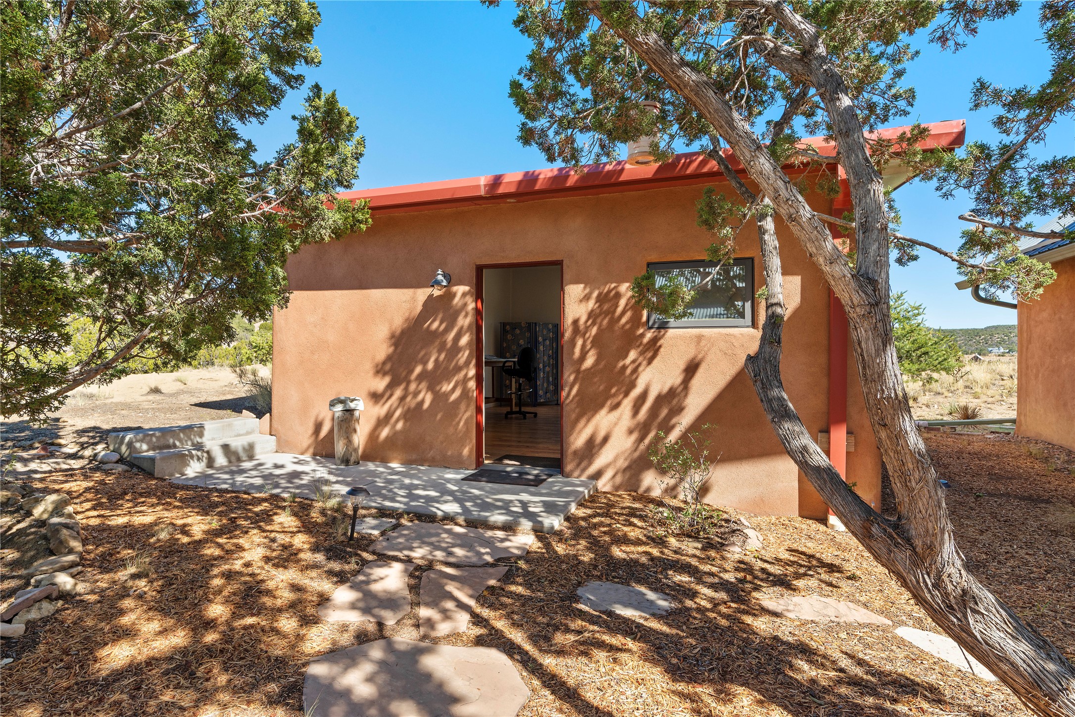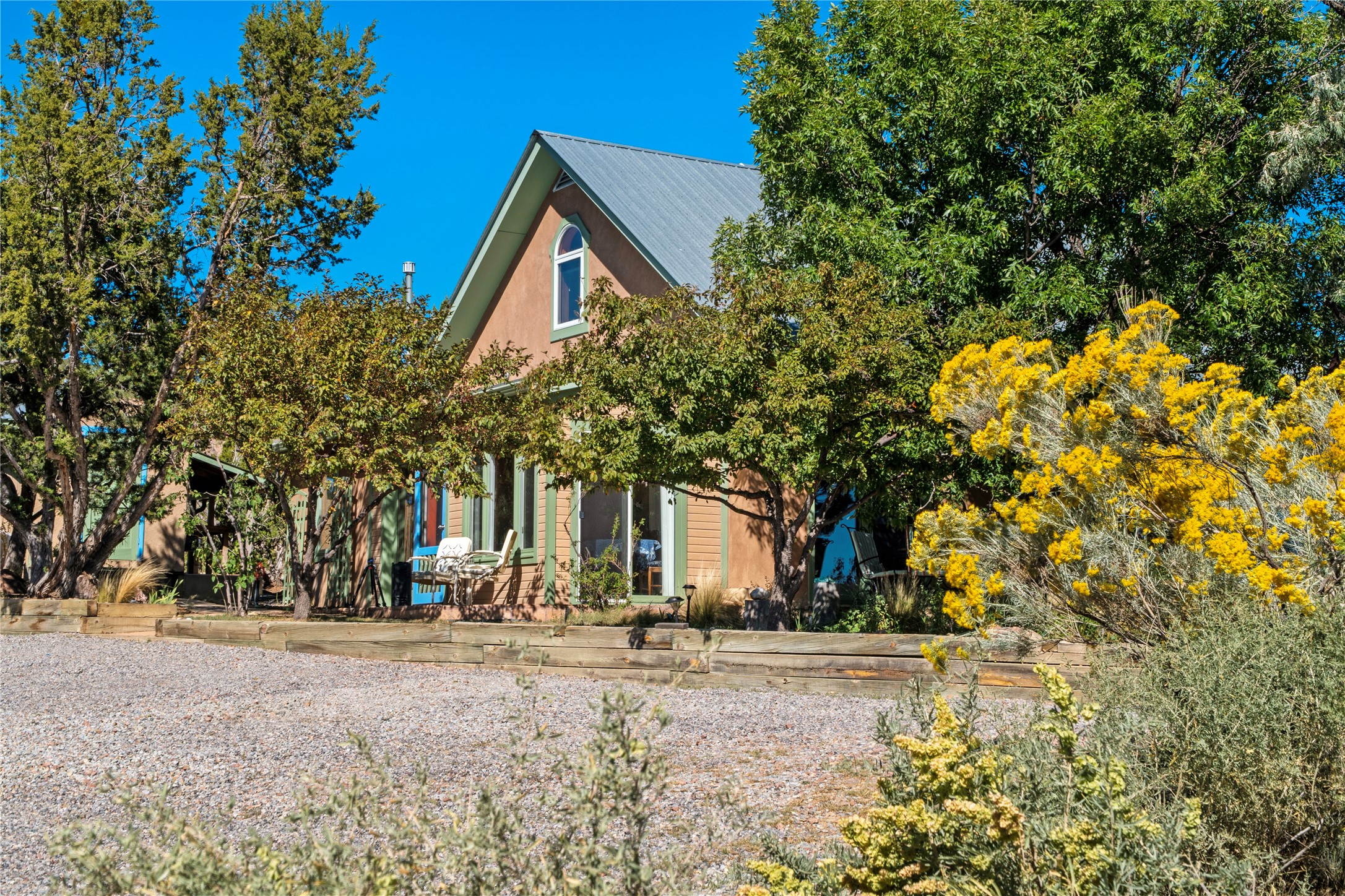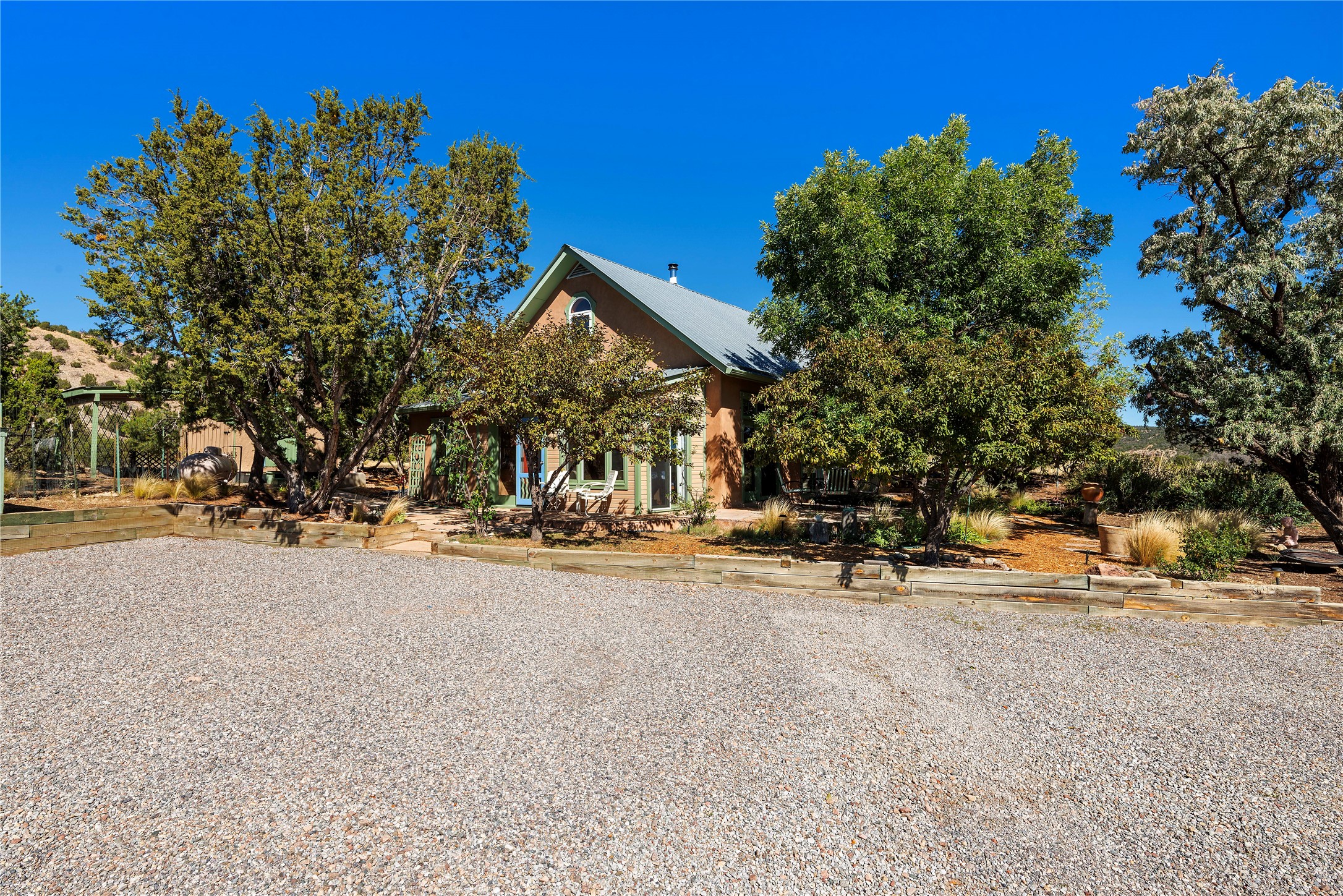 This stunning country home is not to be missed. Located high on a hill overlooking the sweet Village of Lamy, New Mexico, this craftsman-style, passive solar home has a pitched metal roof, lots of light and so much character. Enter the colorful front door into an enclosed porch/sunroom with a wood floor and windows all around and then into the great room. To the left is an efficiently designed kitchen with gorgeous cabinets and a generous pantry/laundry room. Downstairs the floors are handmade Saltillo tile. The great room has high ceilings, a wood stove, and big transom windows, giving it a light and airy feel. Two interior walls are adobe, enhancing the passive solar qualities. Also downstairs are two bedrooms and a full bathroom. Upstairs is the large master bedroom with an ensuite full bath and lots of room for an office/yoga/meditation space. The bamboo floor and pitched roof create a cozy, warm feeling. The home has lots of storage. There is a separate storage shed as well as a separate Art Studio designed by artist/owner. 488 square feet of open space with beautiful north and east light as well as LED track lighting. Large enamel sink. The landscaped yard and patio are inviting as are the expansive views in every direction. With five+ acres there is lots of room for horses, chickens, or other pets. The home is an easy beautiful drive from Santa Fe and located just a few minutes from the Galisteo Basin Preserve where you can hike or ride to your heart's content. This is a country living at its best!