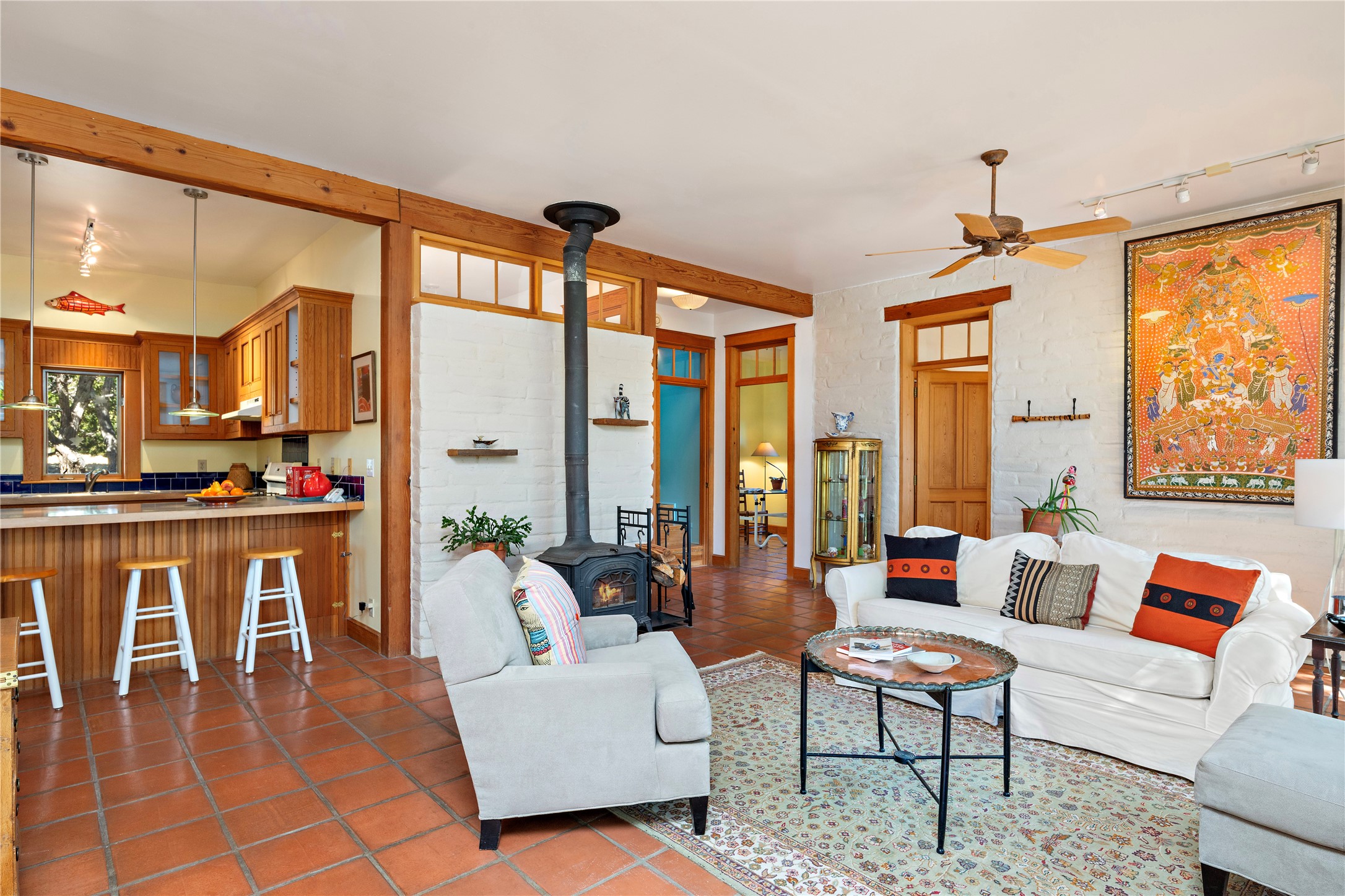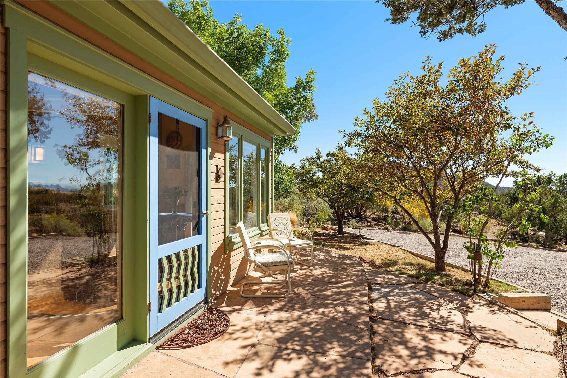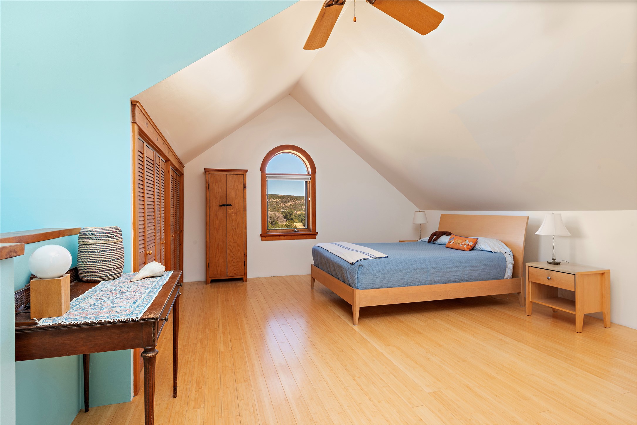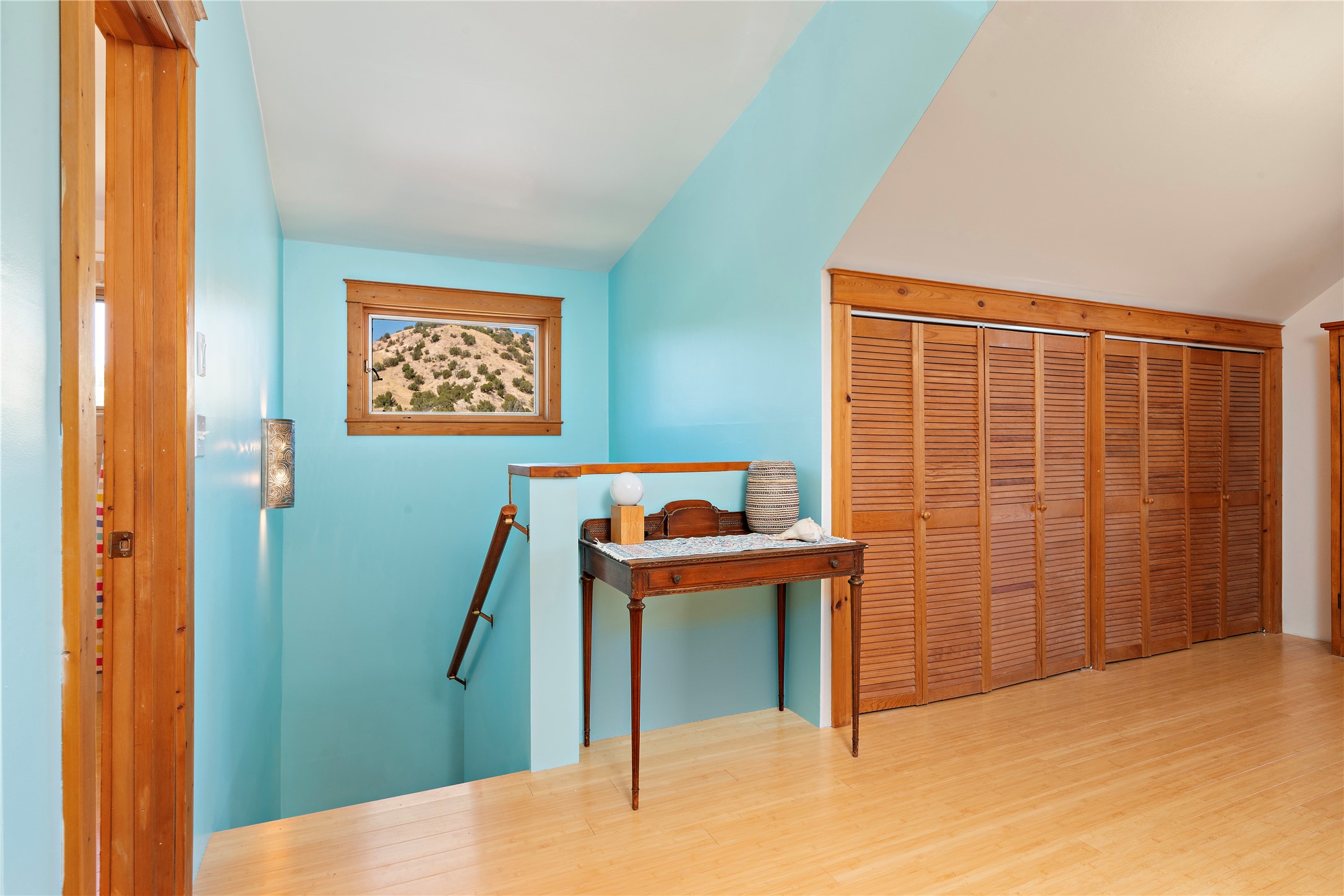 This stunning country home is not to be missed. Located high on a hill overlooking the sweet Village of Lamy, New Mexico, this craftsman-style, passive solar home has a pitched metal roof, lots of light and so much character. Enter the colorful front door into an enclosed porch/sunroom with a wood floor and windows all around and then into the great room. To the left is an efficiently designed kitchen with gorgeous cabinets and a generous pantry/laundry room. Downstairs the floors are handmade Saltillo tile. The great room has high ceilings, a wood stove, and big transom windows, giving it a light and airy feel. Two interior walls are adobe, enhancing the passive solar qualities. Also downstairs are two bedrooms and a full bathroom. Upstairs is the large master bedroom with an ensuite full bath and lots of room for an office/yoga/meditation space. The bamboo floor and pitched roof create a cozy, warm feeling. The home has lots of storage. There is a separate storage shed as well as a separate Art Studio designed by artist/owner. 488 square feet of open space with beautiful north and east light as well as LED track lighting. Large enamel sink. The landscaped yard and patio are inviting as are the expansive views in every direction. With five+ acres there is lots of room for horses, chickens, or other pets. The home is an easy beautiful drive from Santa Fe and located just a few minutes from the Galisteo Basin Preserve where you can hike or ride to your heart's content. This is a country living at its best!