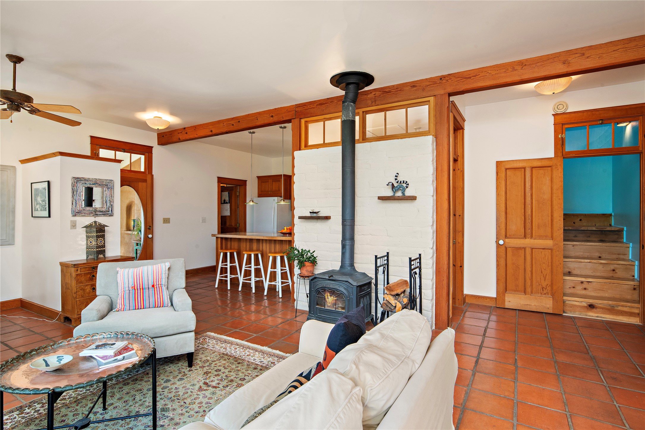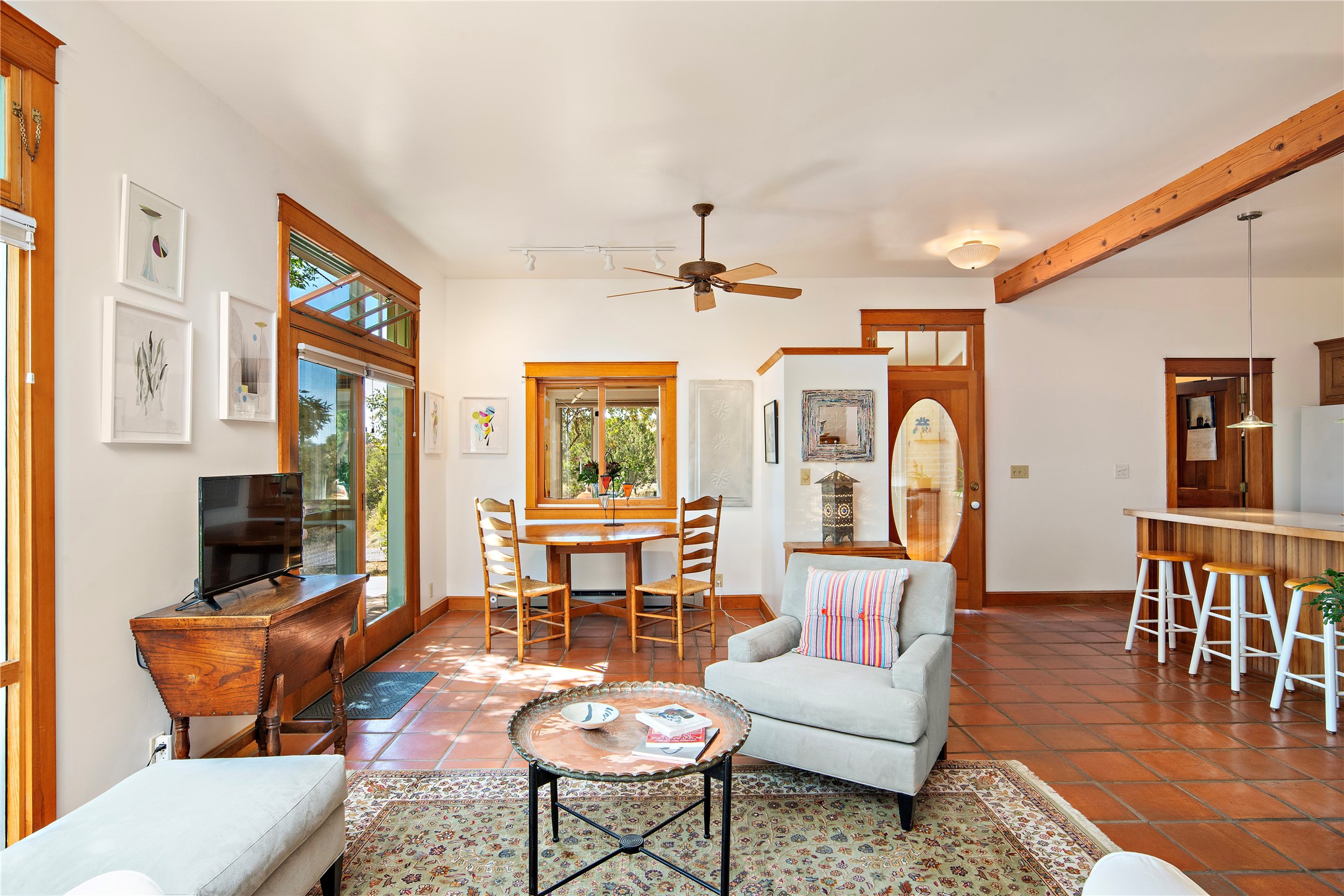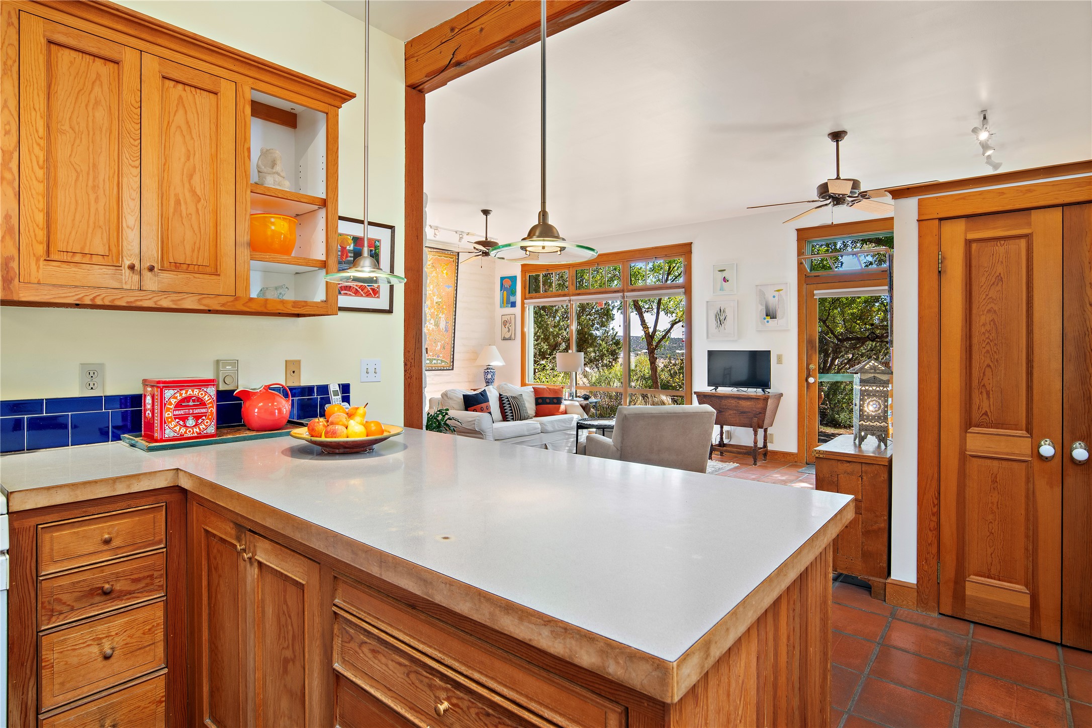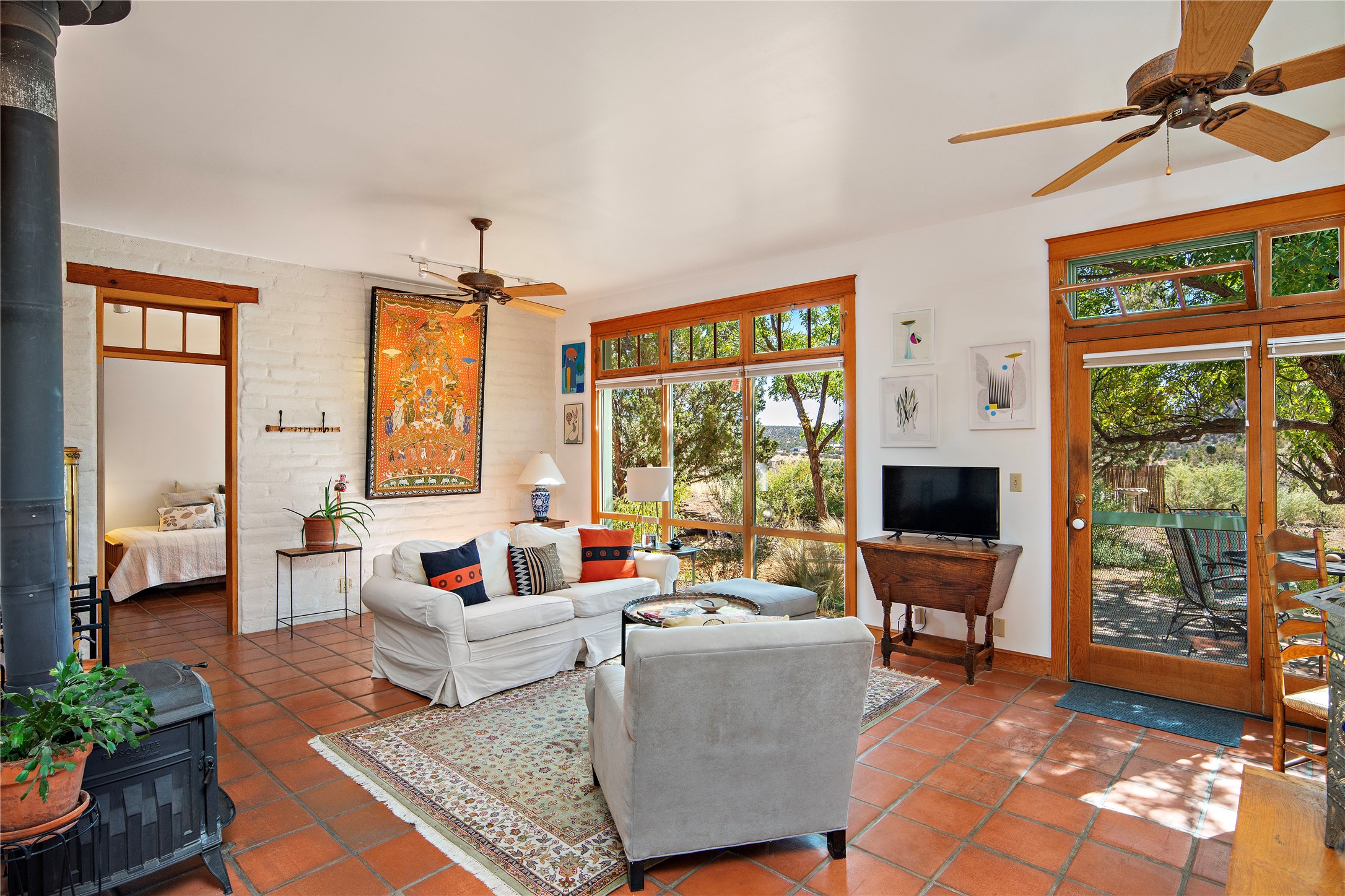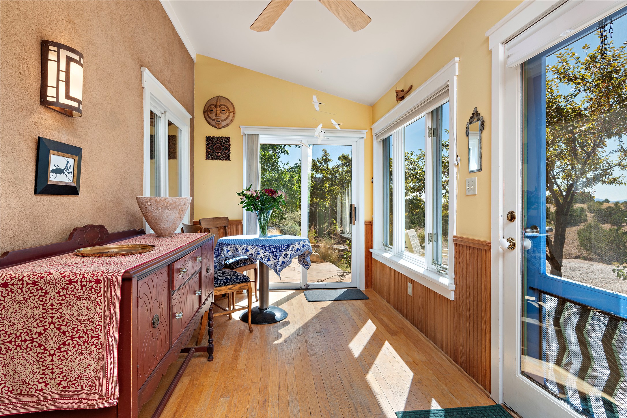 This stunning country home is not to be missed. Located high on a hill overlooking the sweet Village of Lamy, New Mexico, this craftsman-style, passive solar home has a pitched metal roof, lots of light and so much character. Enter the colorful front door into an enclosed porch/sunroom with a wood floor and windows all around and then into the great room. To the left is an efficiently designed kitchen with gorgeous cabinets and a generous pantry/laundry room. Downstairs the floors are handmade Saltillo tile. The great room has high ceilings, a wood stove, and big transom windows, giving it a light and airy feel. Two interior walls are adobe, enhancing the passive solar qualities. Also downstairs are two bedrooms and a full bathroom. Upstairs is the large master bedroom with an ensuite full bath and lots of room for an office/yoga/meditation space. The bamboo floor and pitched roof create a cozy, warm feeling. The home has lots of storage. There is a separate storage shed as well as a separate Art Studio designed by artist/owner. 488 square feet of open space with beautiful north and east light as well as LED track lighting. Large enamel sink. The landscaped yard and patio are inviting as are the expansive views in every direction. With five+ acres there is lots of room for horses, chickens, or other pets. The home is an easy beautiful drive from Santa Fe and located just a few minutes from the Galisteo Basin Preserve where you can hike or ride to your heart's content. This is a country living at its best!