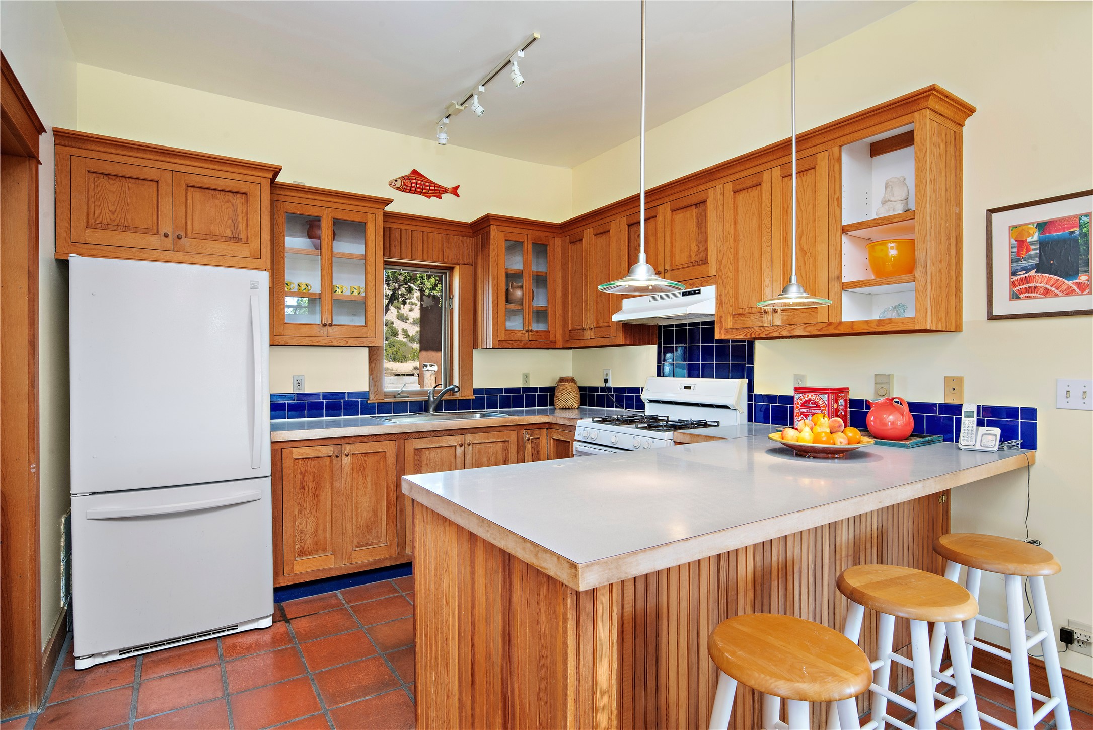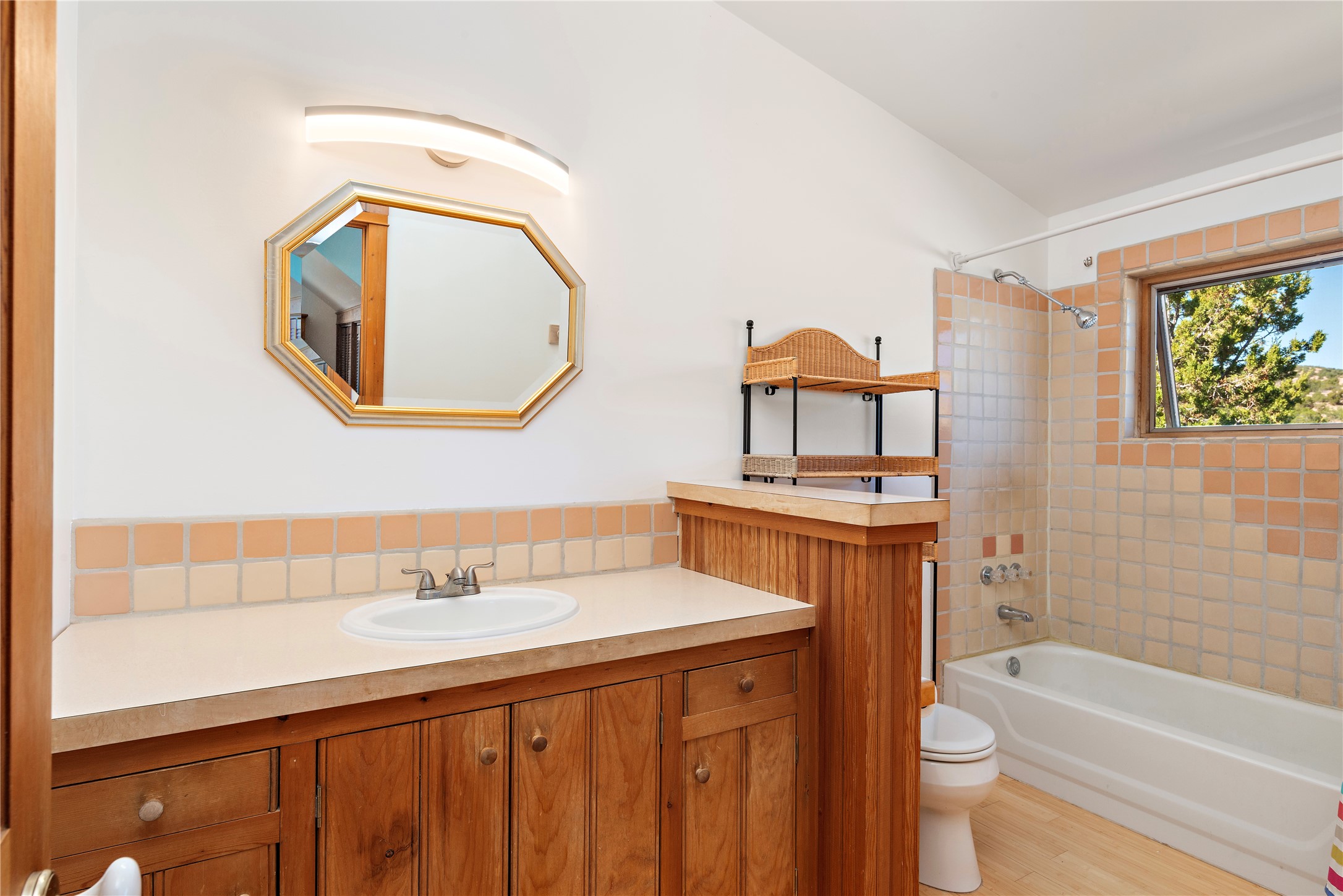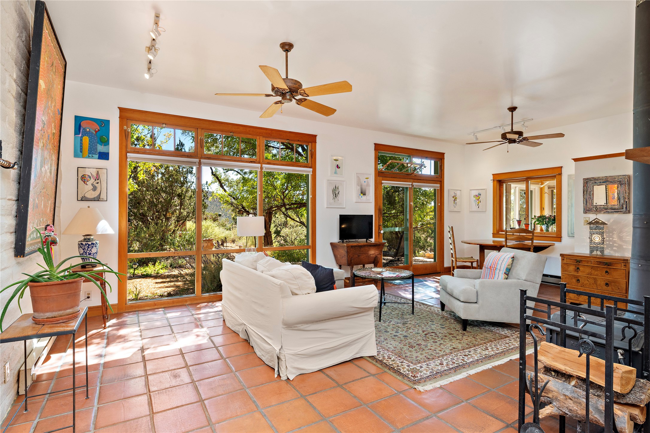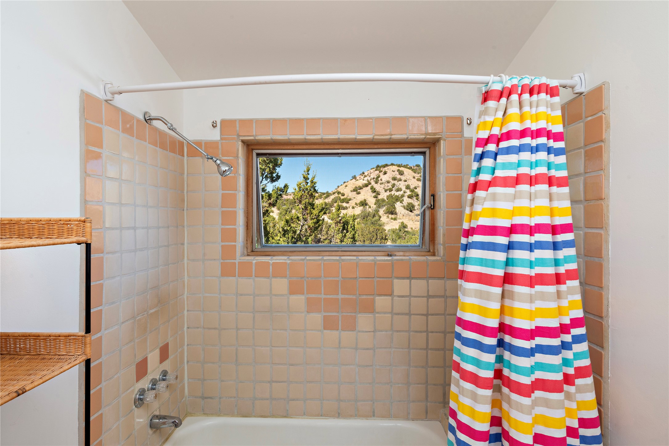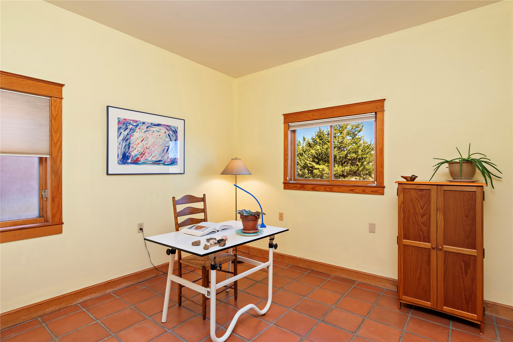 This stunning country home is not to be missed. Located high on a hill overlooking the sweet Village of Lamy, New Mexico, this craftsman-style, passive solar home has a pitched metal roof, lots of light and so much character. Enter the colorful front door into an enclosed porch/sunroom with a wood floor and windows all around and then into the great room. To the left is an efficiently designed kitchen with gorgeous cabinets and a generous pantry/laundry room. Downstairs the floors are handmade Saltillo tile. The great room has high ceilings, a wood stove, and big transom windows, giving it a light and airy feel. Two interior walls are adobe, enhancing the passive solar qualities. Also downstairs are two bedrooms and a full bathroom. Upstairs is the large master bedroom with an ensuite full bath and lots of room for an office/yoga/meditation space. The bamboo floor and pitched roof create a cozy, warm feeling. The home has lots of storage. There is a separate storage shed as well as a separate Art Studio designed by artist/owner. 488 square feet of open space with beautiful north and east light as well as LED track lighting. Large enamel sink. The landscaped yard and patio are inviting as are the expansive views in every direction. With five+ acres there is lots of room for horses, chickens, or other pets. The home is an easy beautiful drive from Santa Fe and located just a few minutes from the Galisteo Basin Preserve where you can hike or ride to your heart's content. This is a country living at its best!