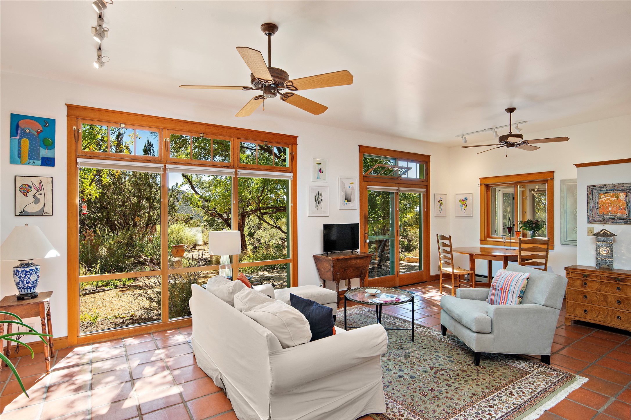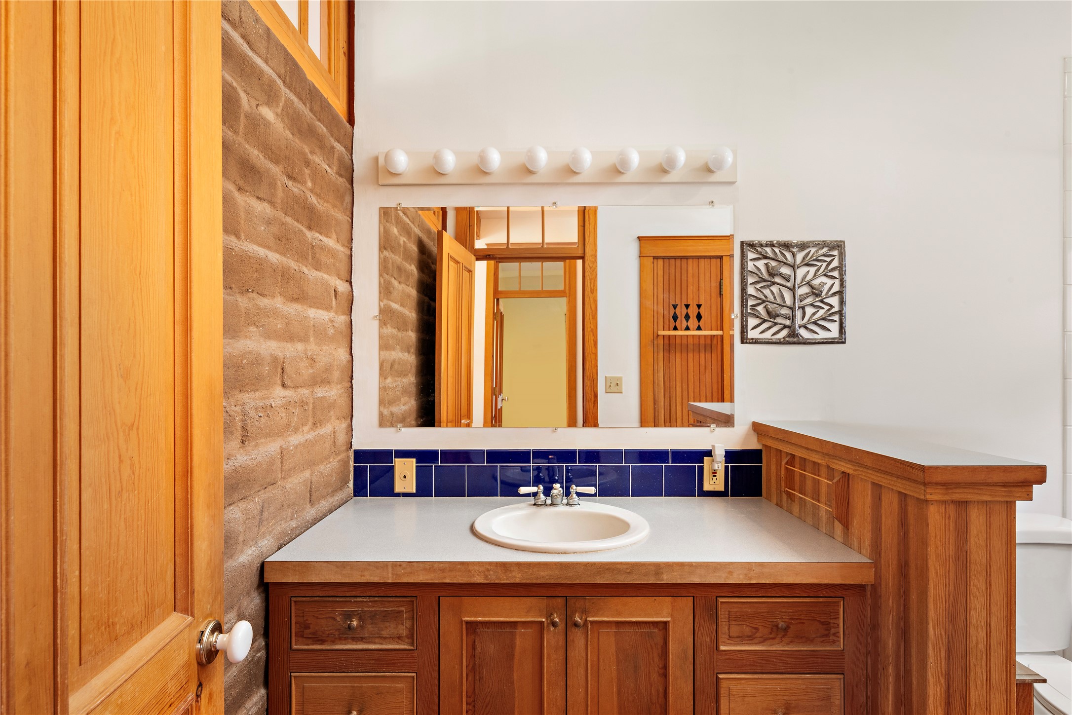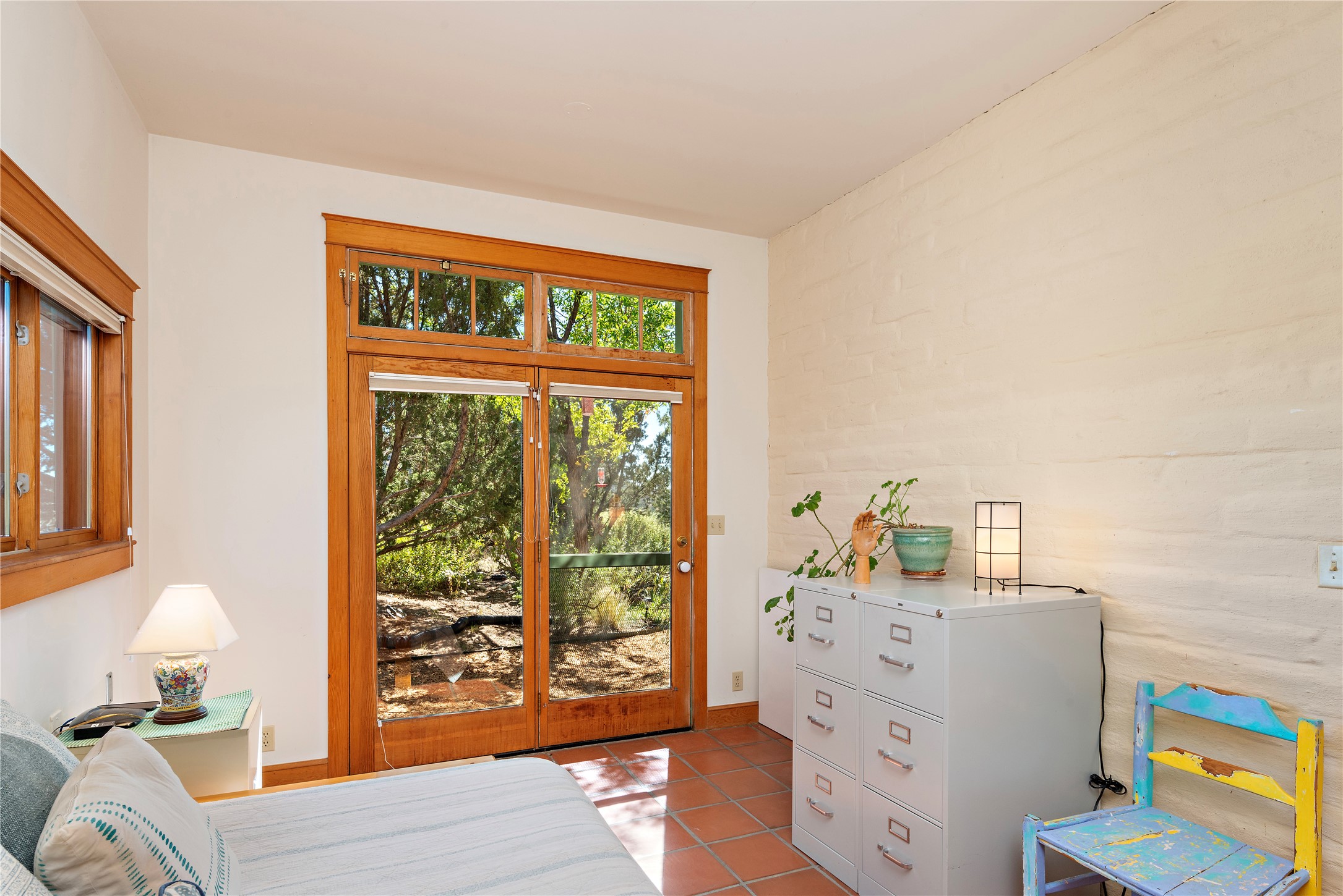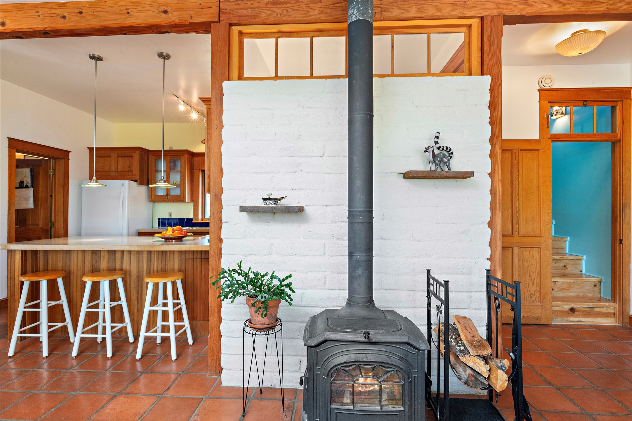 This stunning country home is not to be missed. Located high on a hill overlooking the sweet Village of Lamy, New Mexico, this craftsman-style, passive solar home has a pitched metal roof, lots of light and so much character. Enter the colorful front door into an enclosed porch/sunroom with a wood floor and windows all around and then into the great room. To the left is an efficiently designed kitchen with gorgeous cabinets and a generous pantry/laundry room. Downstairs the floors are handmade Saltillo tile. The great room has high ceilings, a wood stove, and big transom windows, giving it a light and airy feel. Two interior walls are adobe, enhancing the passive solar qualities. Also downstairs are two bedrooms and a full bathroom. Upstairs is the large master bedroom with an ensuite full bath and lots of room for an office/yoga/meditation space. The bamboo floor and pitched roof create a cozy, warm feeling. The home has lots of storage. There is a separate storage shed as well as a separate Art Studio designed by artist/owner. 488 square feet of open space with beautiful north and east light as well as LED track lighting. Large enamel sink. The landscaped yard and patio are inviting as are the expansive views in every direction. With five+ acres there is lots of room for horses, chickens, or other pets. The home is an easy beautiful drive from Santa Fe and located just a few minutes from the Galisteo Basin Preserve where you can hike or ride to your heart's content. This is a country living at its best!