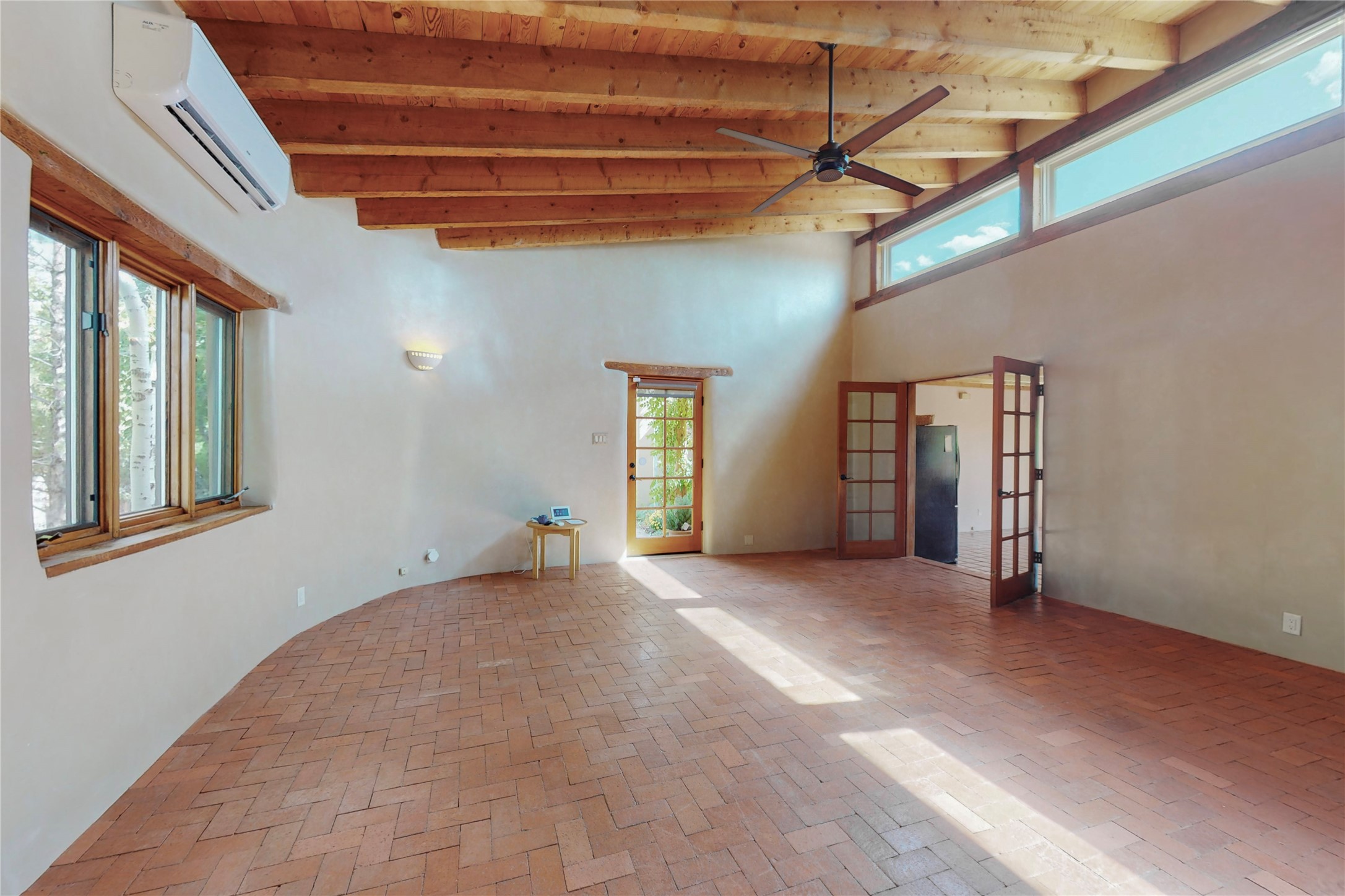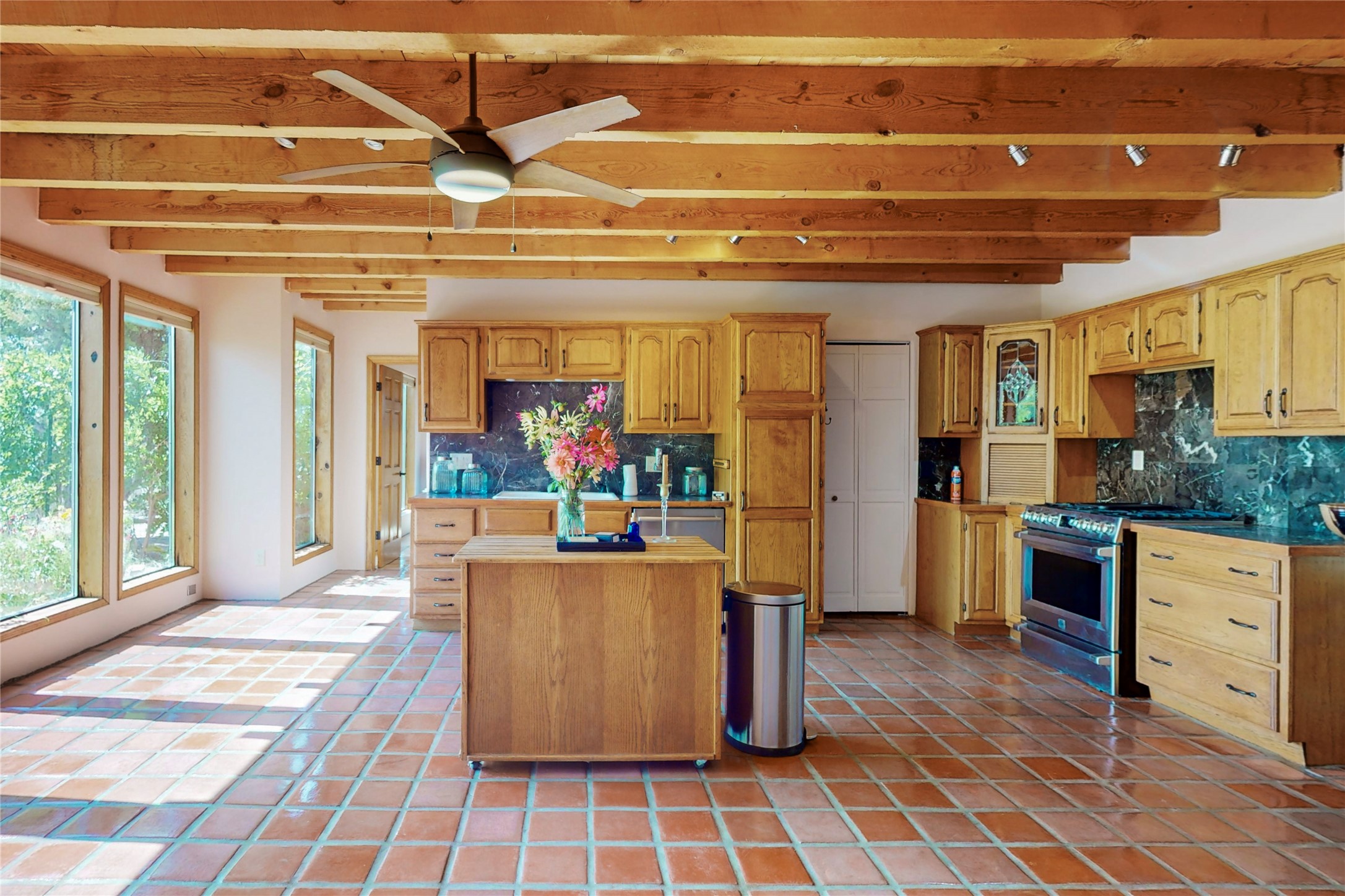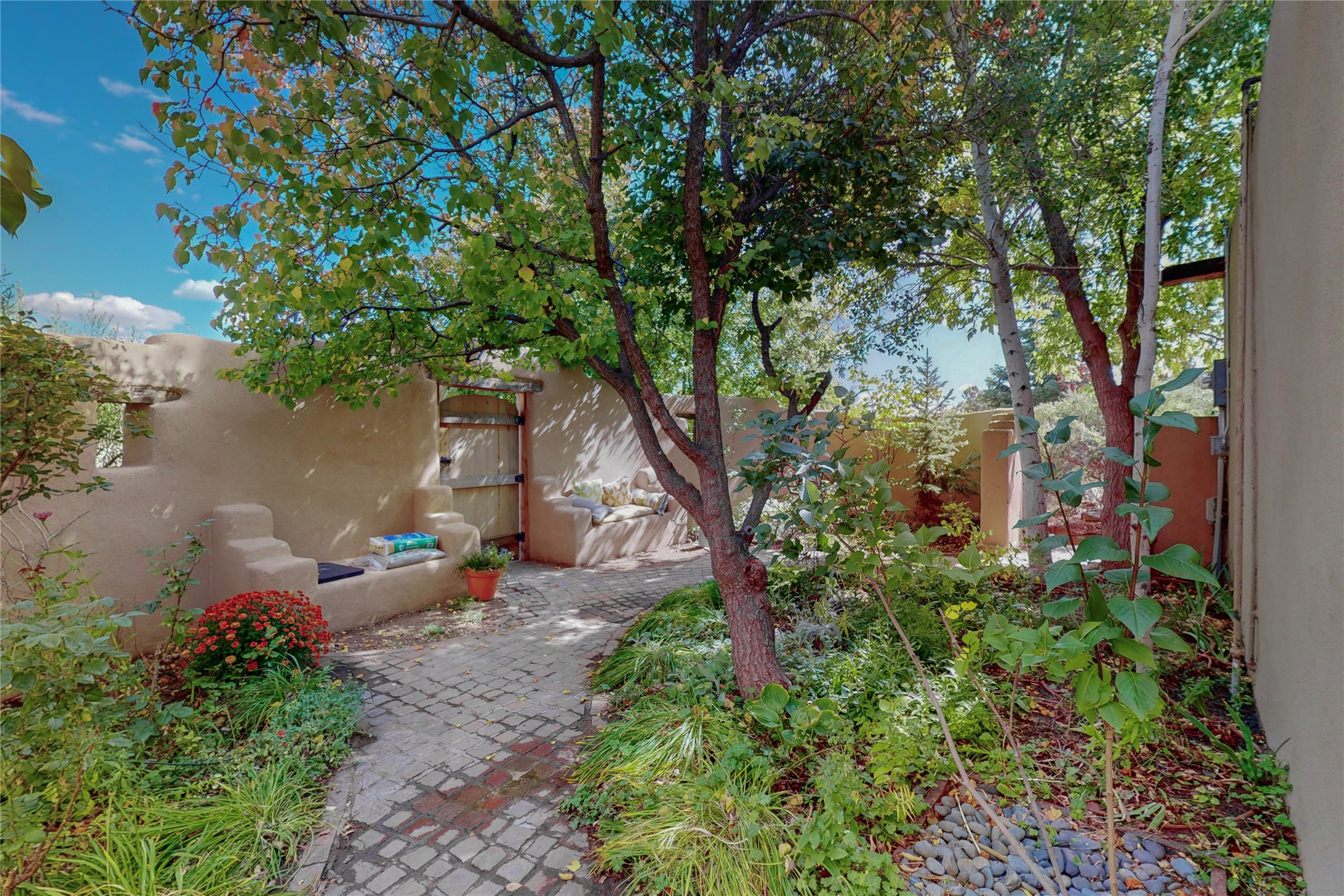 Lovely traditional passive solar, open plan design with additional heat gas stoves, and mini splits for winter and summer comfort. A split 3 bedroom original floor plan created great separation between main and guest areas. A wonderful connection to lovely outside garden spaces on the south adds to the cheerful zen like atmosphere inside ideal for entertaining plenty of family or guests. There is a newer on demand boiler which also supplies the radiant heat in the adobe den. In 2016 the detached garage area was converted to fabulous "mum in law" casita with 1+ bedrooms, including an on demand boiler that serves the radiant heat, and a window a/c for cooling. A new large septic tank and leach field and the stucco was replaced in 2016, a "gayco" type roof covering added in 2023. There is a private well with a new pump installed in 2022, a holding tank and filter changed every 3 months. Drip irrigation to the gardens and a productive veggie patch. Located on a large greenbelt with north mountain and sunset views, surrounded by lovingly cared for gardens and trees this home will be a delightful haven for the new owner. Eldorado amenities, two local shopping centers and within minutes into Santa Fe-what could be better:)