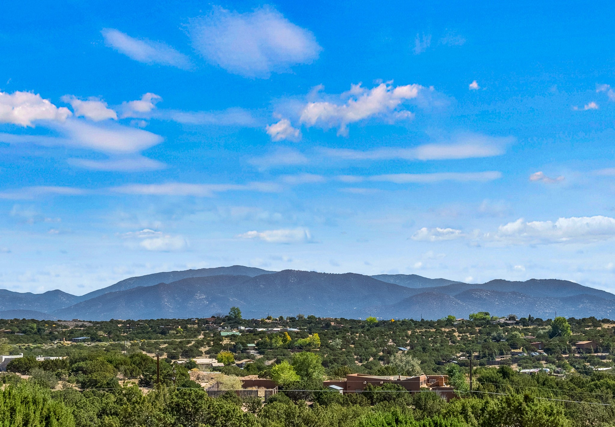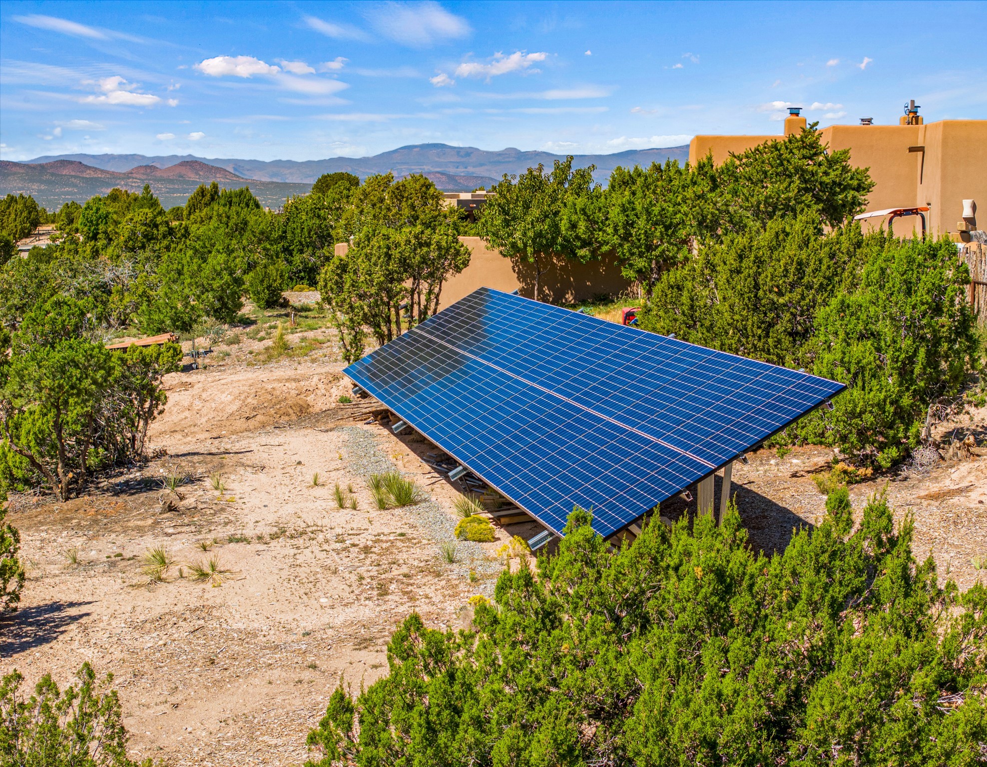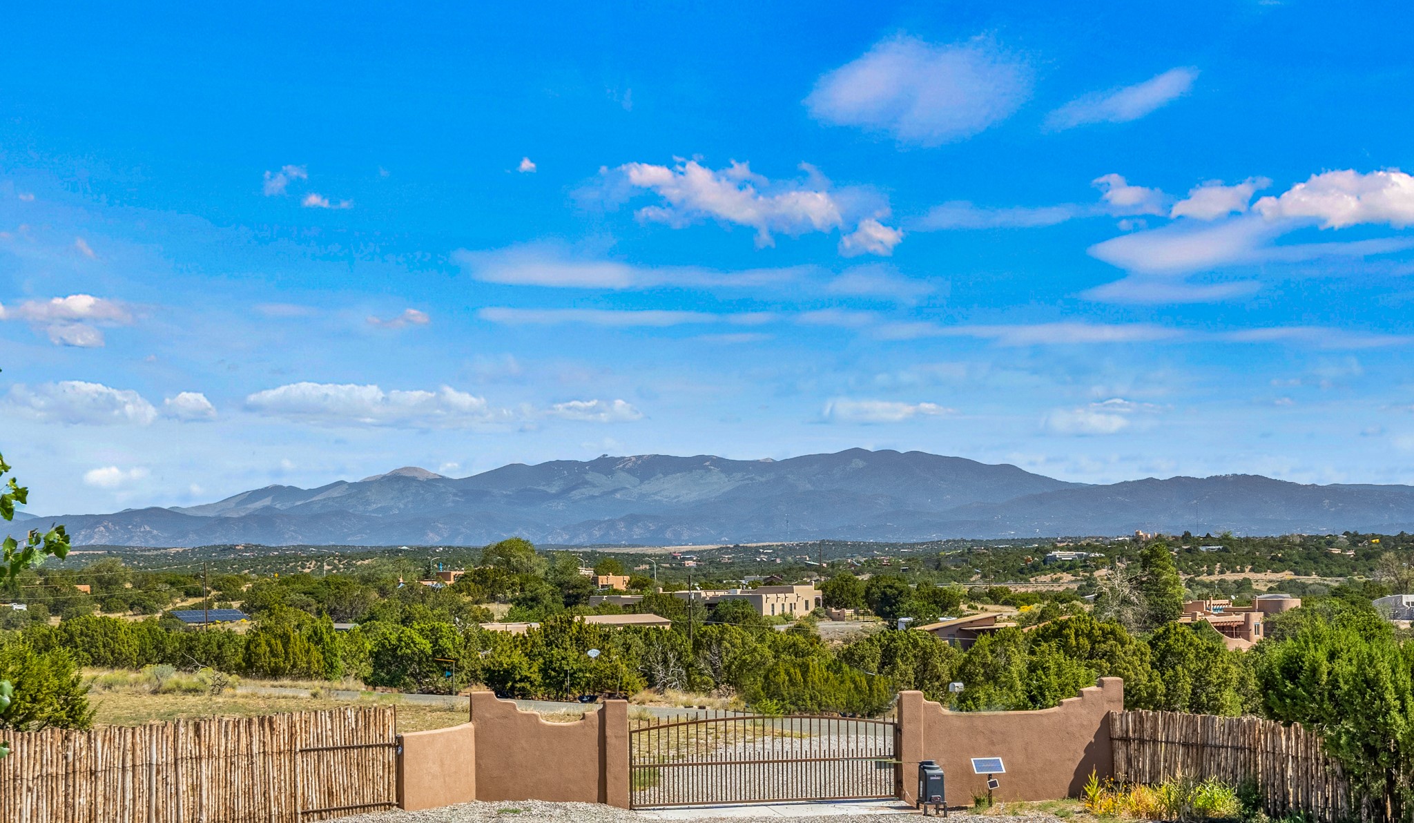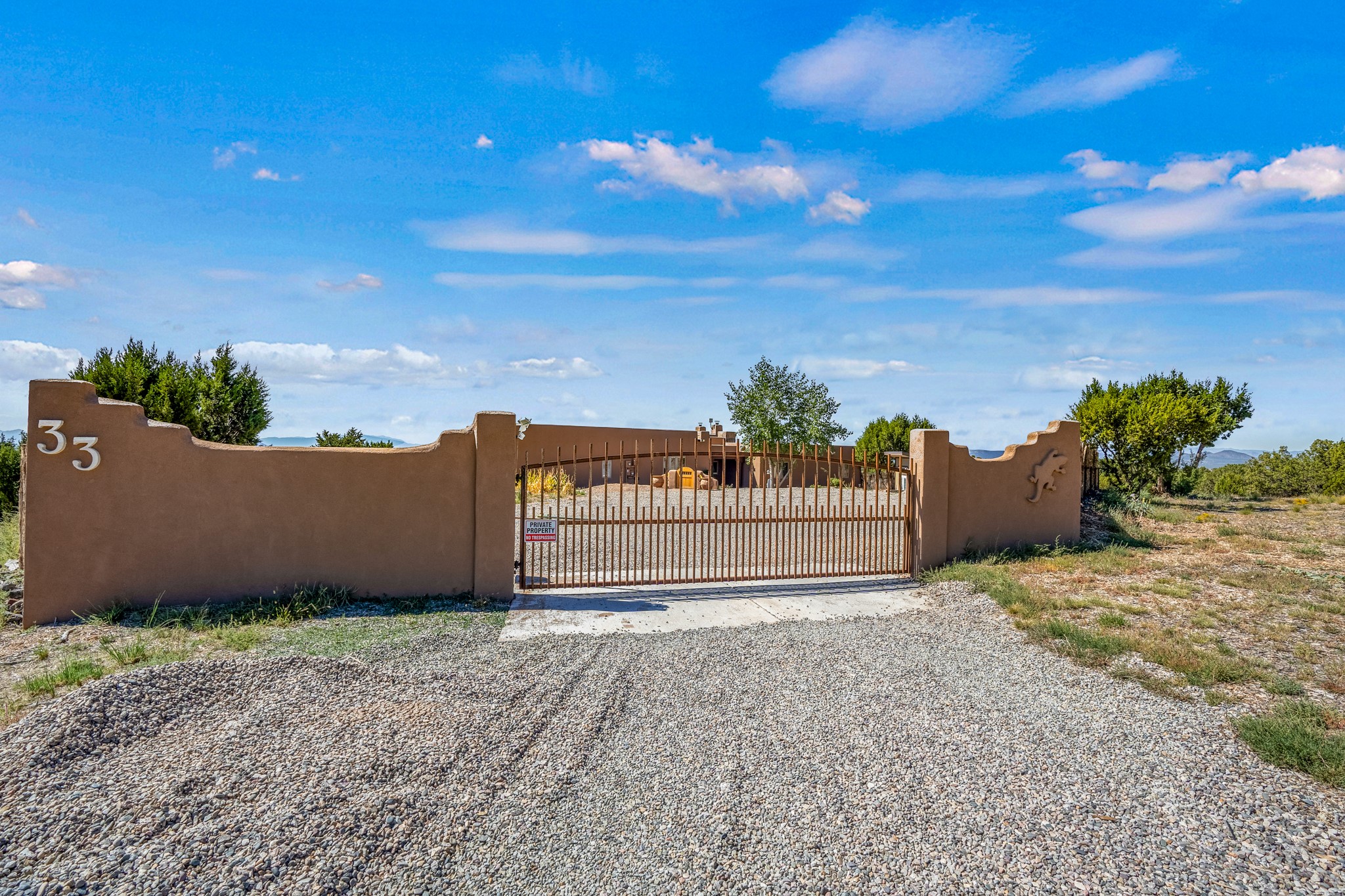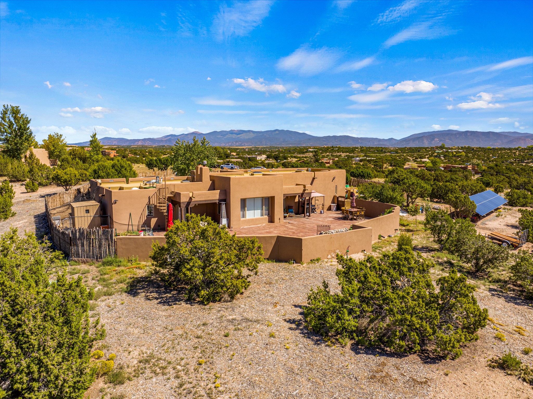 Nestled in Puesta De Sol Subdivision, just 15 minutes from Santa Fe Plaza, 40 Minutes from Los Alamos, and 9 from stores like Target and Albertsons, this 4-acre gem offers privacy and security with its gated entry, a fresh roof, stucco, and stunning mountain views. The sunlit interior boasts a spacious kitchen for entertaining, charming vigas-adorned high ceilings, and distinctive Santa Fe features such as nichos, corbels, and kiva fireplaces. Enjoy an inspiring garden shed, a cozy primary suite, and a massive patio featuring a soothing fountain. Cap it all off with a rooftop view of breathtaking sunsets. And let's not forget the eco-friendly solar features, including a battery backup system alongside grid-tie, and a solar switch for seamless operation even if the grid were to go down also provides super low Monthly utility bills. This home truly has it all!