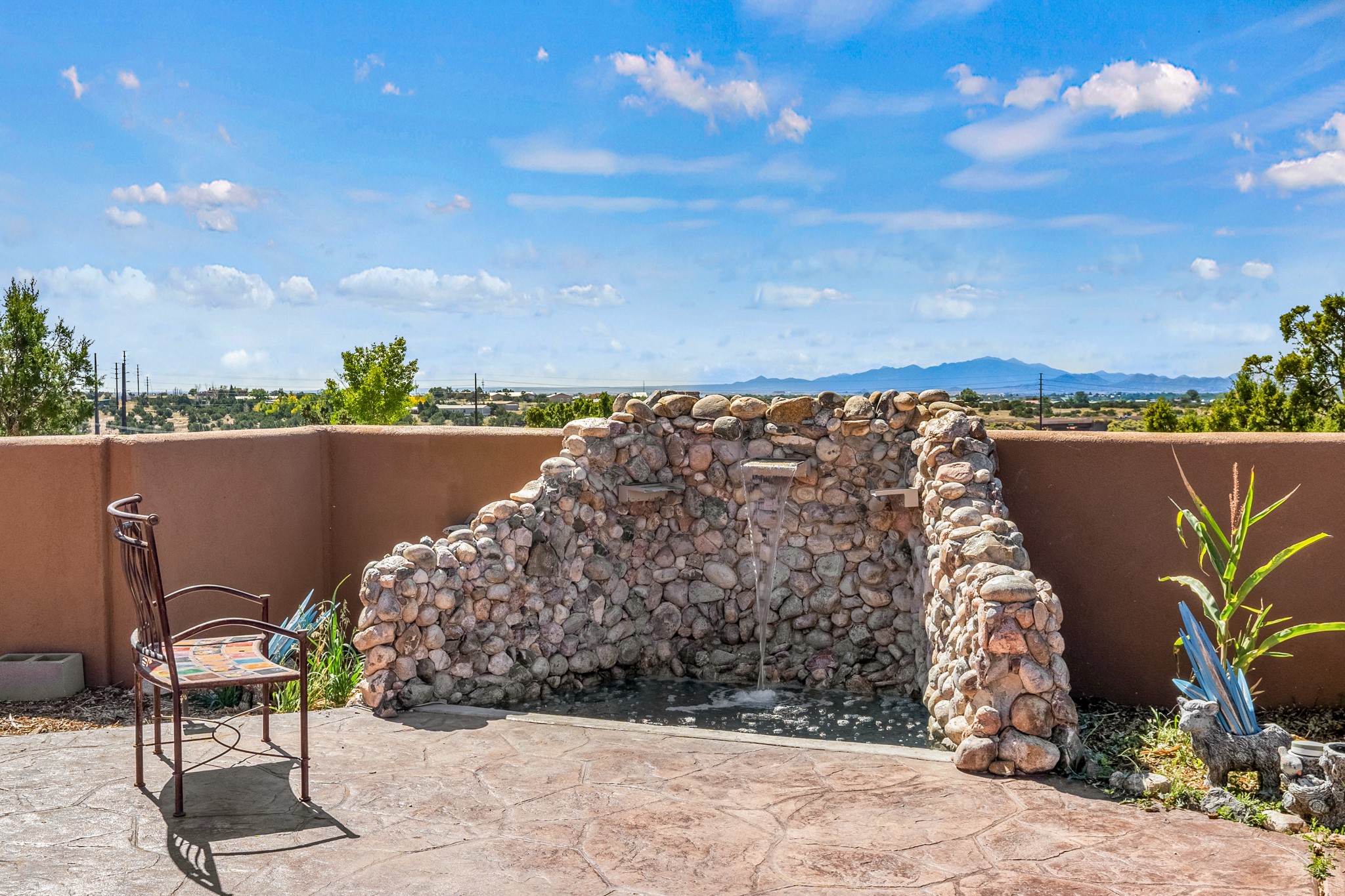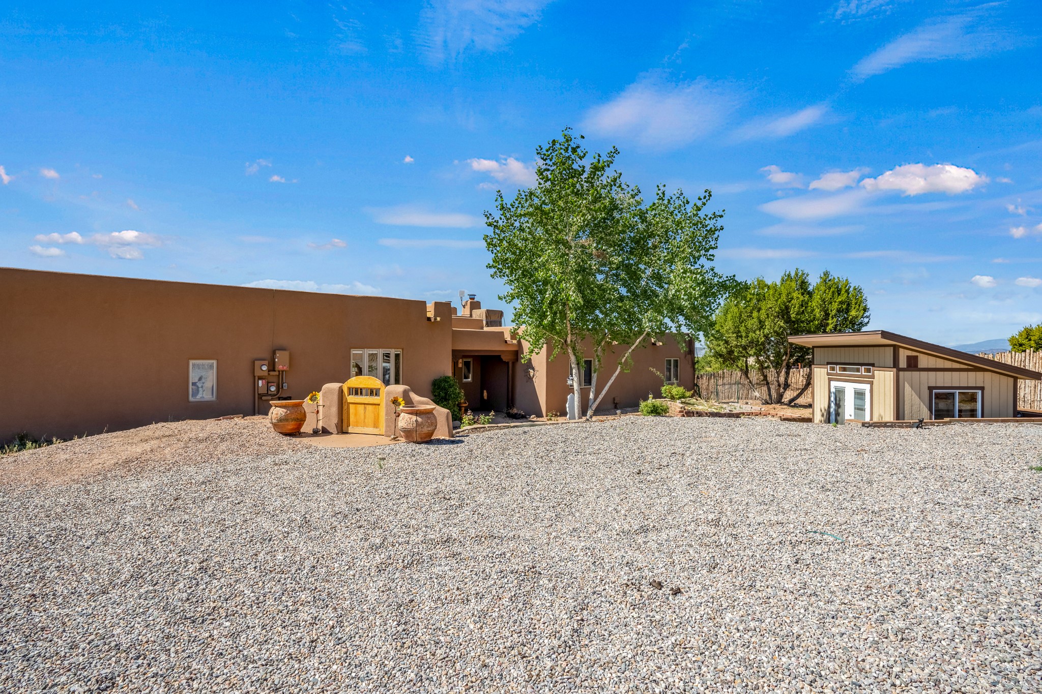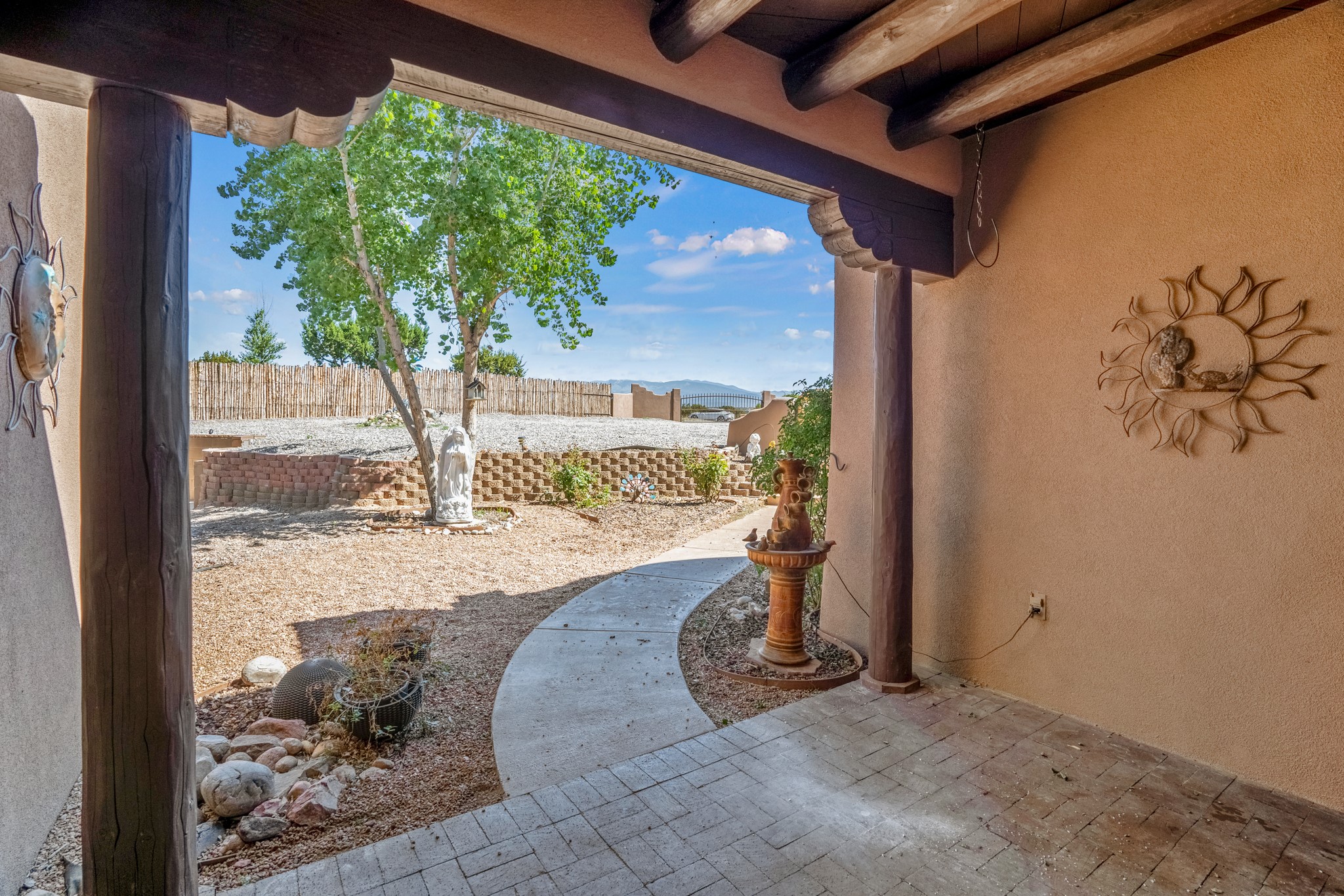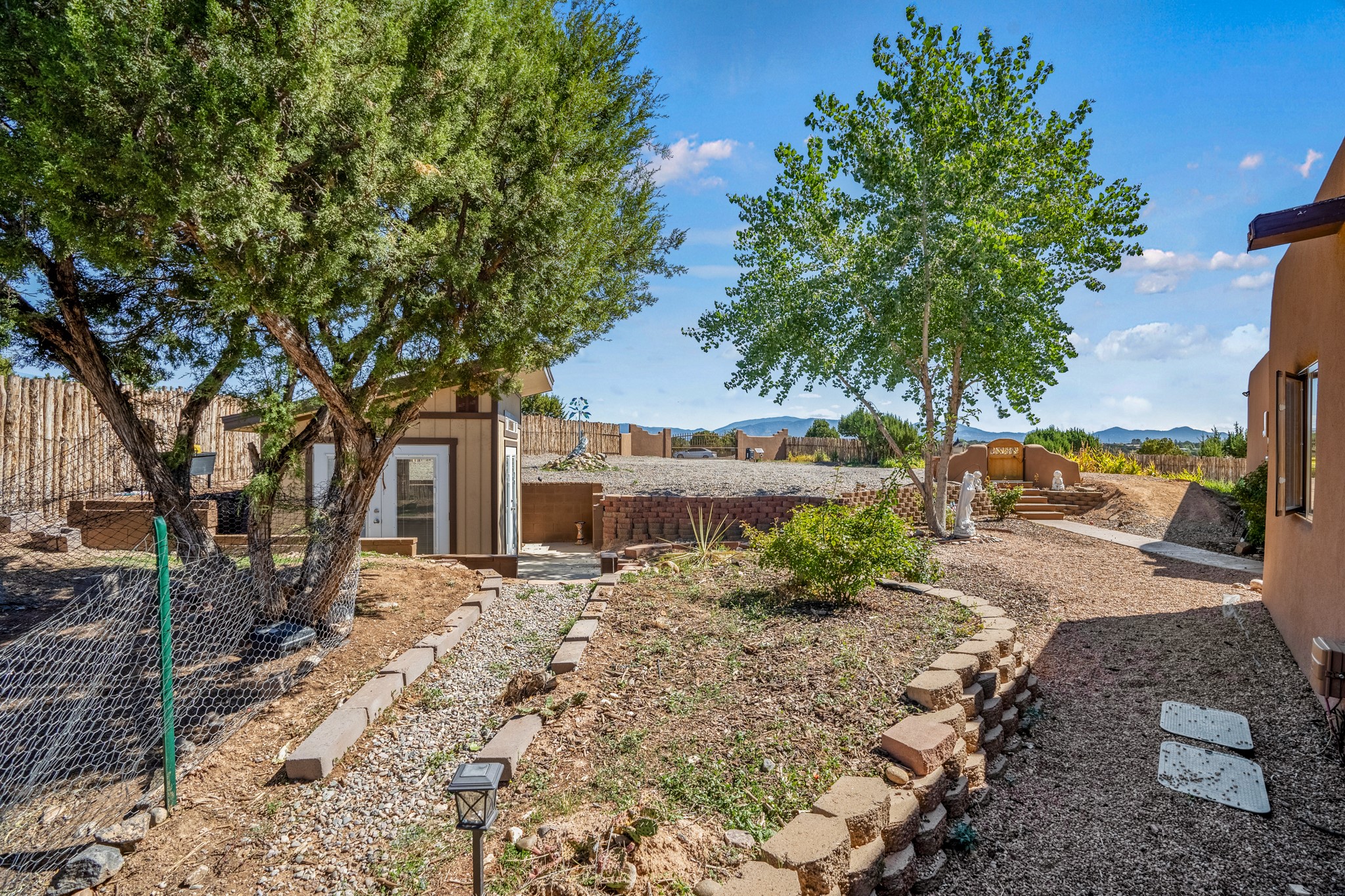 Nestled in Puesta De Sol Subdivision, just 15 minutes from Santa Fe Plaza, 40 Minutes from Los Alamos, and 9 from stores like Target and Albertsons, this 4-acre gem offers privacy and security with its gated entry, a fresh roof, stucco, and stunning mountain views. The sunlit interior boasts a spacious kitchen for entertaining, charming vigas-adorned high ceilings, and distinctive Santa Fe features such as nichos, corbels, and kiva fireplaces. Enjoy an inspiring garden shed, a cozy primary suite, and a massive patio featuring a soothing fountain. Cap it all off with a rooftop view of breathtaking sunsets. And let's not forget the eco-friendly solar features, including a battery backup system alongside grid-tie, and a solar switch for seamless operation even if the grid were to go down also provides super low Monthly utility bills. This home truly has it all!