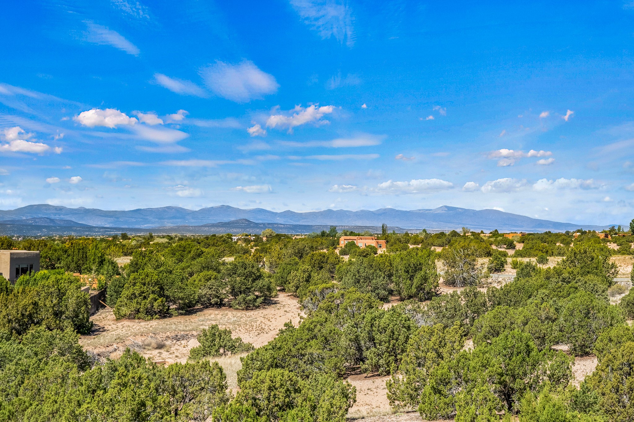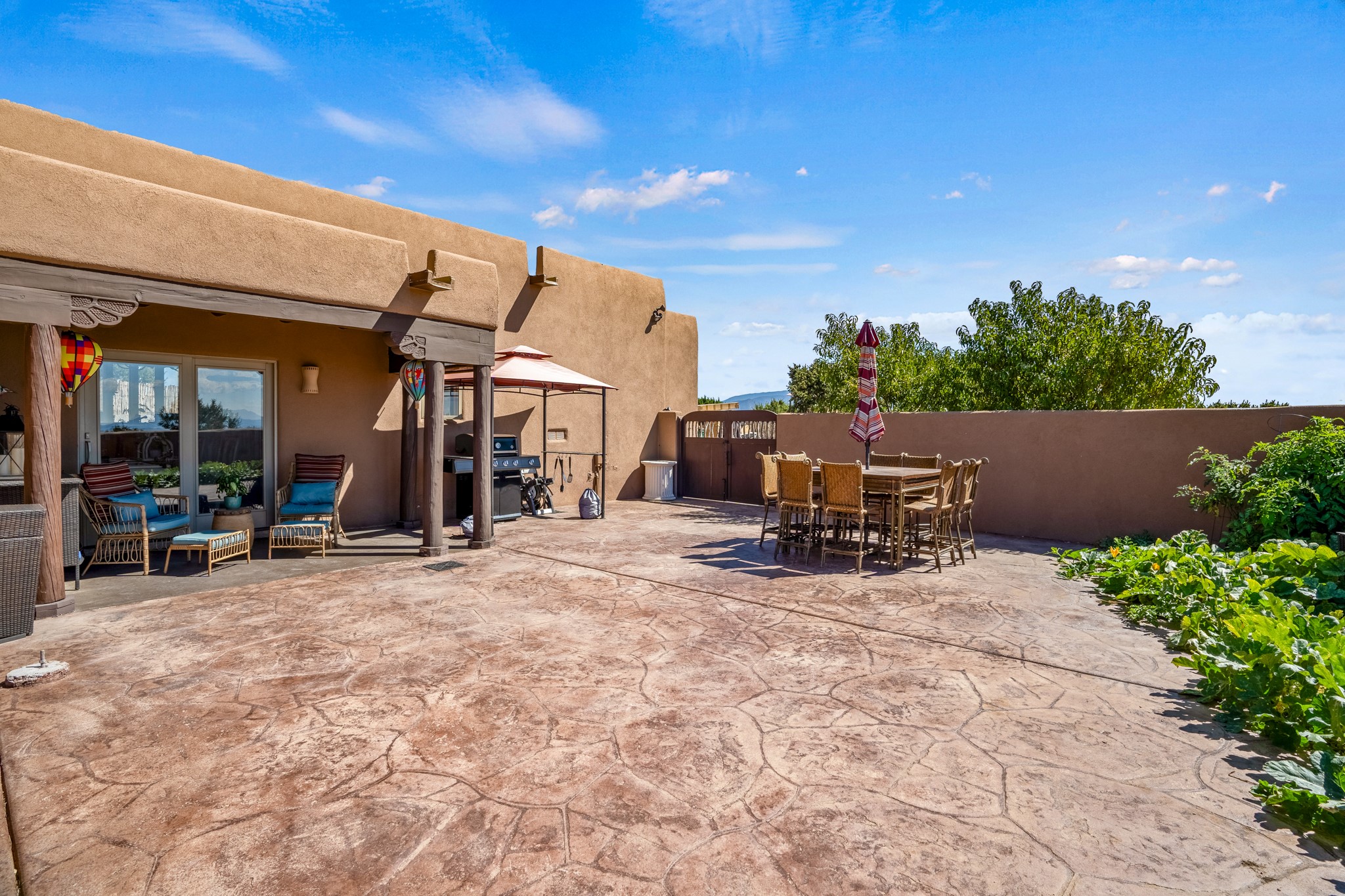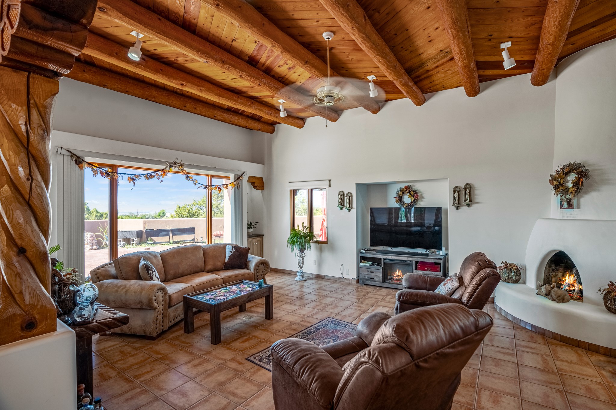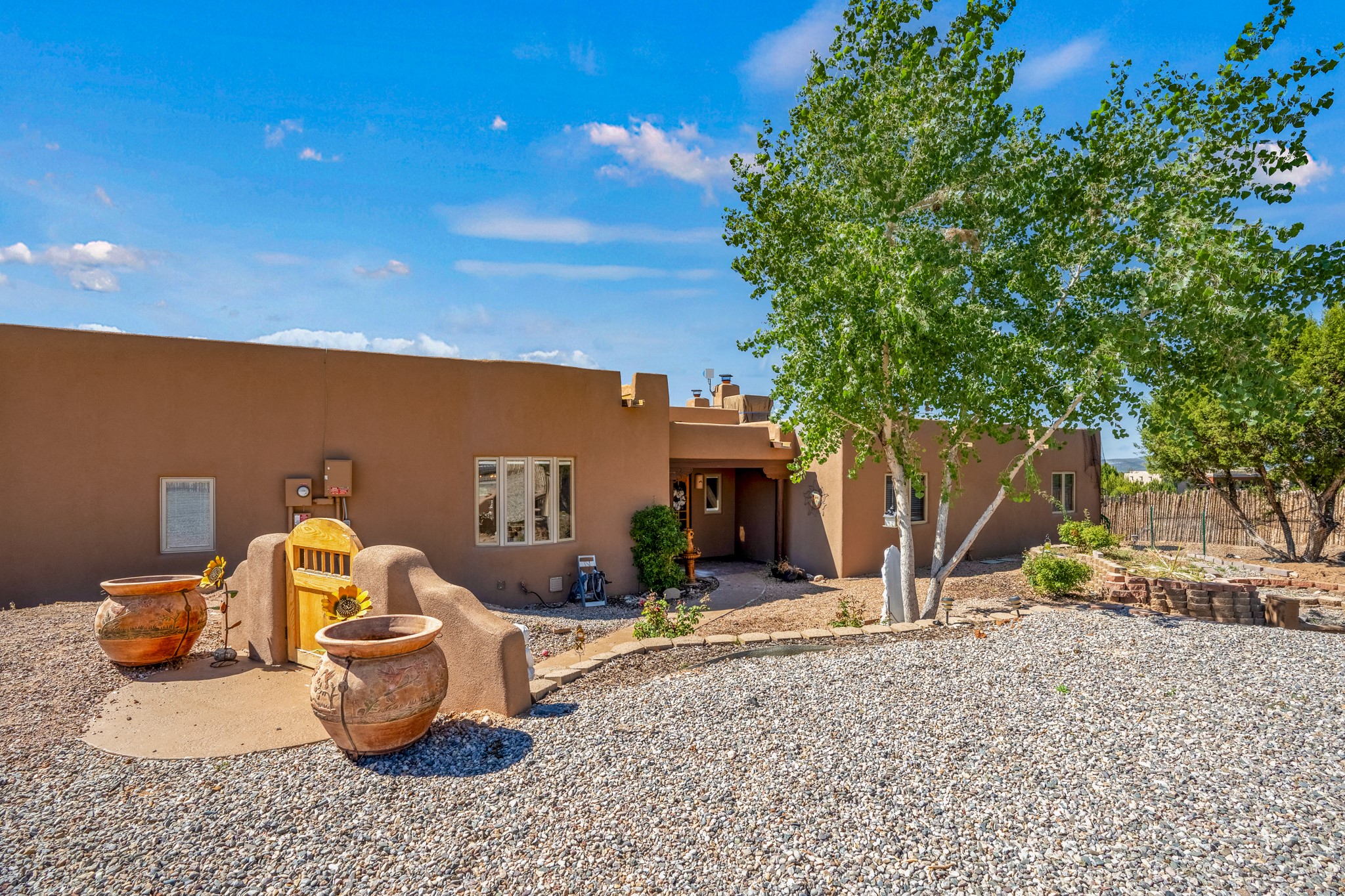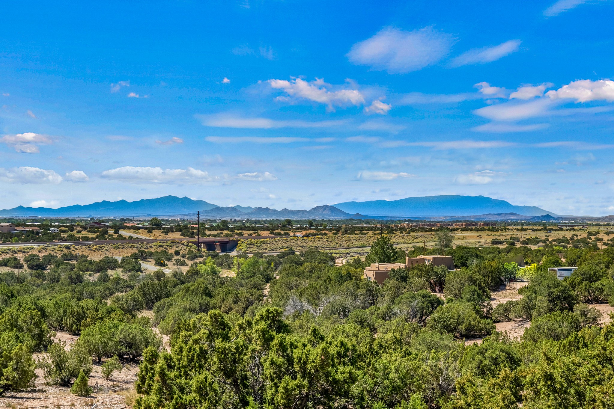 Nestled in Puesta De Sol Subdivision, just 15 minutes from Santa Fe Plaza, 40 Minutes from Los Alamos, and 9 from stores like Target and Albertsons, this 4-acre gem offers privacy and security with its gated entry, a fresh roof, stucco, and stunning mountain views. The sunlit interior boasts a spacious kitchen for entertaining, charming vigas-adorned high ceilings, and distinctive Santa Fe features such as nichos, corbels, and kiva fireplaces. Enjoy an inspiring garden shed, a cozy primary suite, and a massive patio featuring a soothing fountain. Cap it all off with a rooftop view of breathtaking sunsets. And let's not forget the eco-friendly solar features, including a battery backup system alongside grid-tie, and a solar switch for seamless operation even if the grid were to go down also provides super low Monthly utility bills. This home truly has it all!
