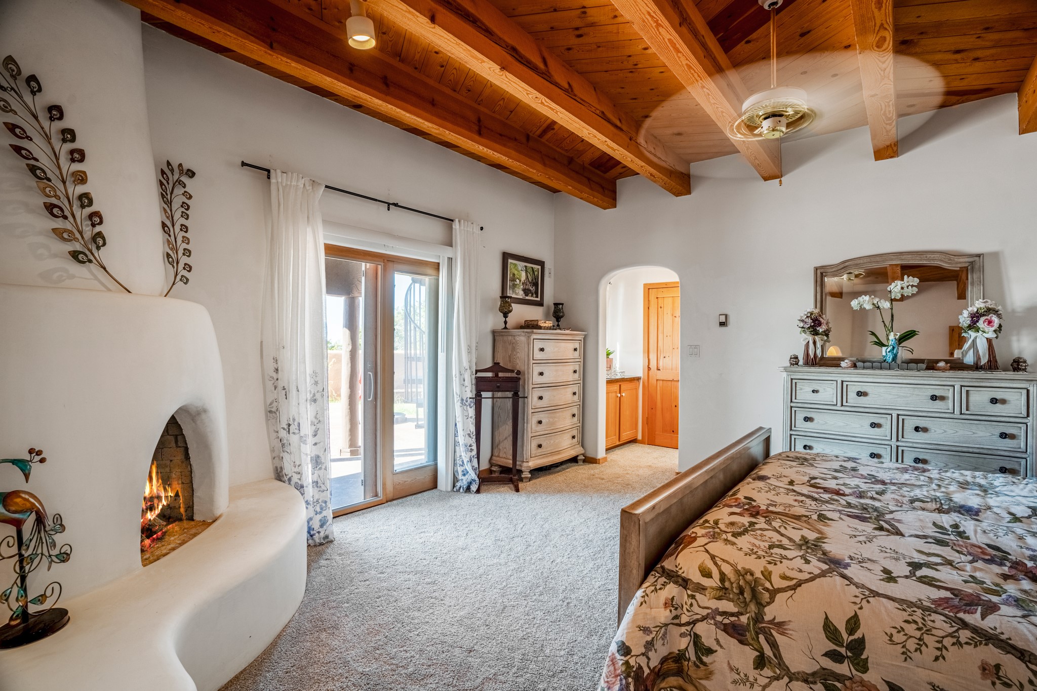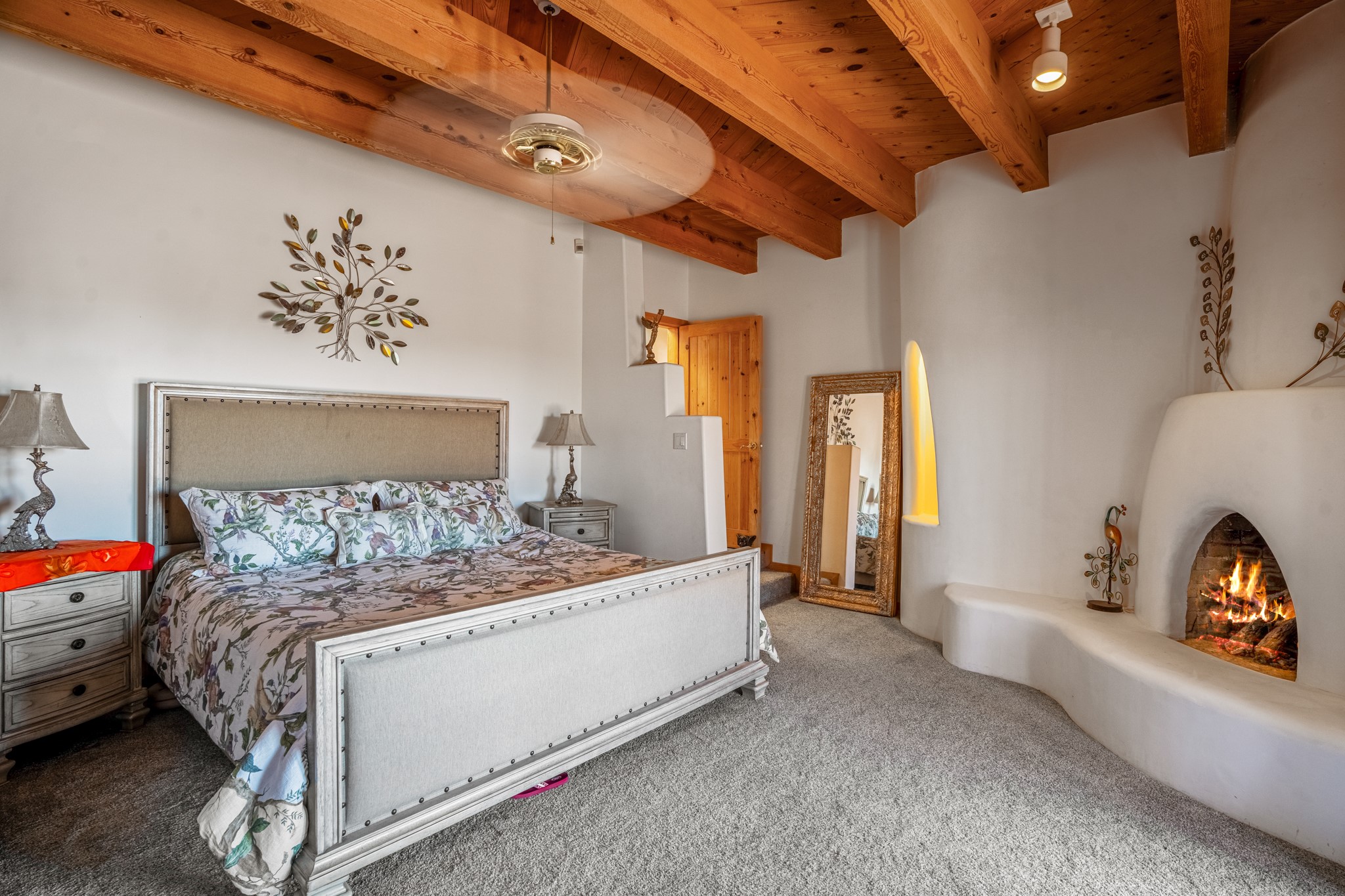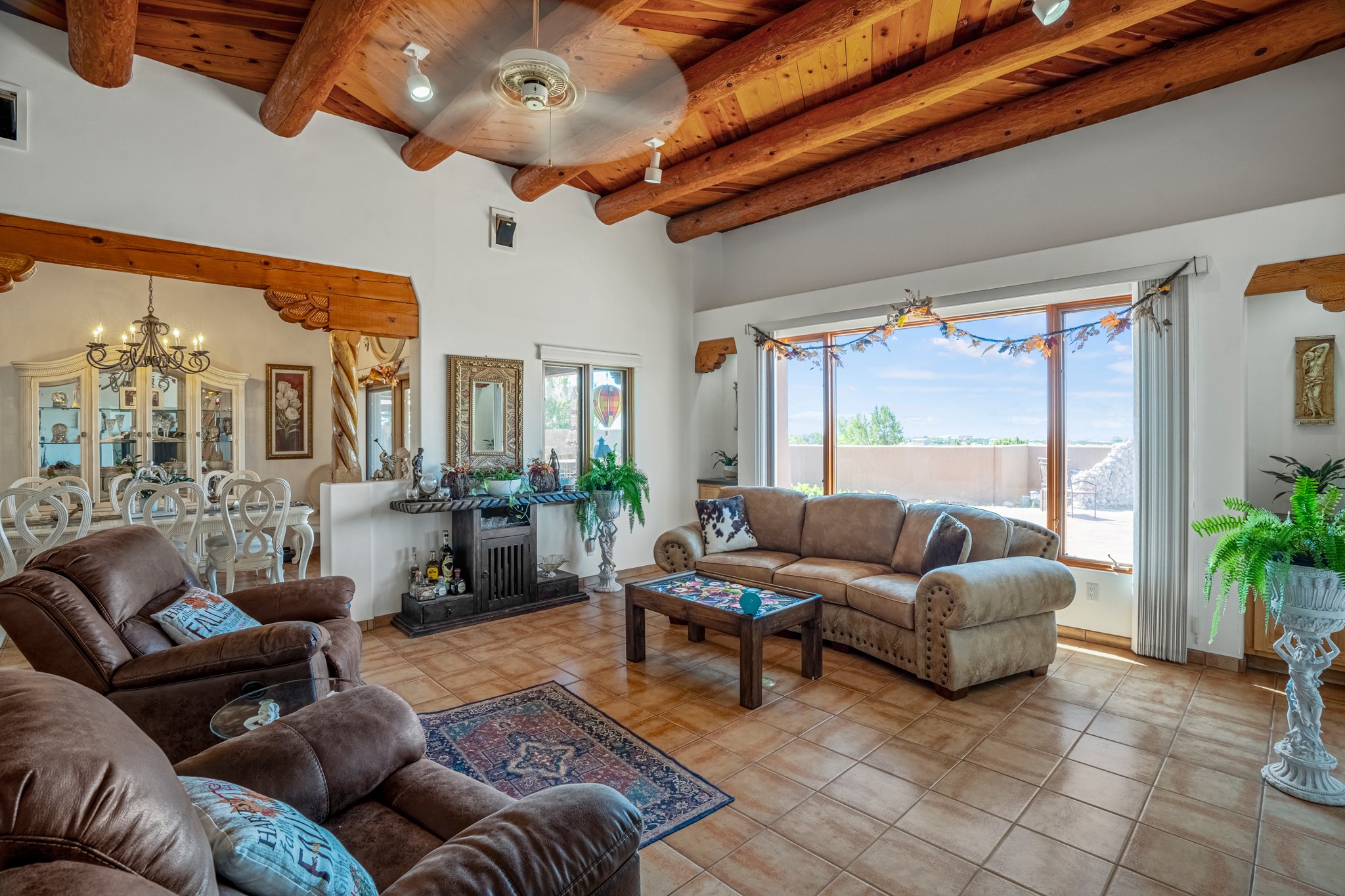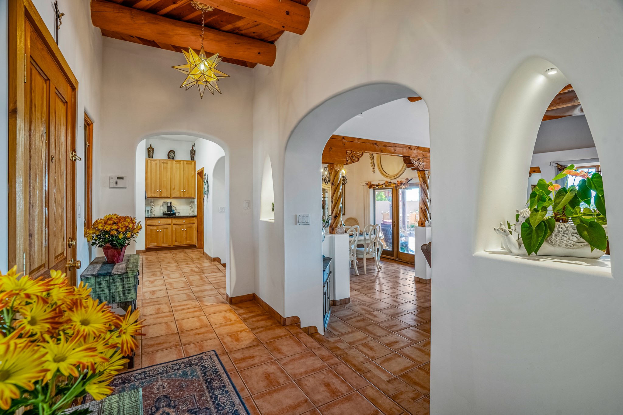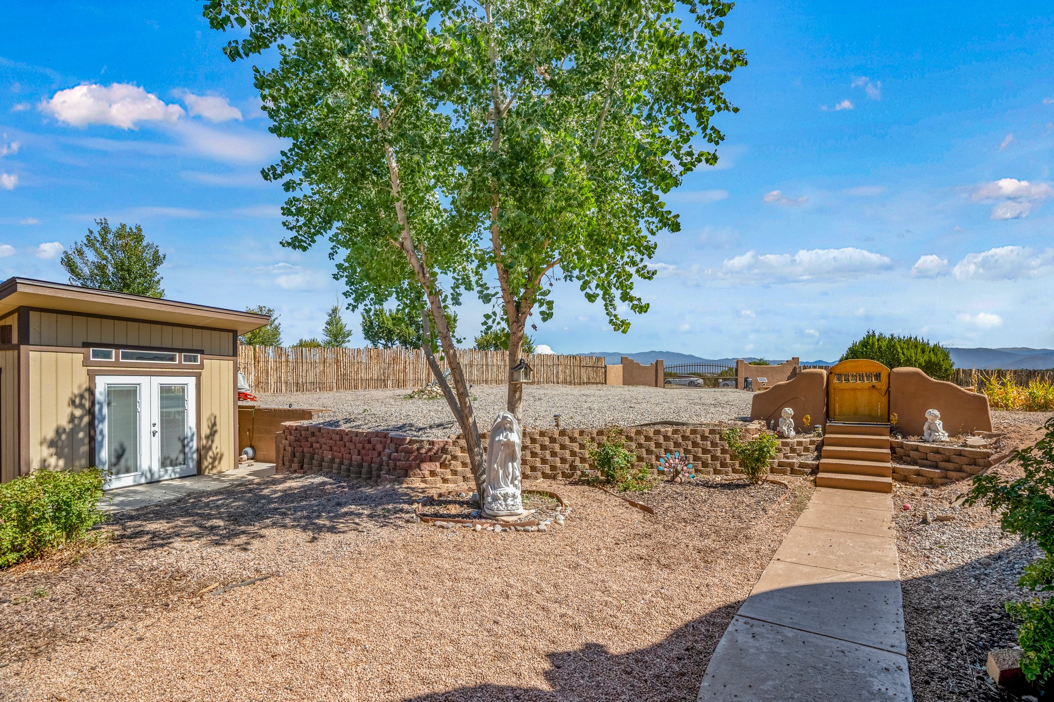 Nestled in Puesta De Sol Subdivision, just 15 minutes from Santa Fe Plaza, 40 Minutes from Los Alamos, and 9 from stores like Target and Albertsons, this 4-acre gem offers privacy and security with its gated entry, a fresh roof, stucco, and stunning mountain views. The sunlit interior boasts a spacious kitchen for entertaining, charming vigas-adorned high ceilings, and distinctive Santa Fe features such as nichos, corbels, and kiva fireplaces. Enjoy an inspiring garden shed, a cozy primary suite, and a massive patio featuring a soothing fountain. Cap it all off with a rooftop view of breathtaking sunsets. And let's not forget the eco-friendly solar features, including a battery backup system alongside grid-tie, and a solar switch for seamless operation even if the grid were to go down also provides super low Monthly utility bills. This home truly has it all!