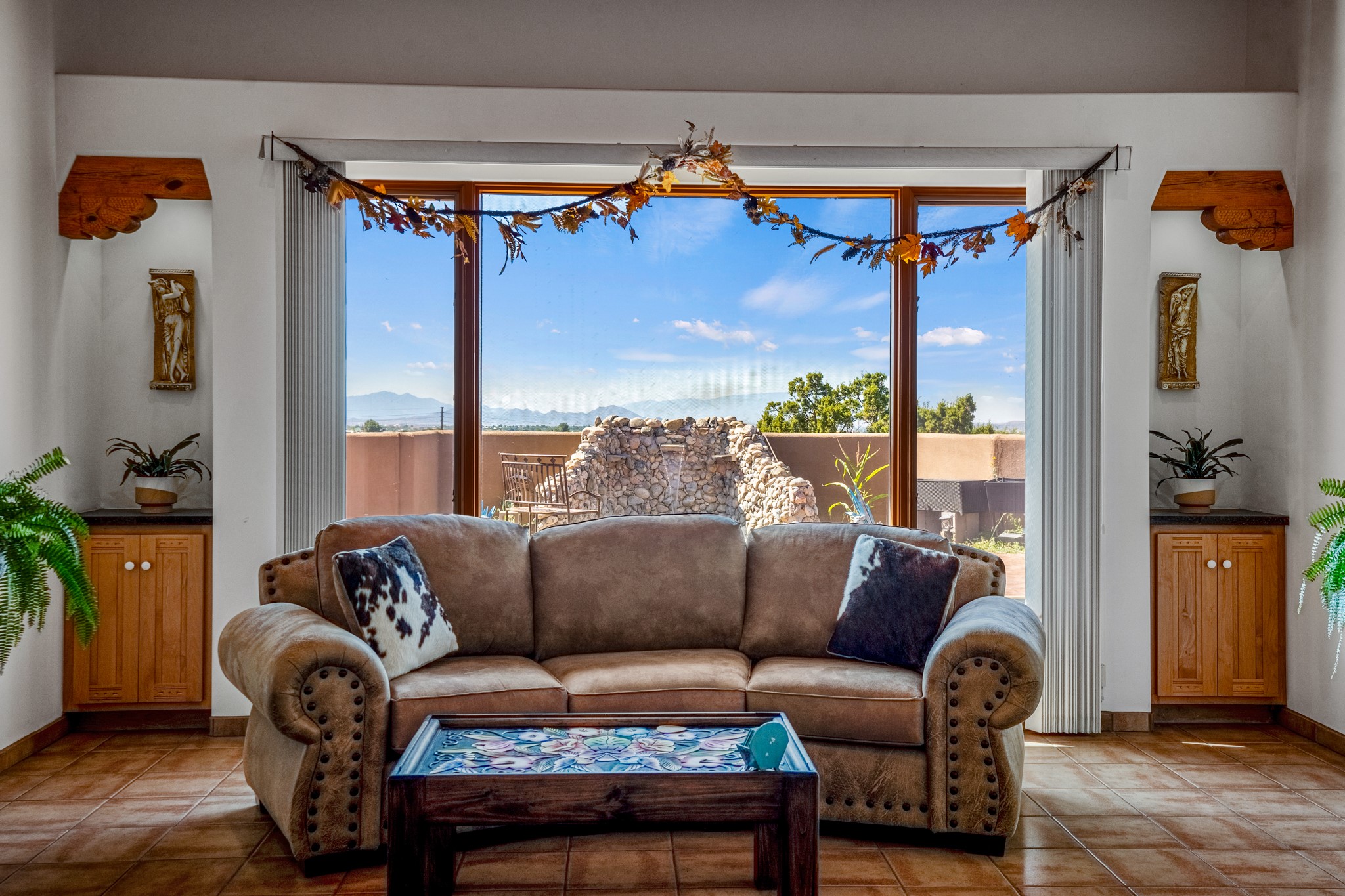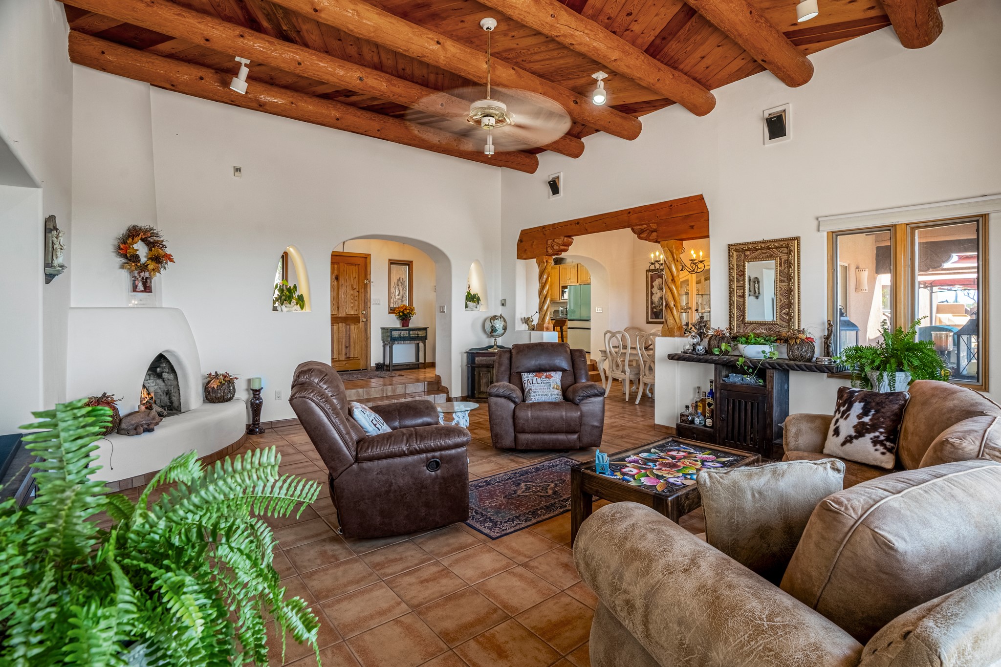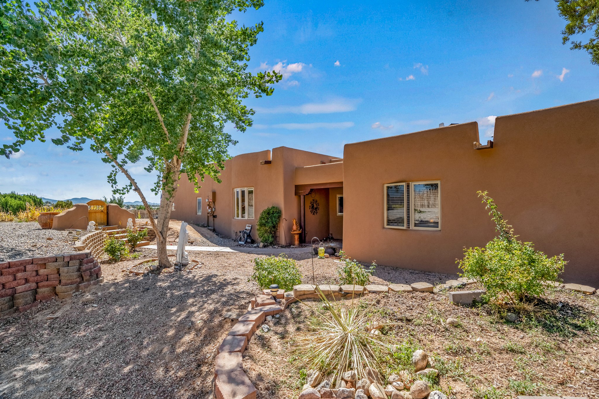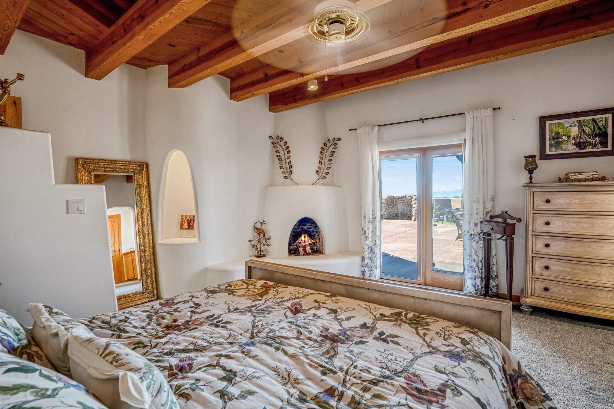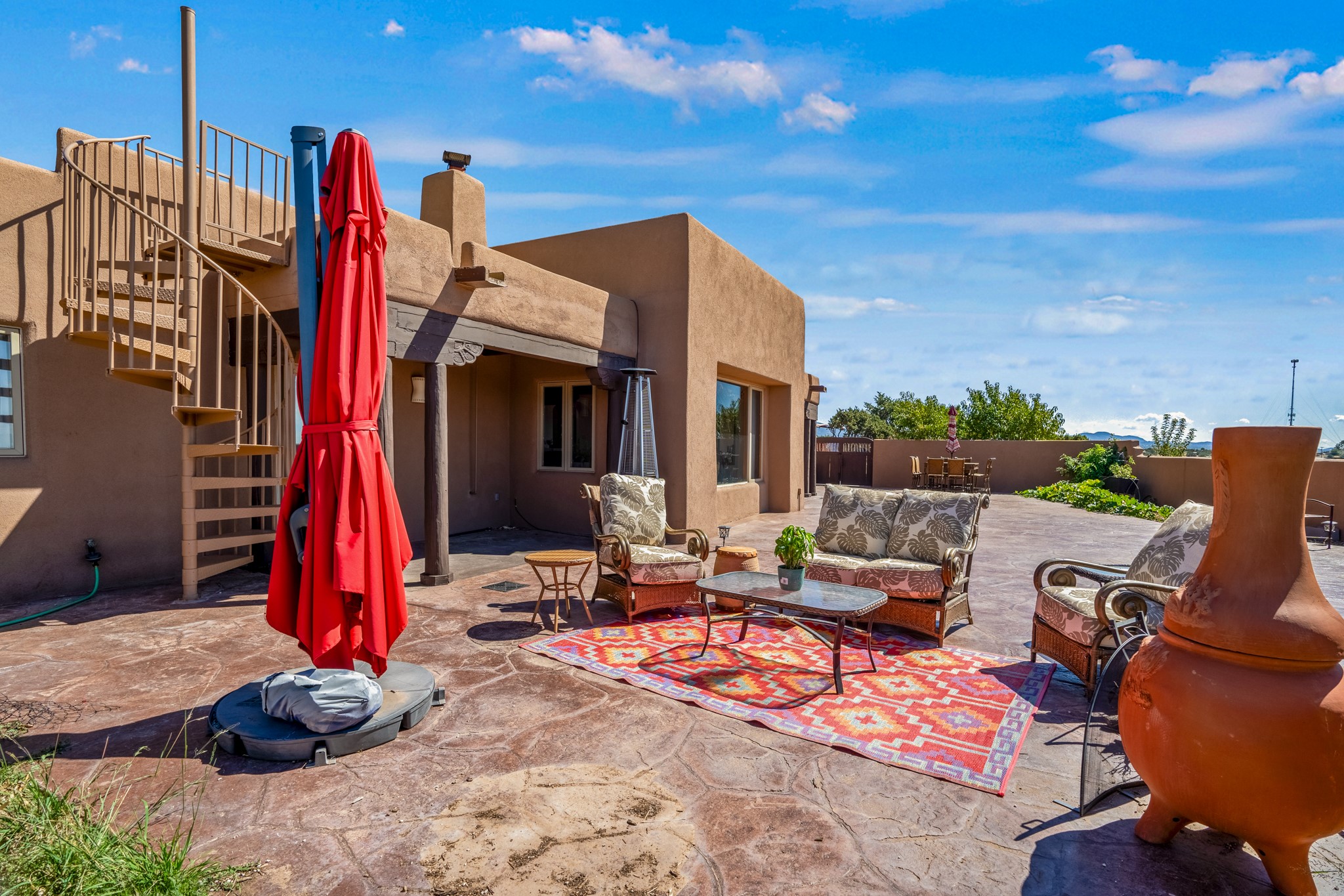Nestled in Puesta De Sol Subdivision, just 15 minutes from Santa Fe Plaza, 40 Minutes from Los Alamos, and 9 from stores like Target and Albertsons, this 4-acre gem offers privacy and security with its gated entry, a fresh roof, stucco, and stunning mountain views. The sunlit interior boasts a spacious kitchen for entertaining, charming vigas-adorned high ceilings, and distinctive Santa Fe features such as nichos, corbels, and kiva fireplaces. Enjoy an inspiring garden shed, a cozy primary suite, and a massive patio featuring a soothing fountain. Cap it all off with a rooftop view of breathtaking sunsets. And let's not forget the eco-friendly solar features, including a battery backup system alongside grid-tie, and a solar switch for seamless operation even if the grid were to go down also provides super low Monthly utility bills. This home truly has it all!