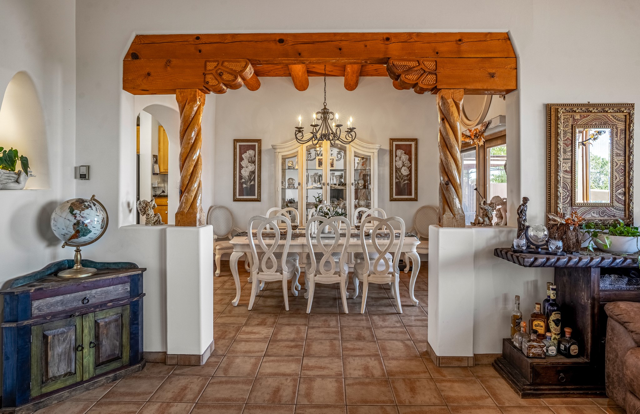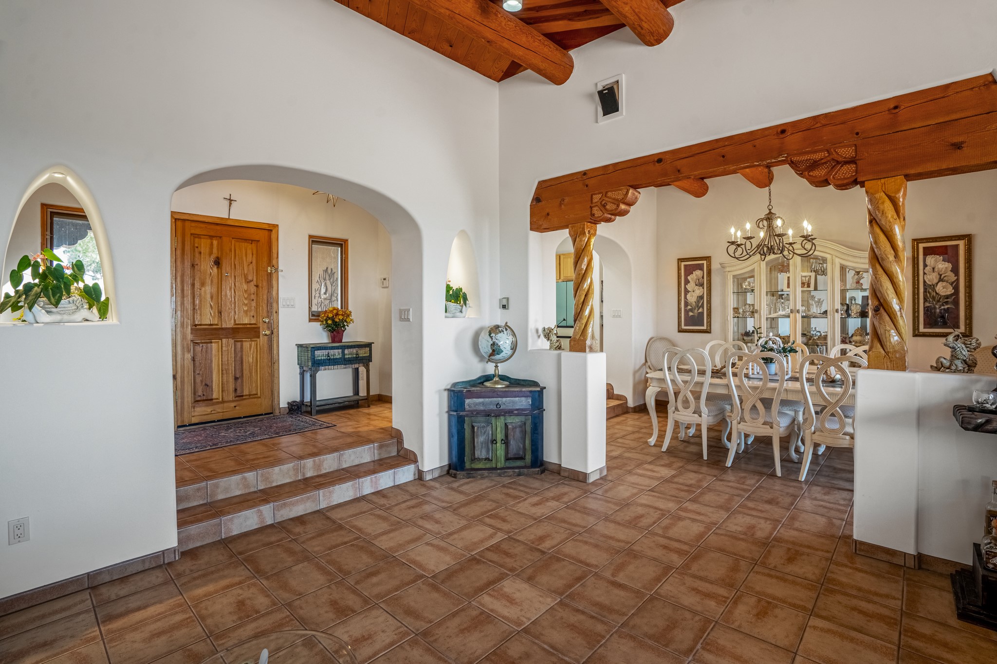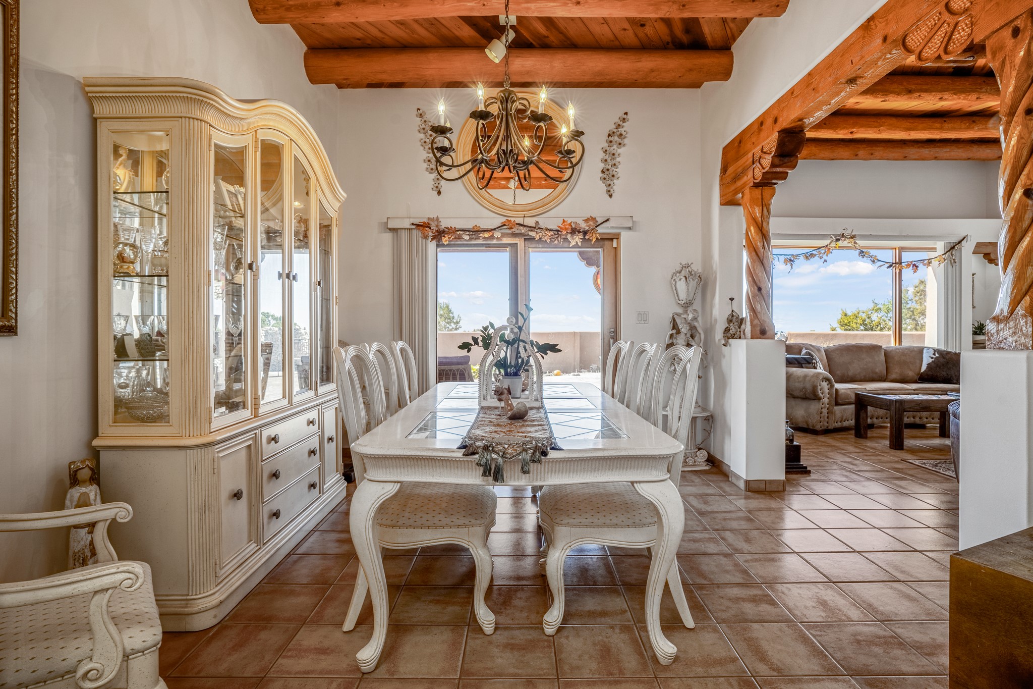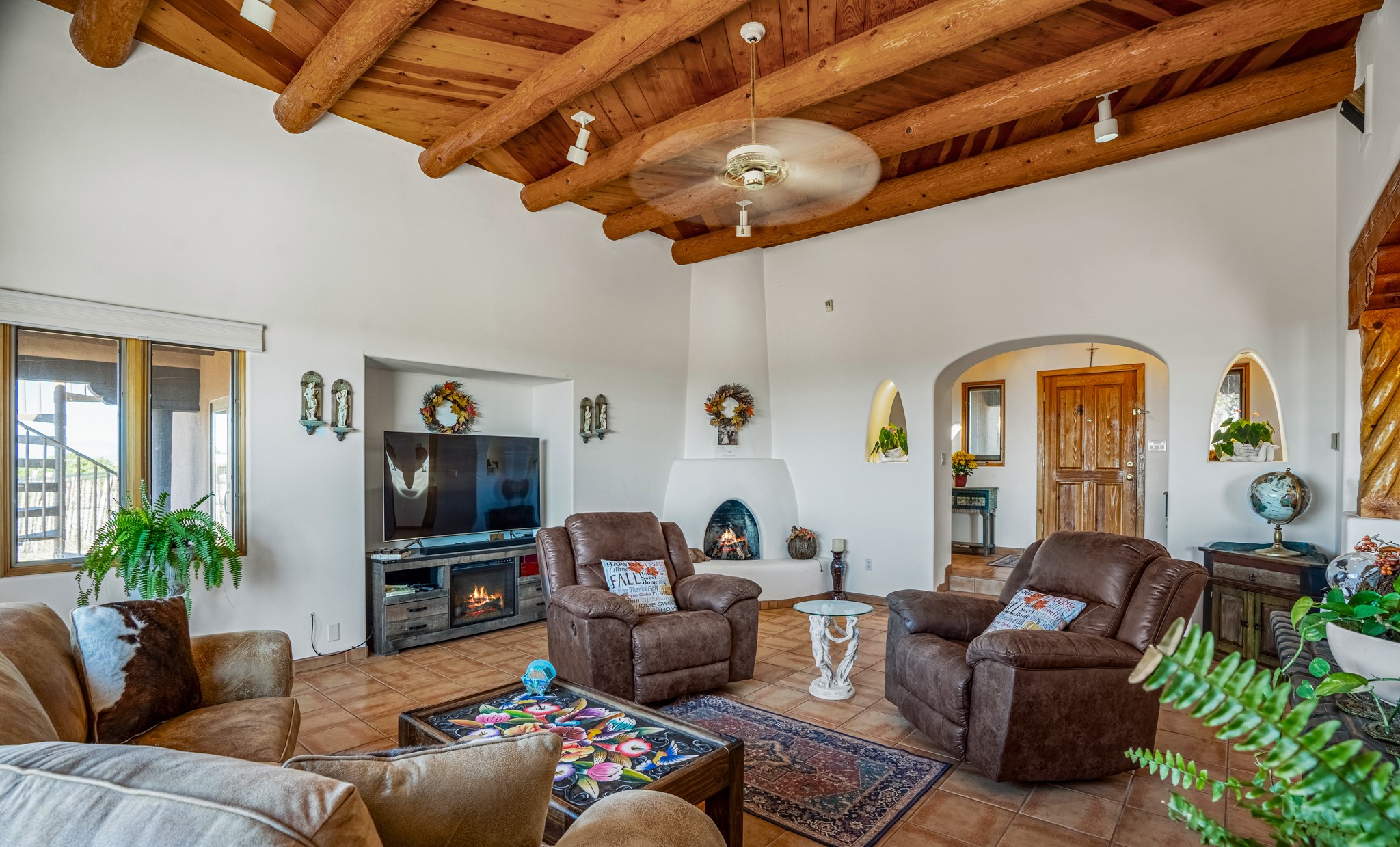 Nestled in Puesta De Sol Subdivision, just 15 minutes from Santa Fe Plaza, 40 Minutes from Los Alamos, and 9 from stores like Target and Albertsons, this 4-acre gem offers privacy and security with its gated entry, a fresh roof, stucco, and stunning mountain views. The sunlit interior boasts a spacious kitchen for entertaining, charming vigas-adorned high ceilings, and distinctive Santa Fe features such as nichos, corbels, and kiva fireplaces. Enjoy an inspiring garden shed, a cozy primary suite, and a massive patio featuring a soothing fountain. Cap it all off with a rooftop view of breathtaking sunsets. And let's not forget the eco-friendly solar features, including a battery backup system alongside grid-tie, and a solar switch for seamless operation even if the grid were to go down also provides super low Monthly utility bills. This home truly has it all!