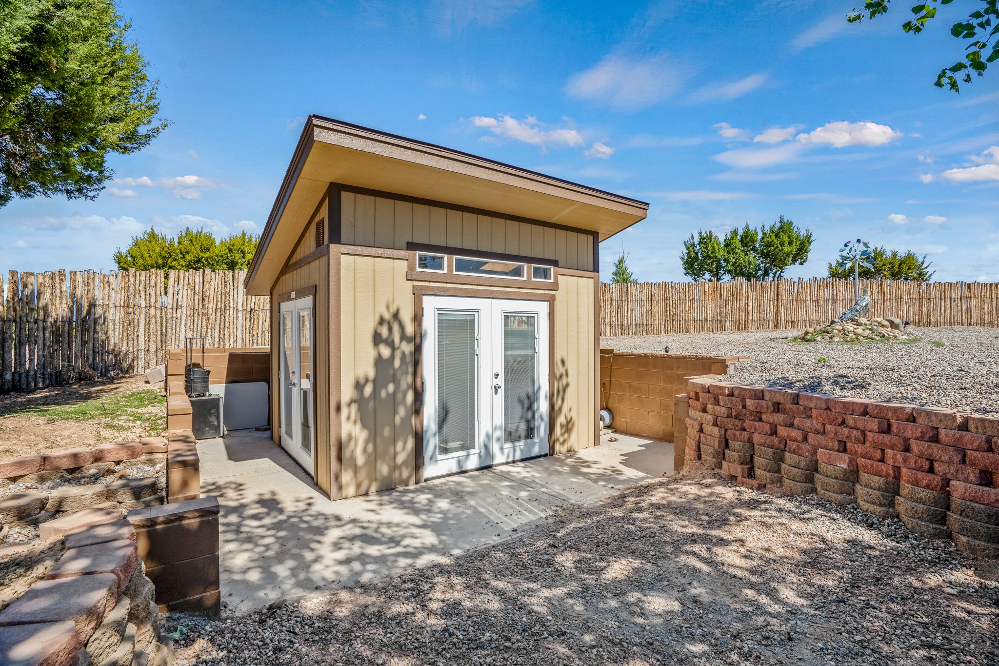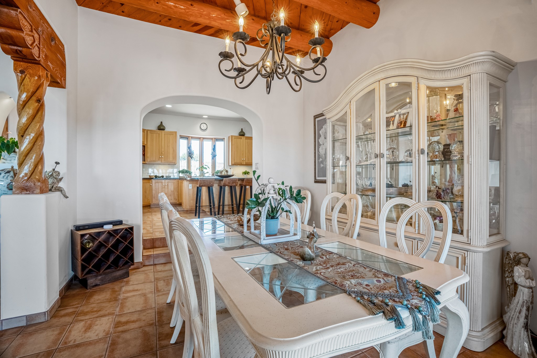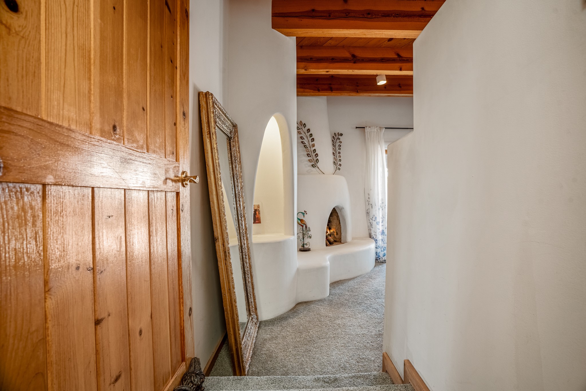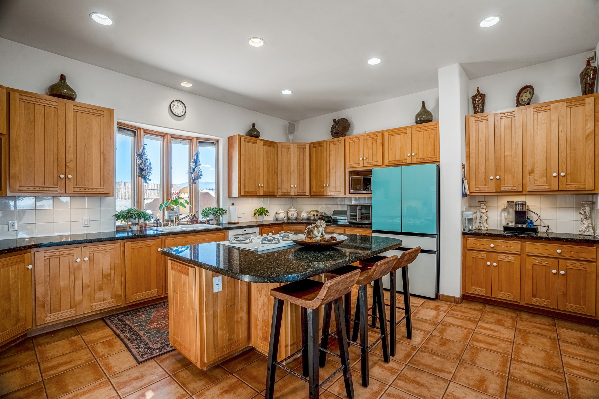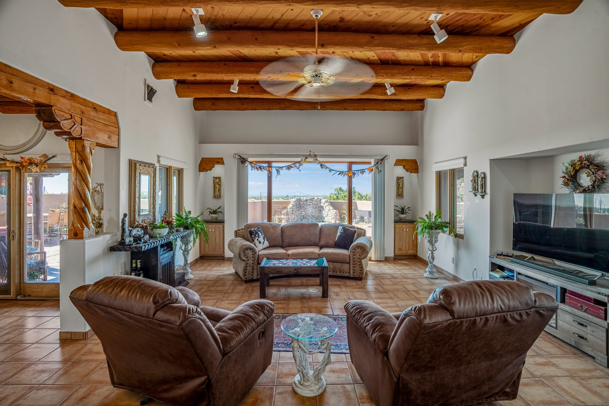 Nestled in Puesta De Sol Subdivision, just 15 minutes from Santa Fe Plaza, 40 Minutes from Los Alamos, and 9 from stores like Target and Albertsons, this 4-acre gem offers privacy and security with its gated entry, a fresh roof, stucco, and stunning mountain views. The sunlit interior boasts a spacious kitchen for entertaining, charming vigas-adorned high ceilings, and distinctive Santa Fe features such as nichos, corbels, and kiva fireplaces. Enjoy an inspiring garden shed, a cozy primary suite, and a massive patio featuring a soothing fountain. Cap it all off with a rooftop view of breathtaking sunsets. And let's not forget the eco-friendly solar features, including a battery backup system alongside grid-tie, and a solar switch for seamless operation even if the grid were to go down also provides super low Monthly utility bills. This home truly has it all!