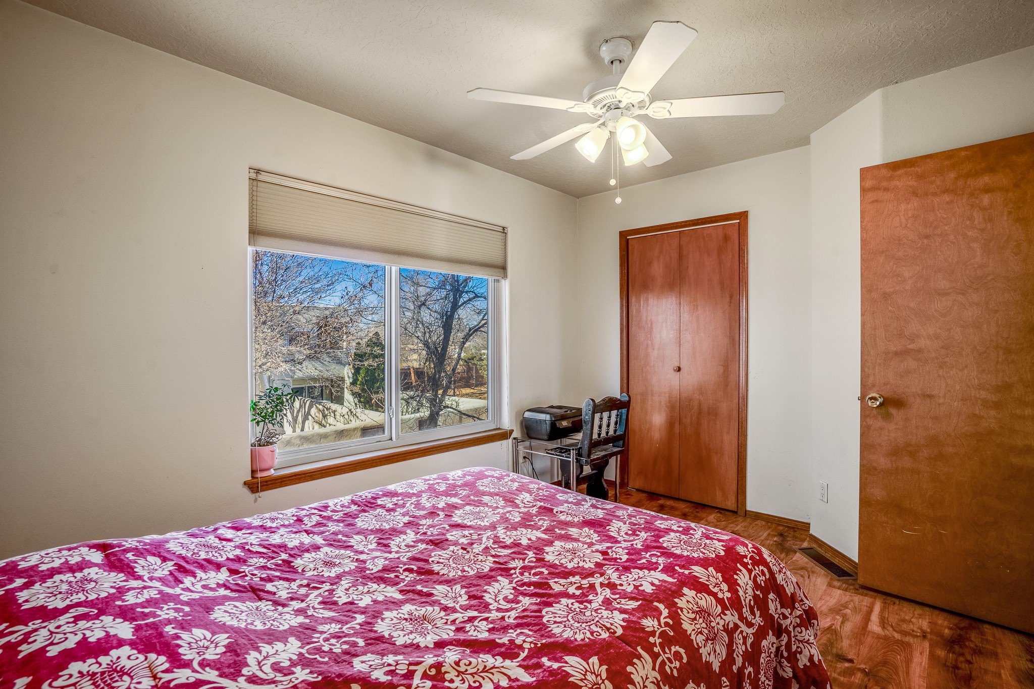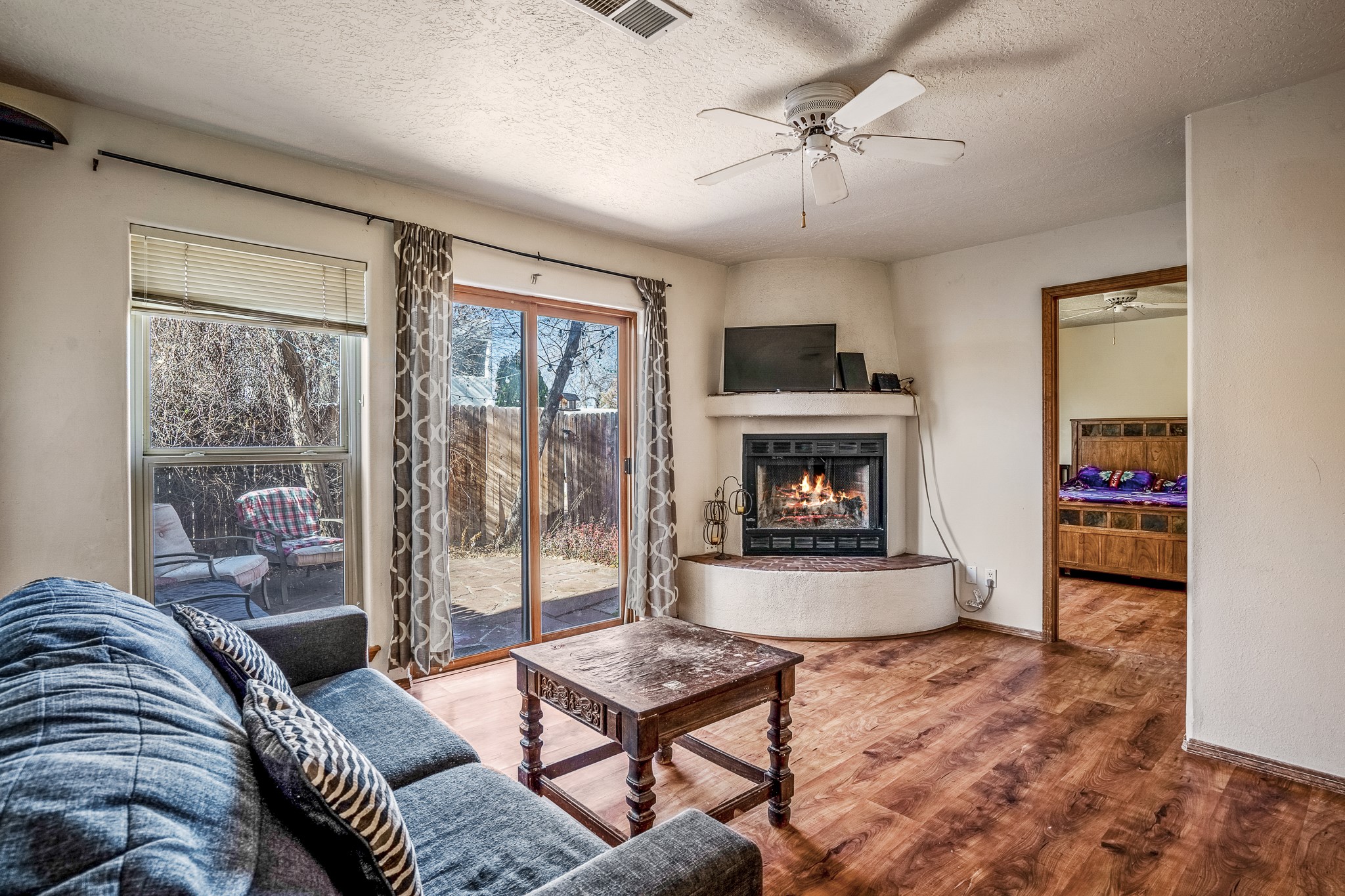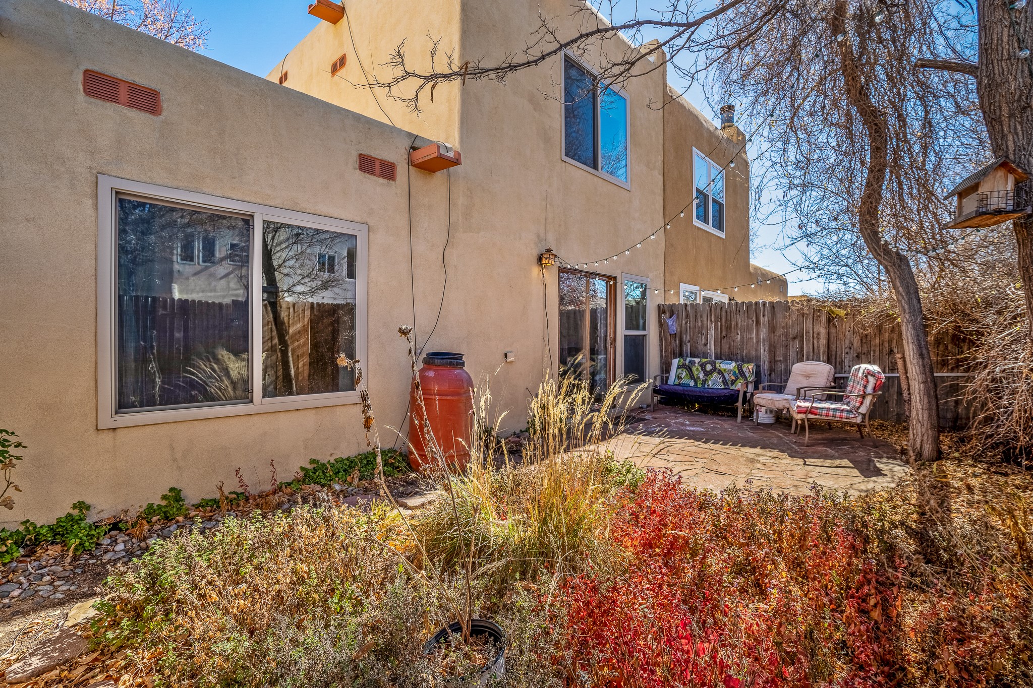 Sweet and charming 2 story, 2 bedroom, 2 bath, 1 car garage home in Plaza de Castillo with mountain views minutes from the Arroyo Chamisos Trail, close to the hospital, amenities and 15 minutes to the Santa Fe Plaza. Enter this gem of a home from the private enclosed and gated front courtyard. On the main level, you will find a bedroom with a full bath, saltillo tile and wood laminate flooring, kitchen with new range and dishwasher, breakfast bar, laundry room with washer and dryer and living room with wood burning fireplace. Upstairs, there is also a bedroom and full bath plus a versatile light and bright bonus room with mountain views perfect as an additional bedroom, office, study, playroom etc. From the living room you can access the cute rear patio with gardens, mature landscaping and sitting area. Features and amenities: Walk-in closet-Plenty of closets/storage-Forced air heat-Wood floor on the stairs-Ceiling fans-Transferrable roof coating warranty until January 2028 and more!