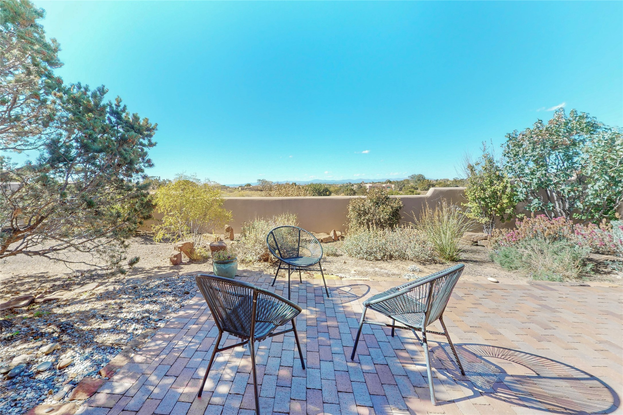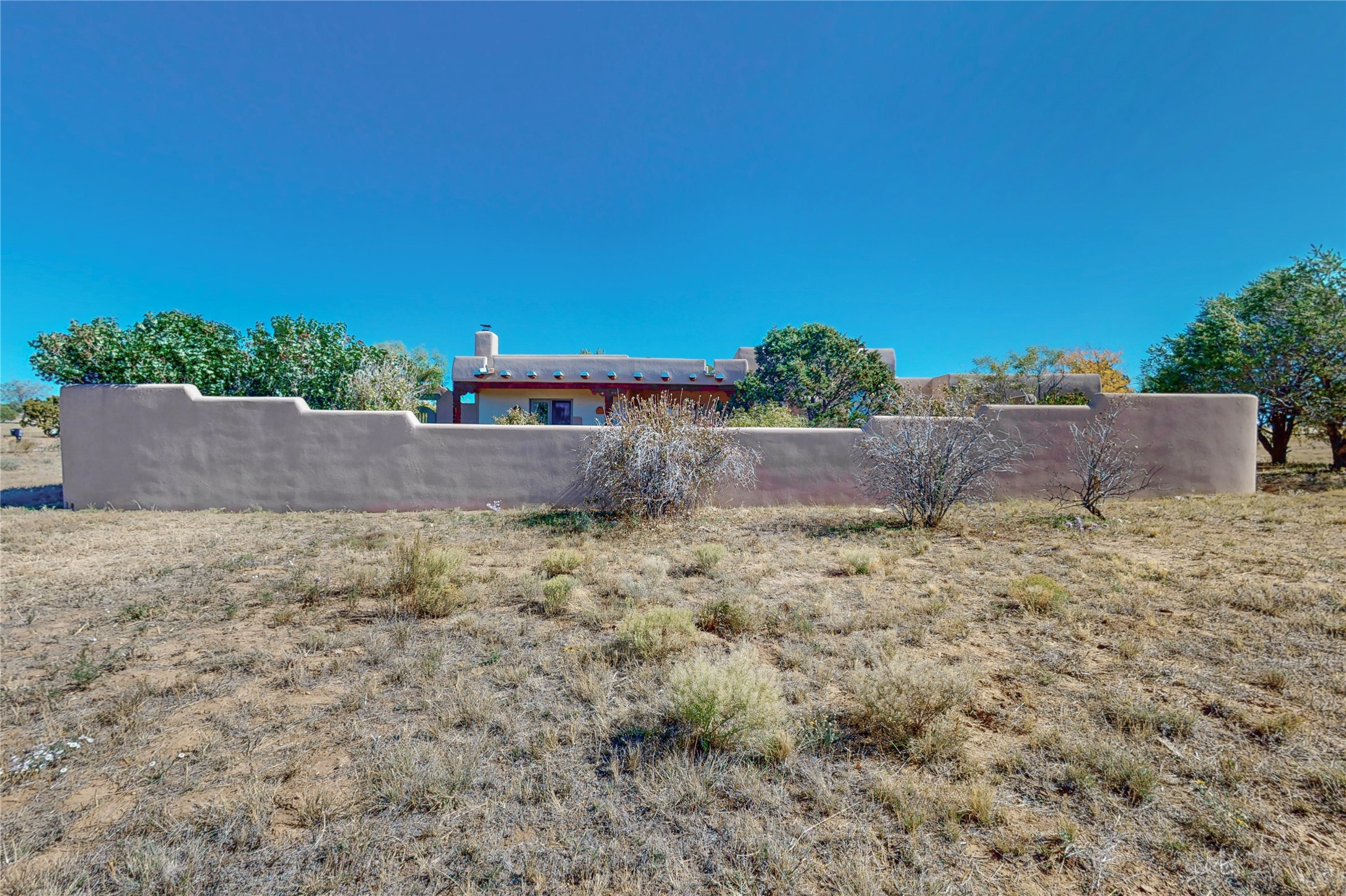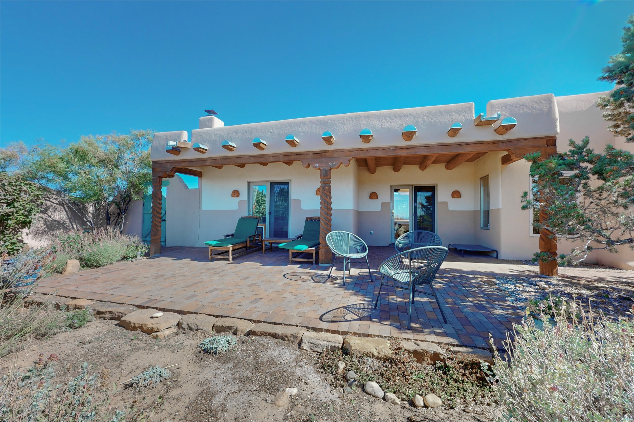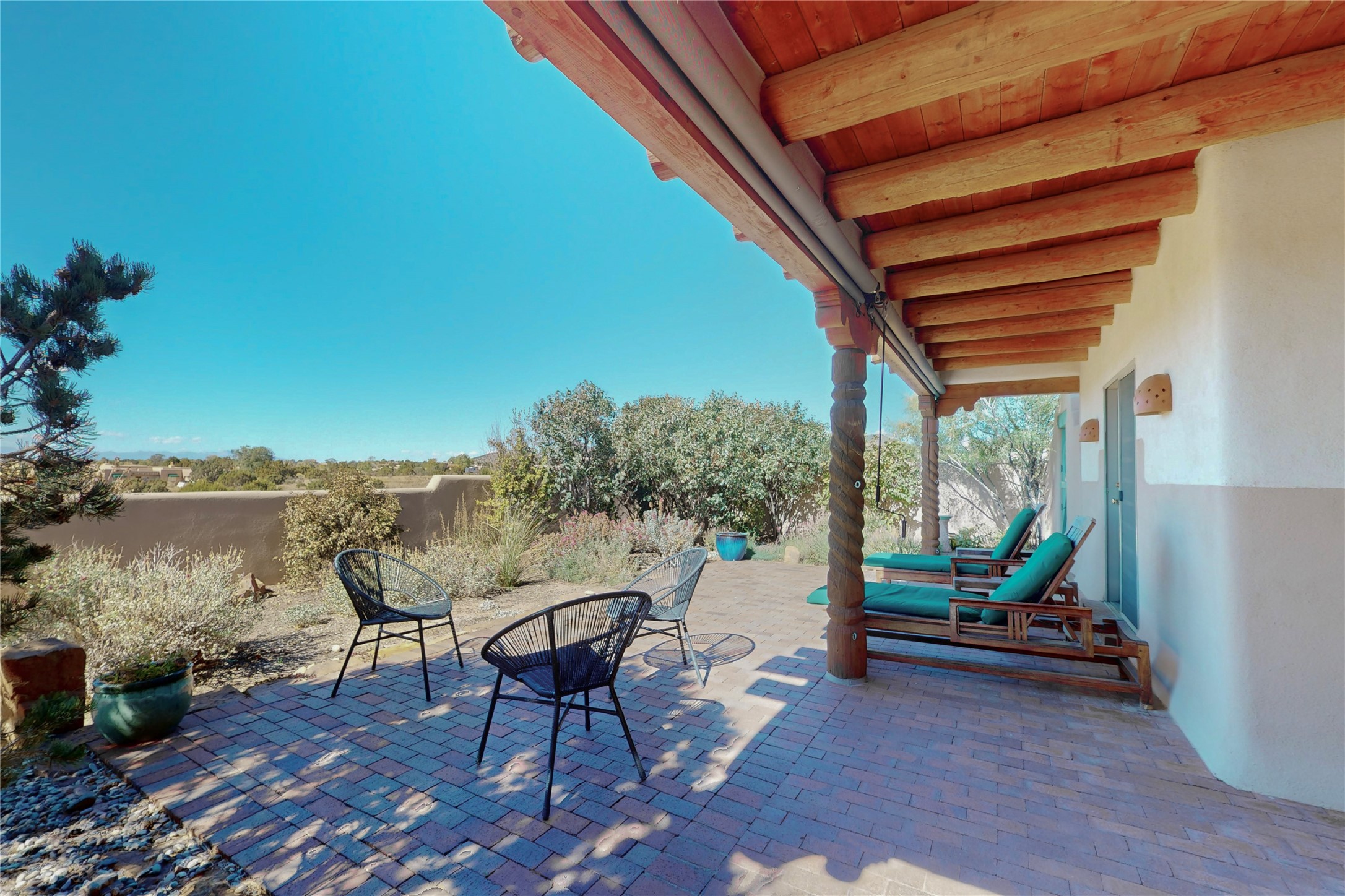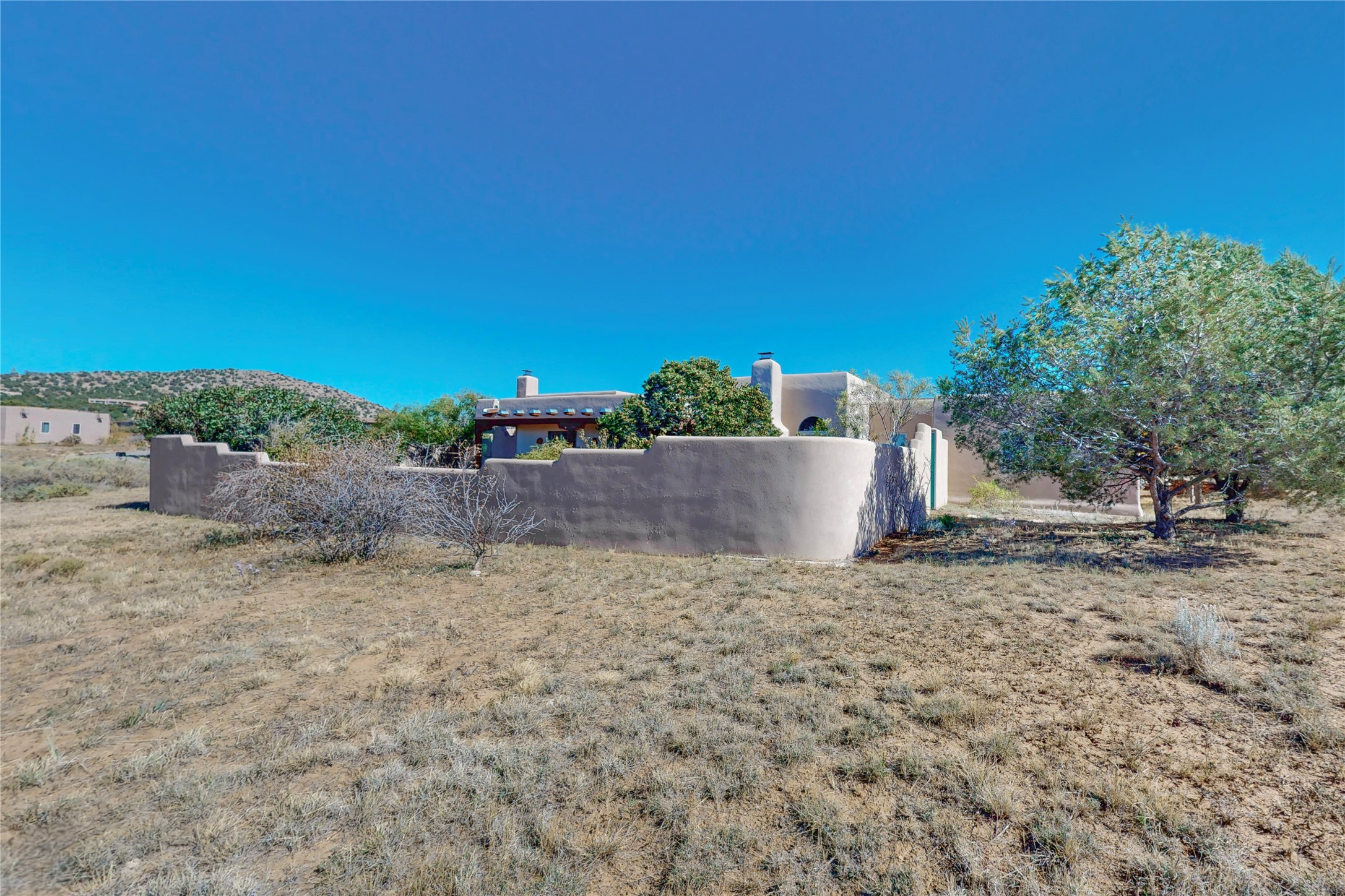 Gracious light open plan, 2230+ sq.ft. split bedroom design built by Adobeworks sitting high up on a cul de sac in Eldorado. Contemporary pueblo with high viga ceilings, dramatic custom kiva fireplace, nichos, corballed beams and tile floors in main living areas. A sunny large kitchen with island and pantry flows to a formal dining area with outside portal for dining with fabulous sweeping sunset mountain vistas . Owners suite features a romantic corner kiva and viga ceilings with a door to a privately walled garden and bath with walk in closet, separate shower and tub. There is a lovely library/music room with a central Rumford style fireplace and 2 bedroom, full bath guest suite. Close to both Eldorado amenities and local community services, trails and shopping plus only minutes into Santa Fe. This home is a must see.