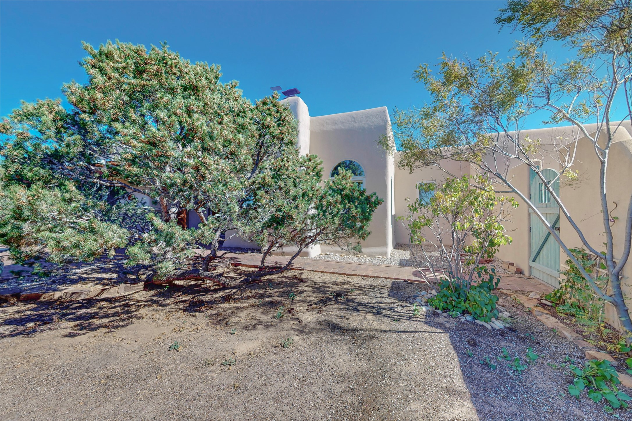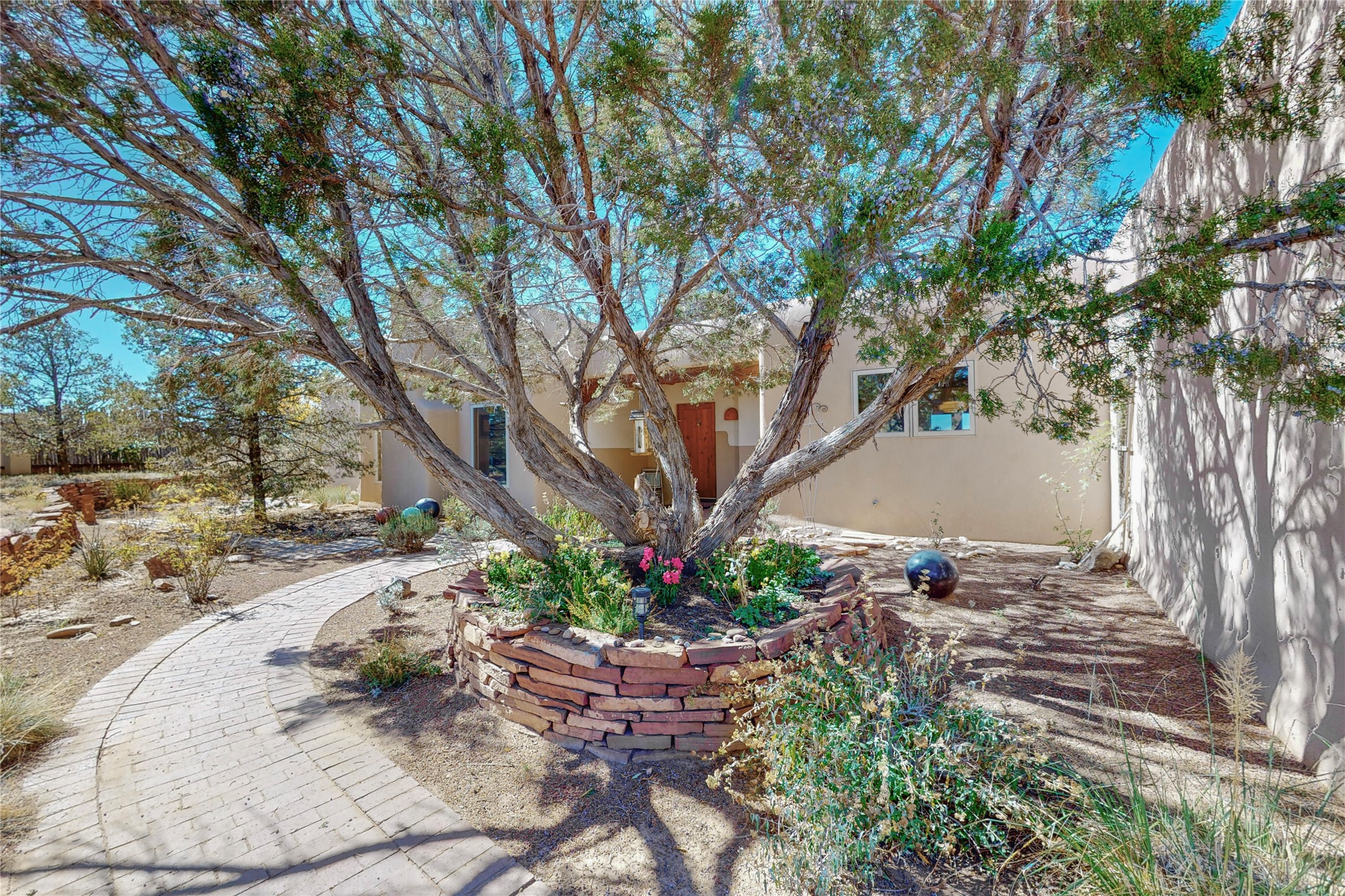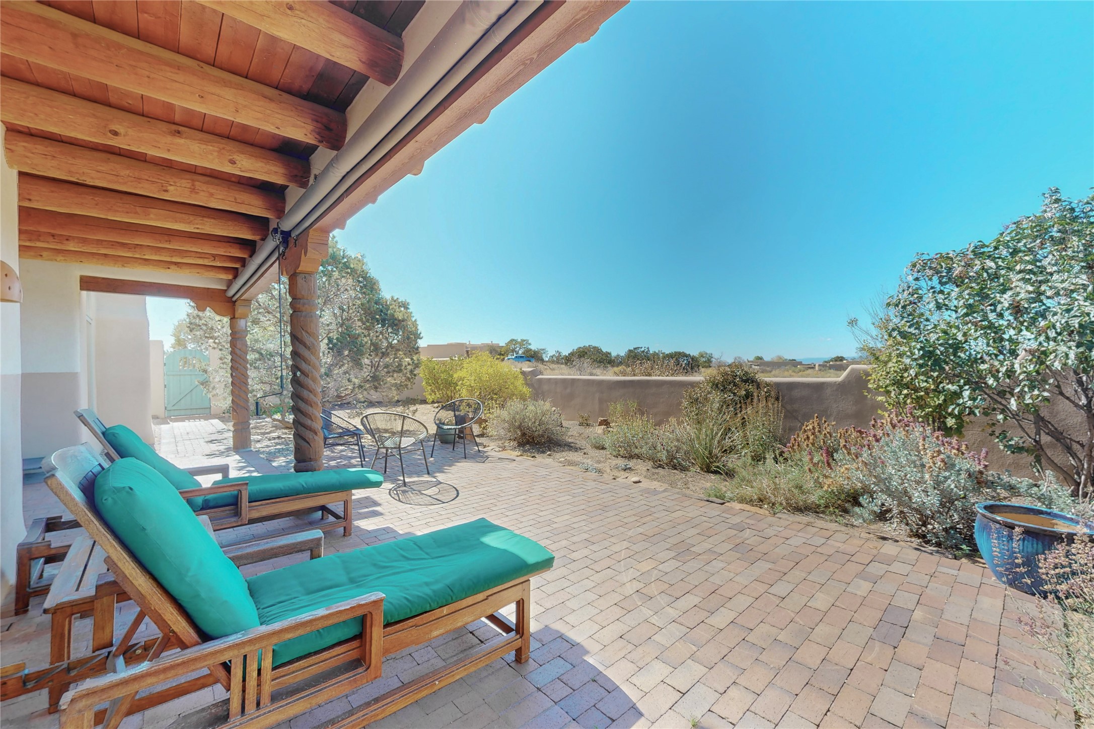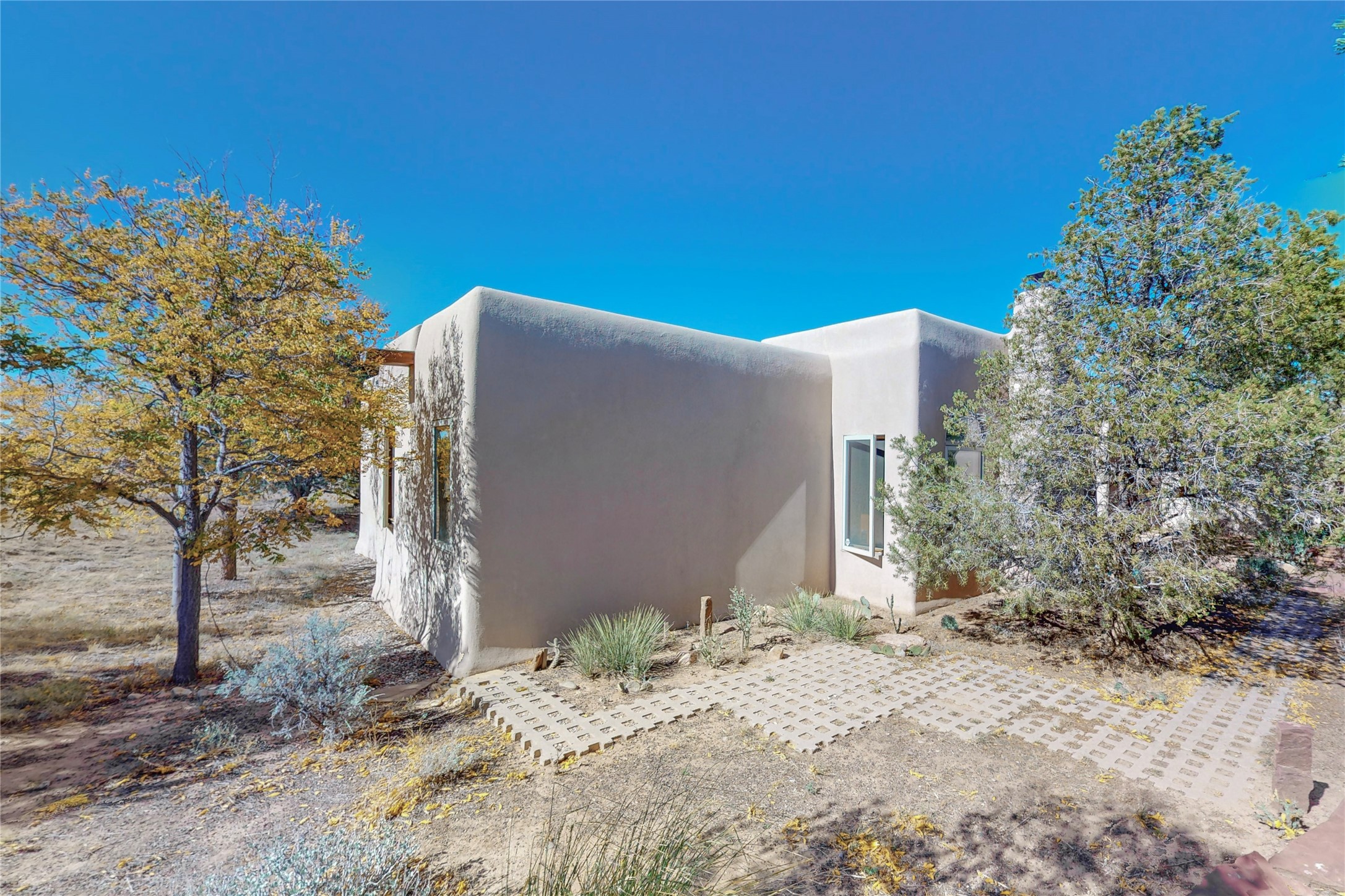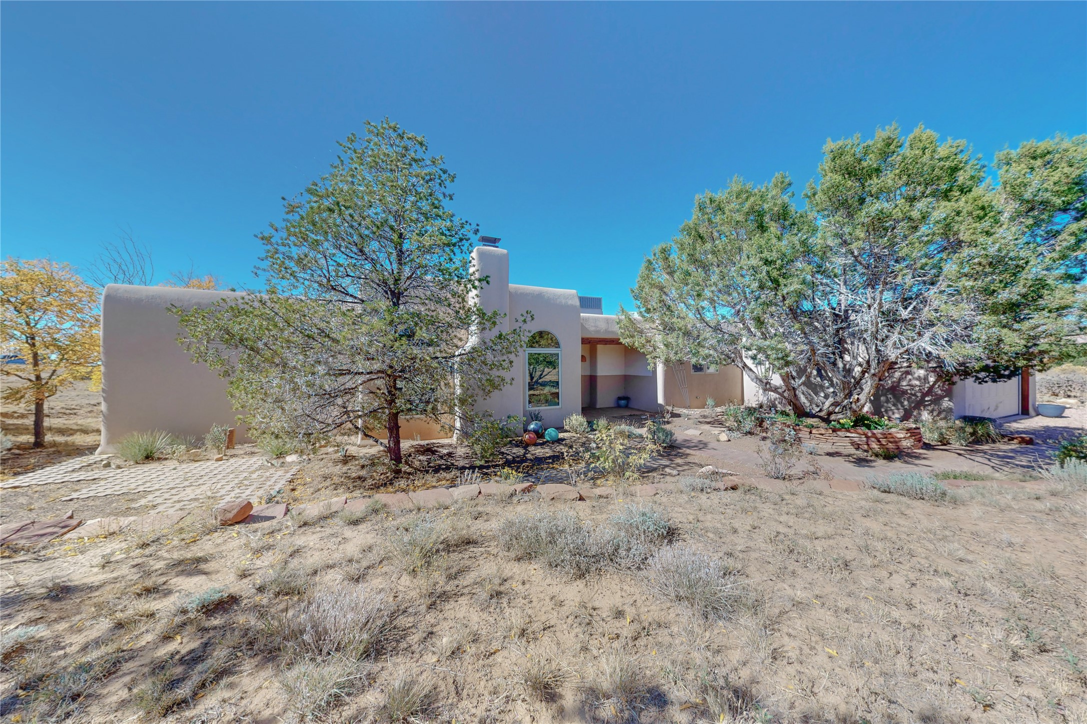 Gracious light open plan, 2230+ sq.ft. split bedroom design built by Adobeworks sitting high up on a cul de sac in Eldorado. Contemporary pueblo with high viga ceilings, dramatic custom kiva fireplace, nichos, corballed beams and tile floors in main living areas. A sunny large kitchen with island and pantry flows to a formal dining area with outside portal for dining with fabulous sweeping sunset mountain vistas . Owners suite features a romantic corner kiva and viga ceilings with a door to a privately walled garden and bath with walk in closet, separate shower and tub. There is a lovely library/music room with a central Rumford style fireplace and 2 bedroom, full bath guest suite. Close to both Eldorado amenities and local community services, trails and shopping plus only minutes into Santa Fe. This home is a must see.